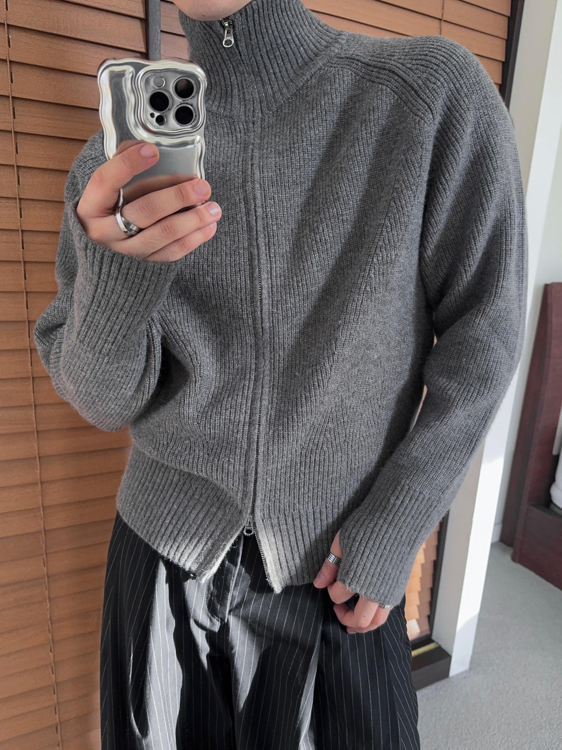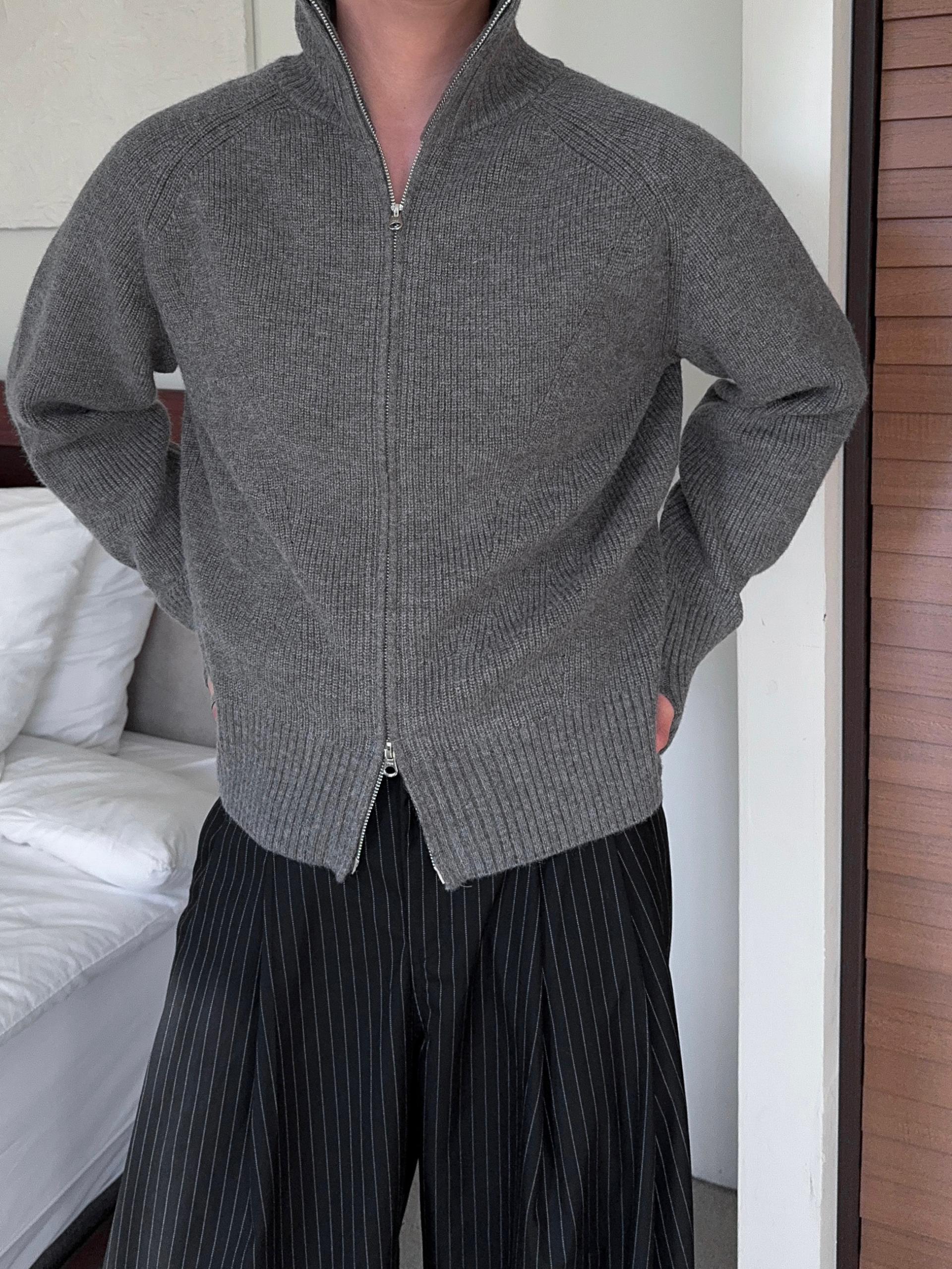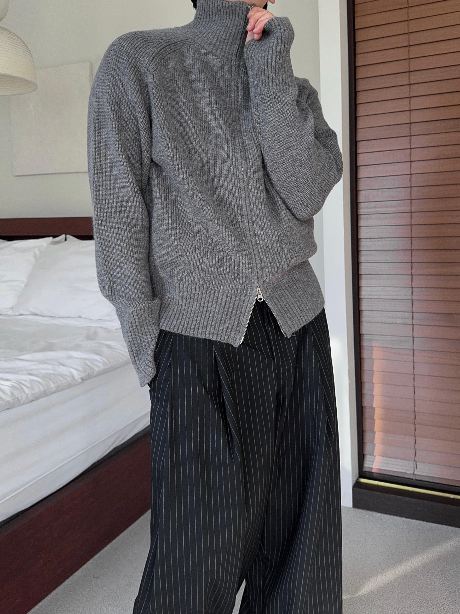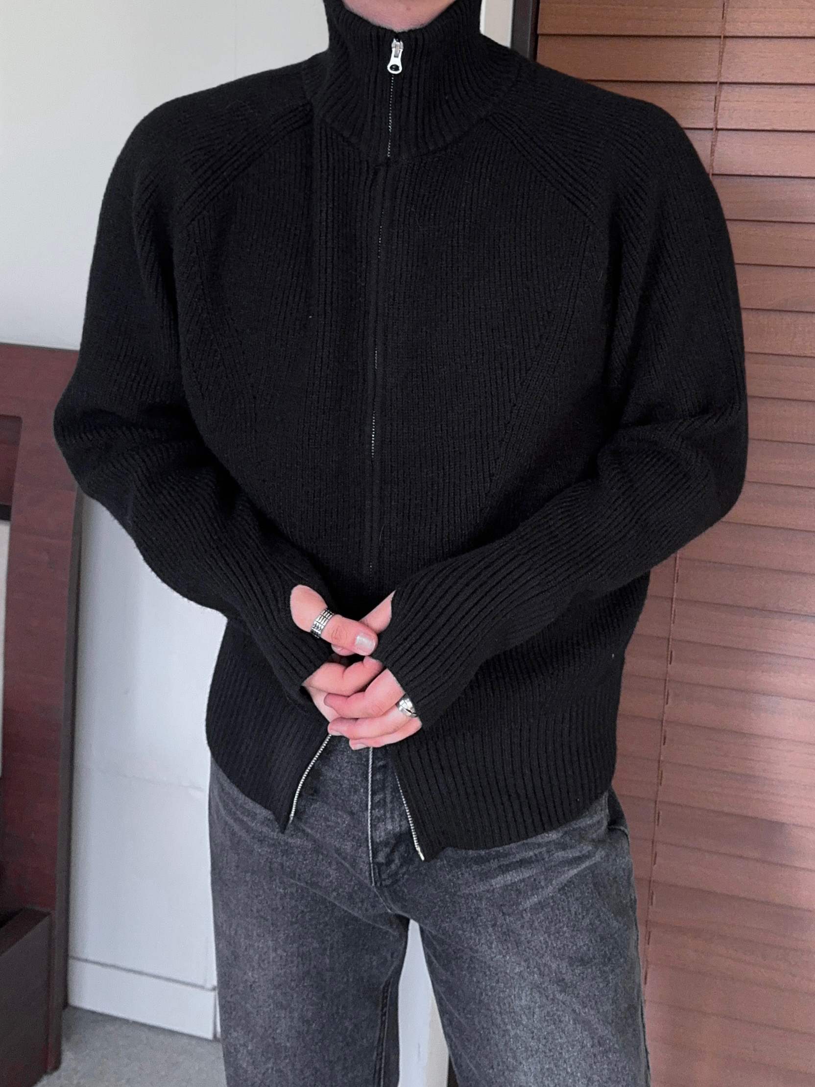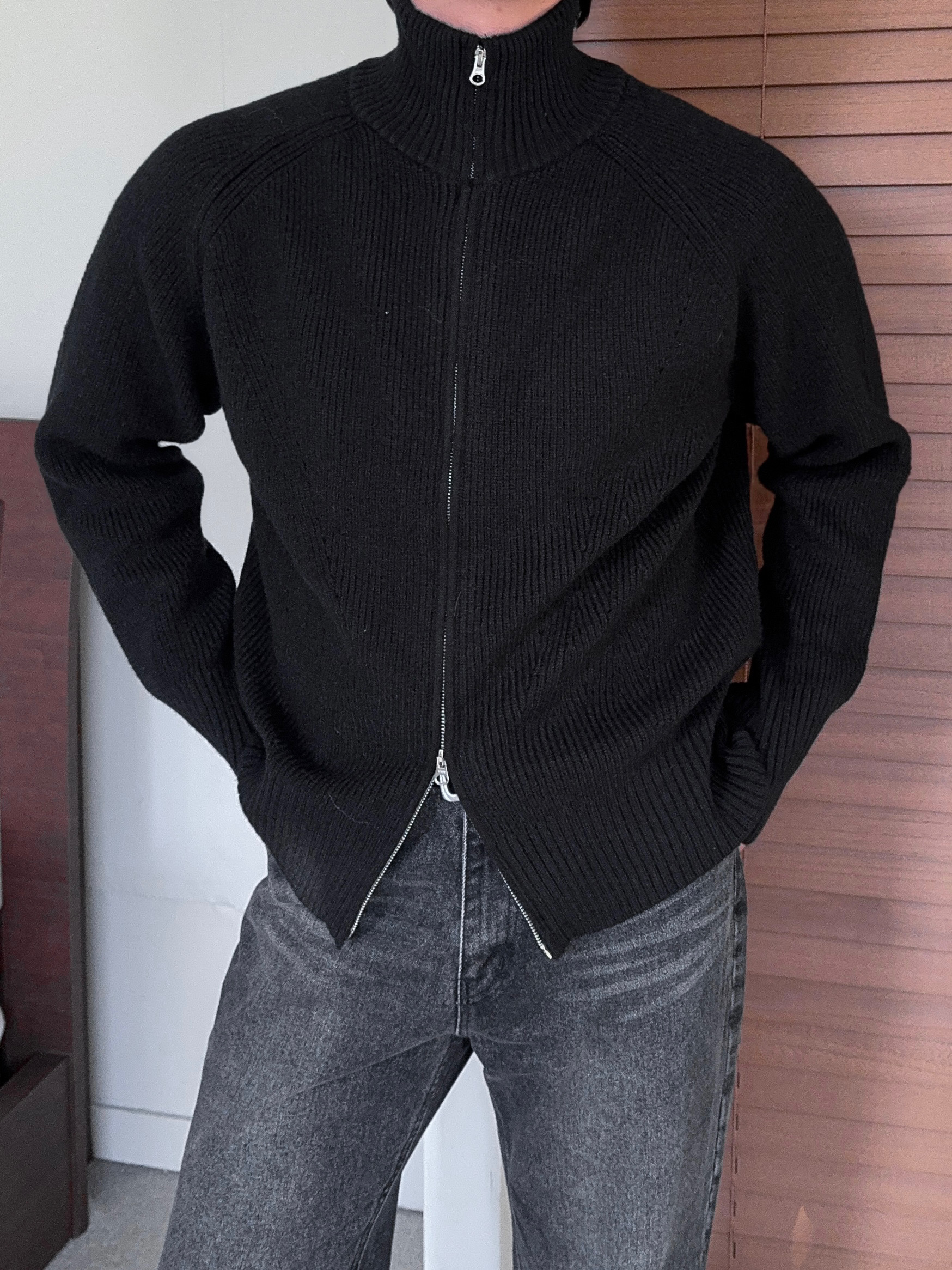 -도톰하고 탄탄한 고밀도 니트 짜임으로 제작된 하이넥 집업