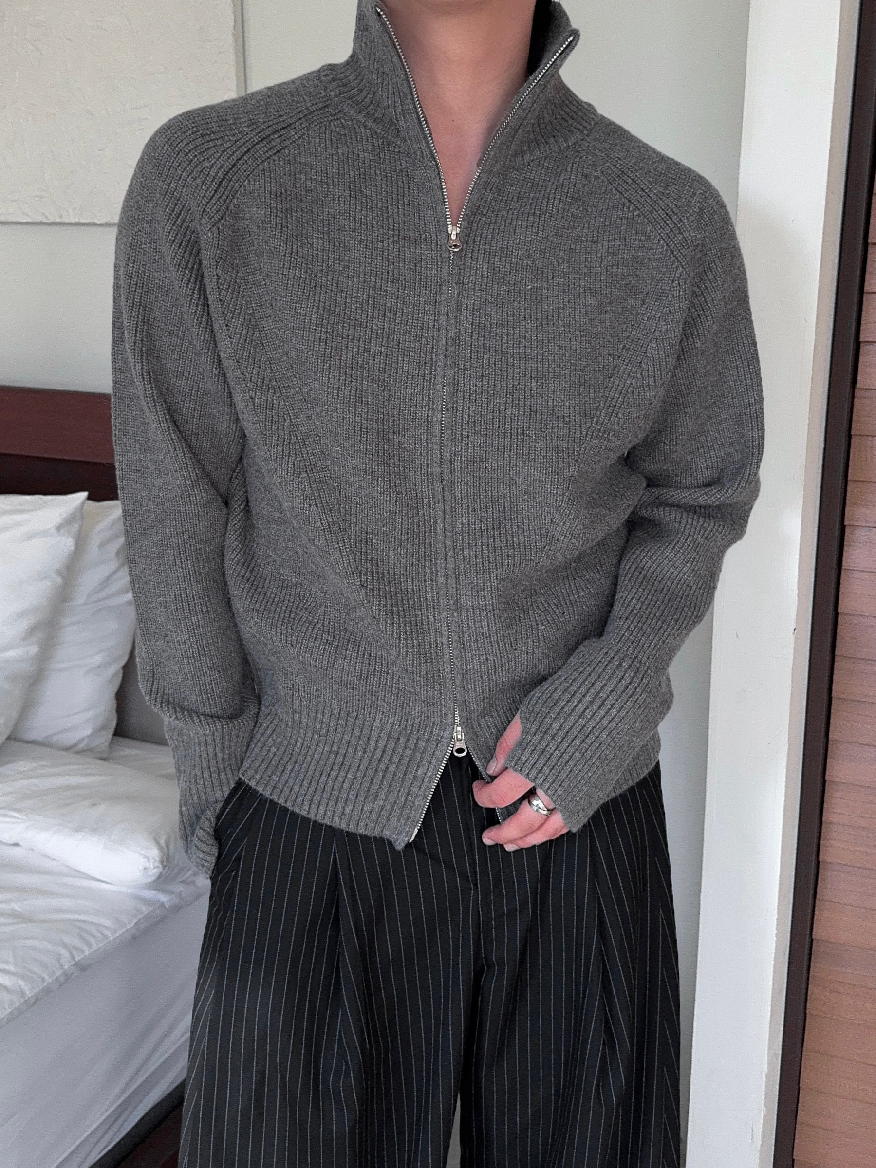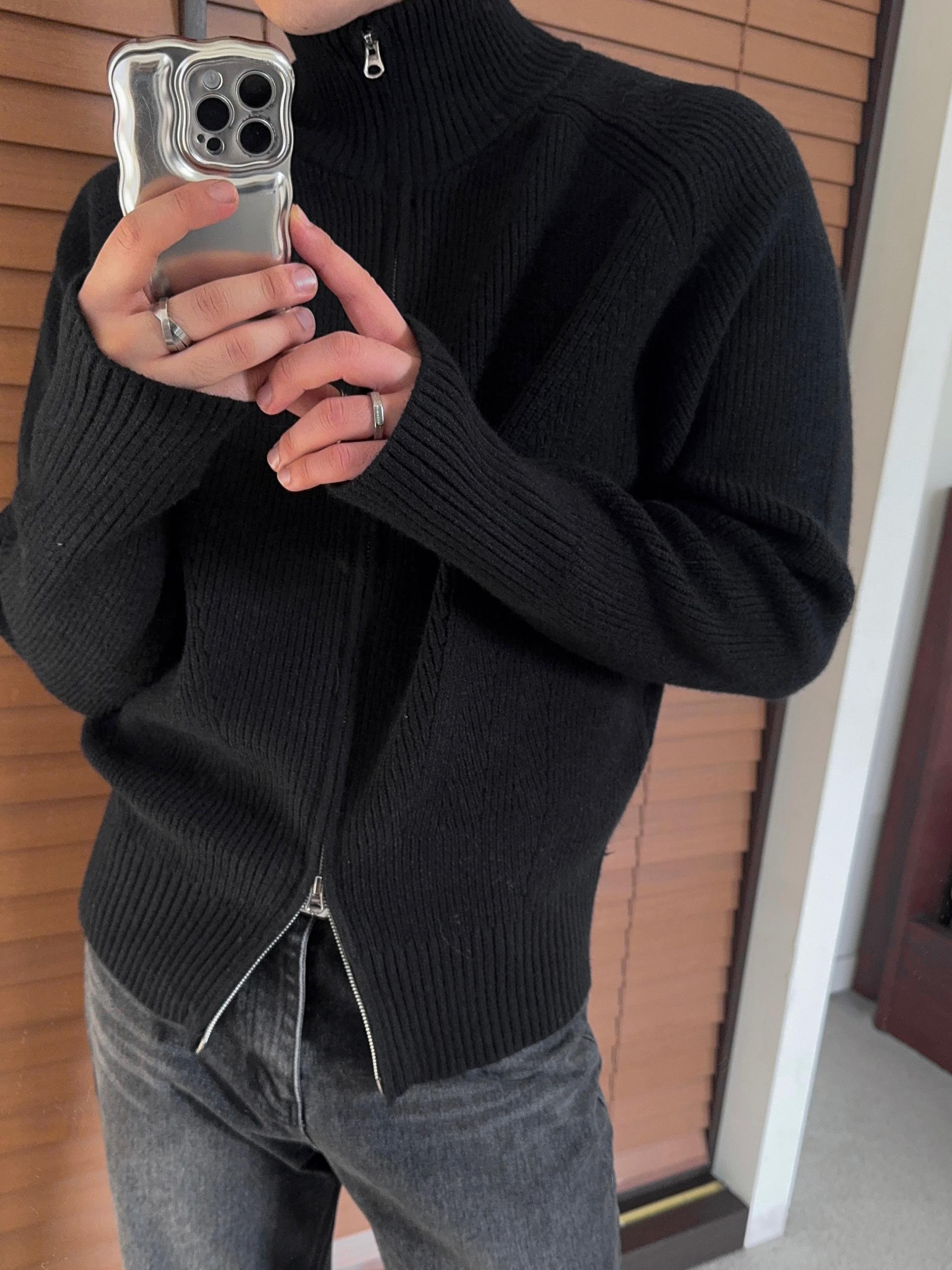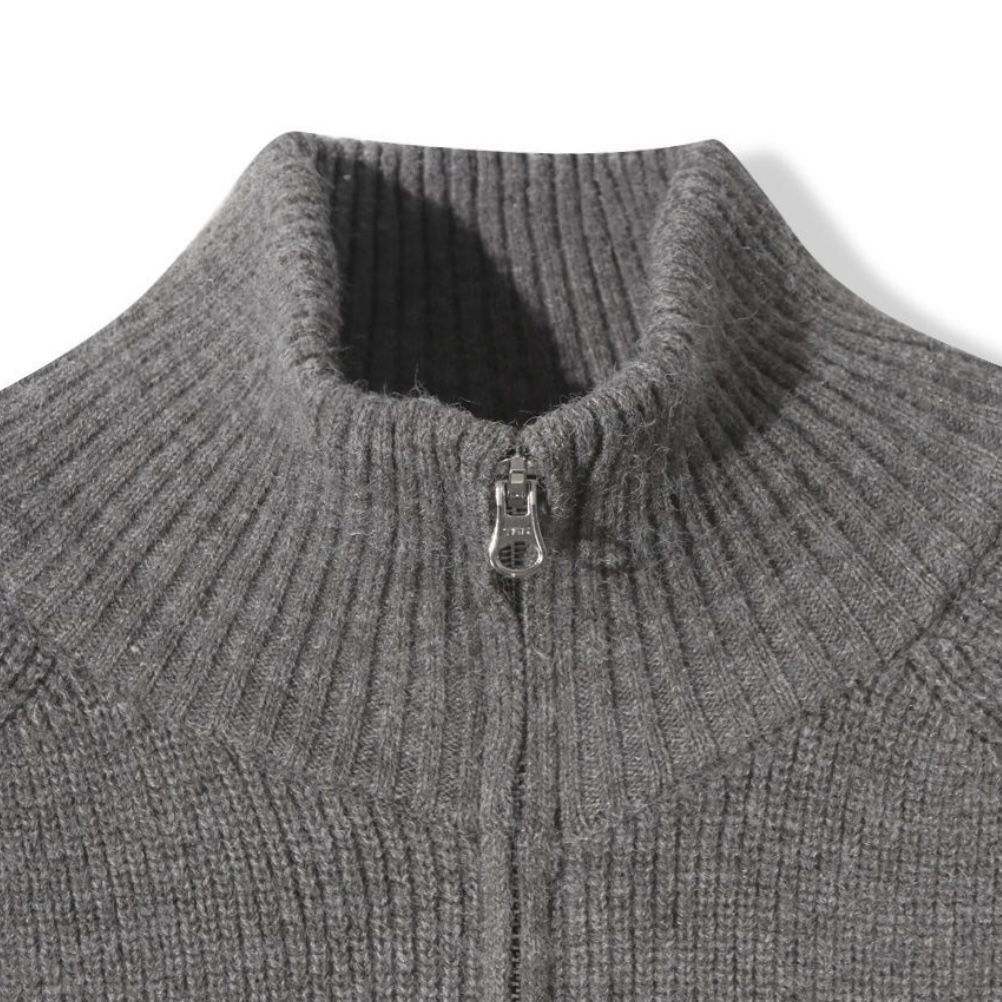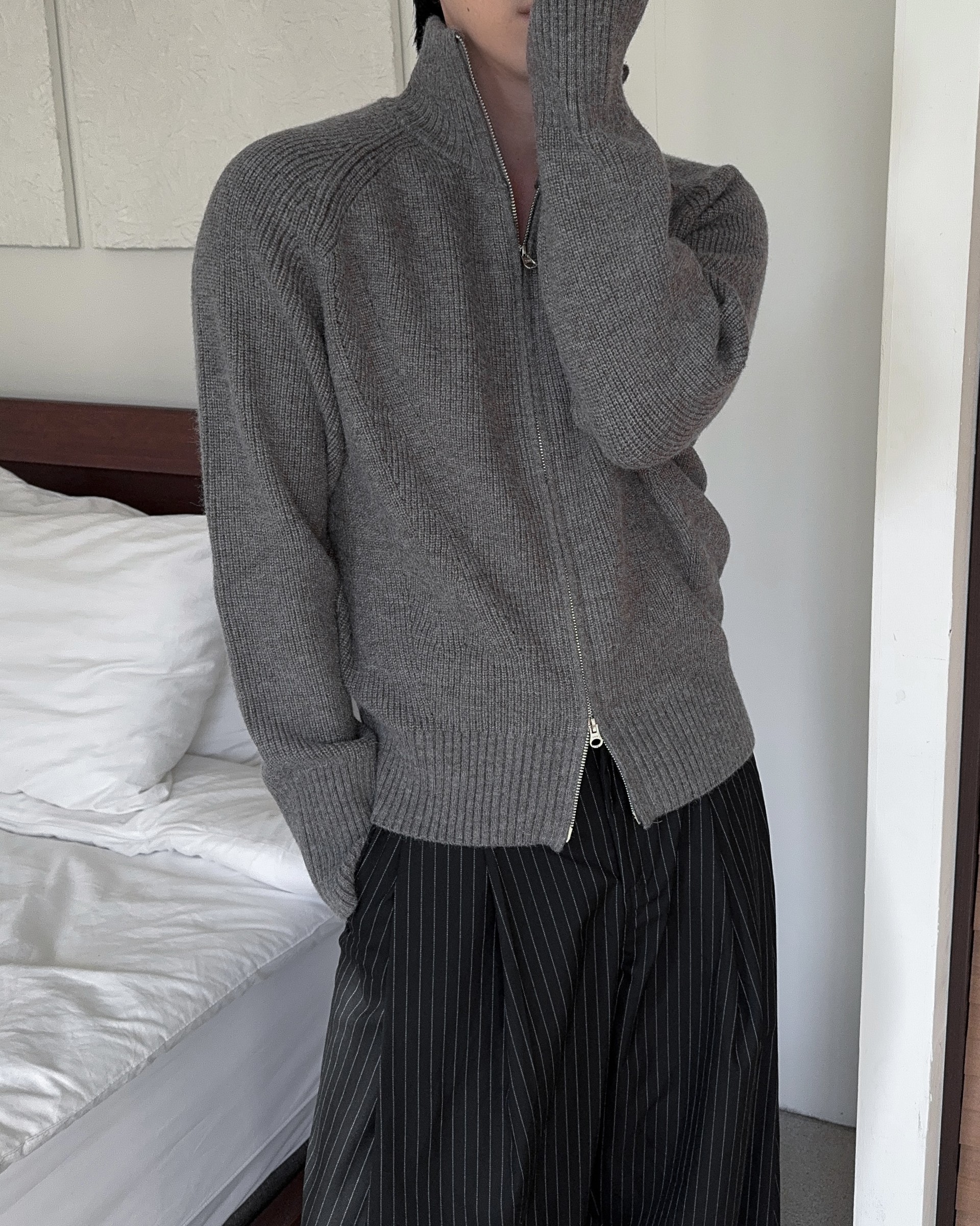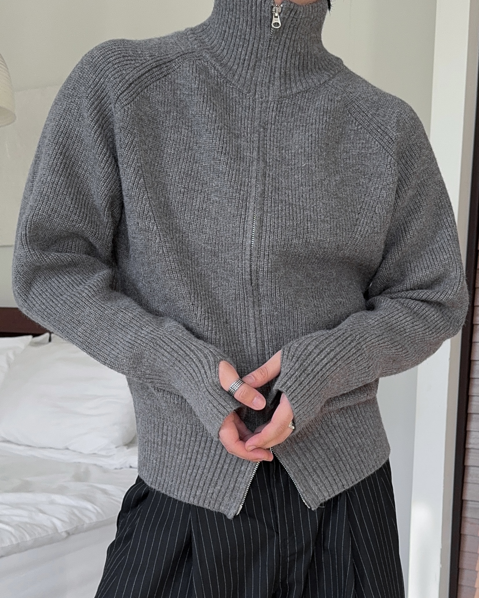 -도톰하고 탄탄한 고밀도 니트 짜임으로 제작된 하이넥 집업