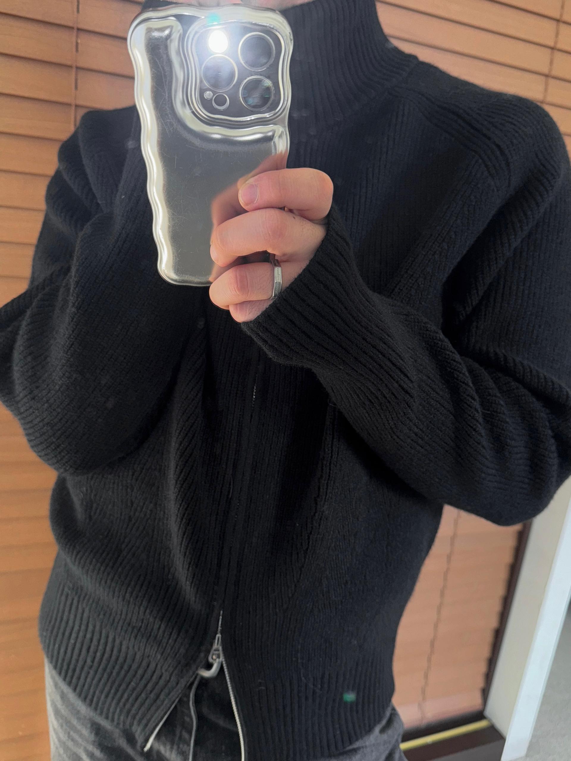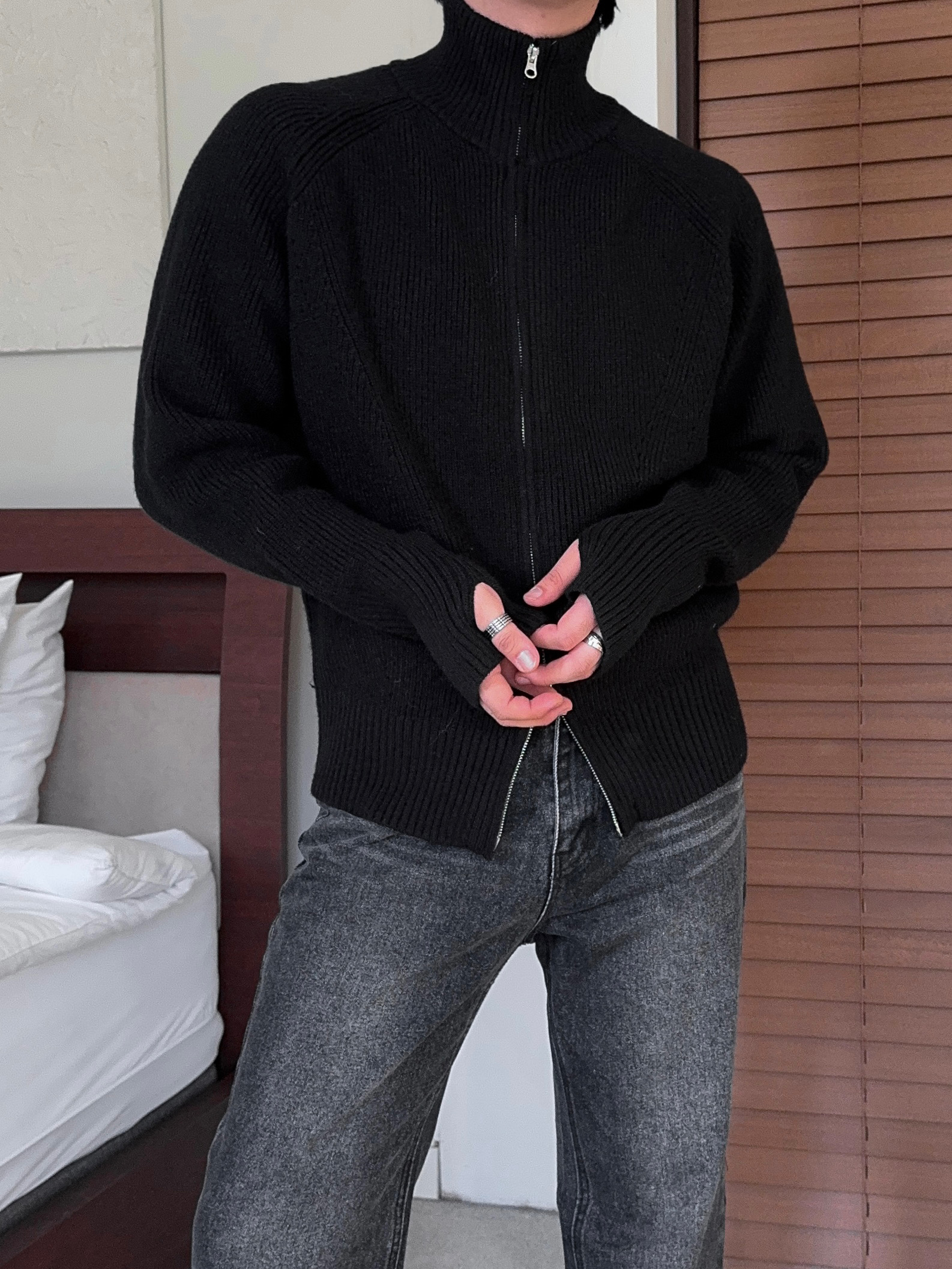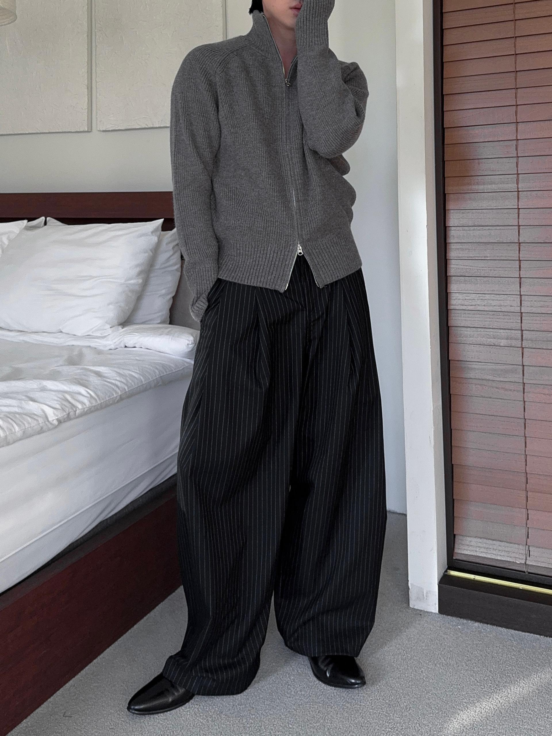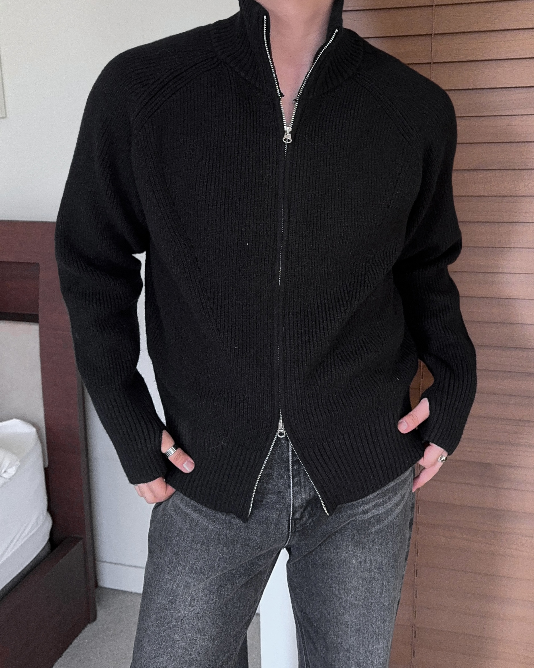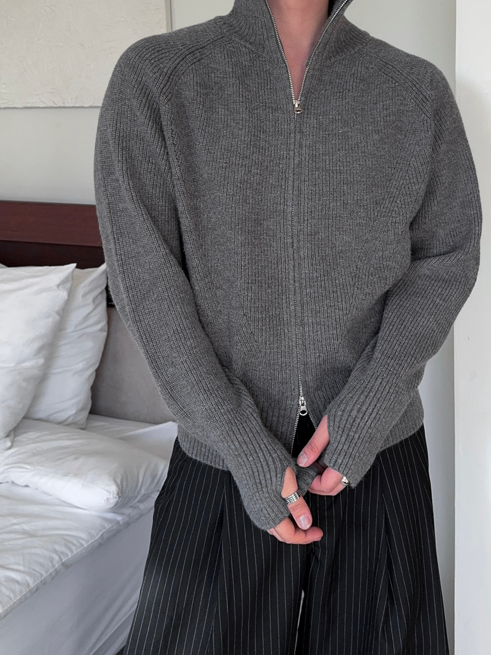 -도톰하고 탄탄한 고밀도 니트 짜임으로 제작된 하이넥 집업