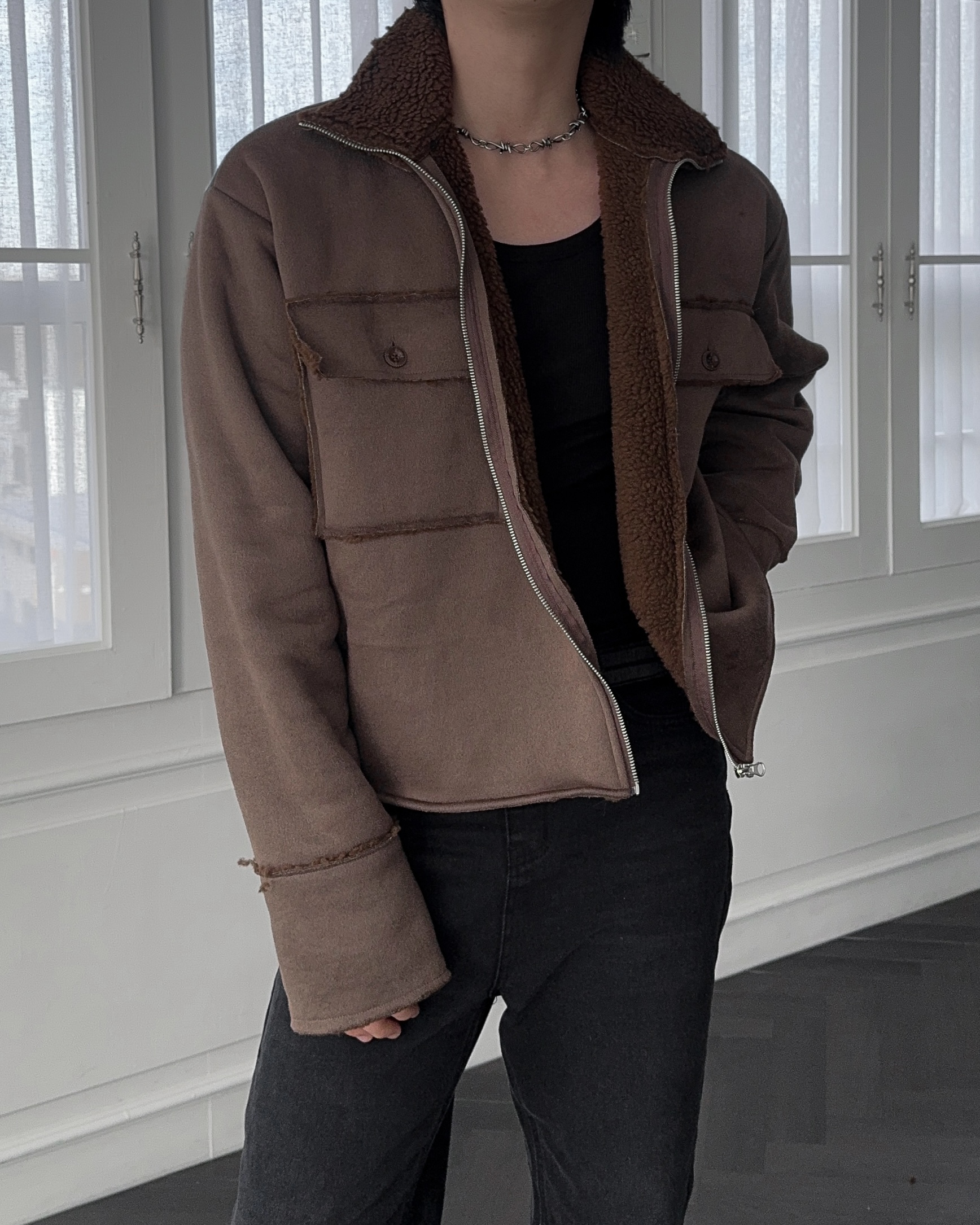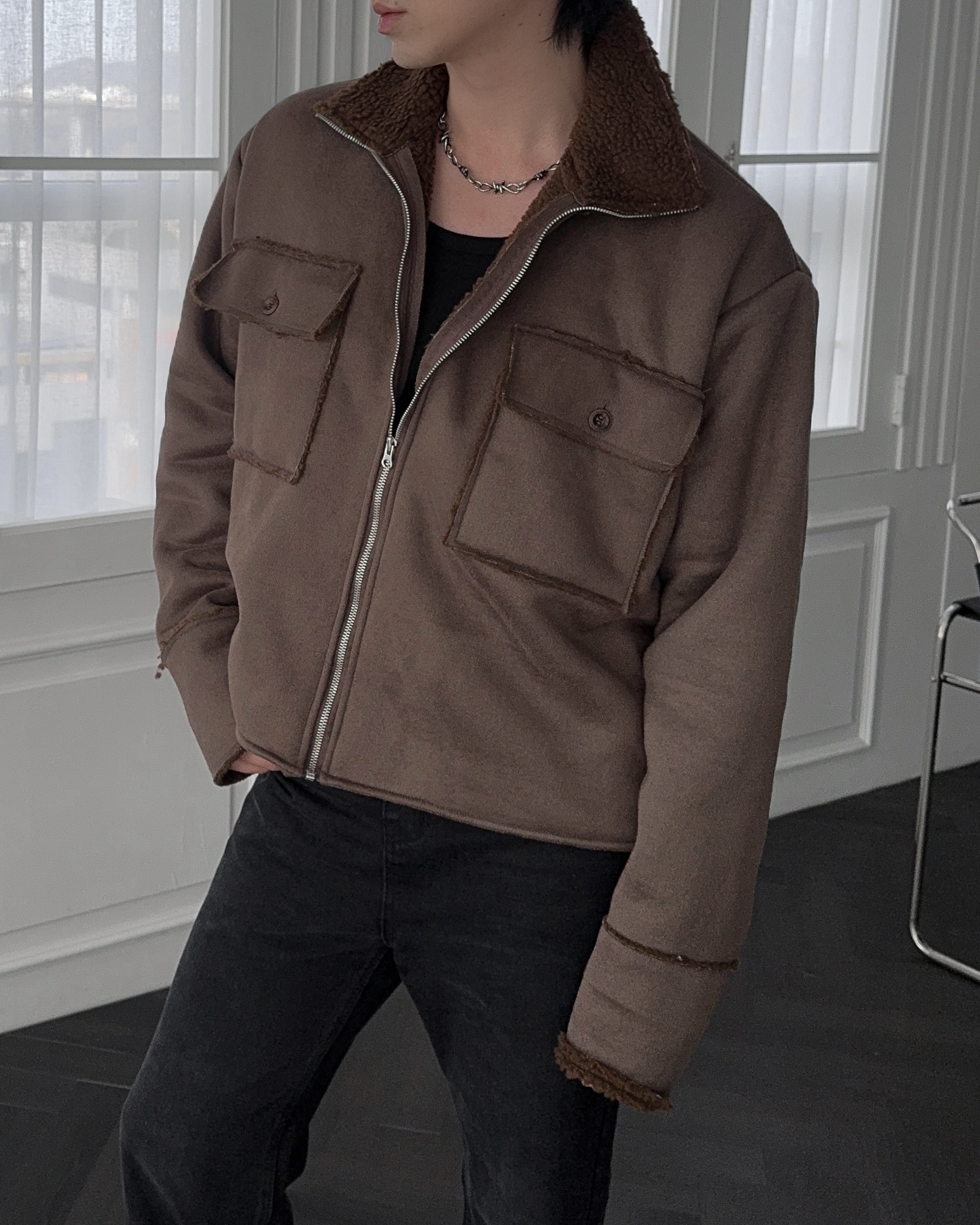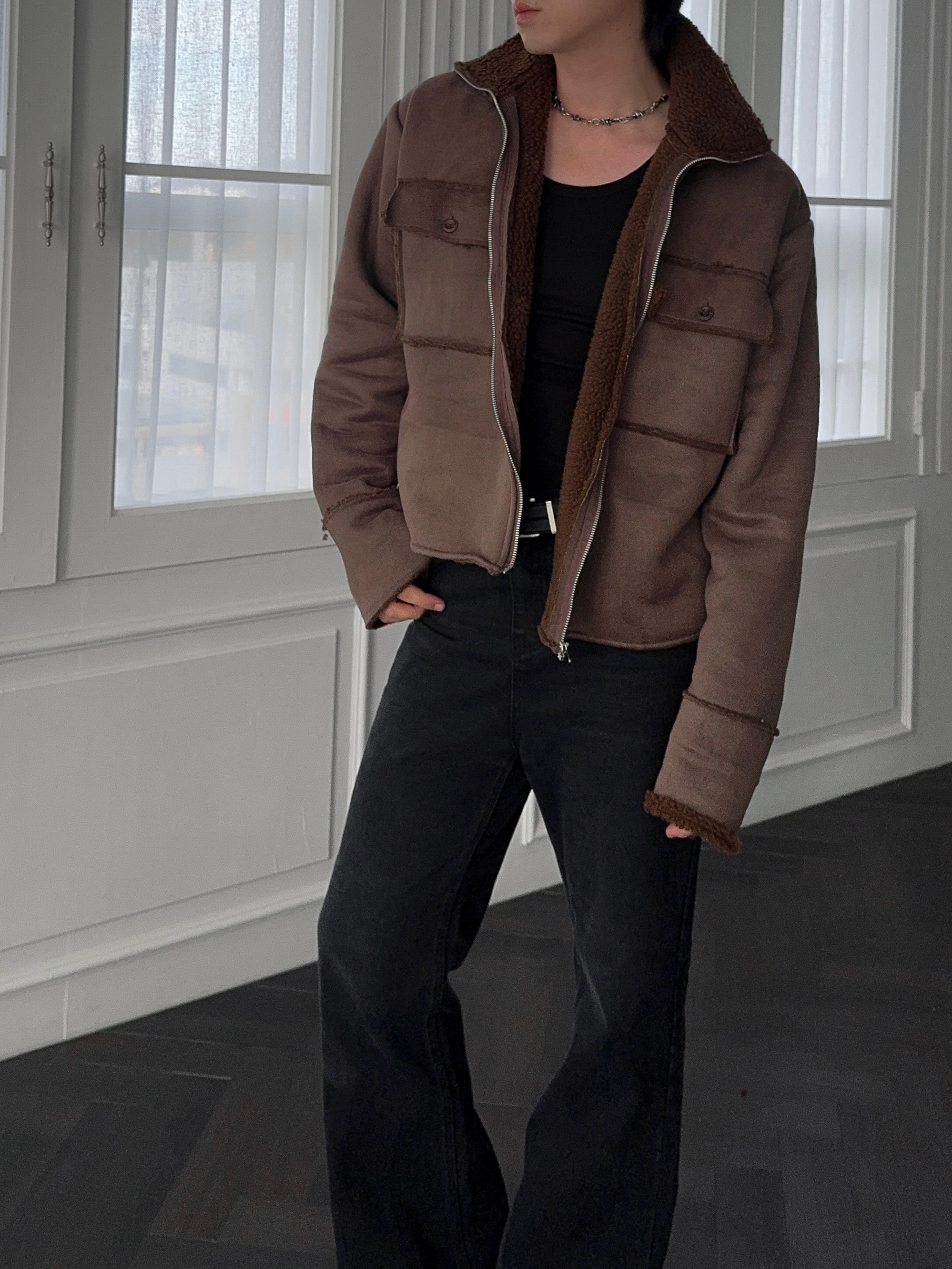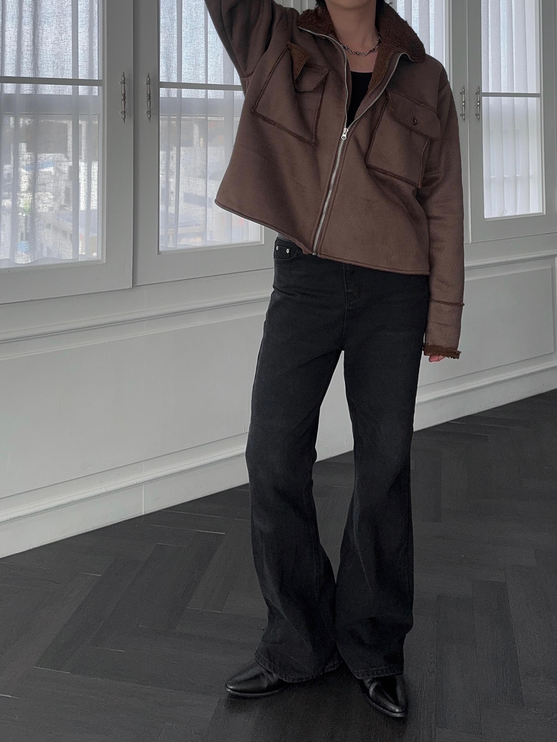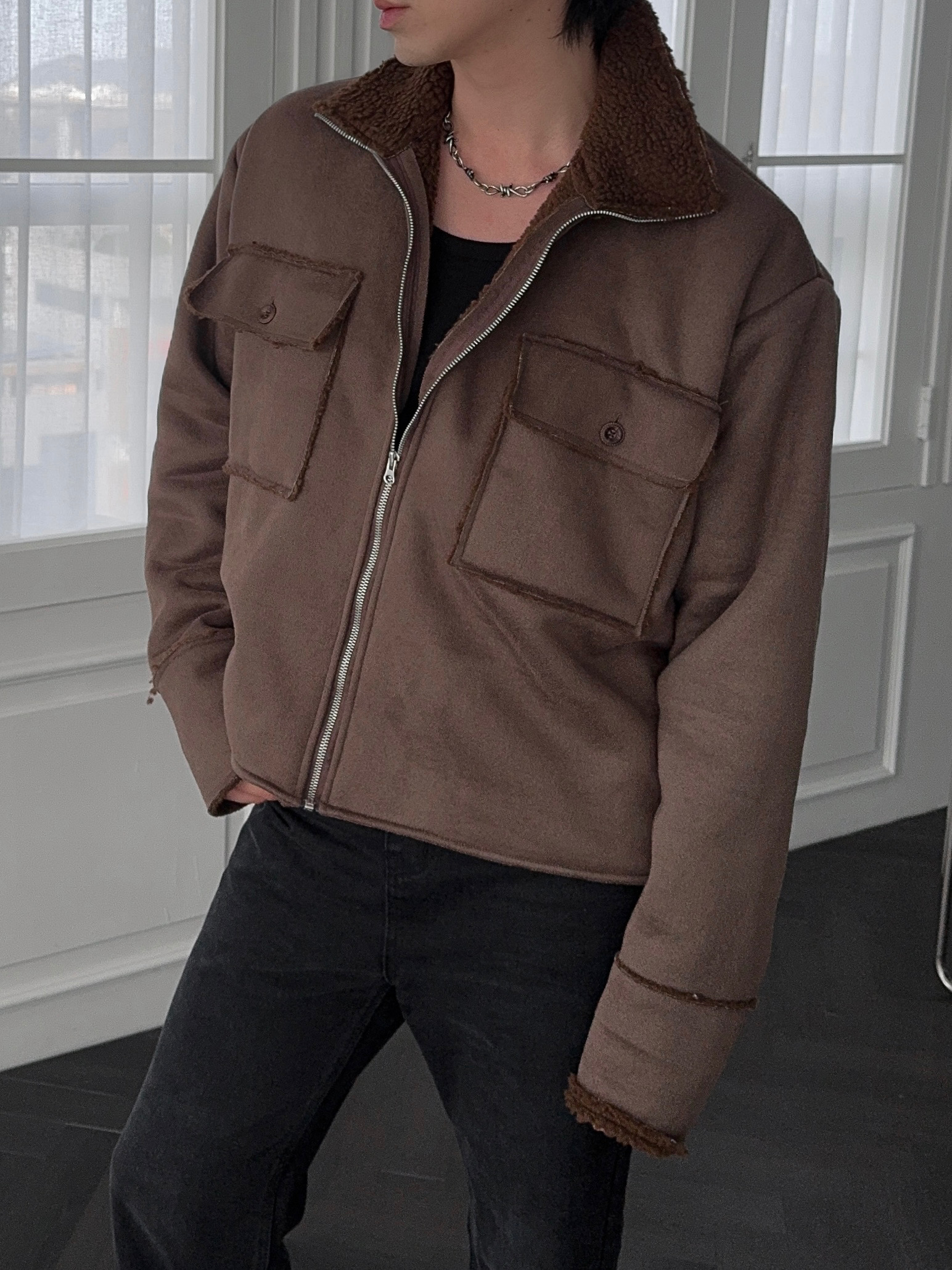 -부드러운 스웨이드 소재로 제작된 무스탕 자켓
