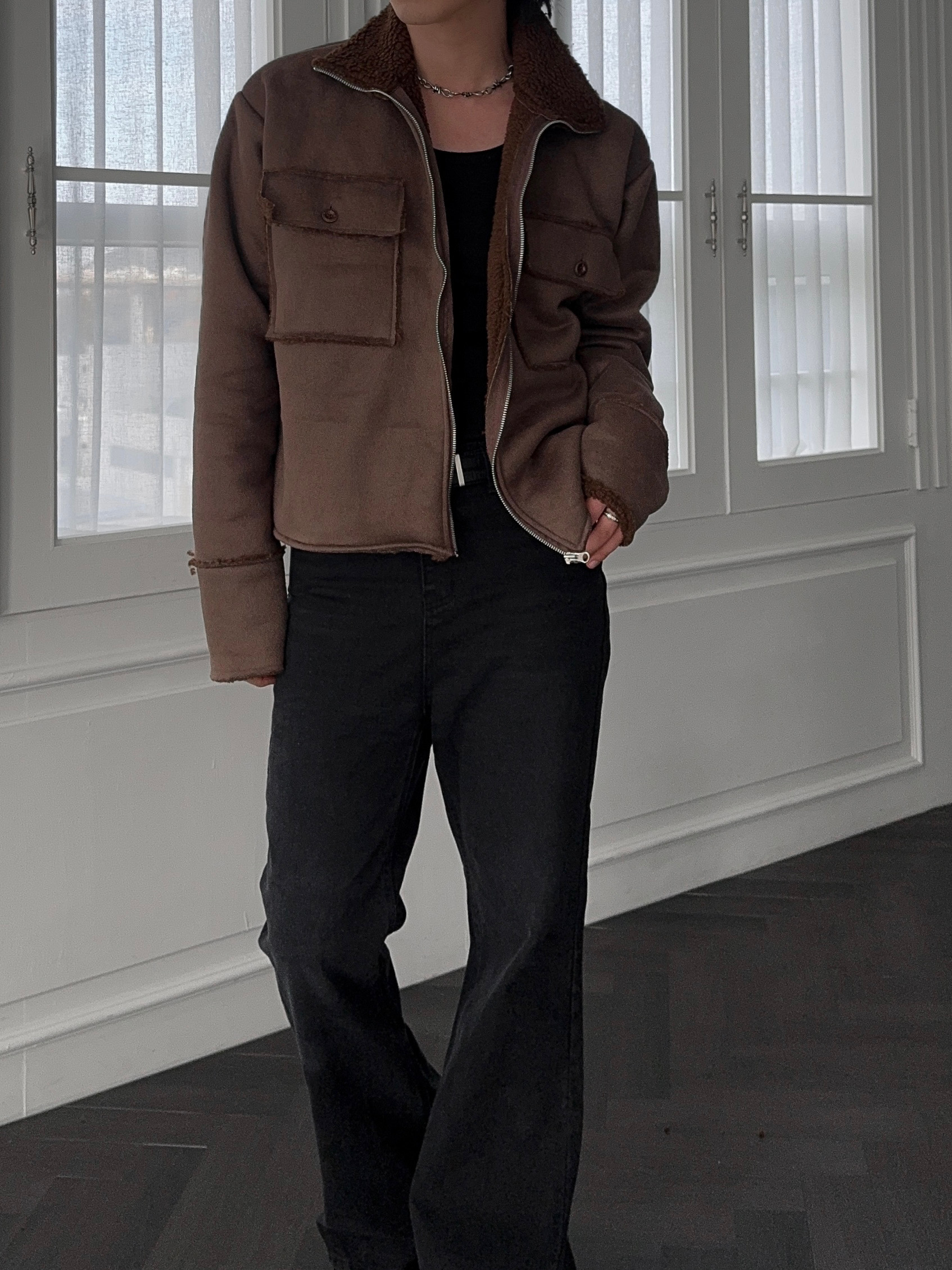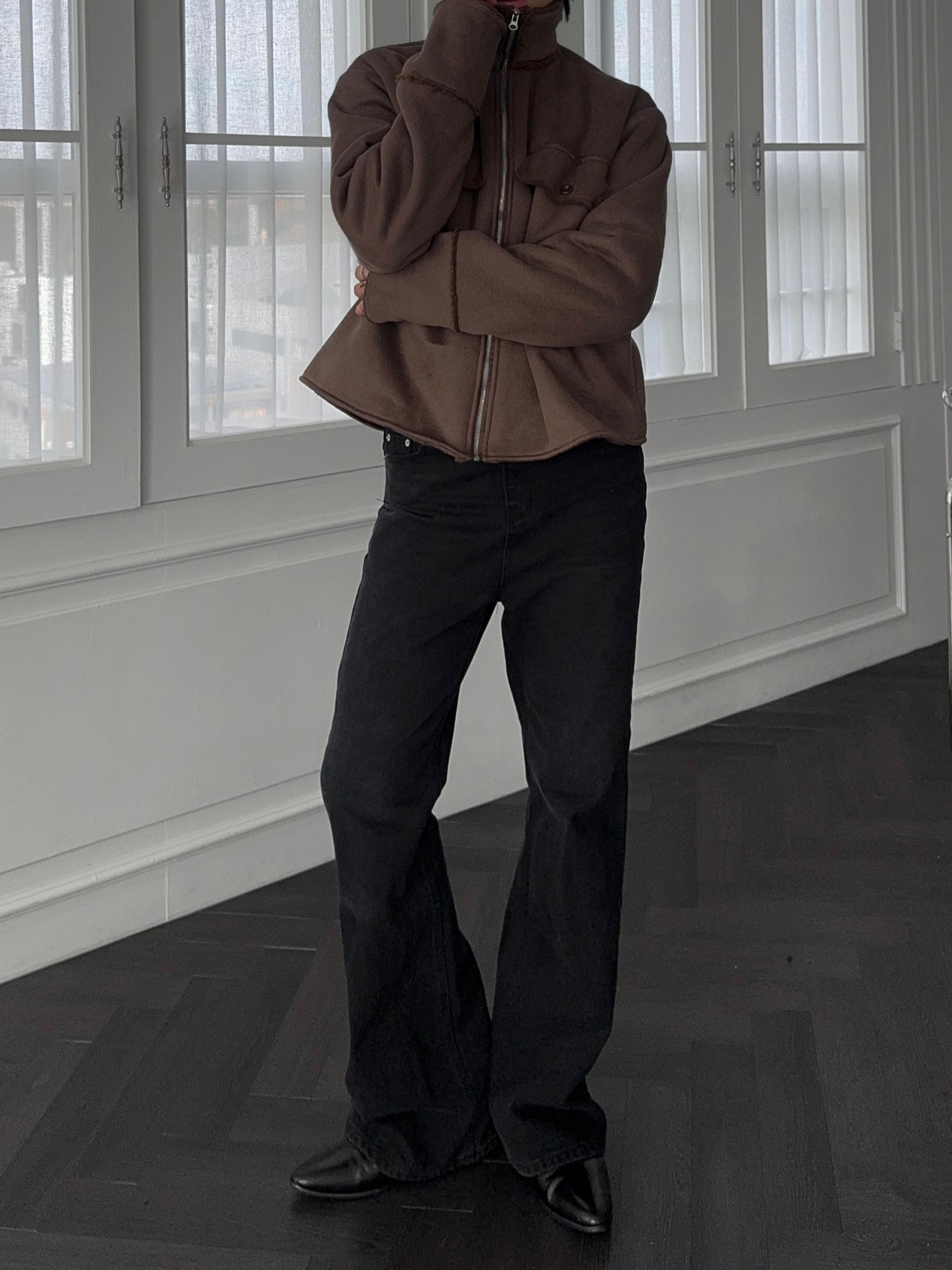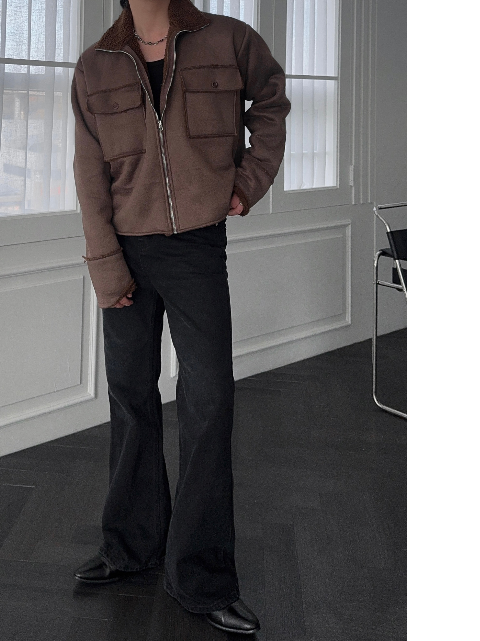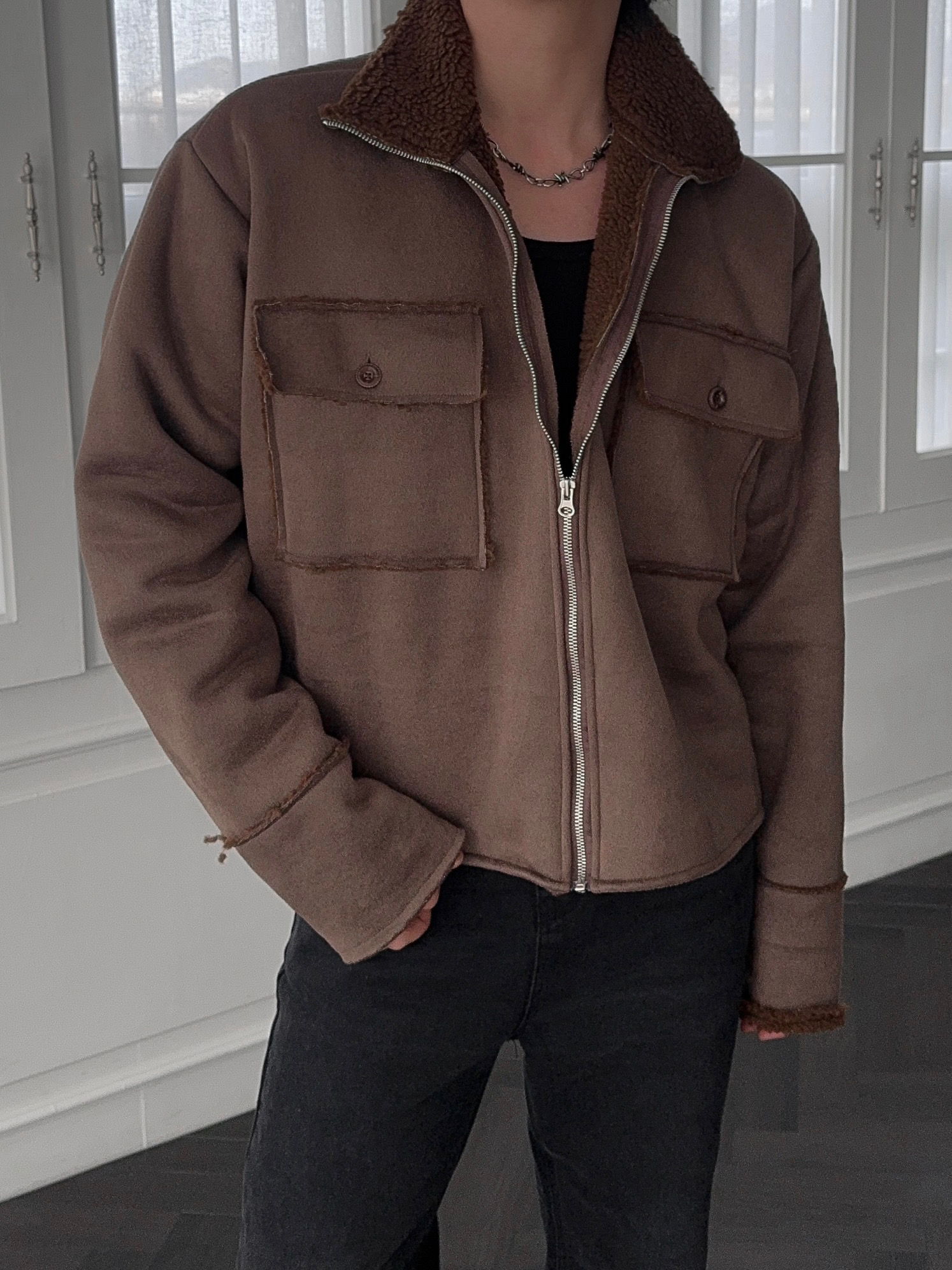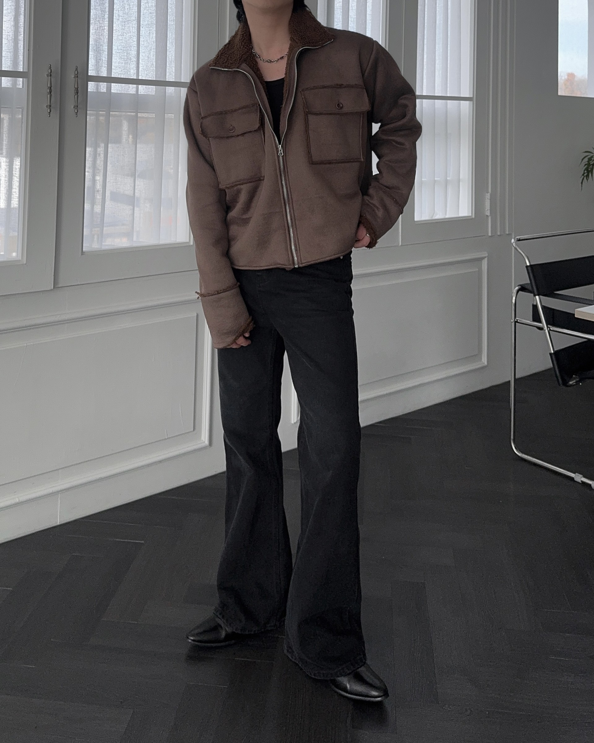 -부드러운 스웨이드 소재로 제작된 무스탕 자켓