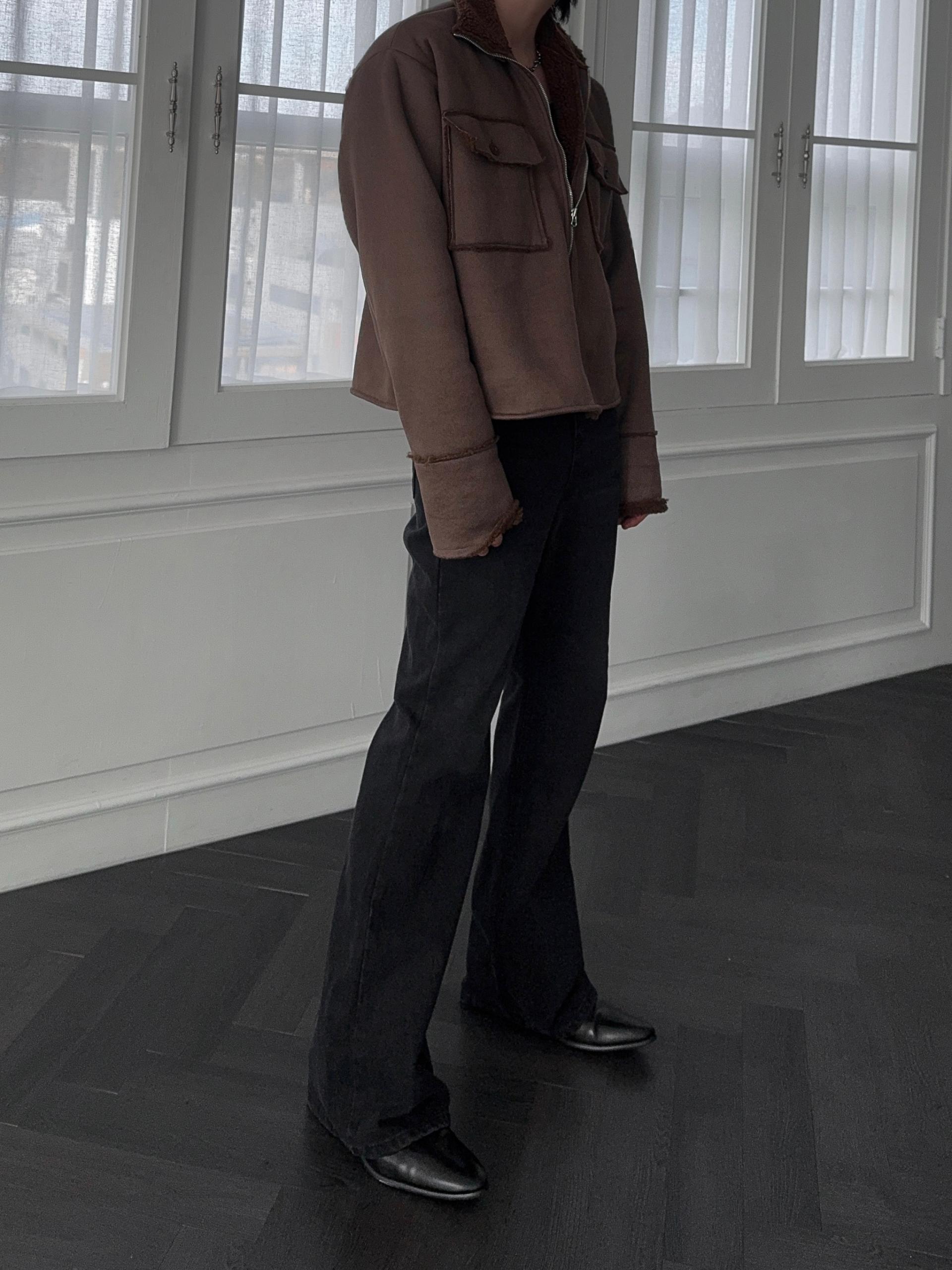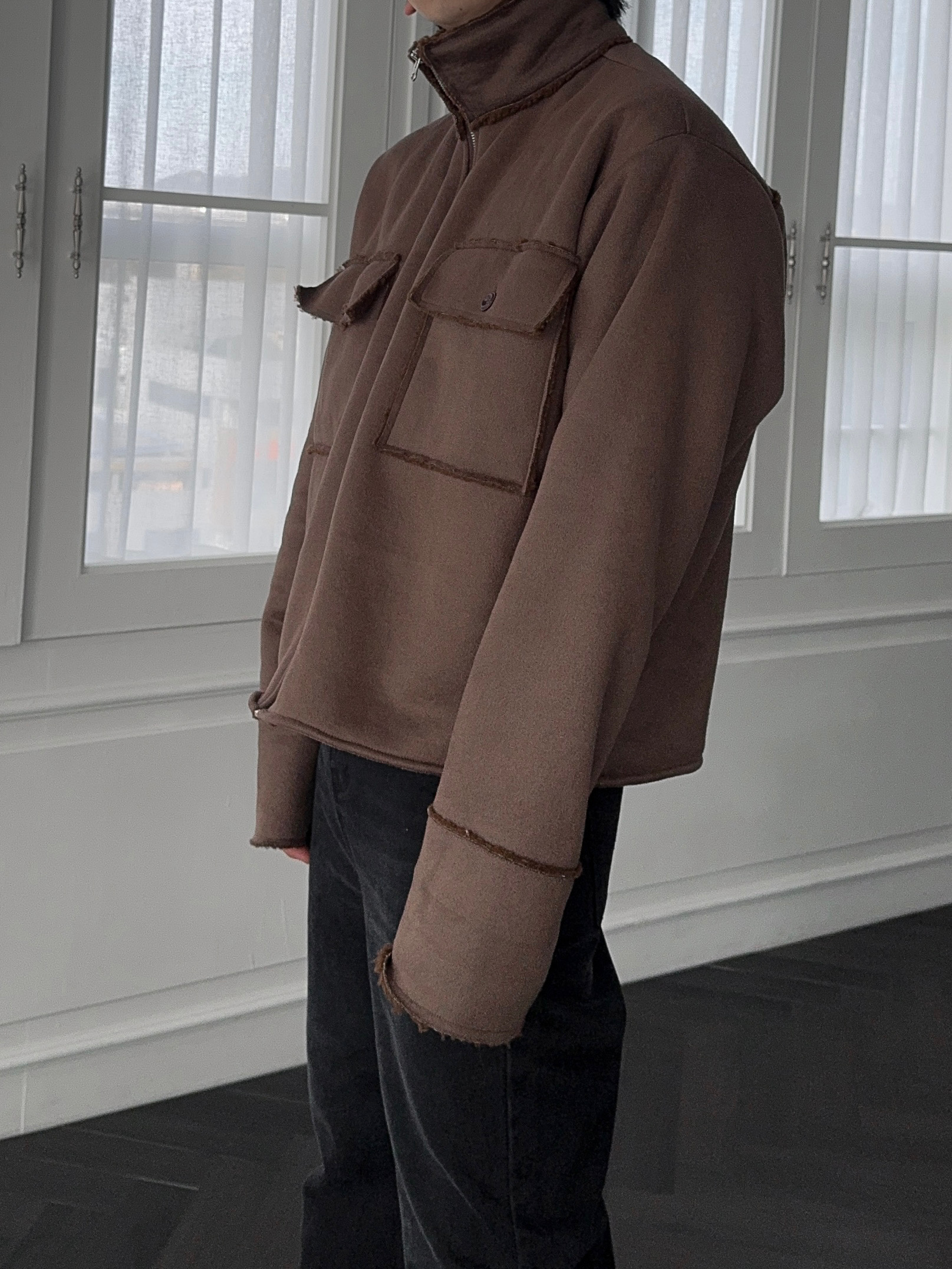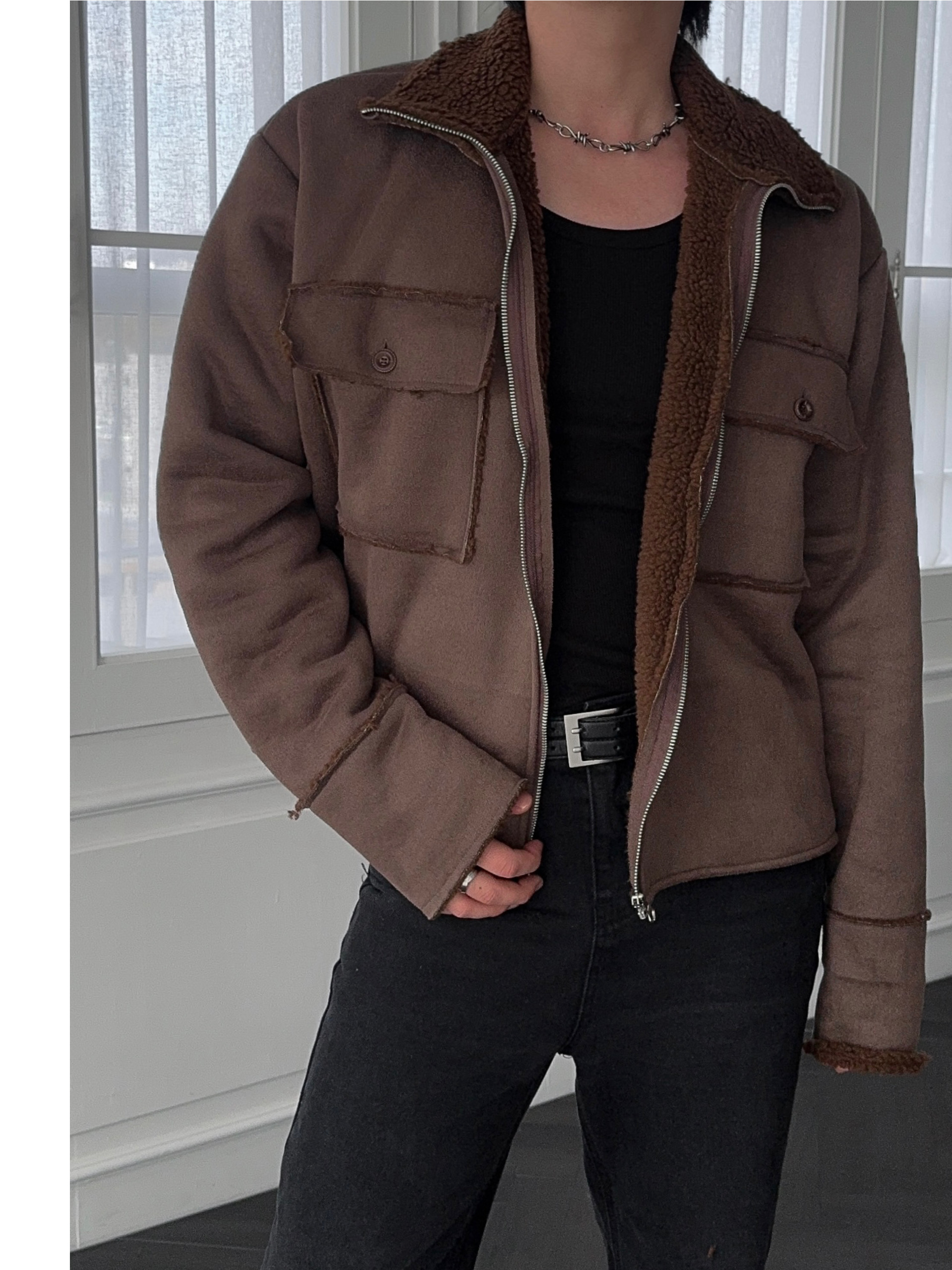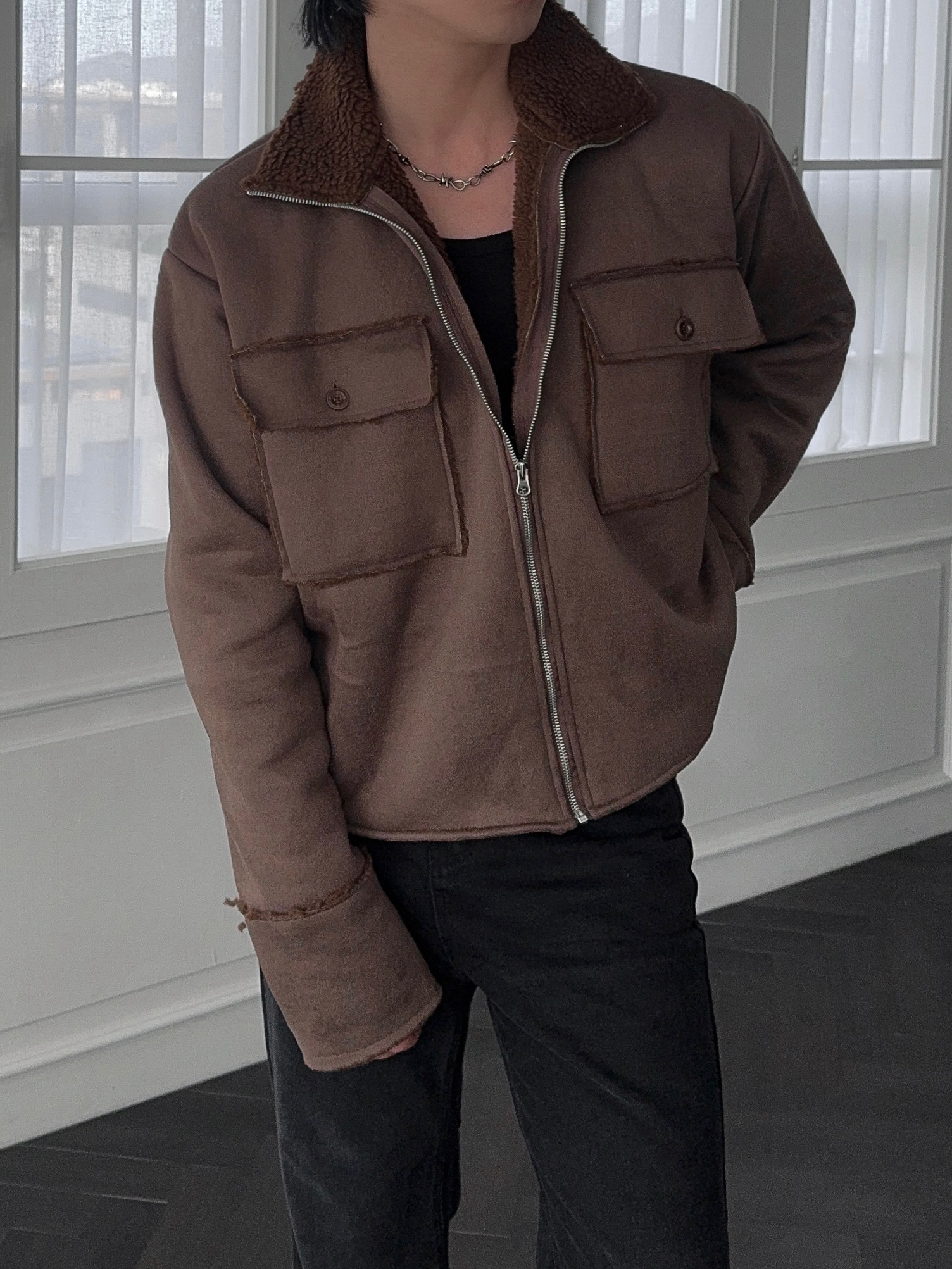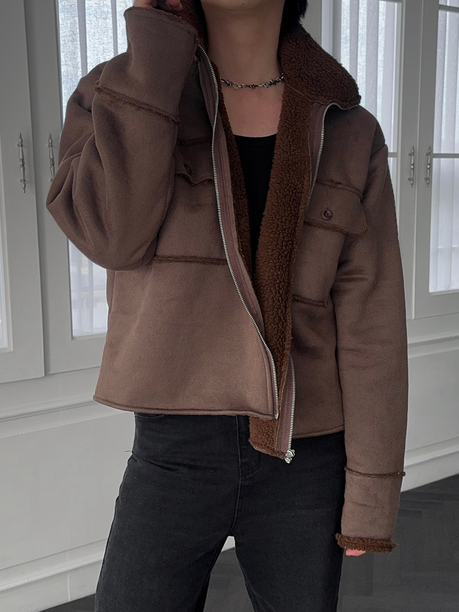 -부드러운 스웨이드 소재로 제작된 무스탕 자켓