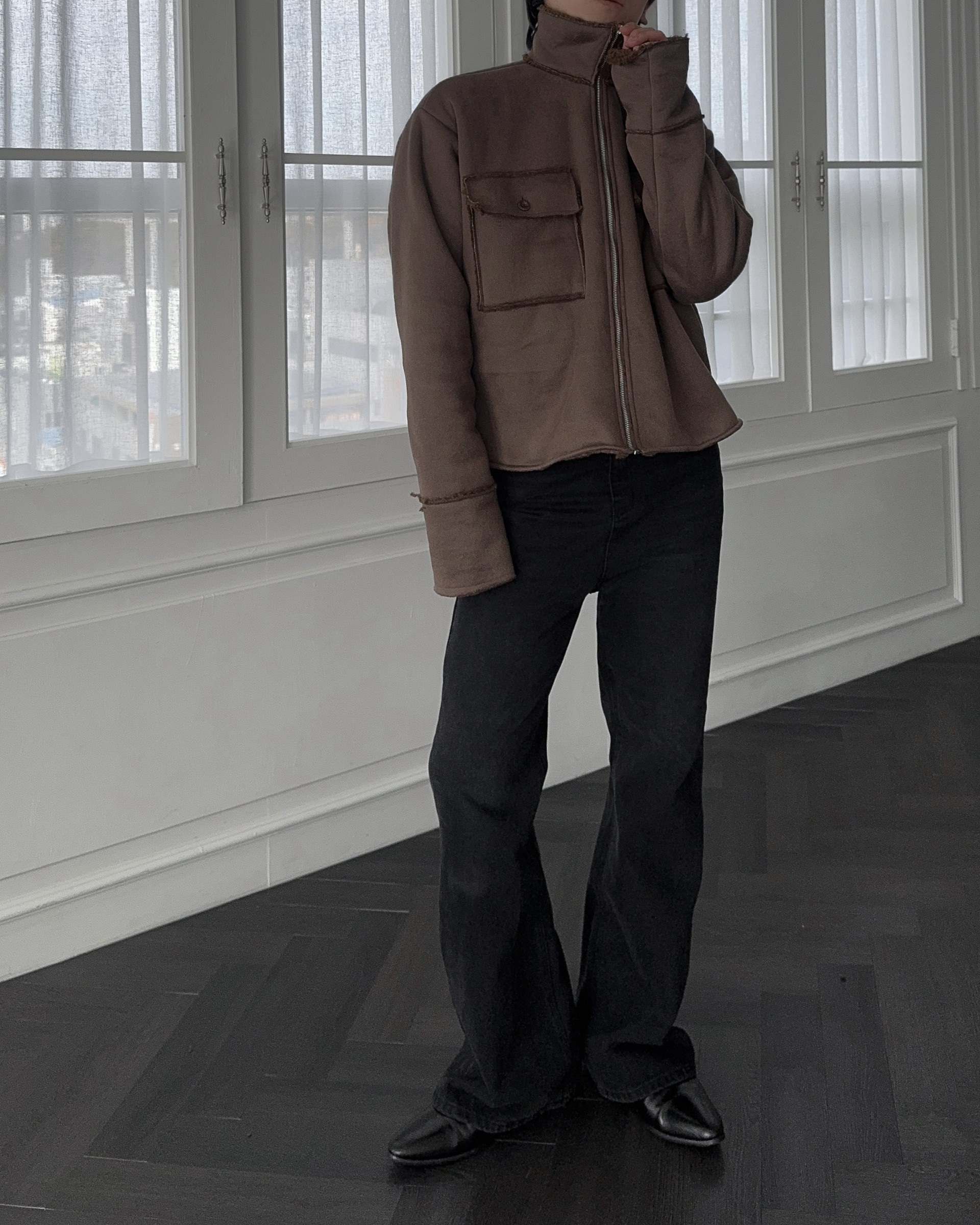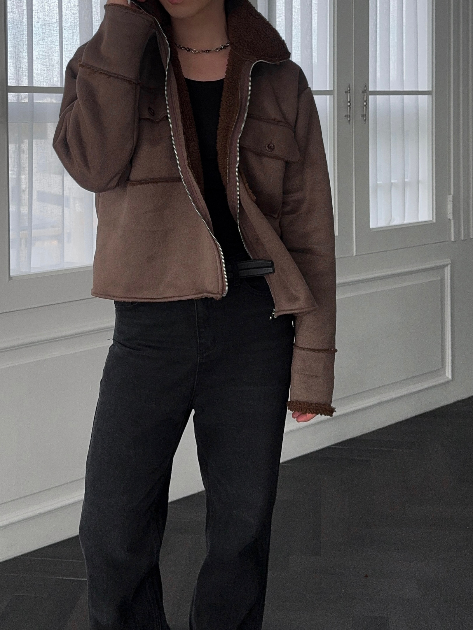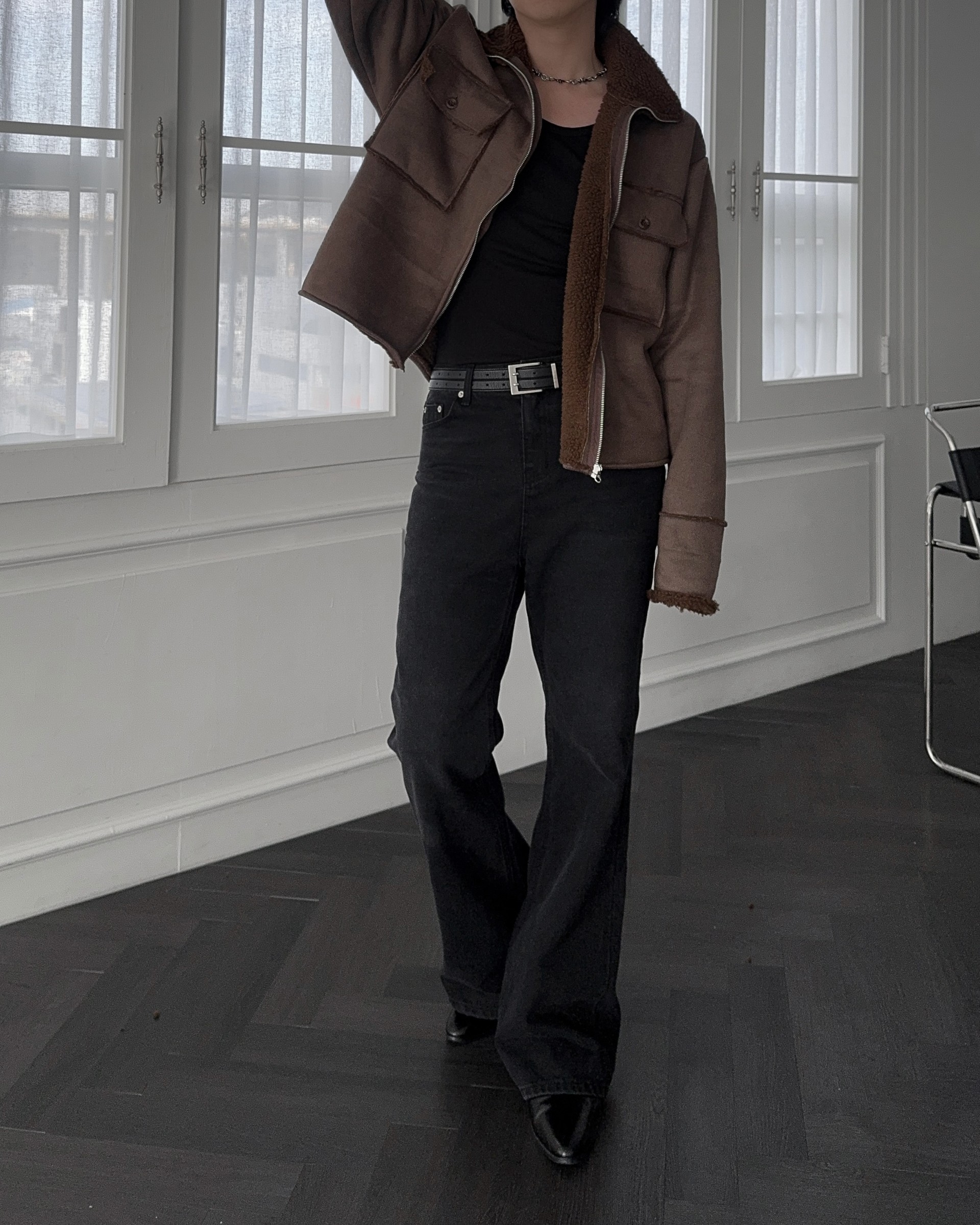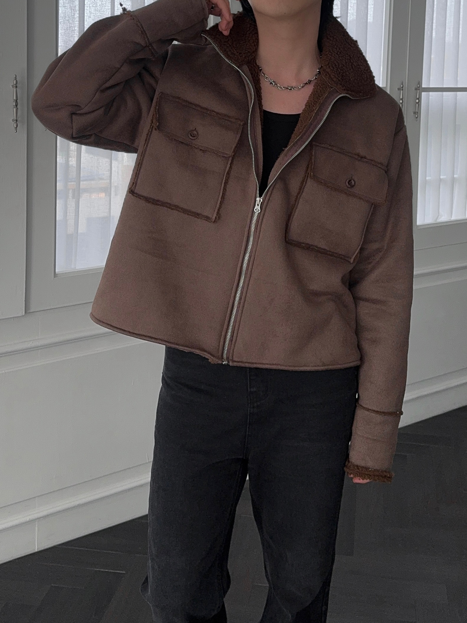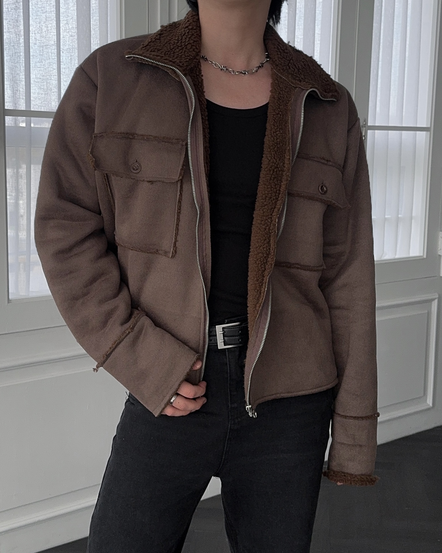 -부드러운 스웨이드 소재로 제작된 무스탕 자켓