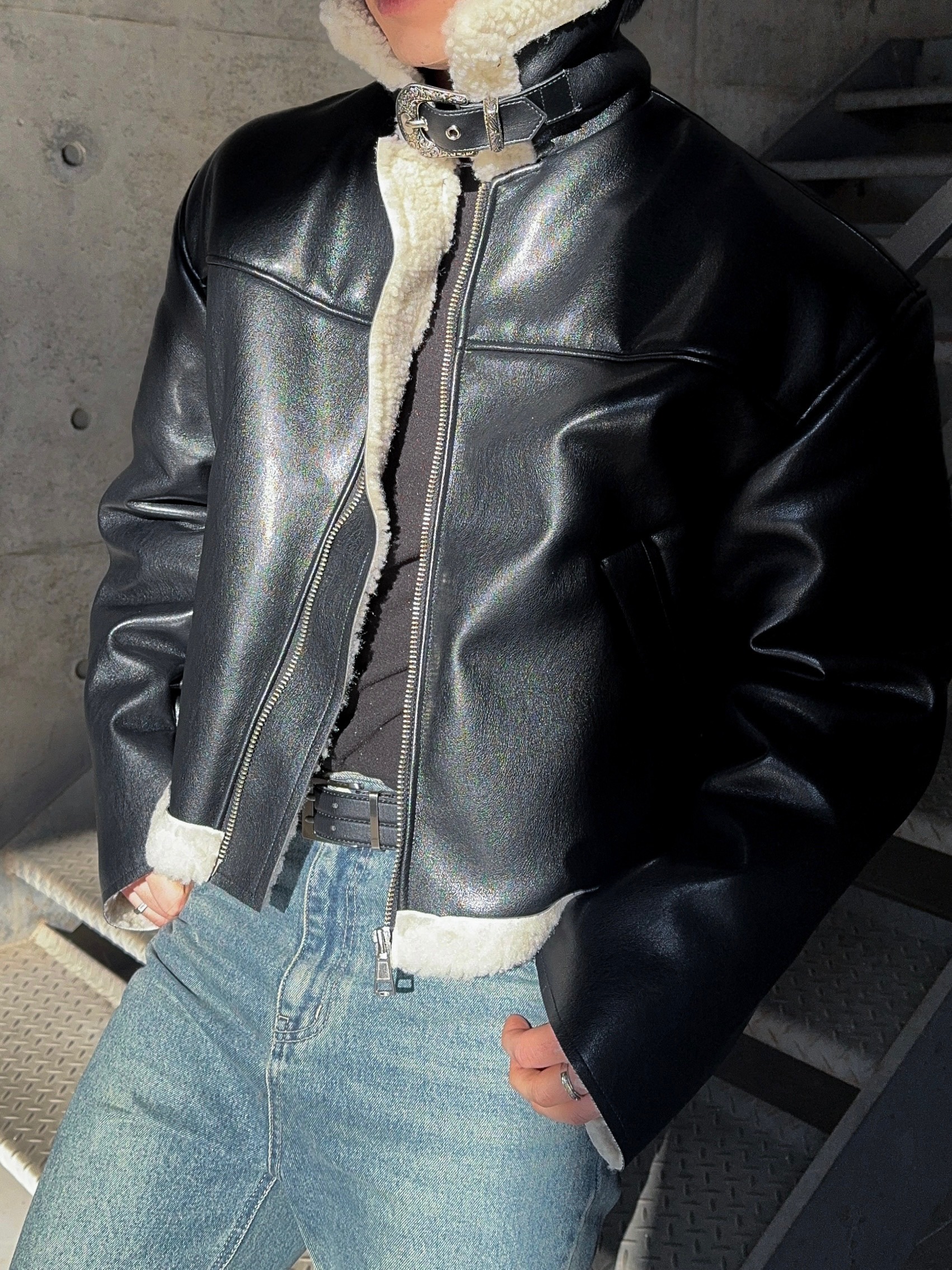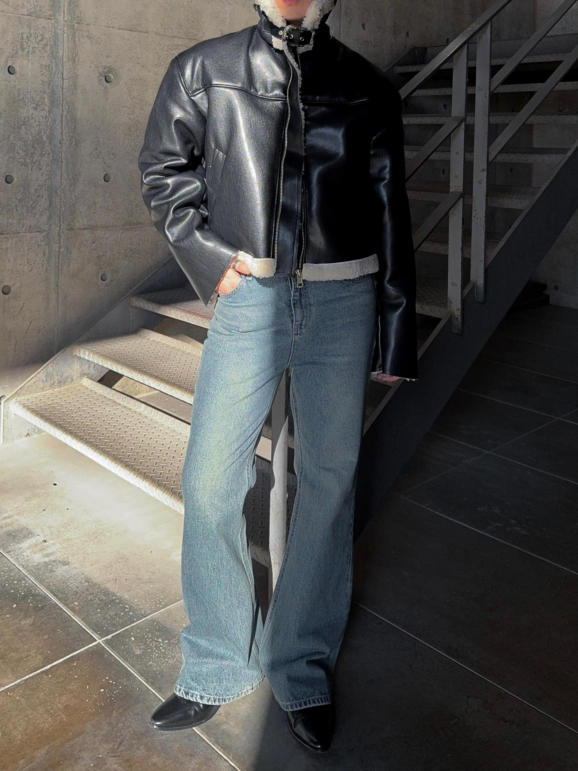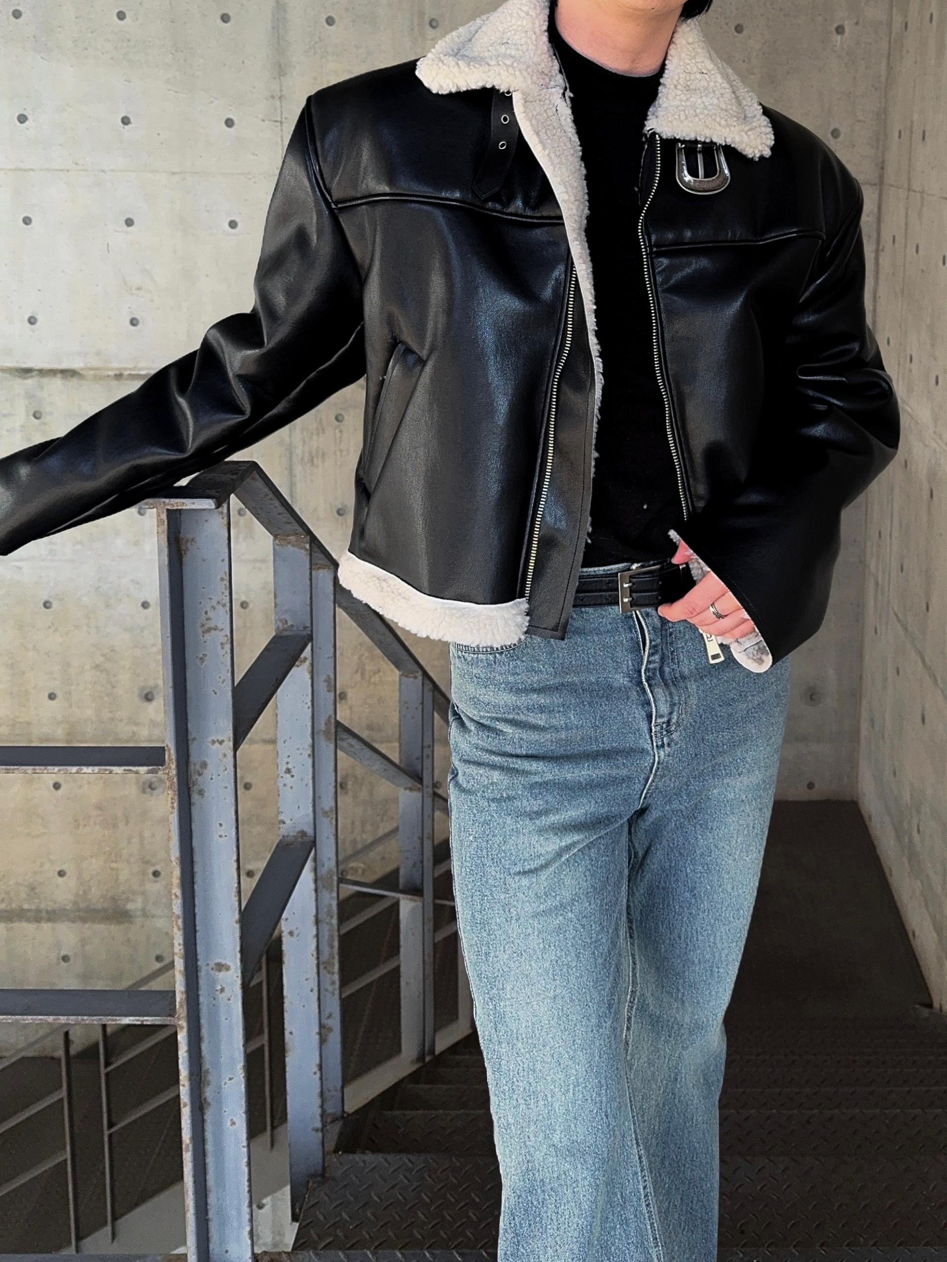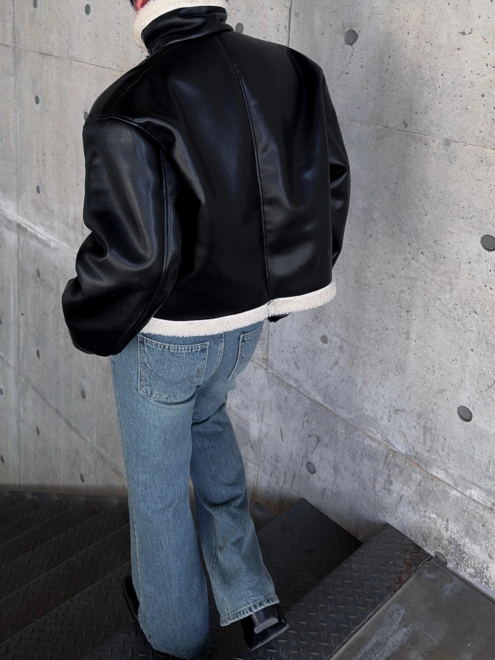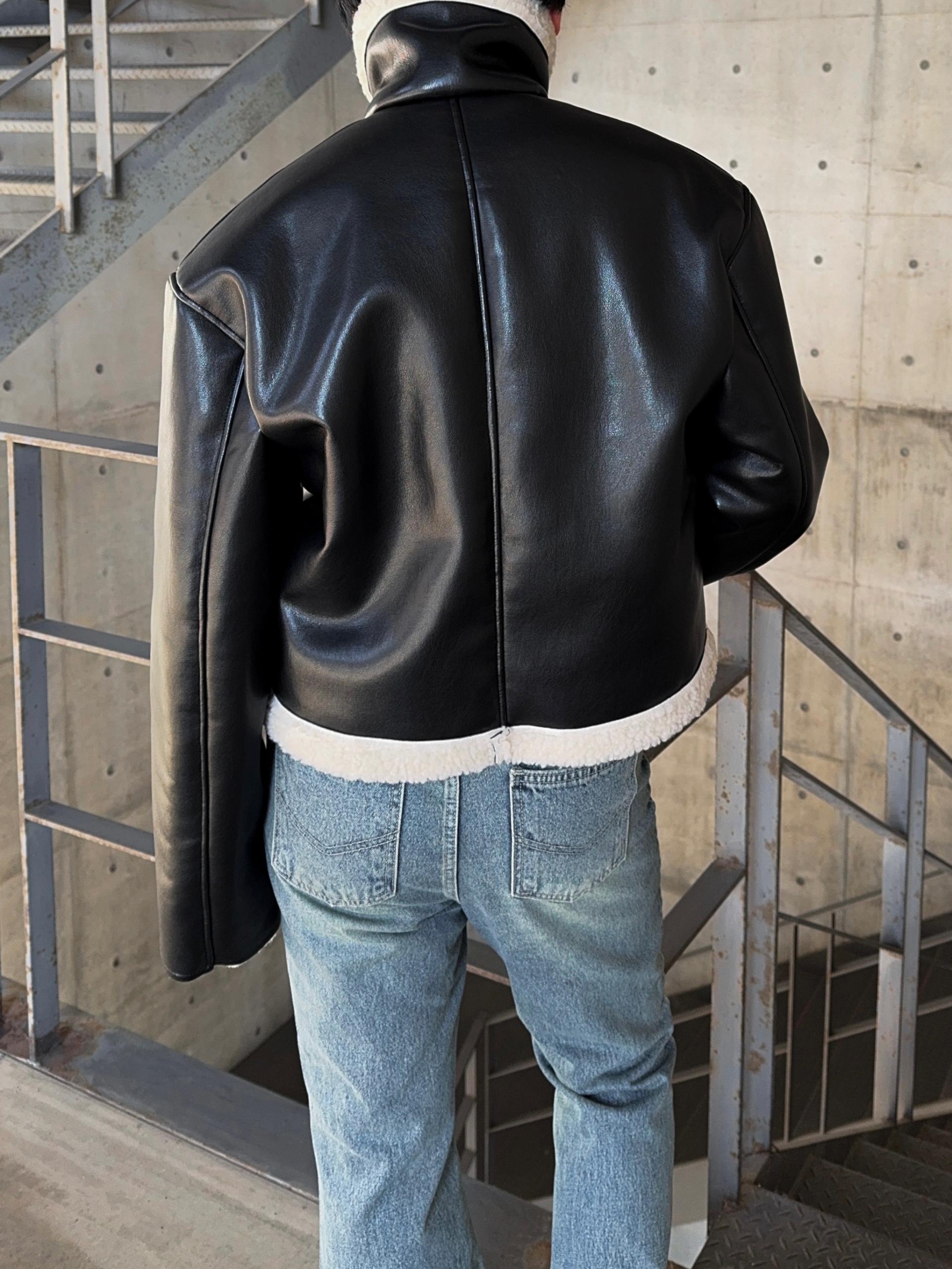 -은은한 광택감이 도는 레더 소재로 제작된 크롭 무스탕