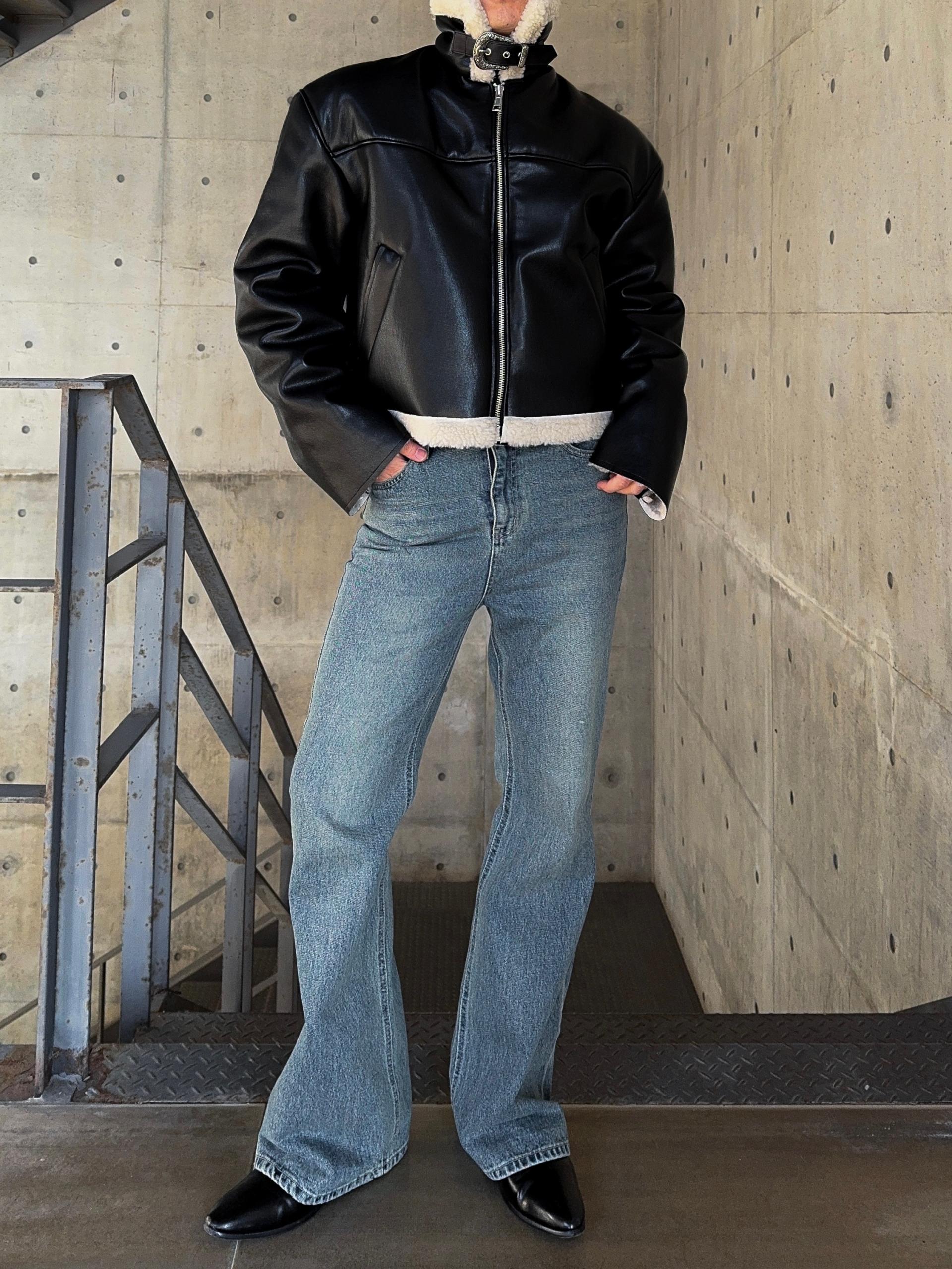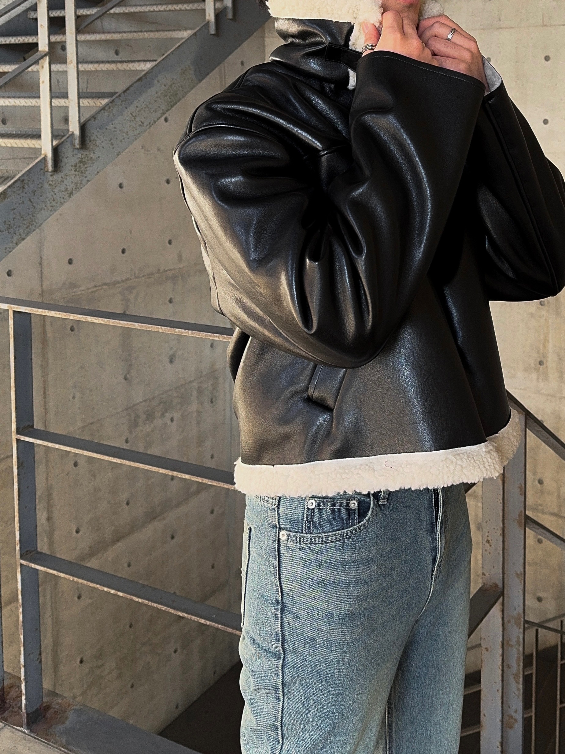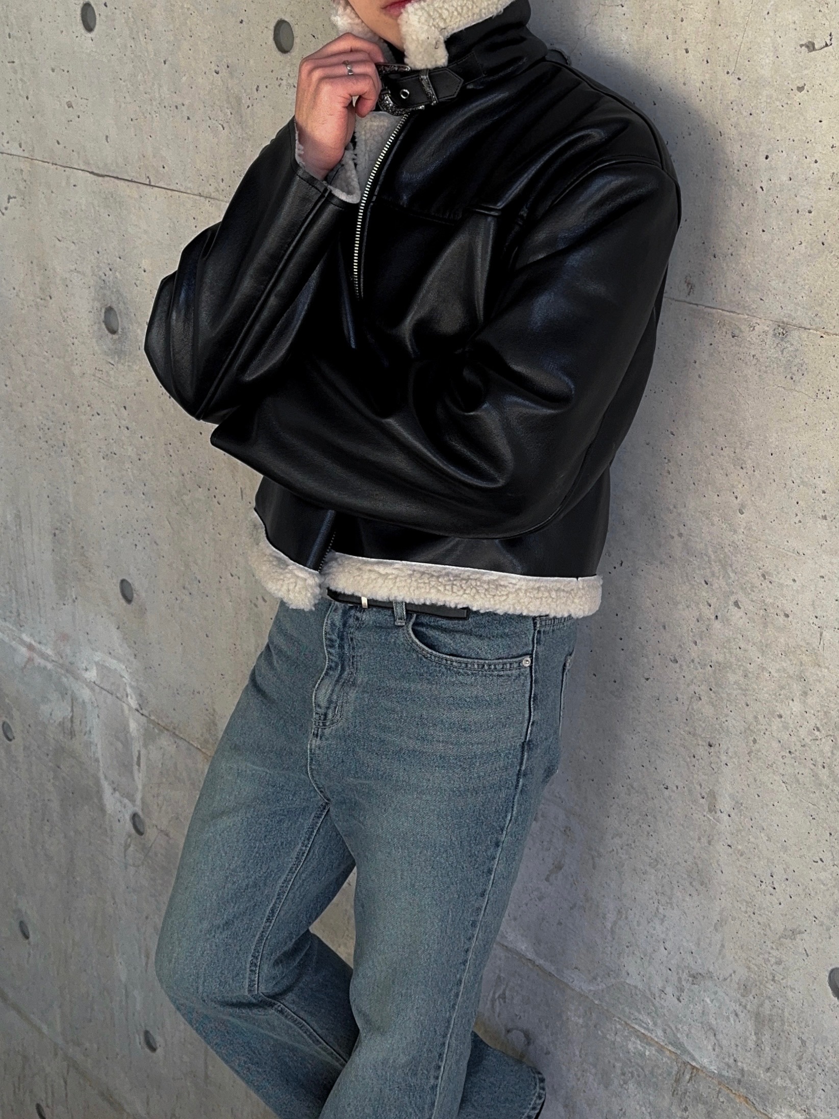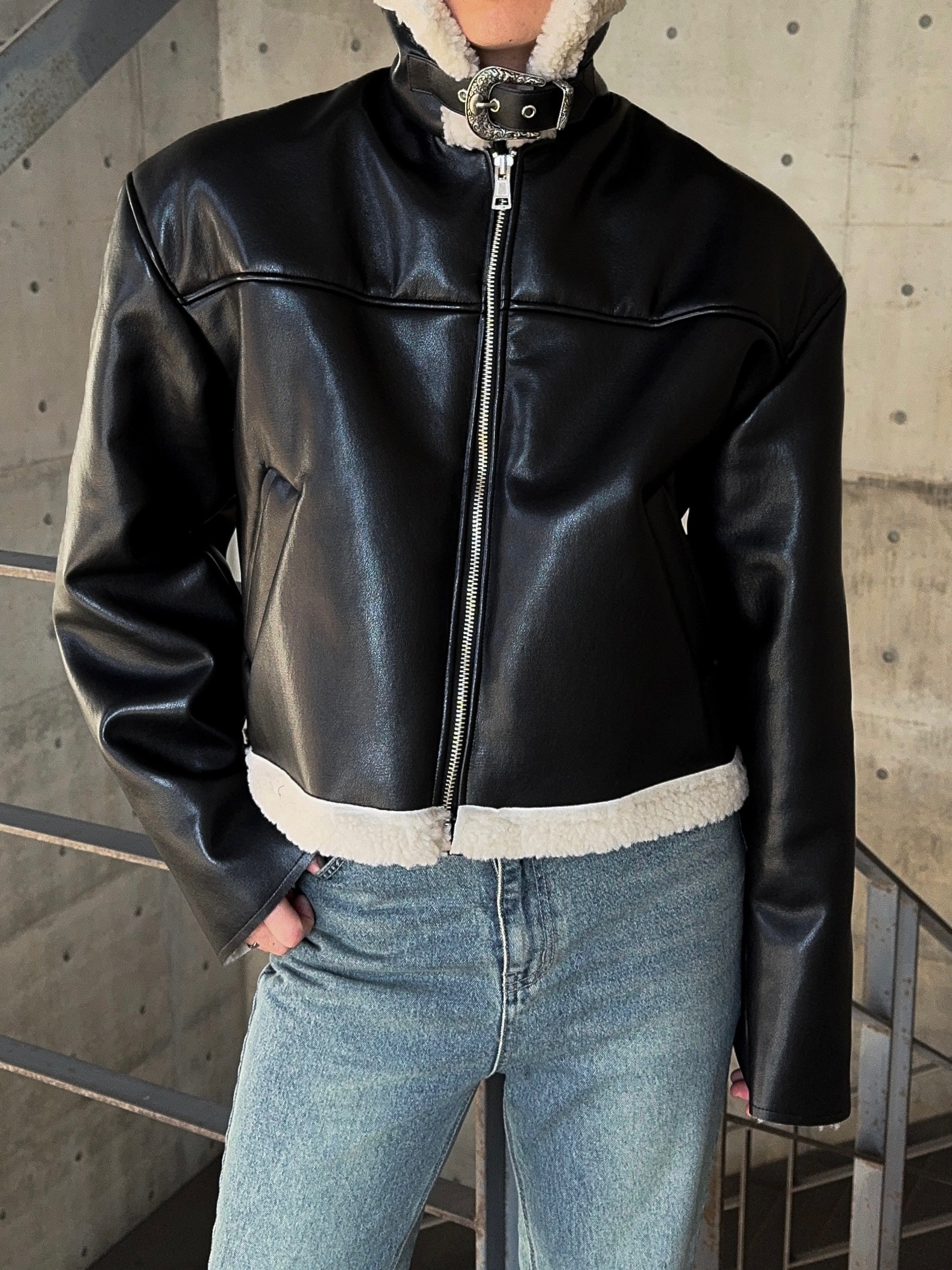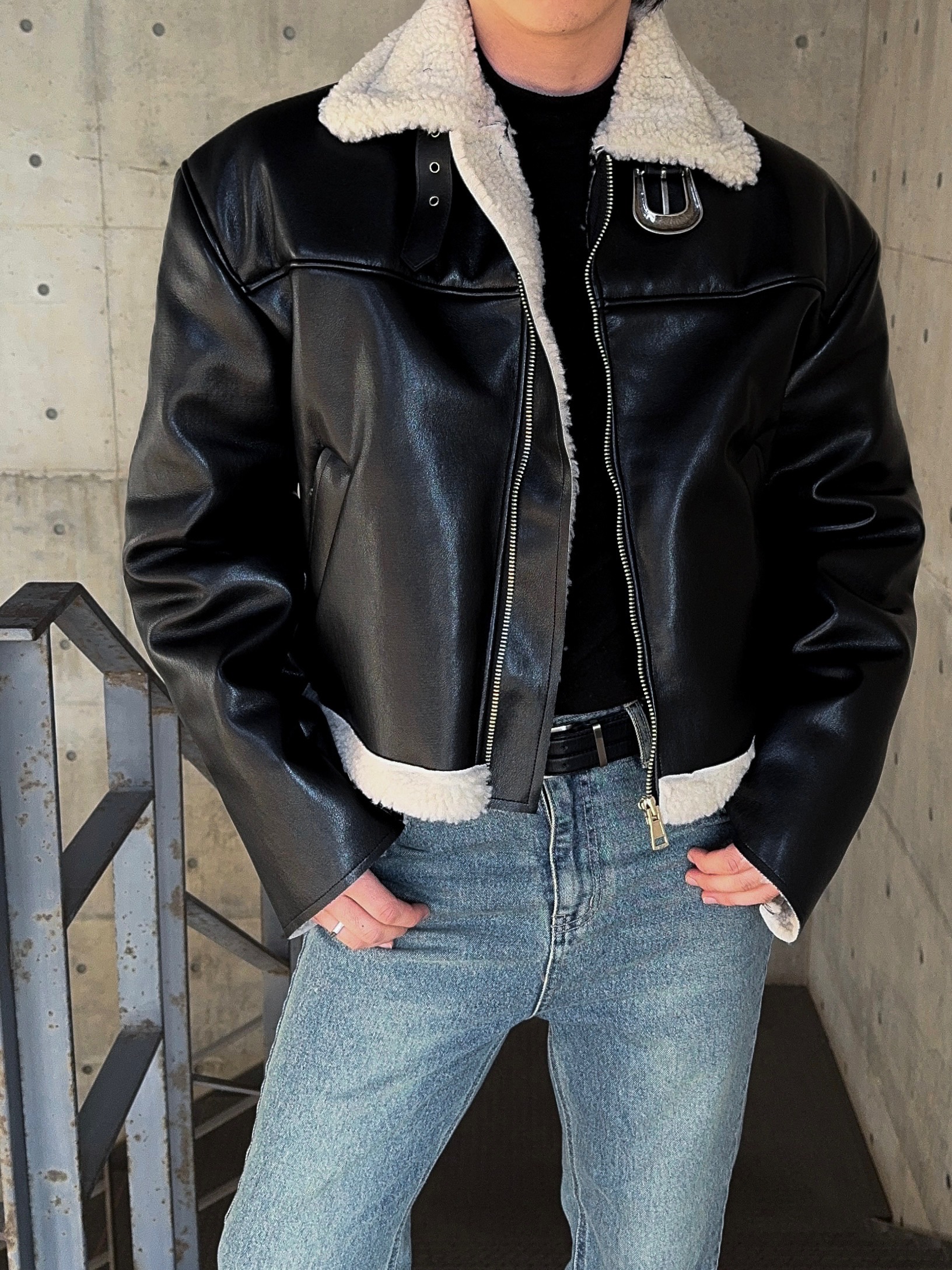-은은한 광택감이 도는 레더 소재로 제작된 크롭 무스탕