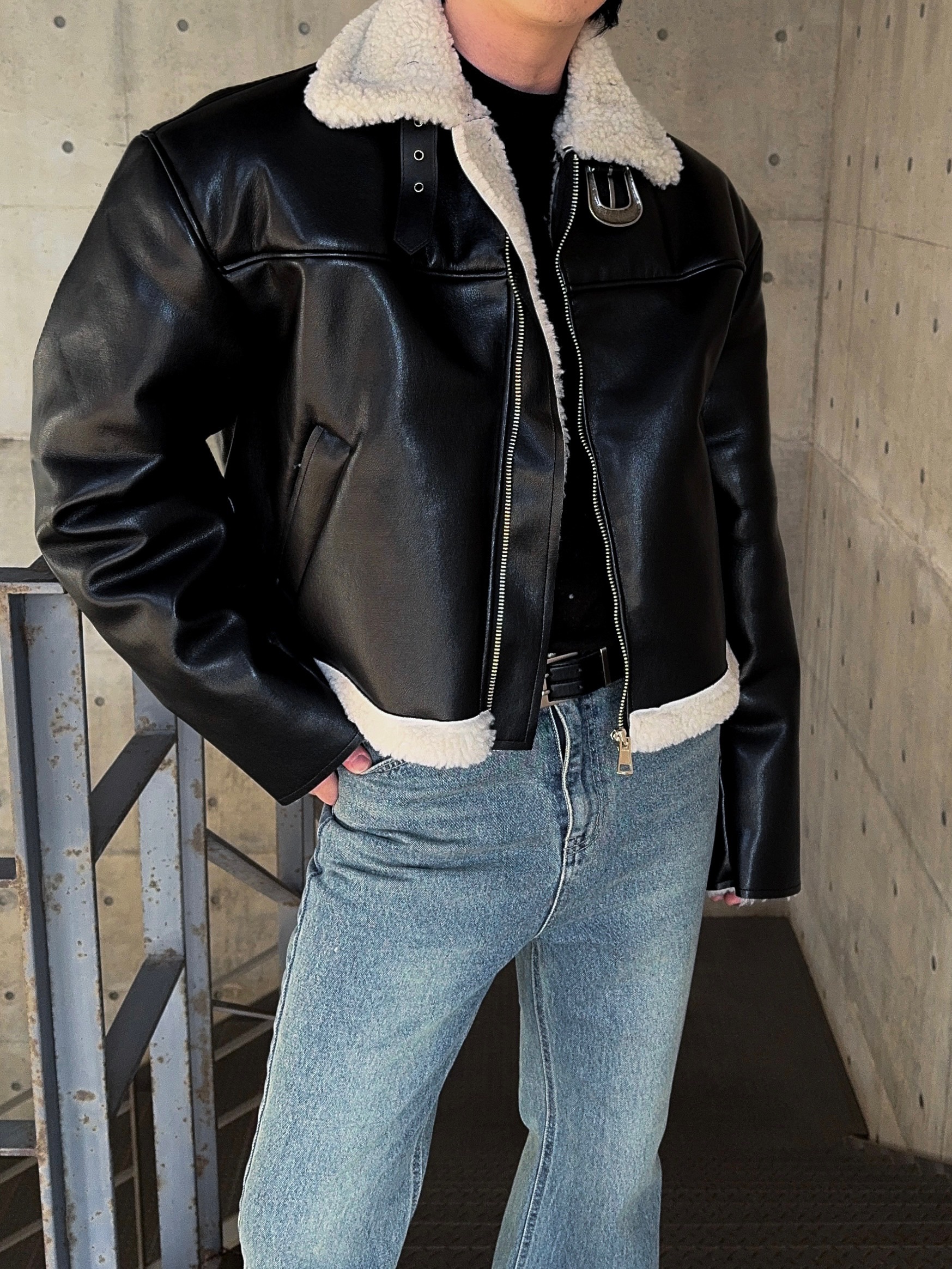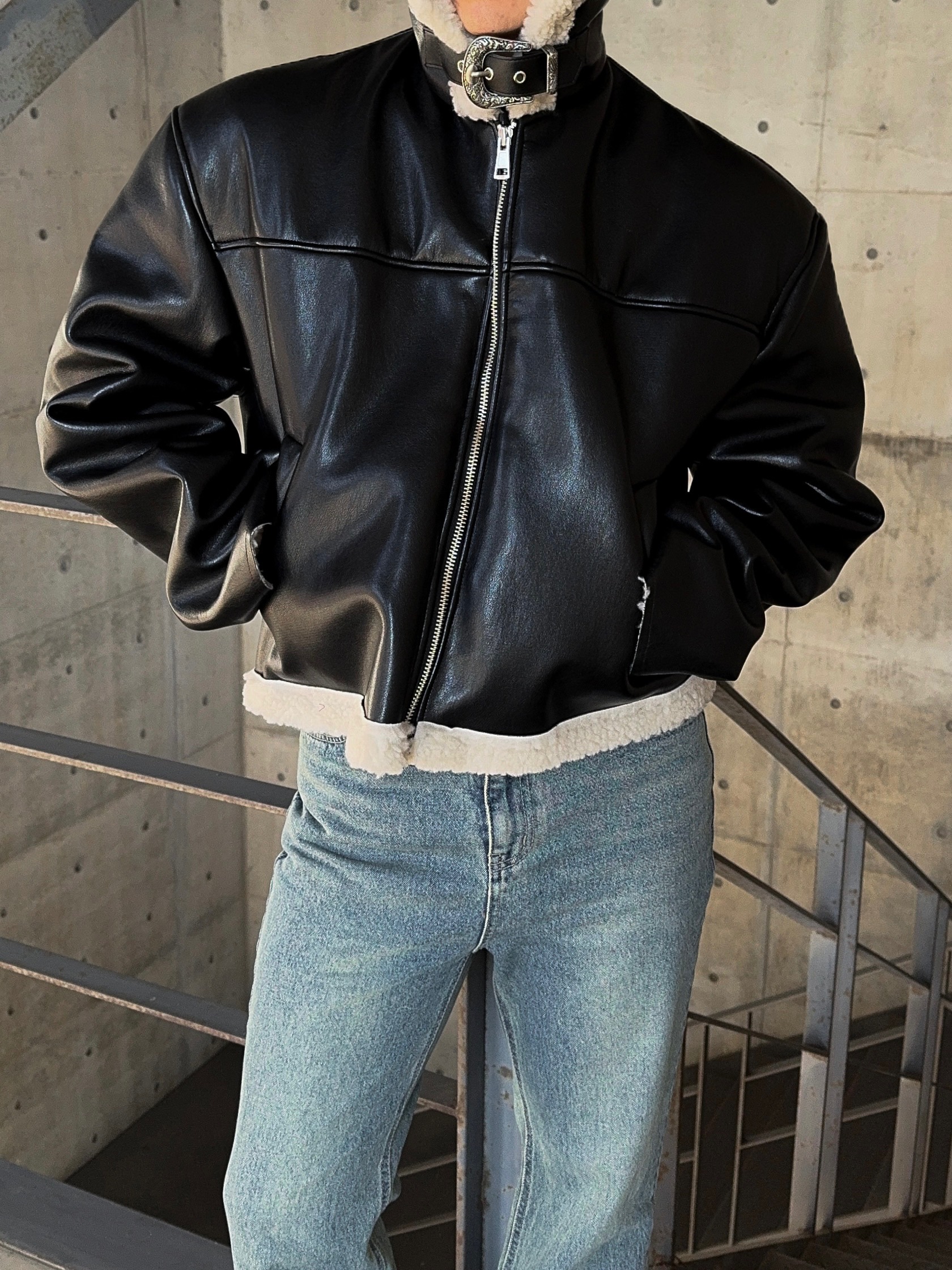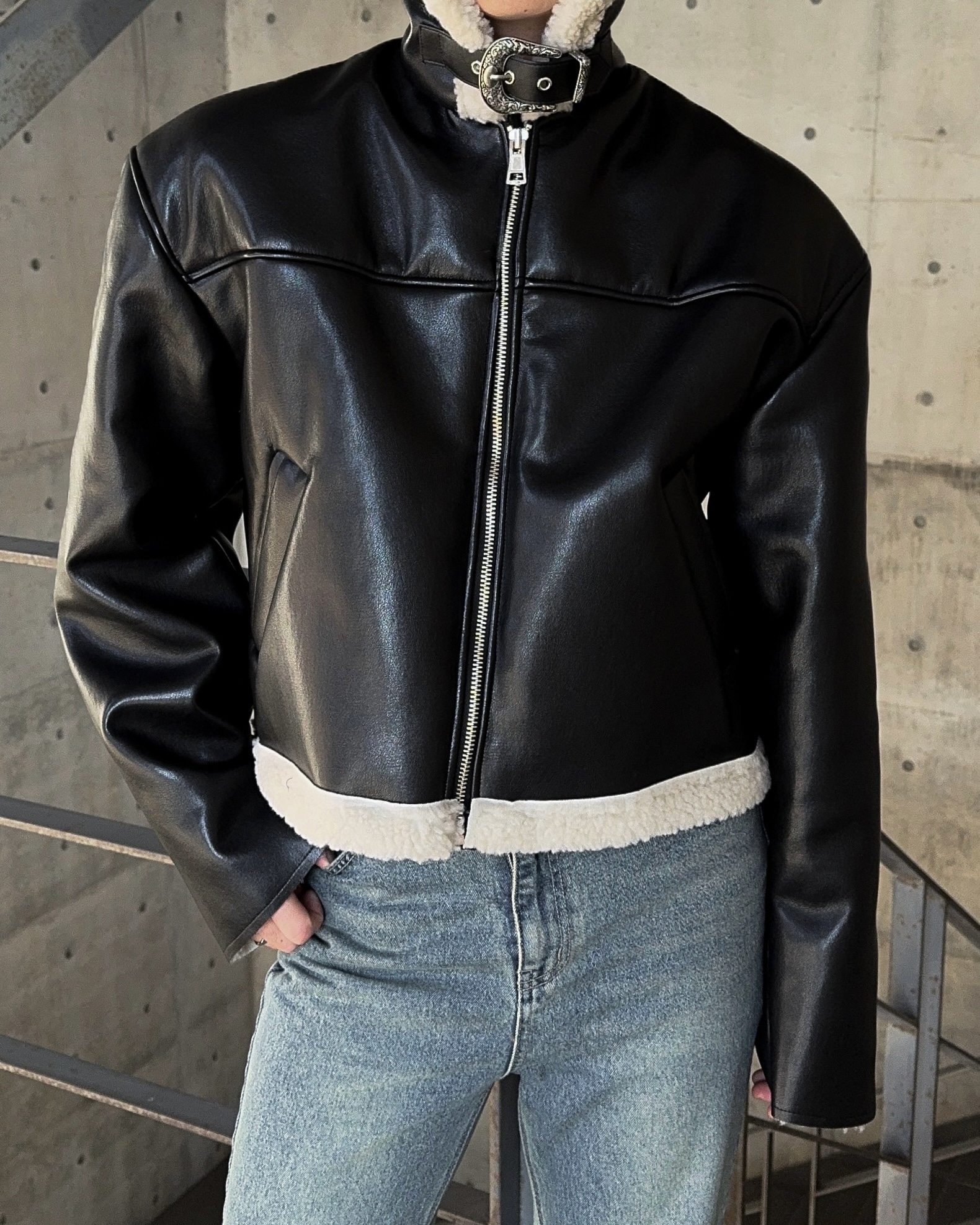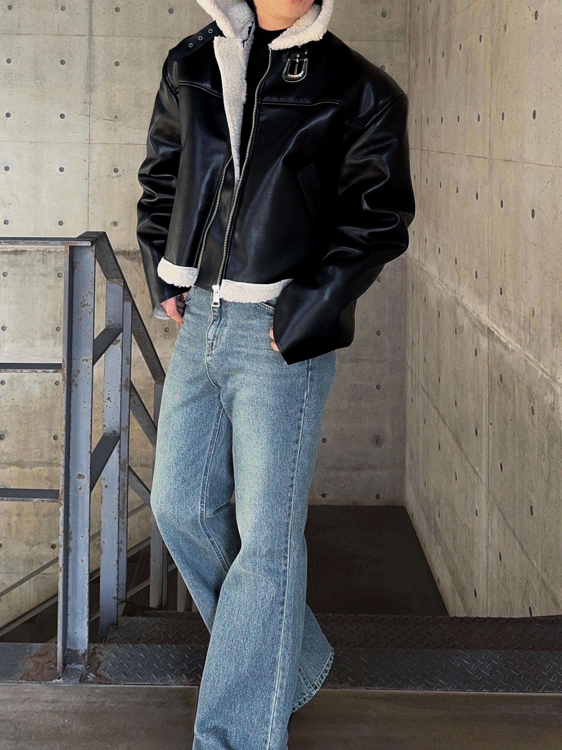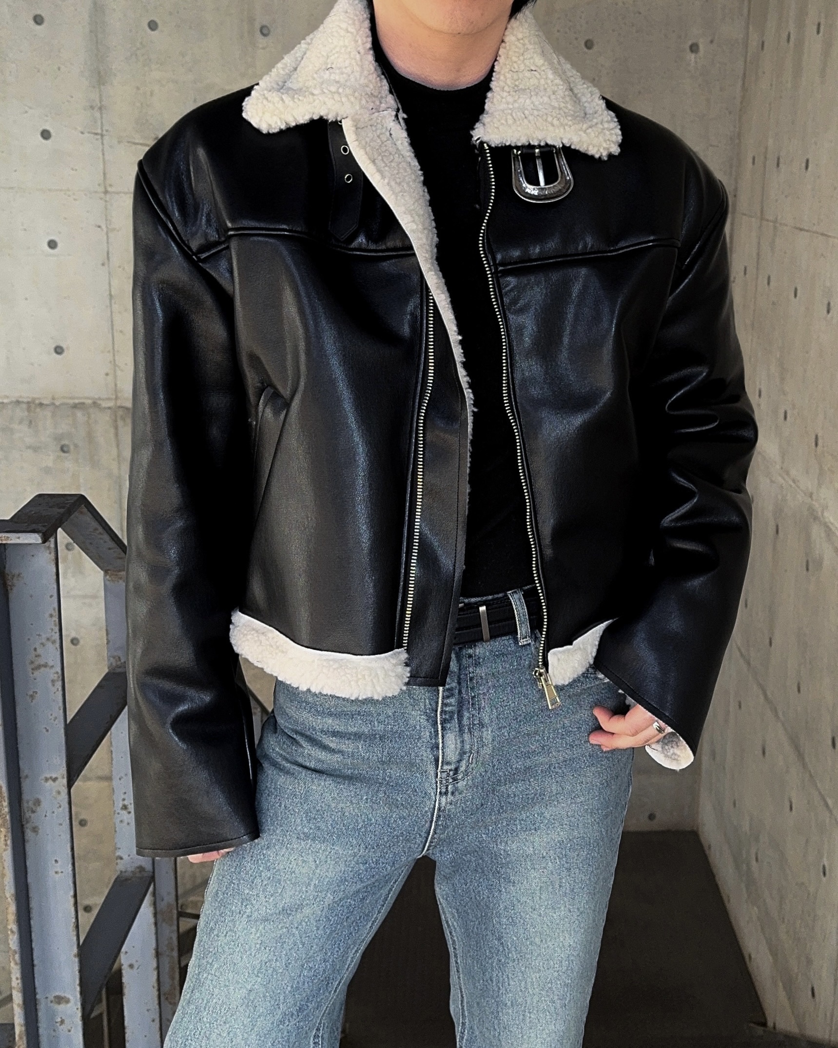 -은은한 광택감이 도는 레더 소재로 제작된 크롭 무스탕