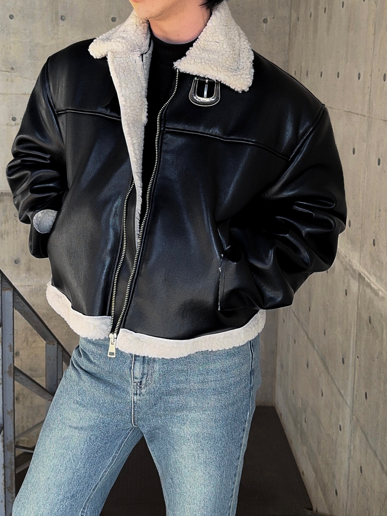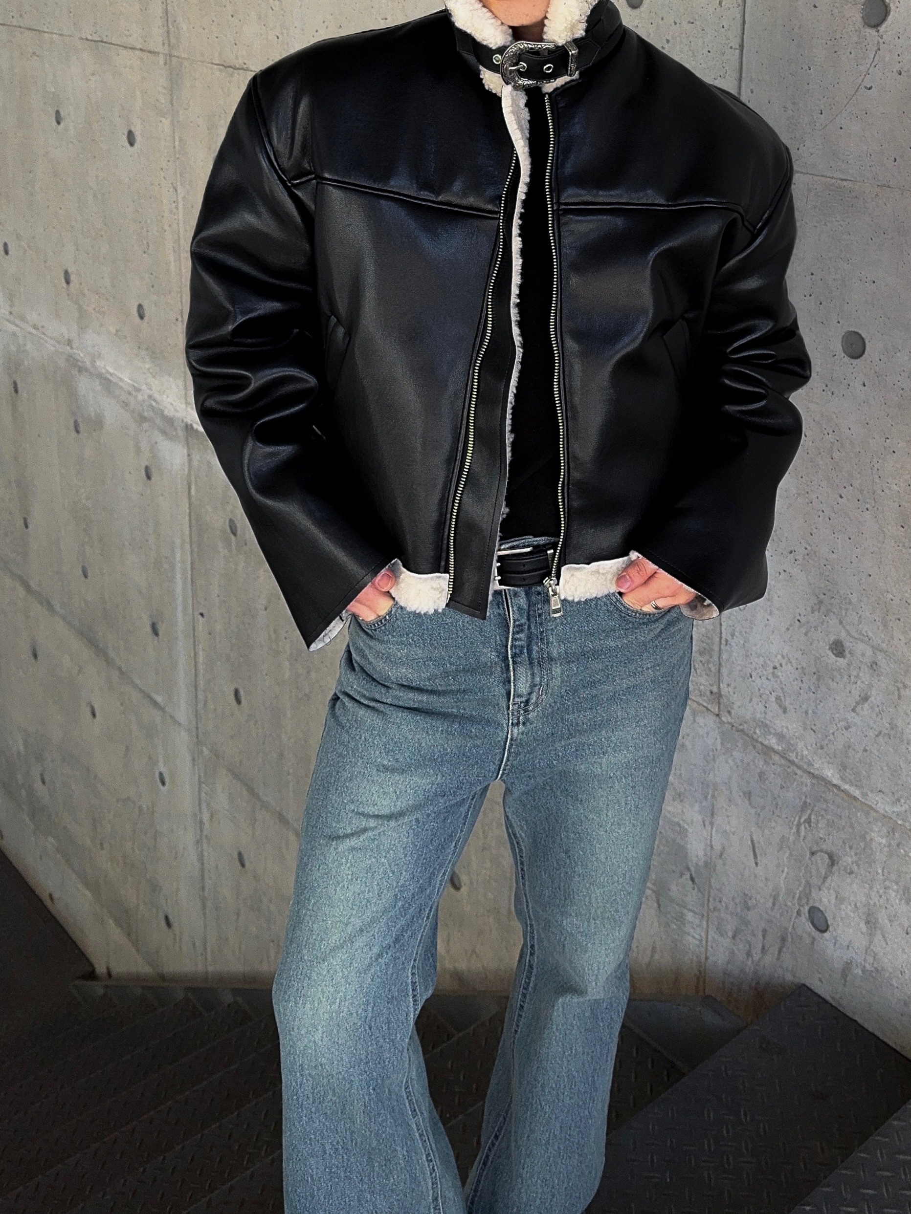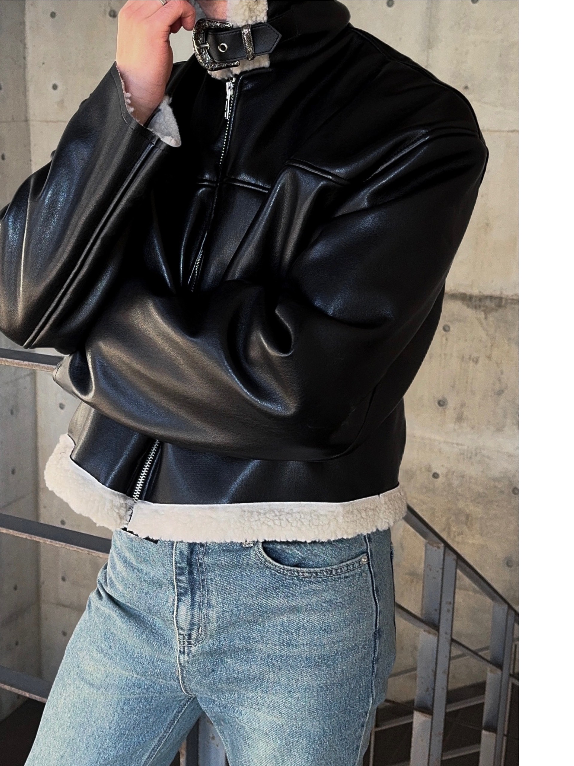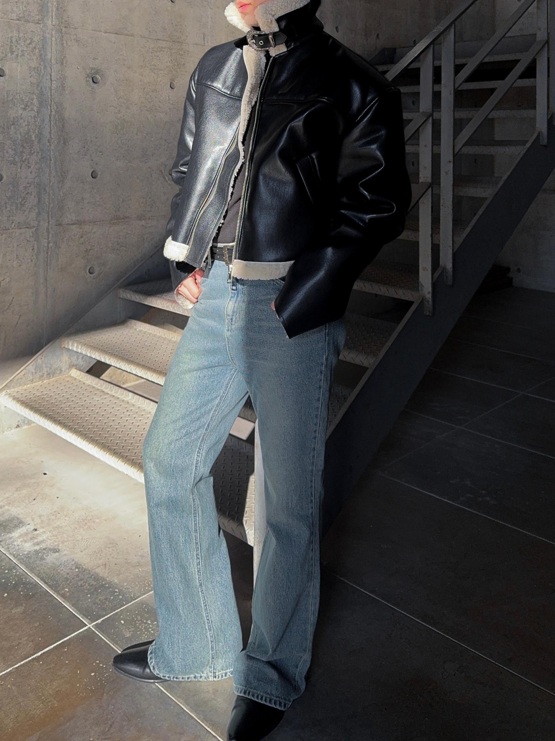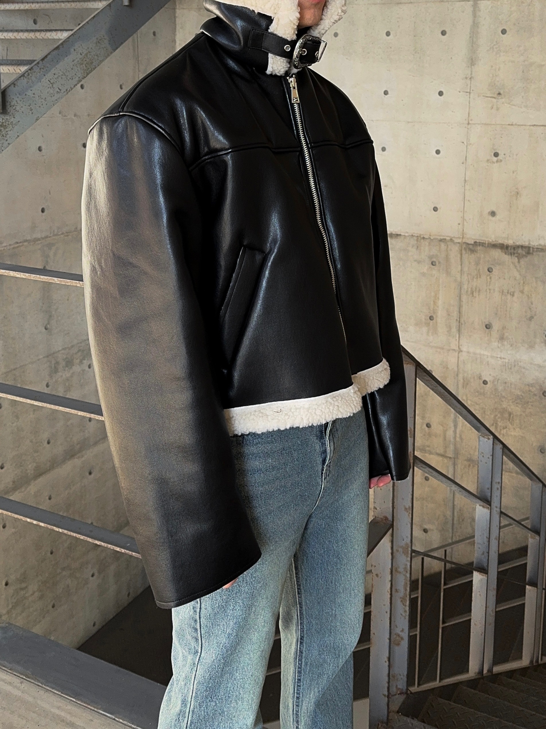 -은은한 광택감이 도는 레더 소재로 제작된 크롭 무스탕