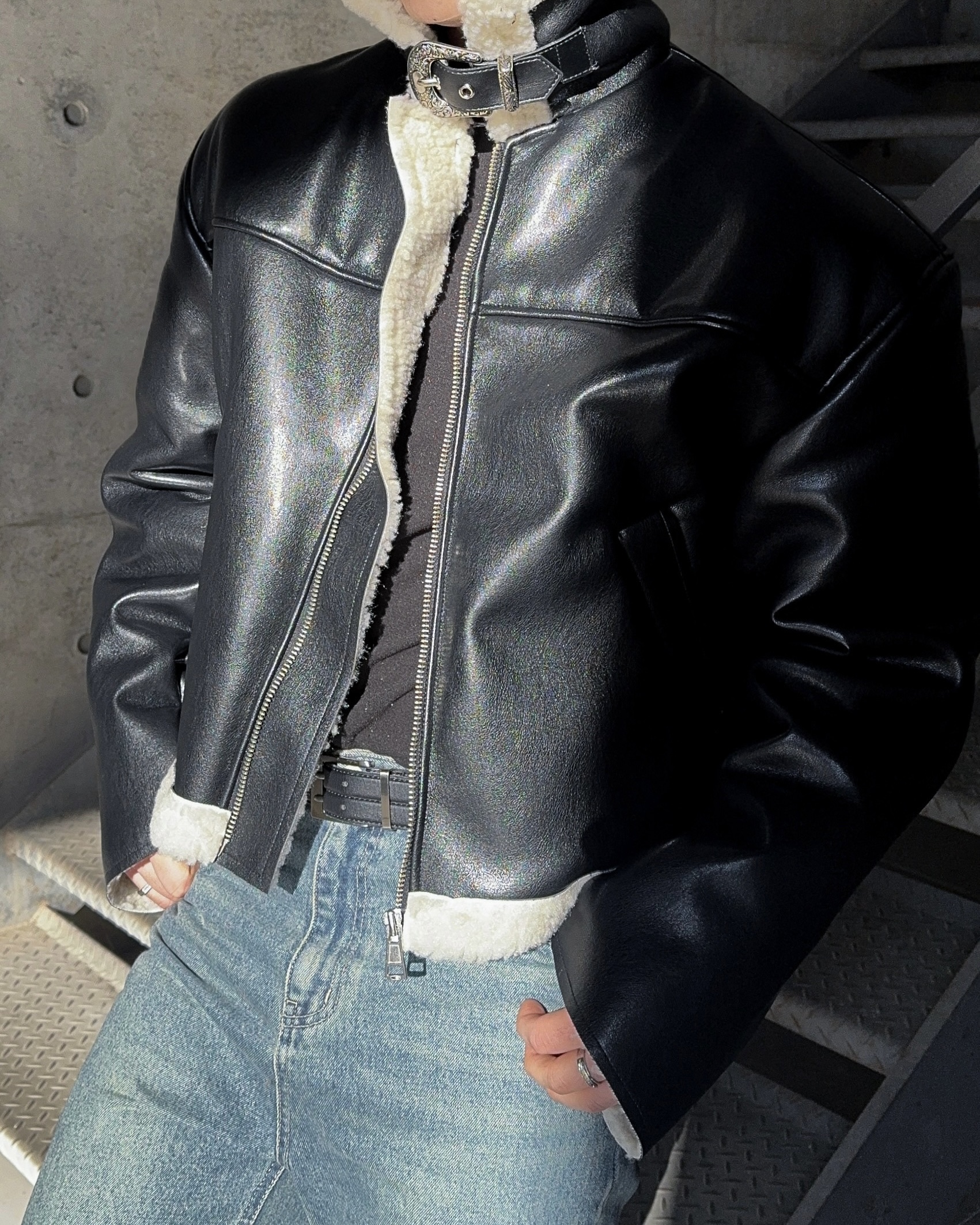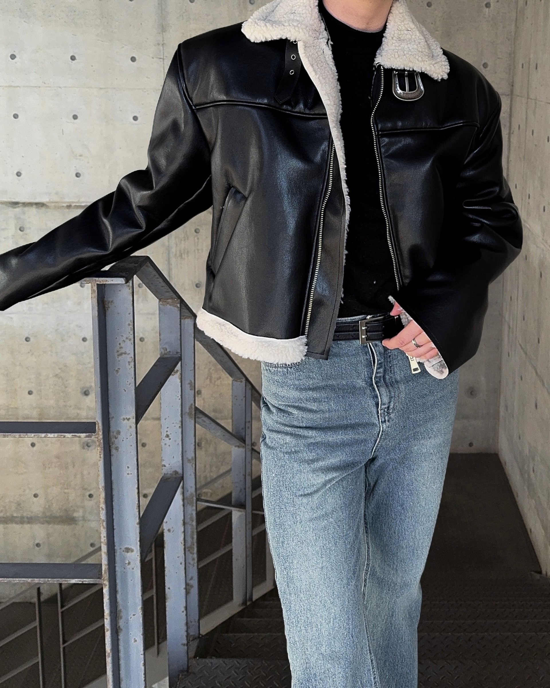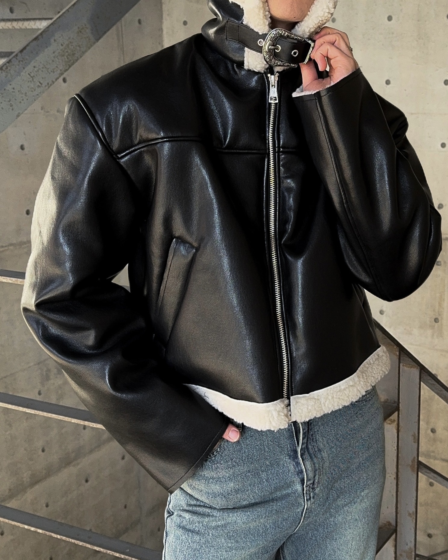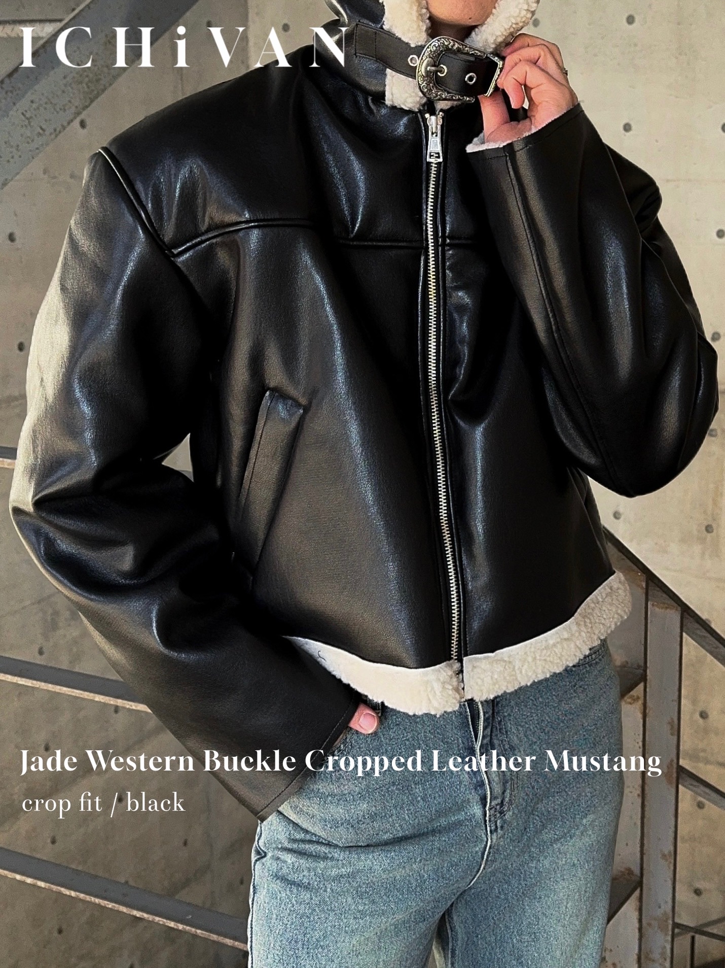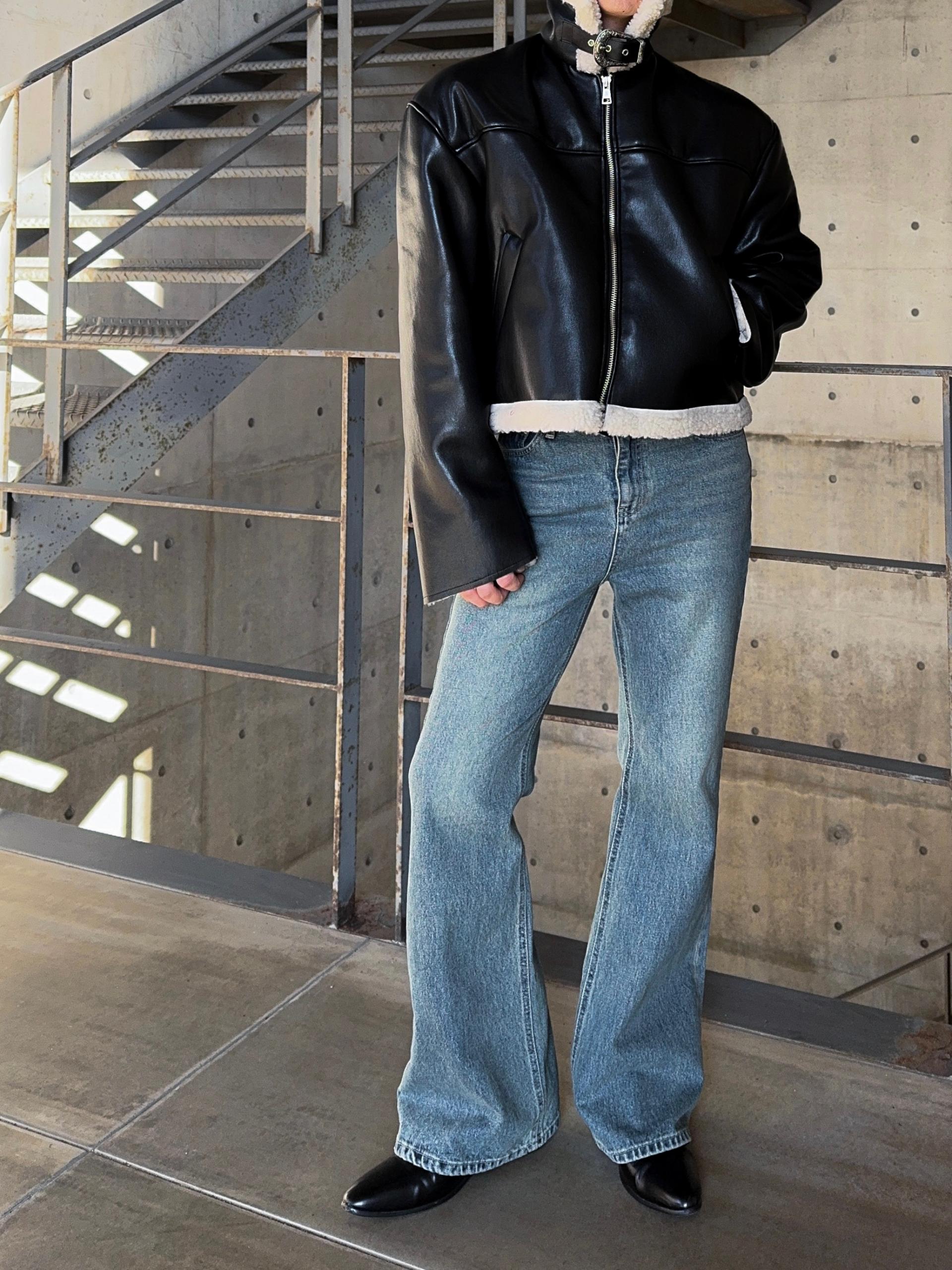 -은은한 광택감이 도는 레더 소재로 제작된 크롭 무스탕