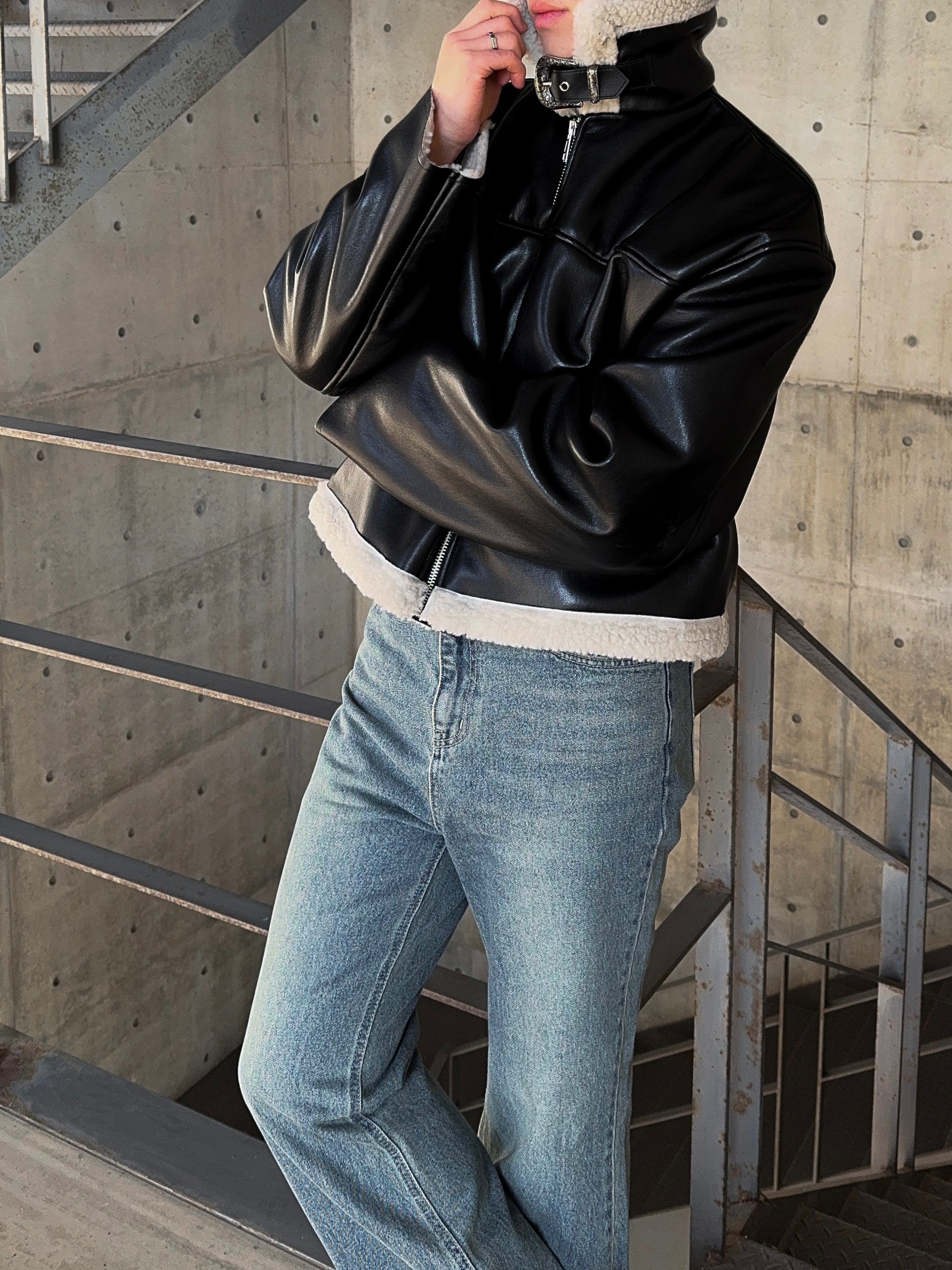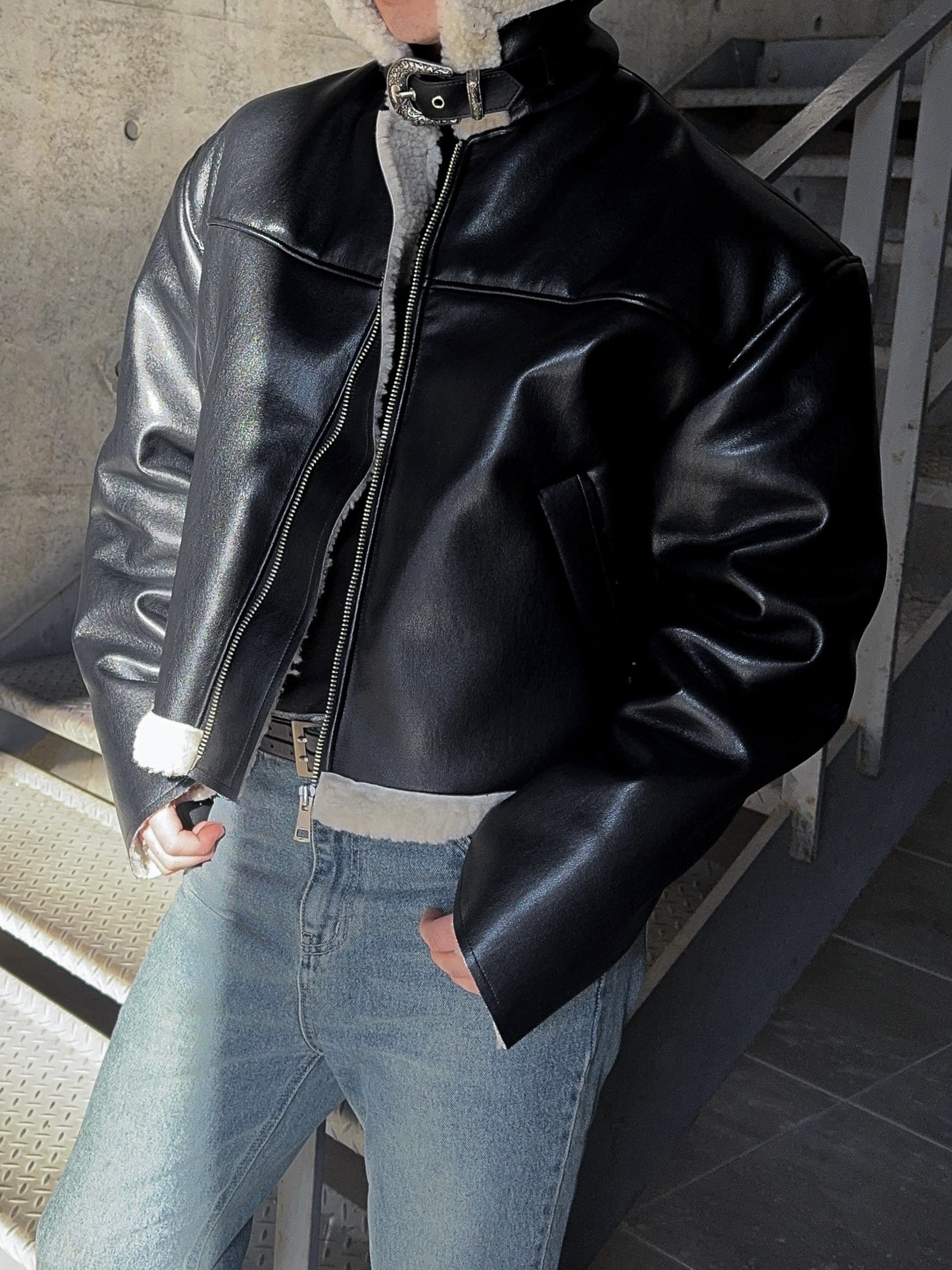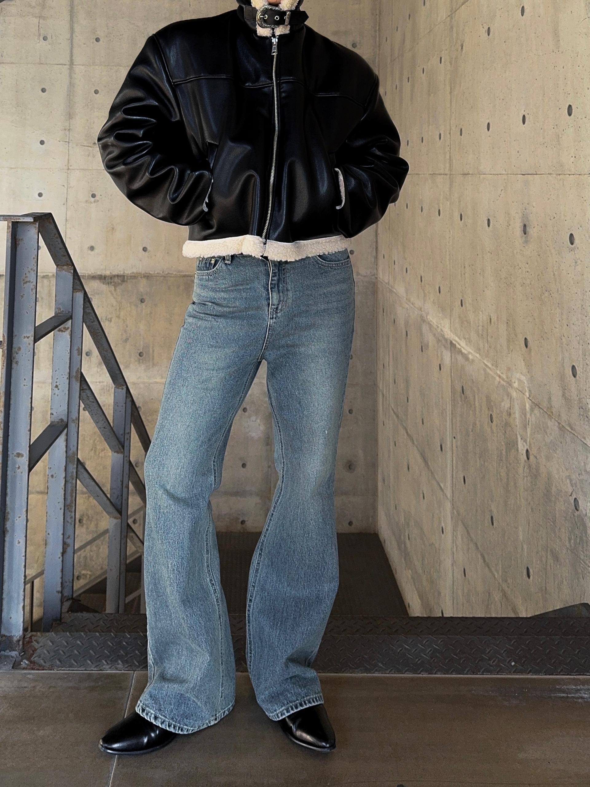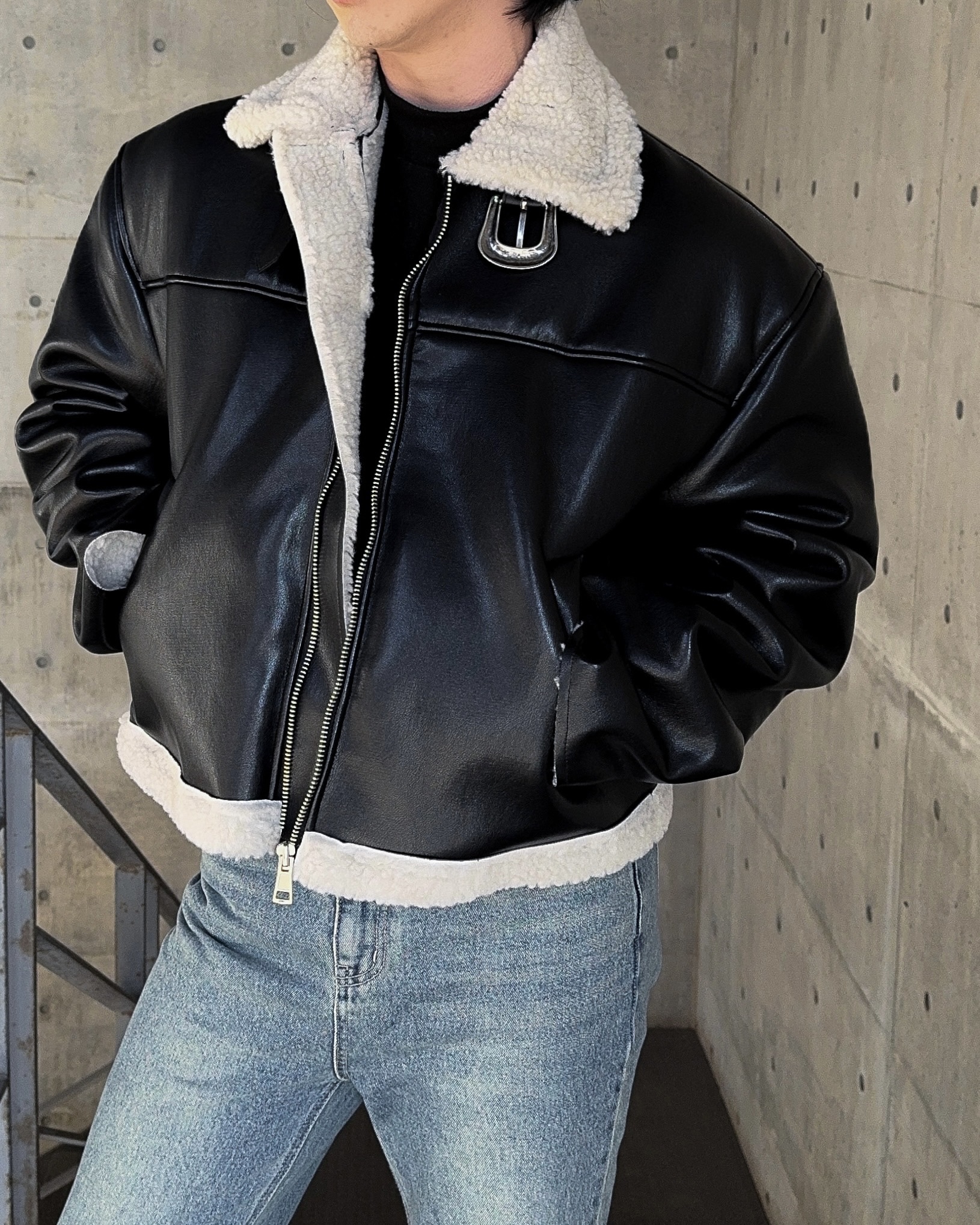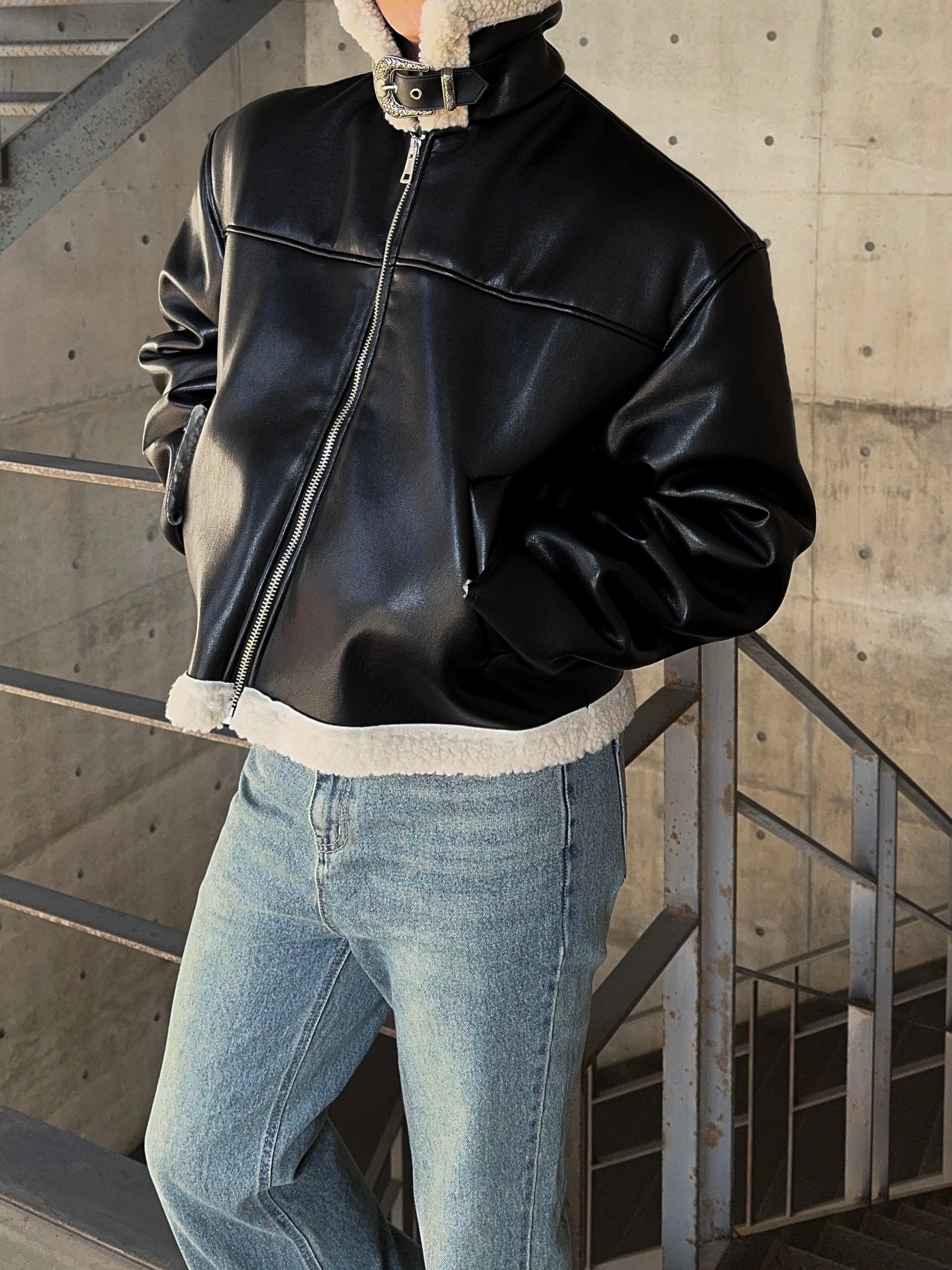 -은은한 광택감이 도는 레더 소재로 제작된 크롭 무스탕