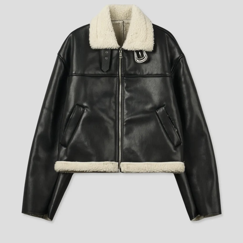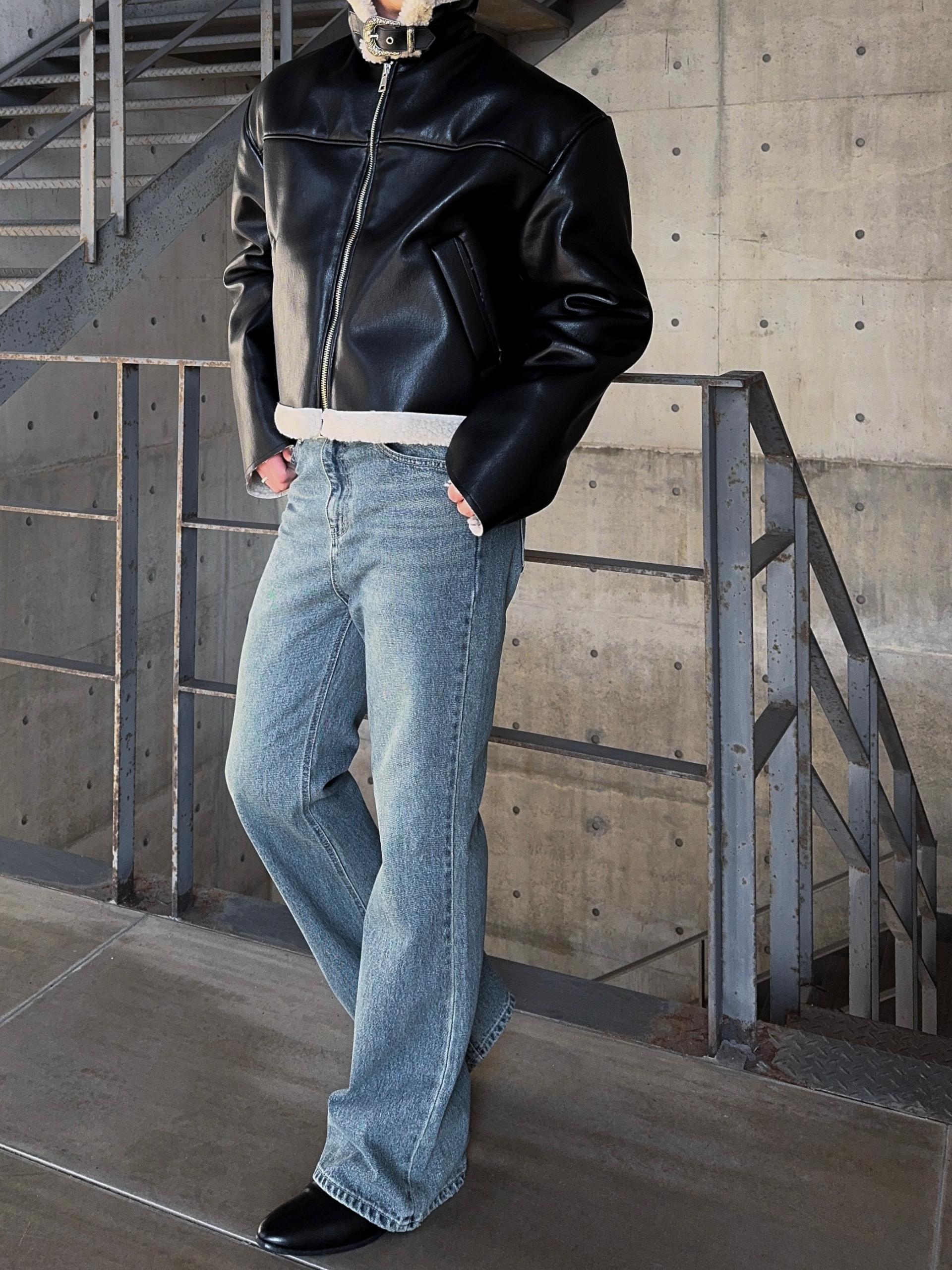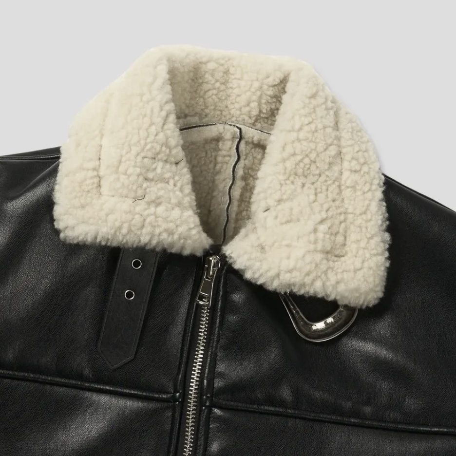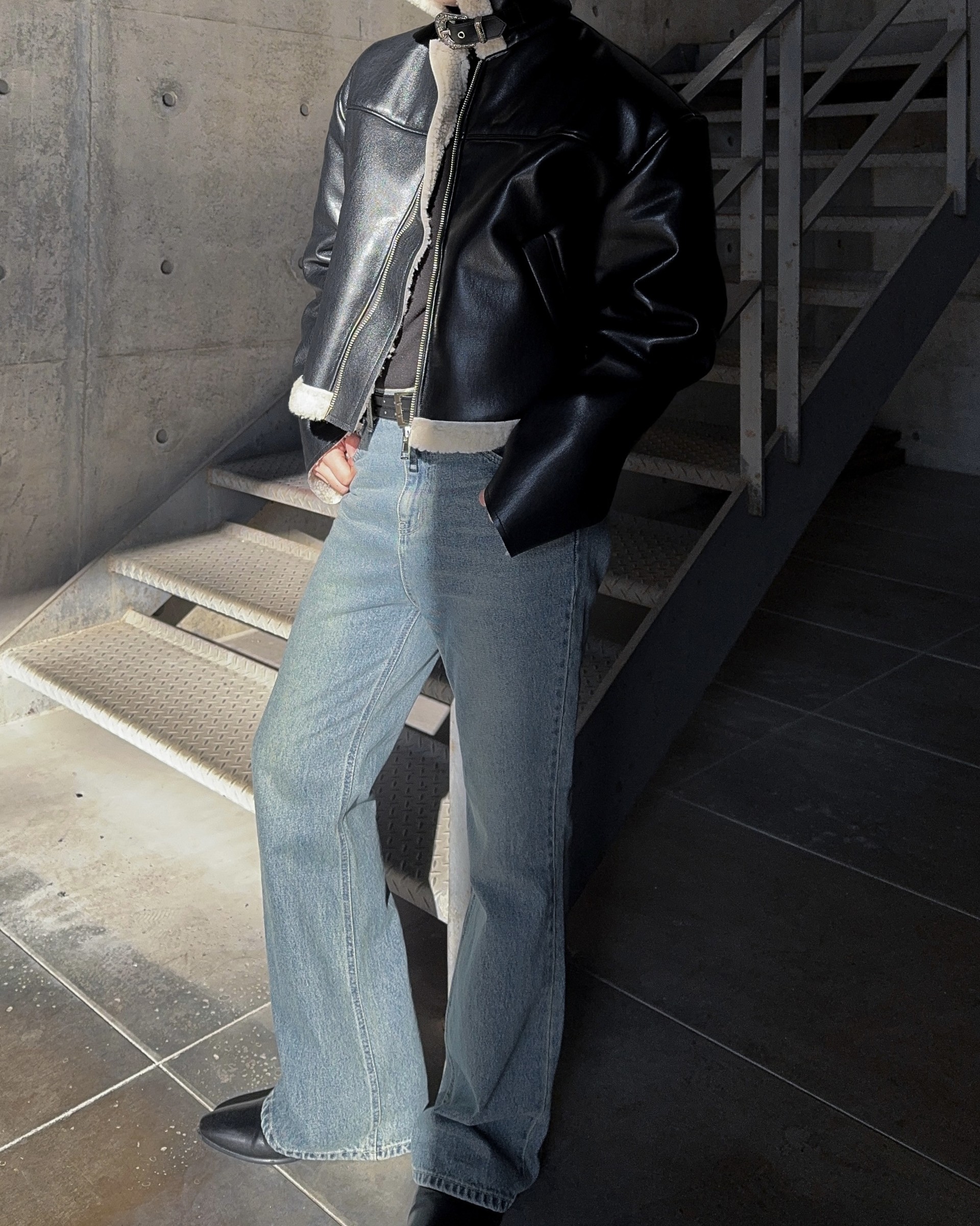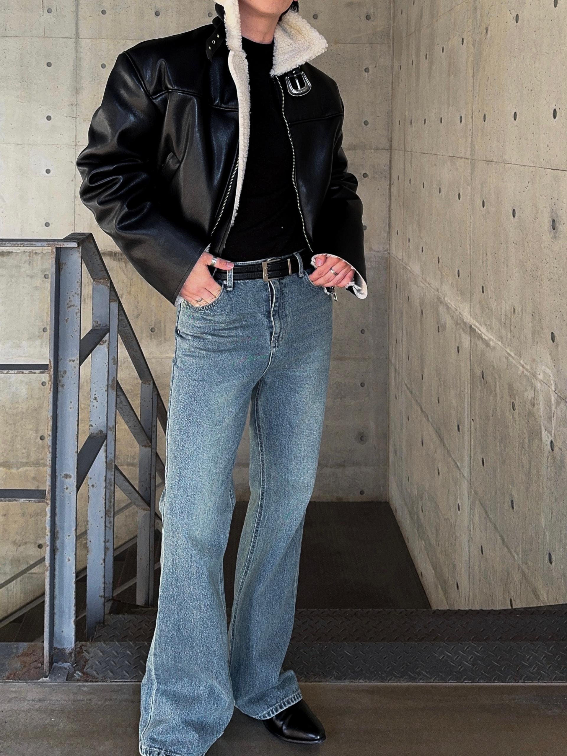 -은은한 광택감이 도는 레더 소재로 제작된 크롭 무스탕