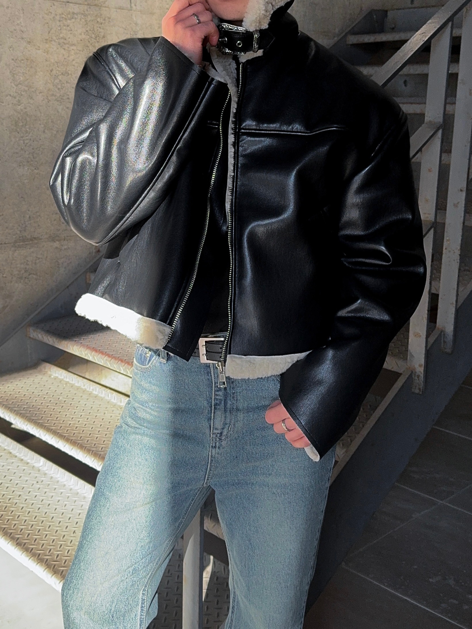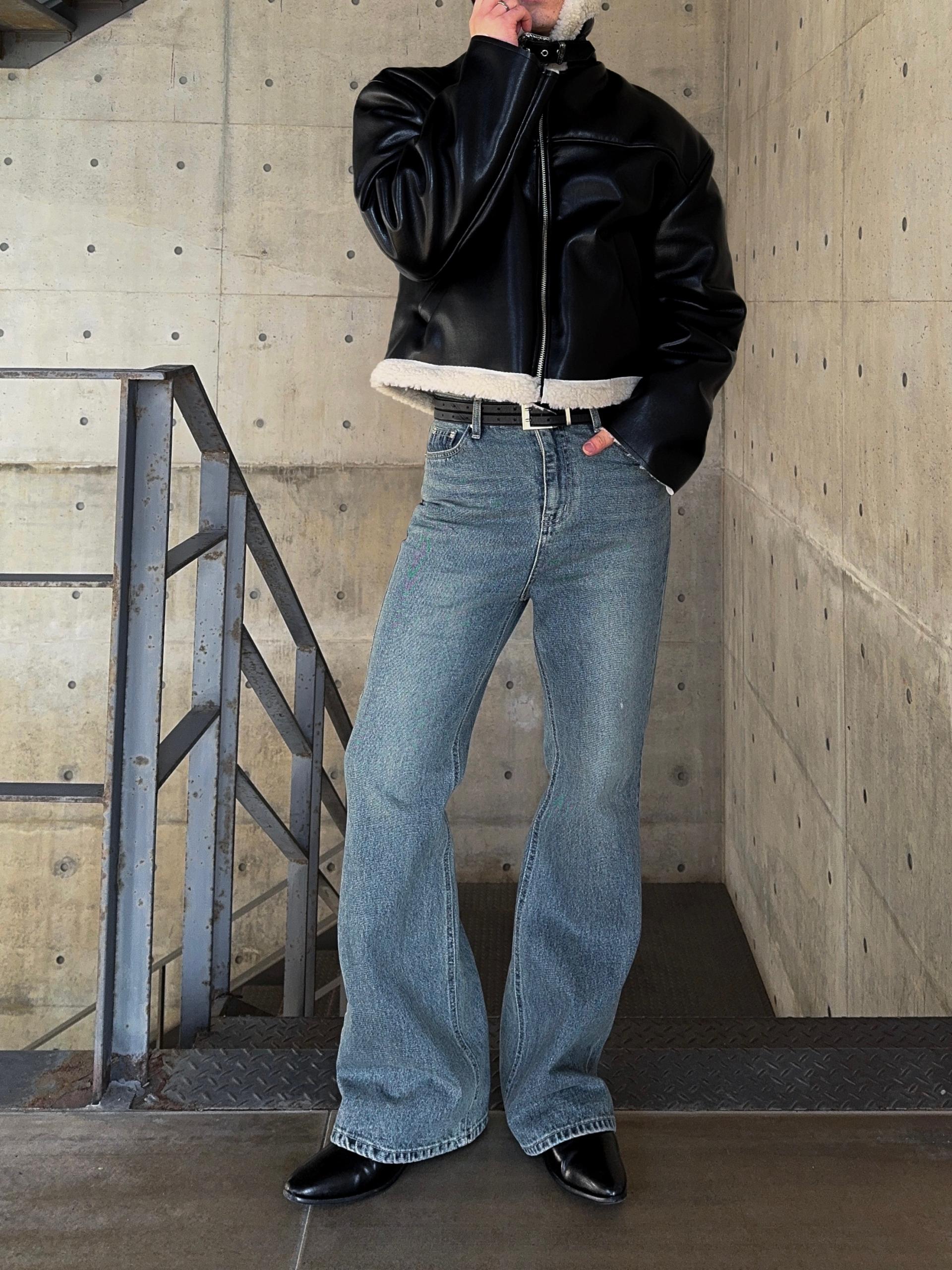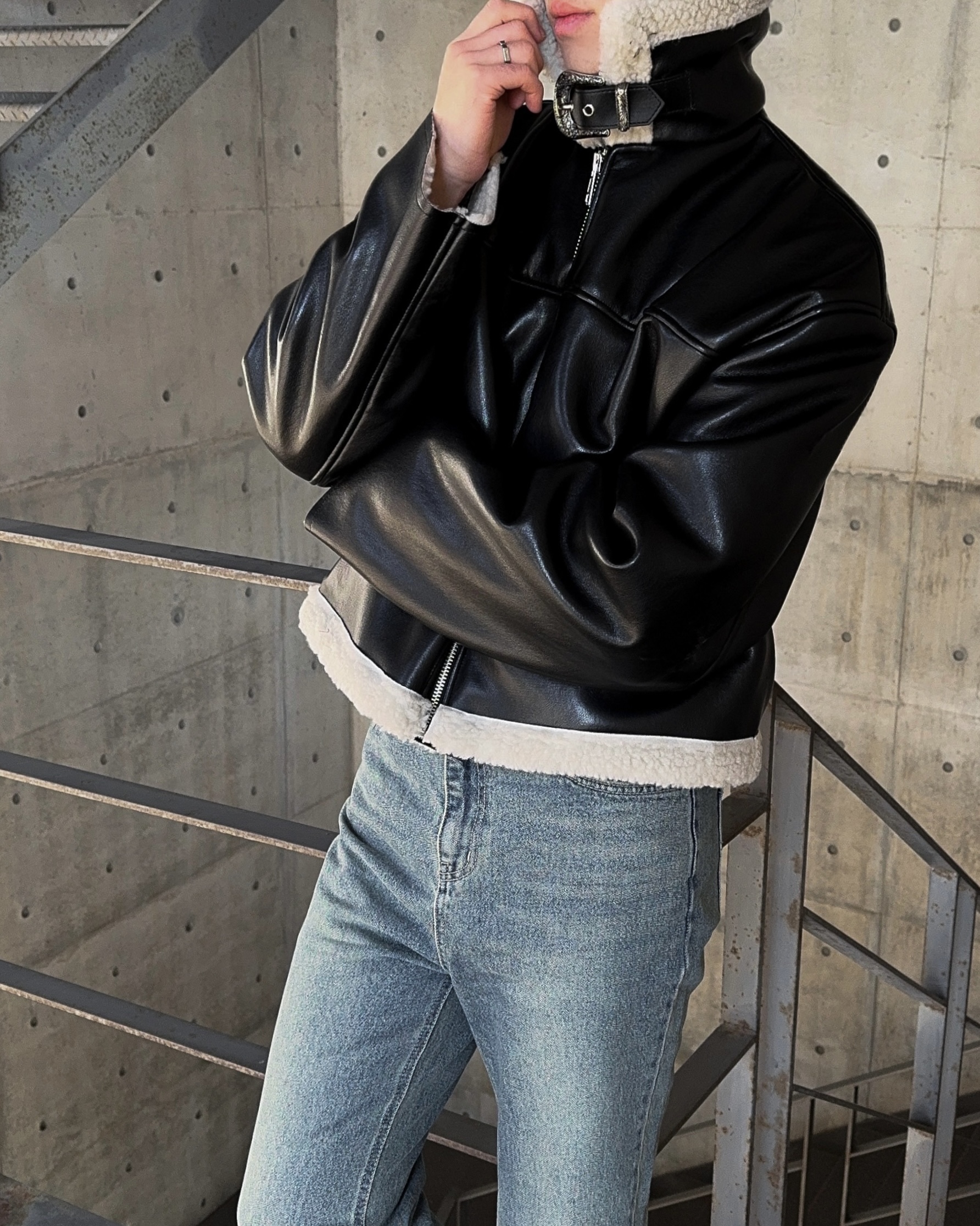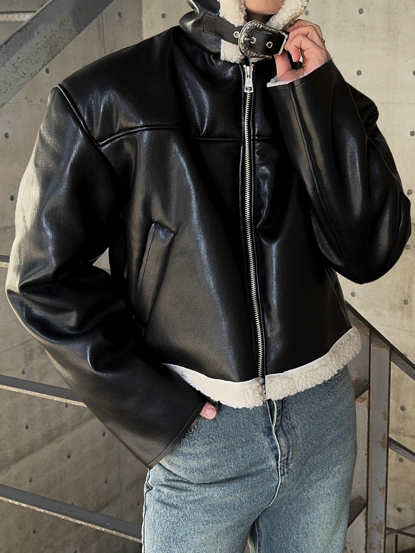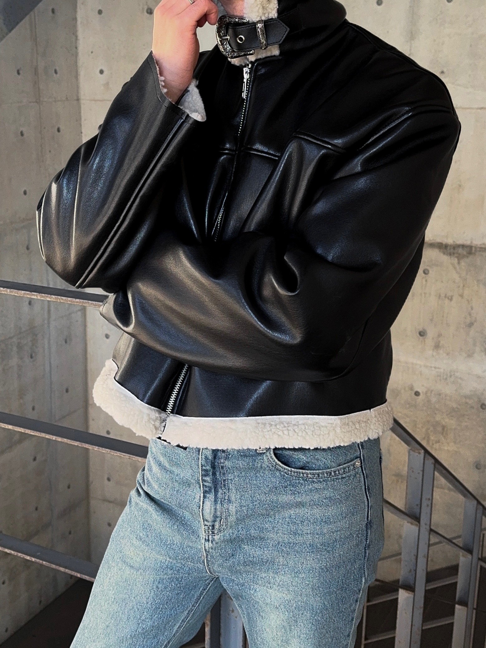 -은은한 광택감이 도는 레더 소재로 제작된 크롭 무스탕