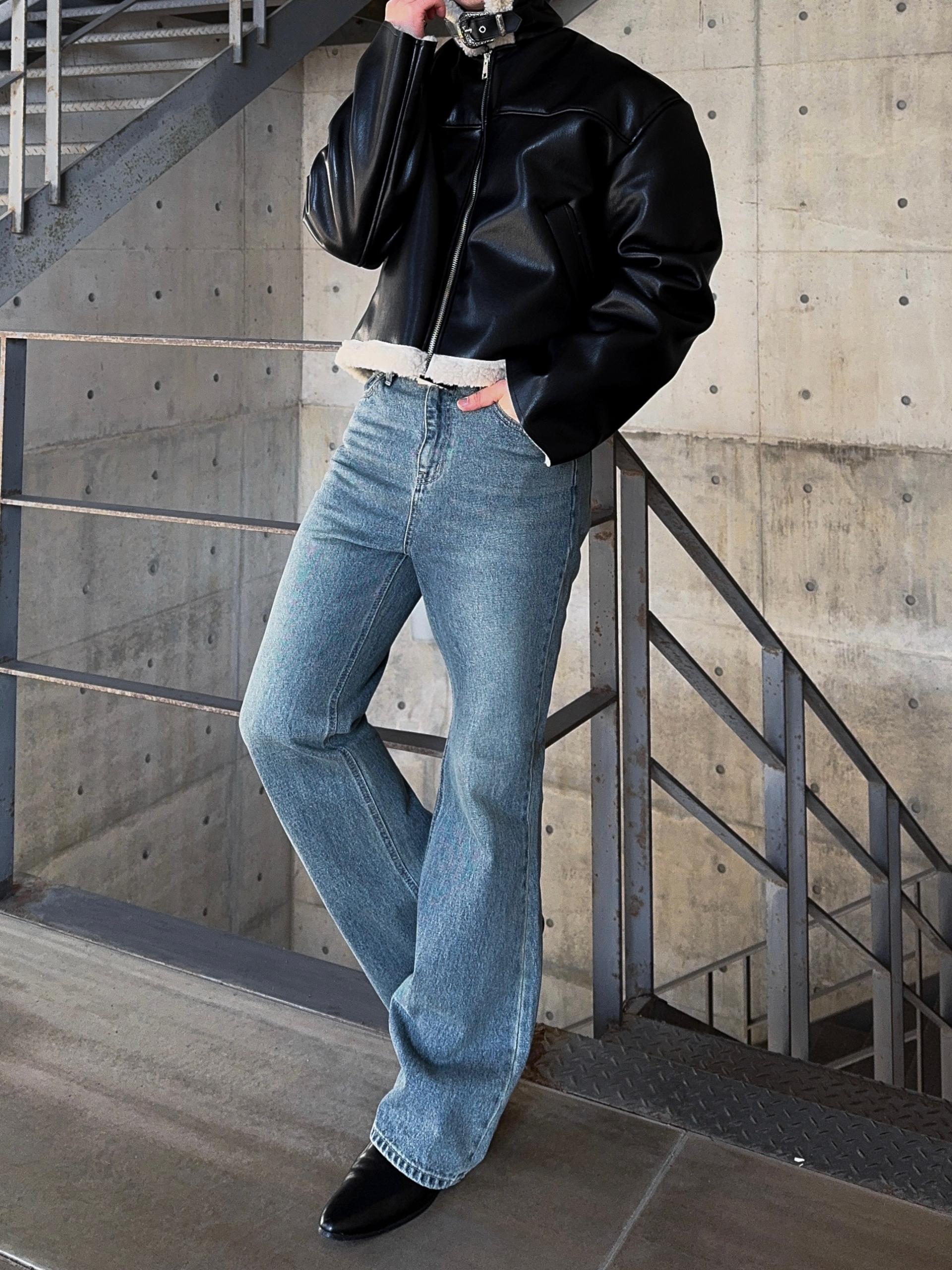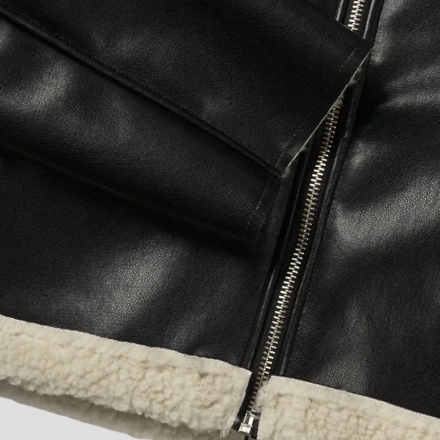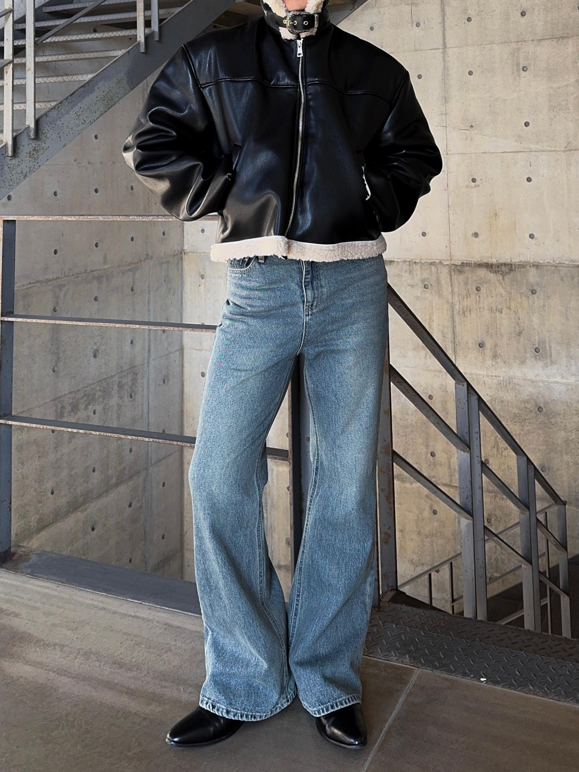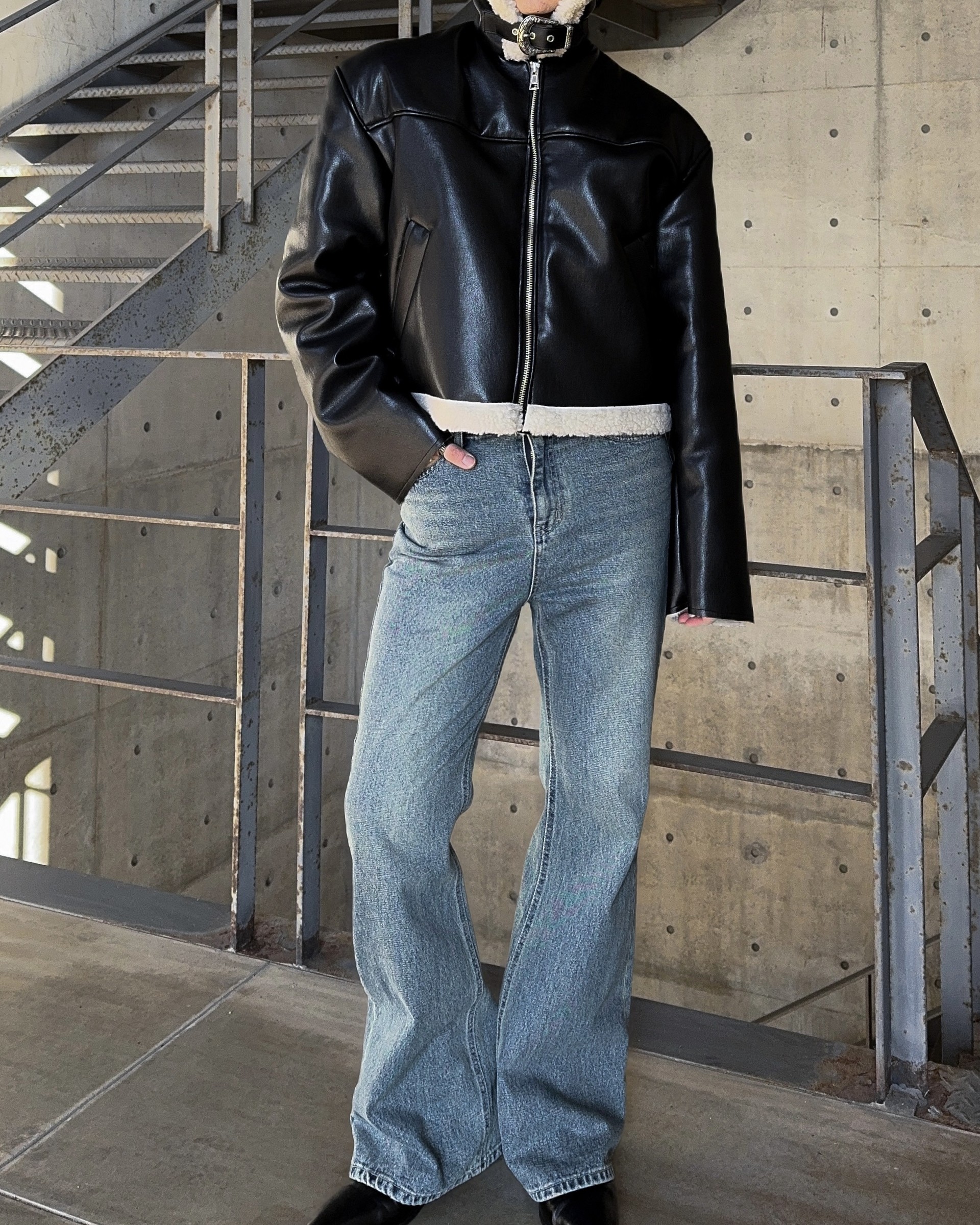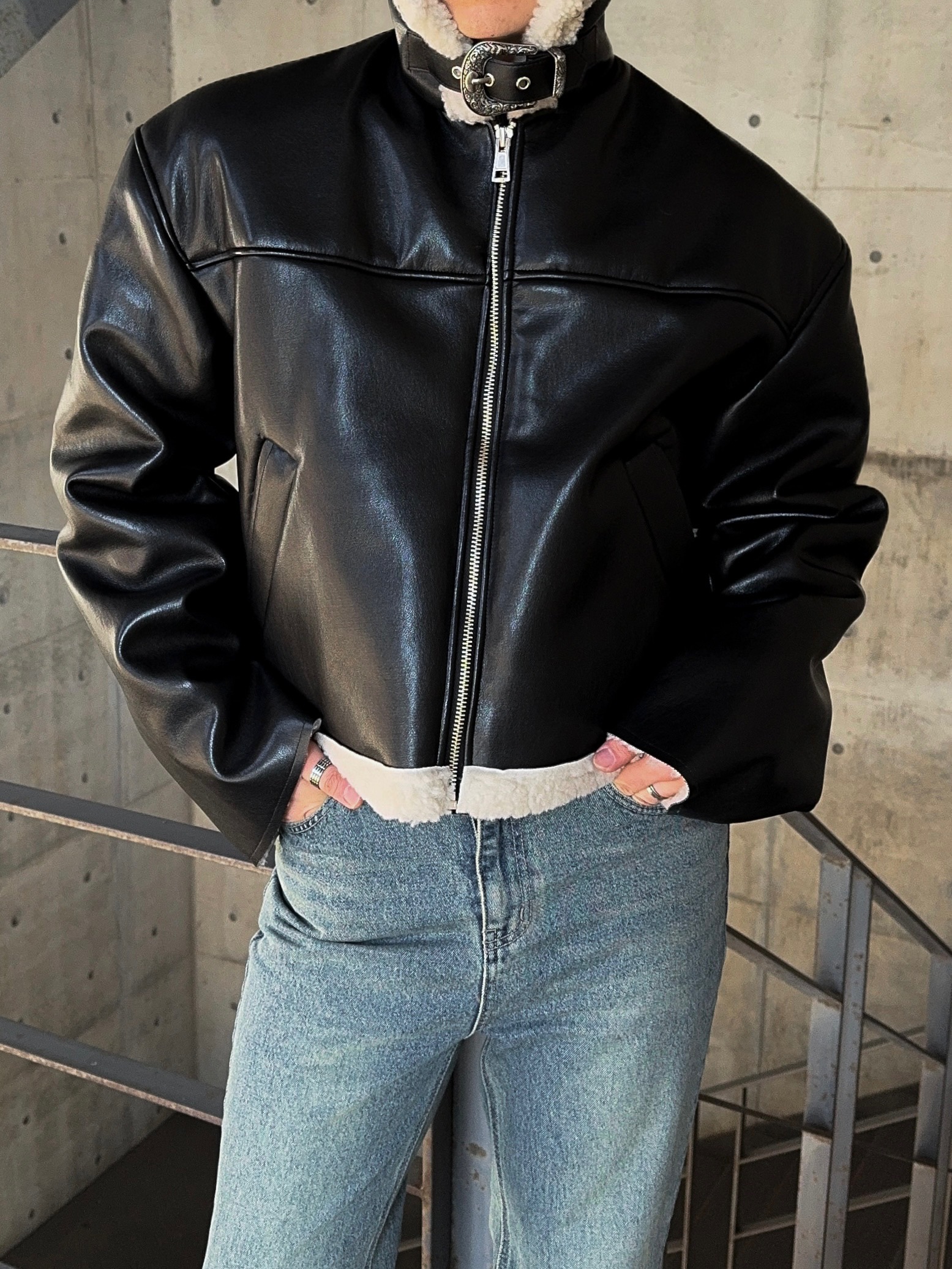 -은은한 광택감이 도는 레더 소재로 제작된 크롭 무스탕