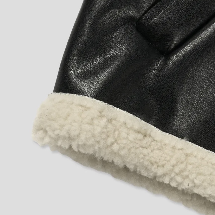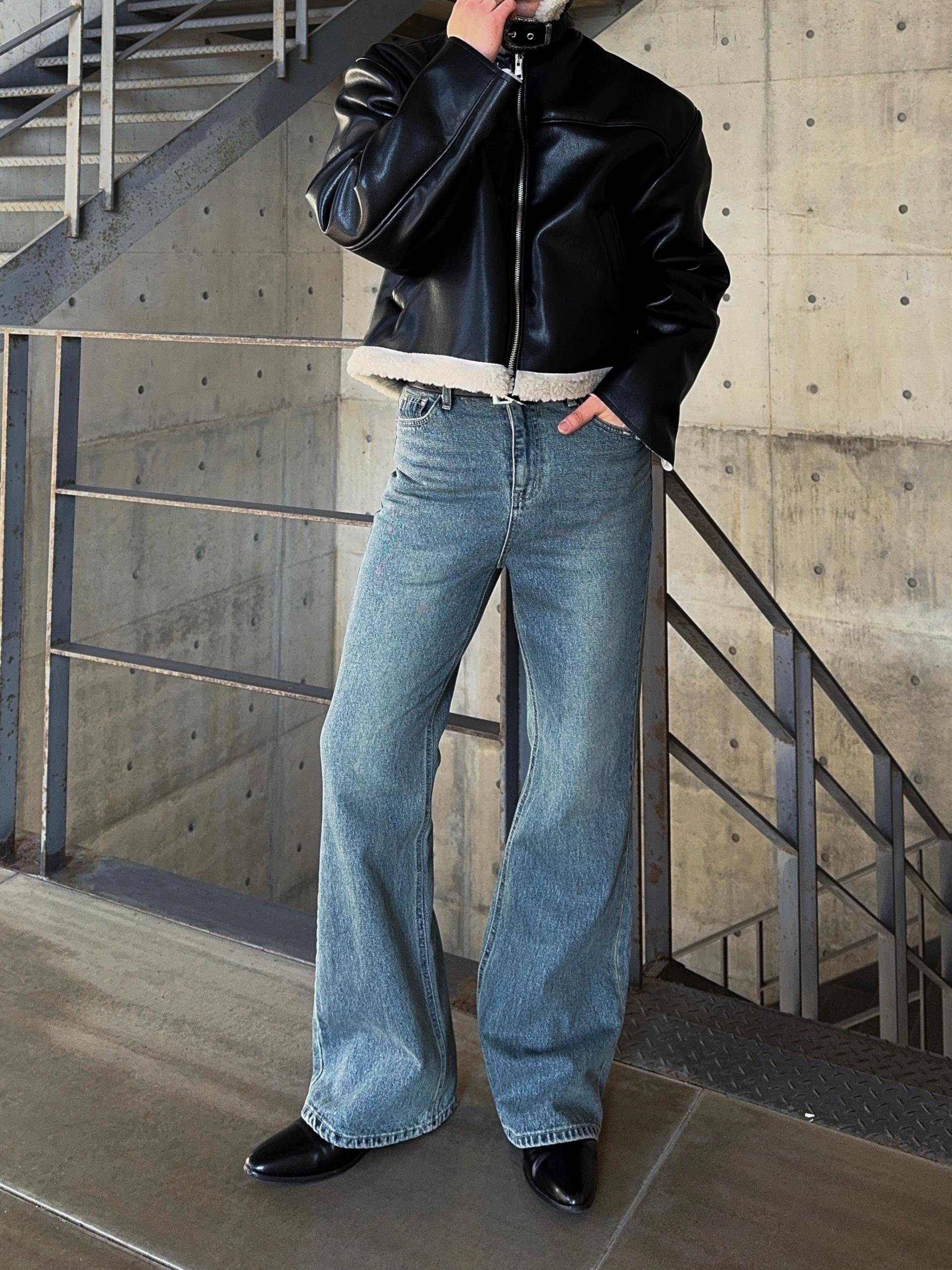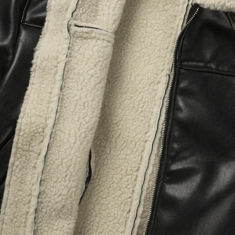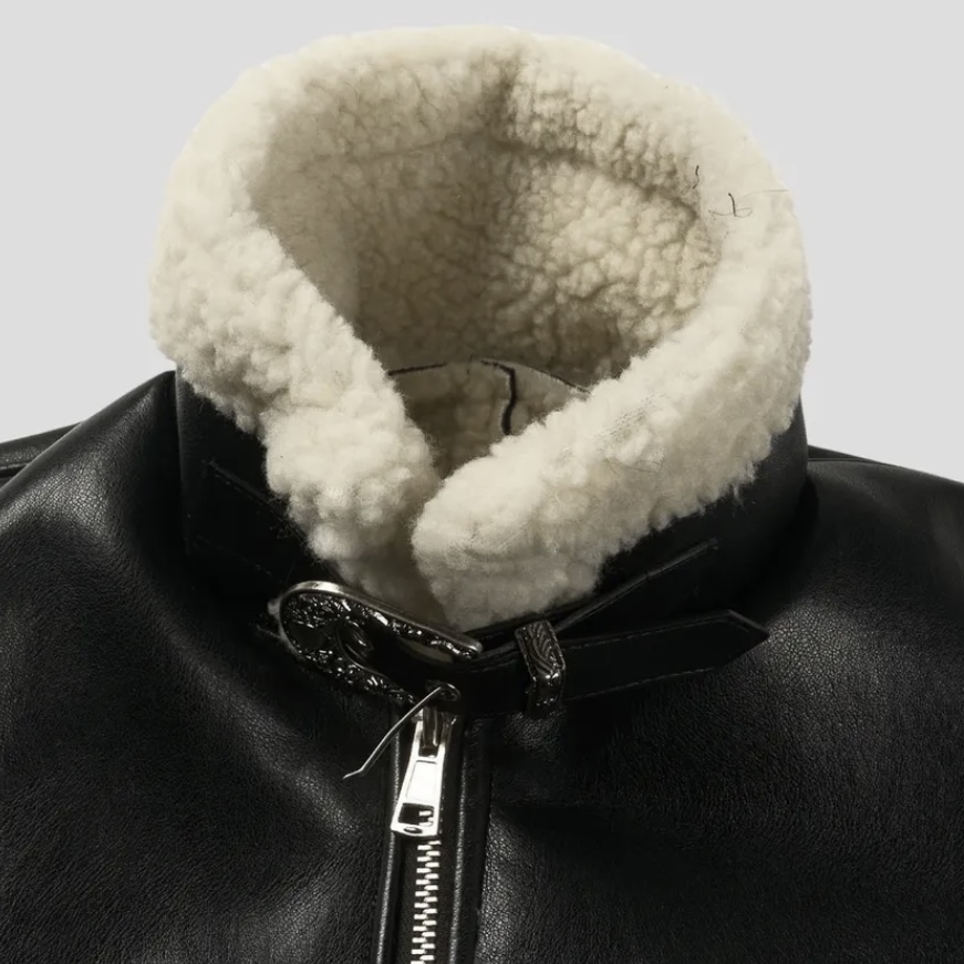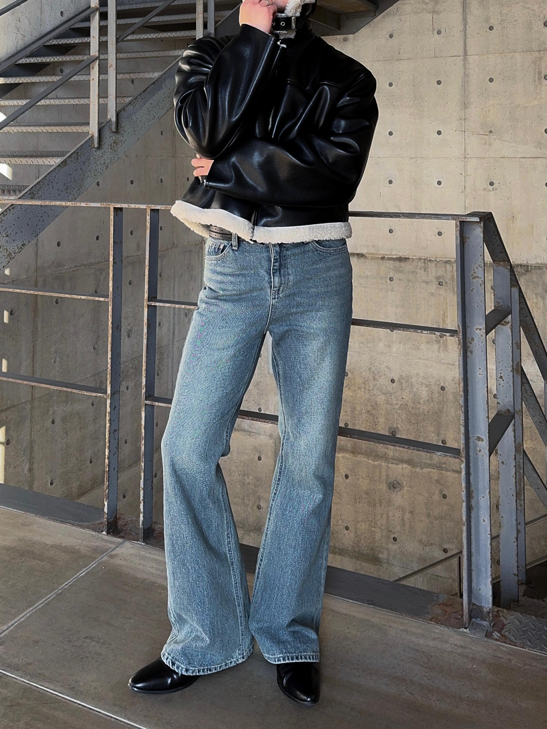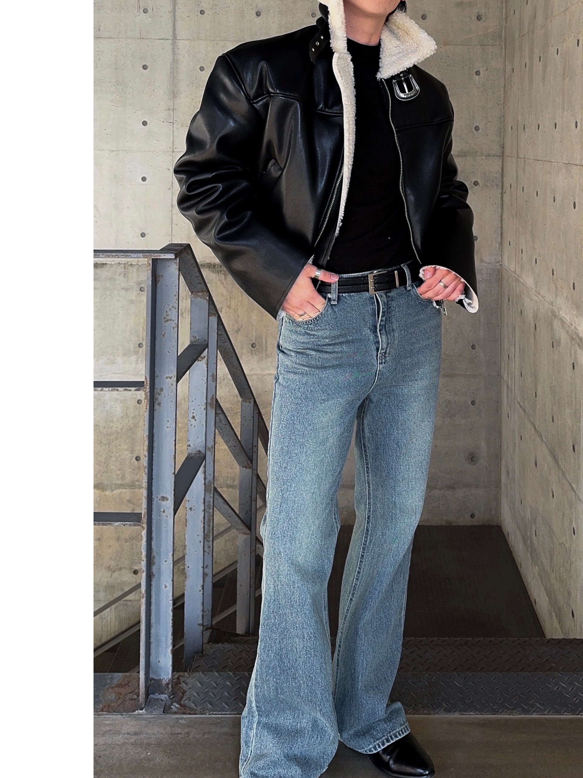 -은은한 광택감이 도는 레더 소재로 제작된 크롭 무스탕