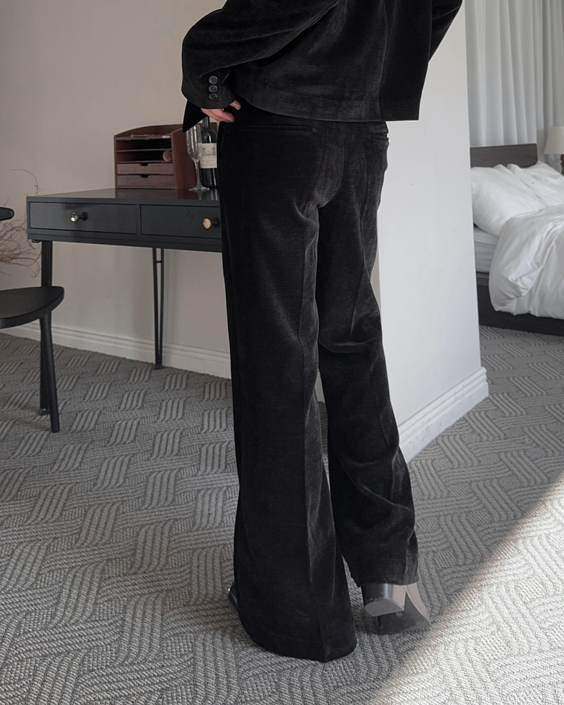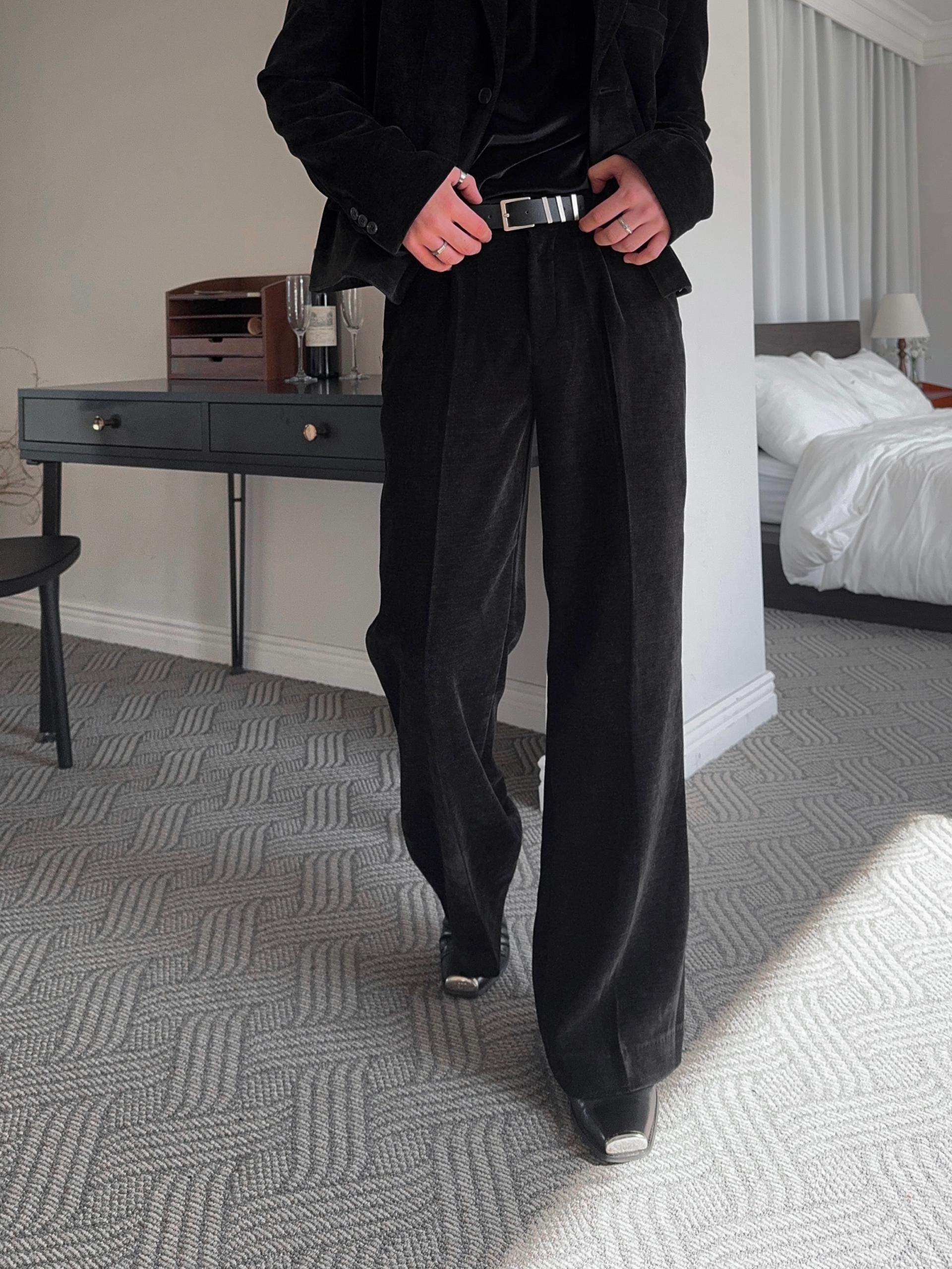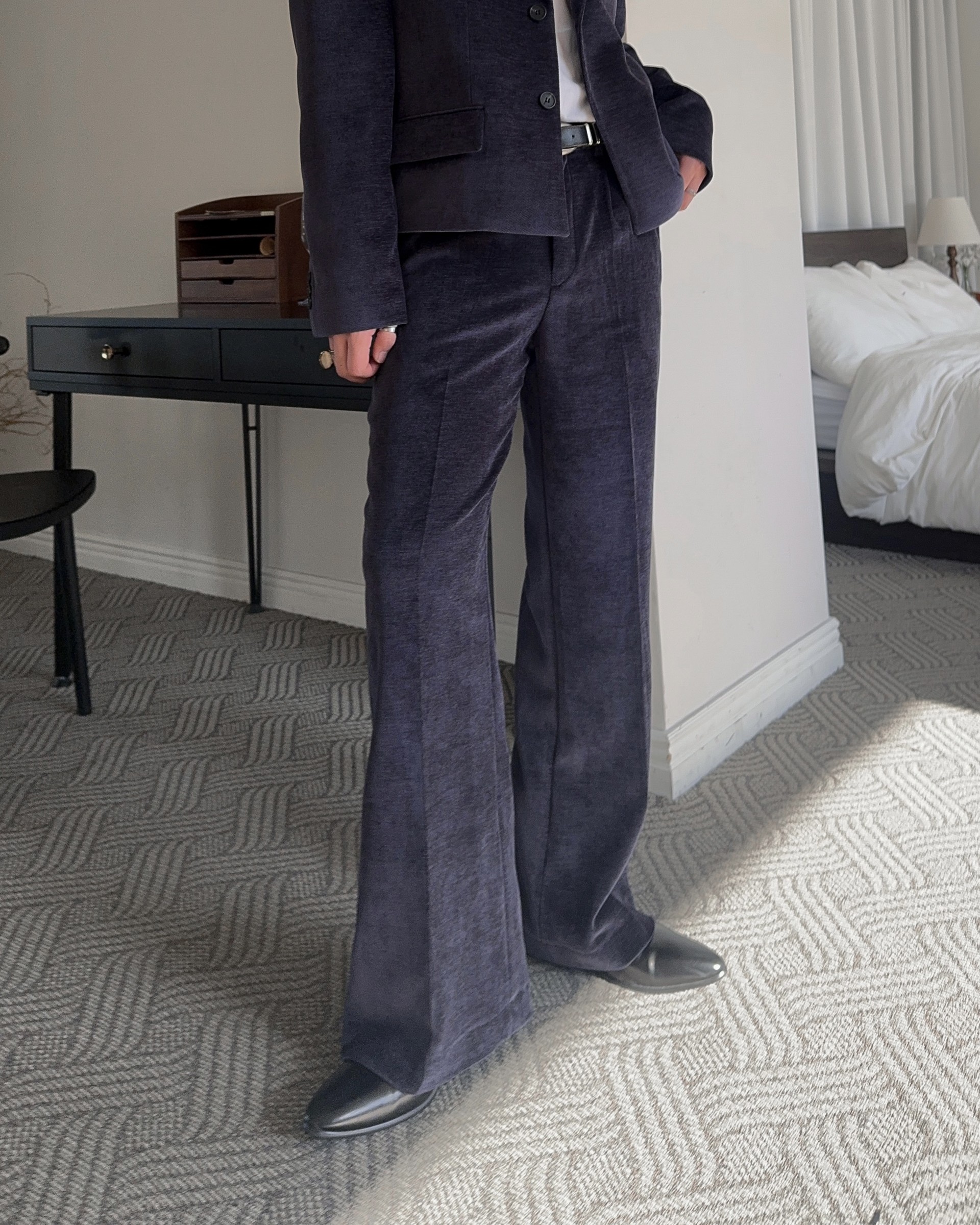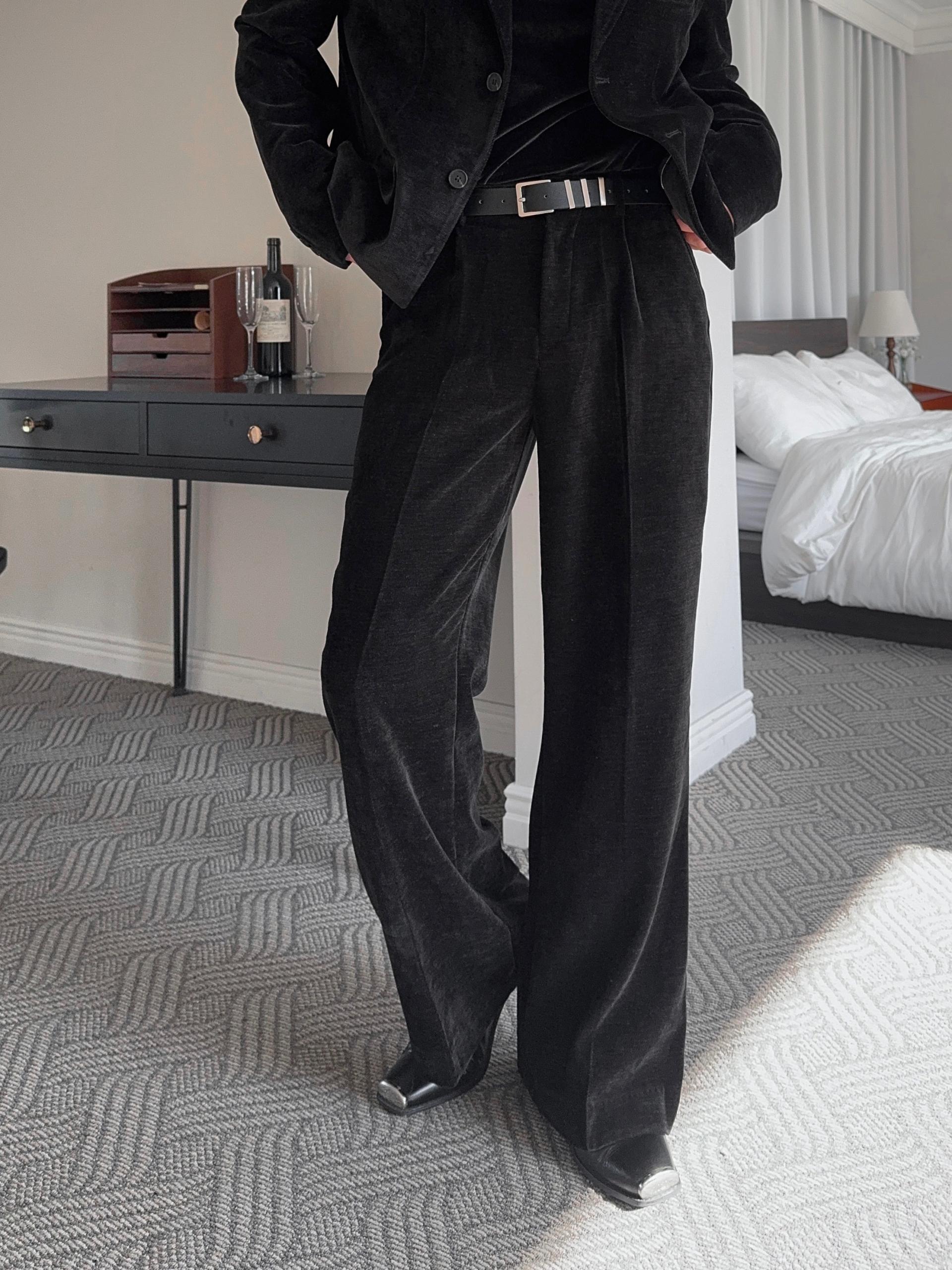 -부드러운 벨벳 소재로 제작된 플레어 팬츠