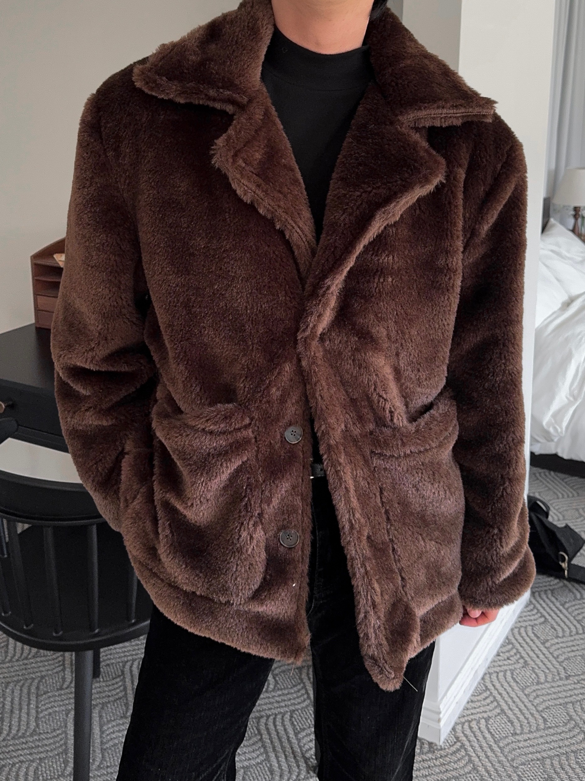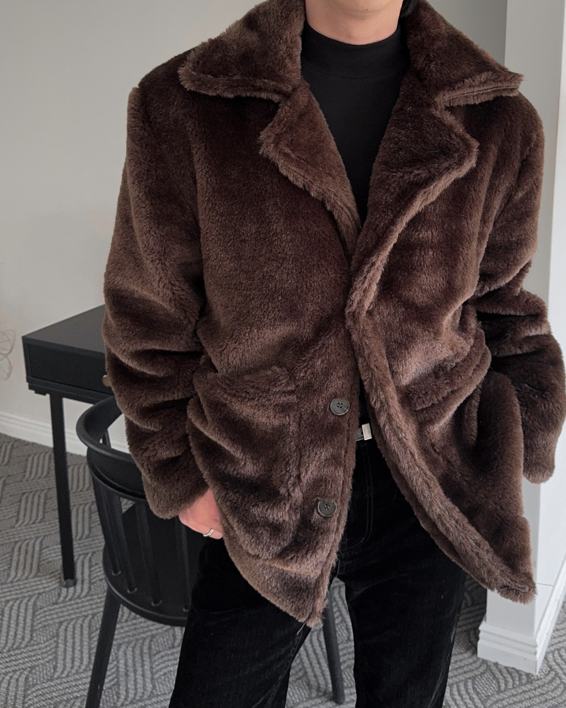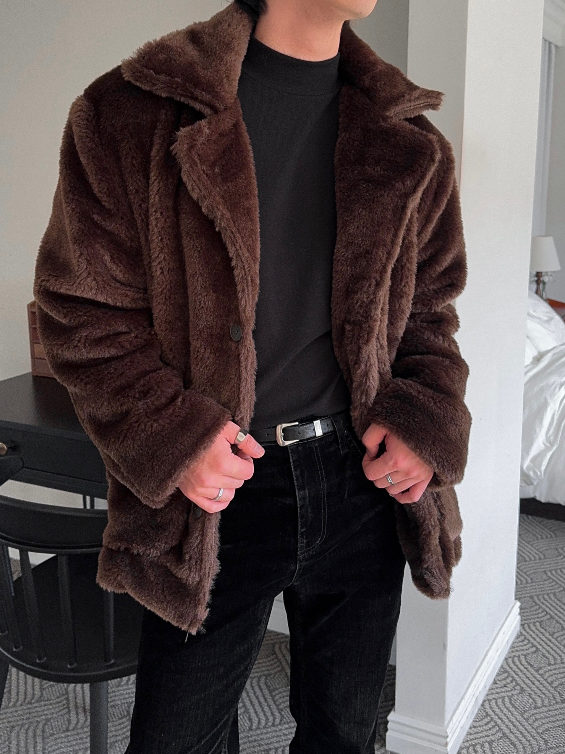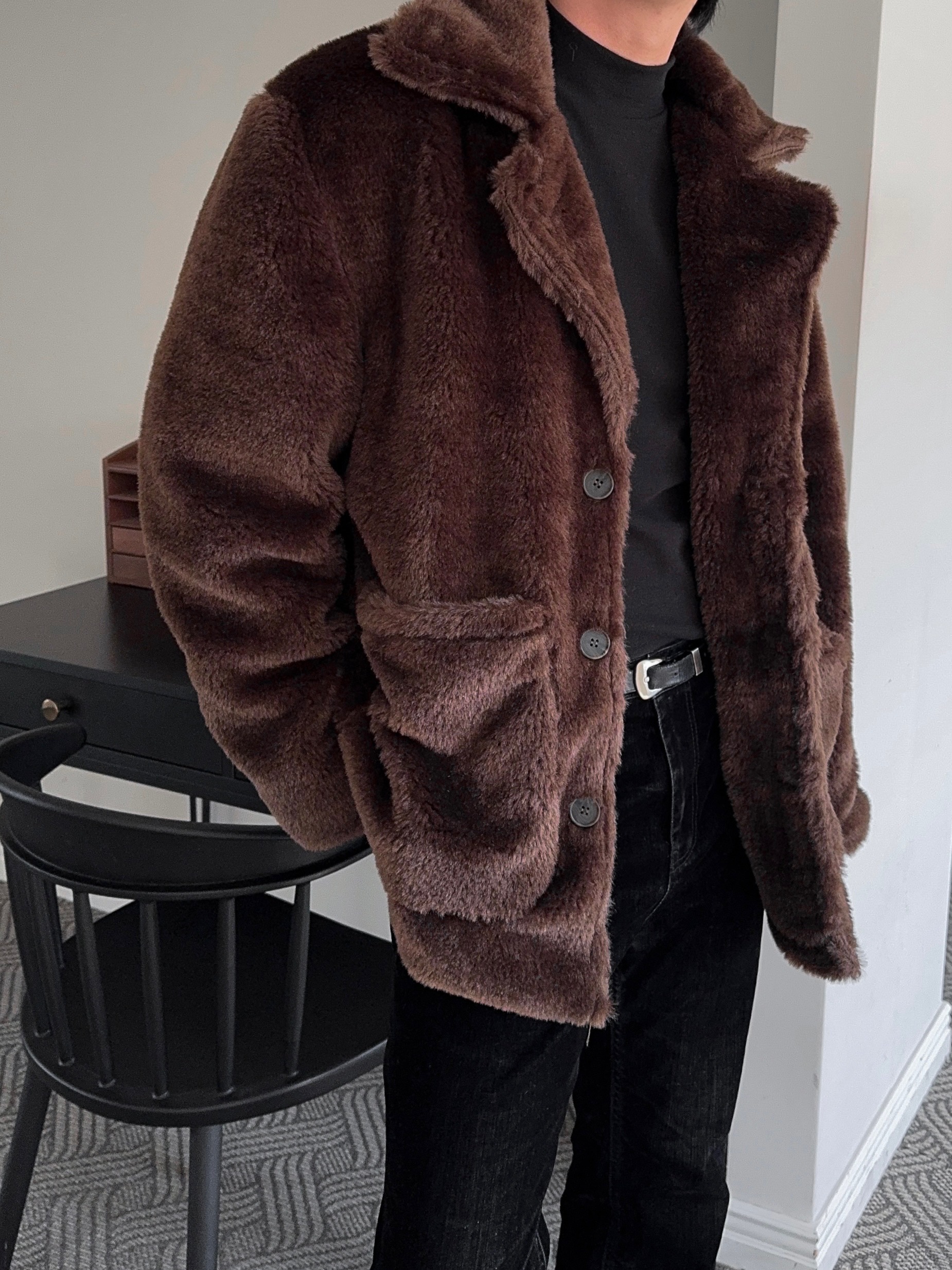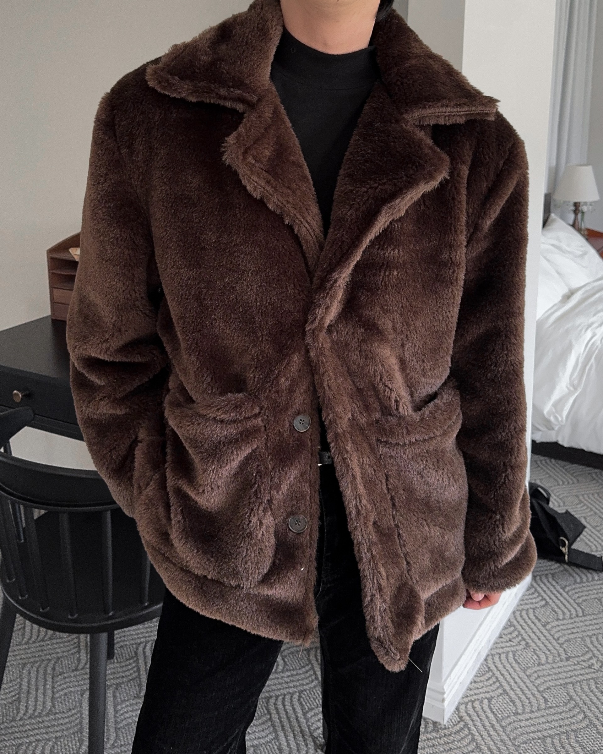 -풍성한 헤어감으로 제작된 퍼 코트
