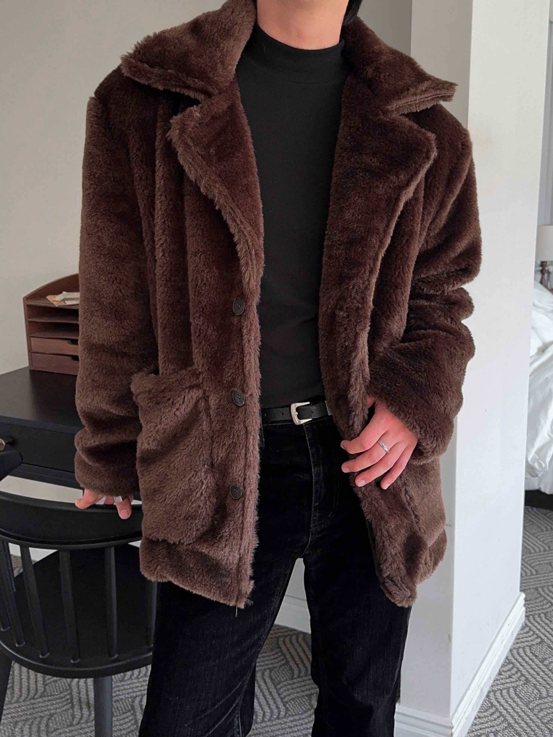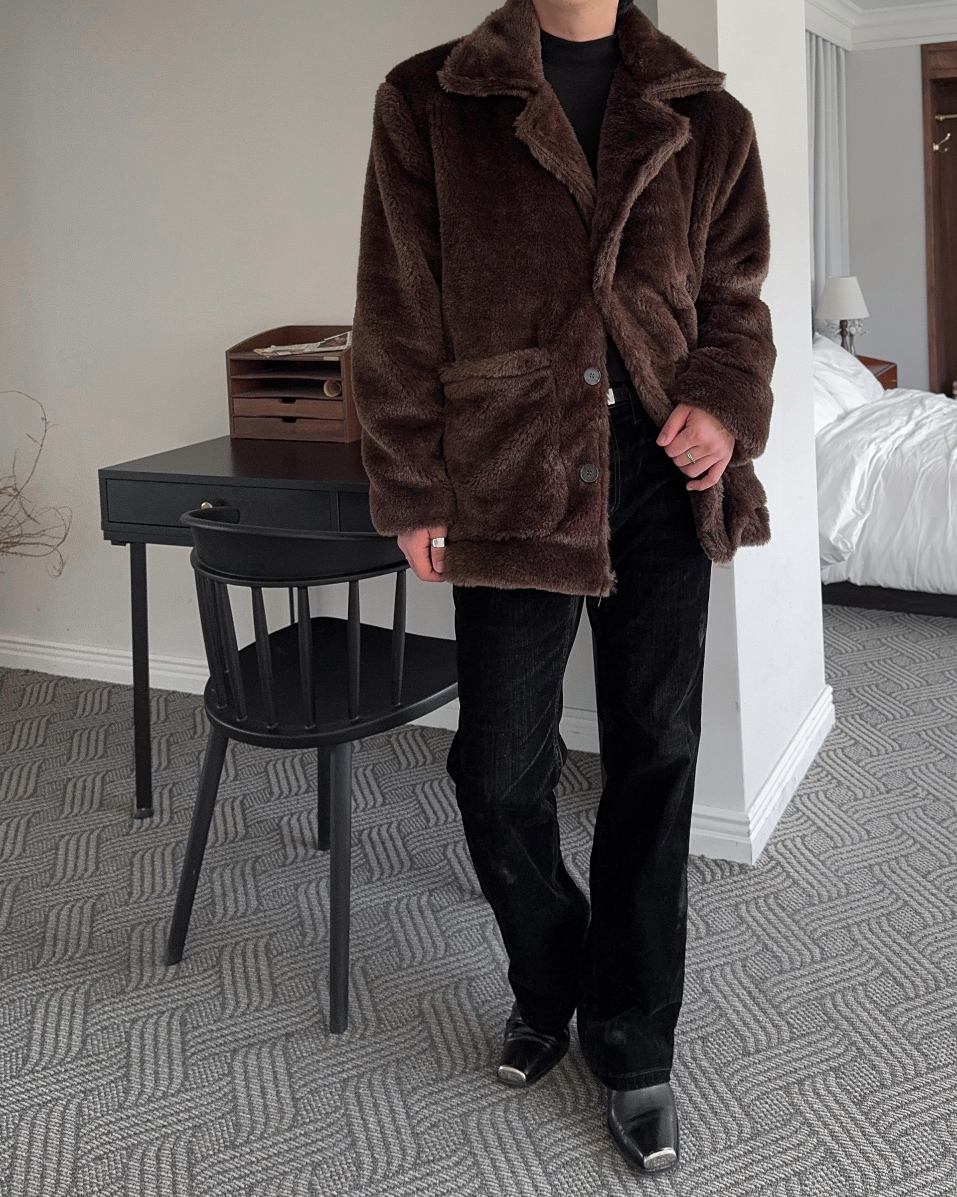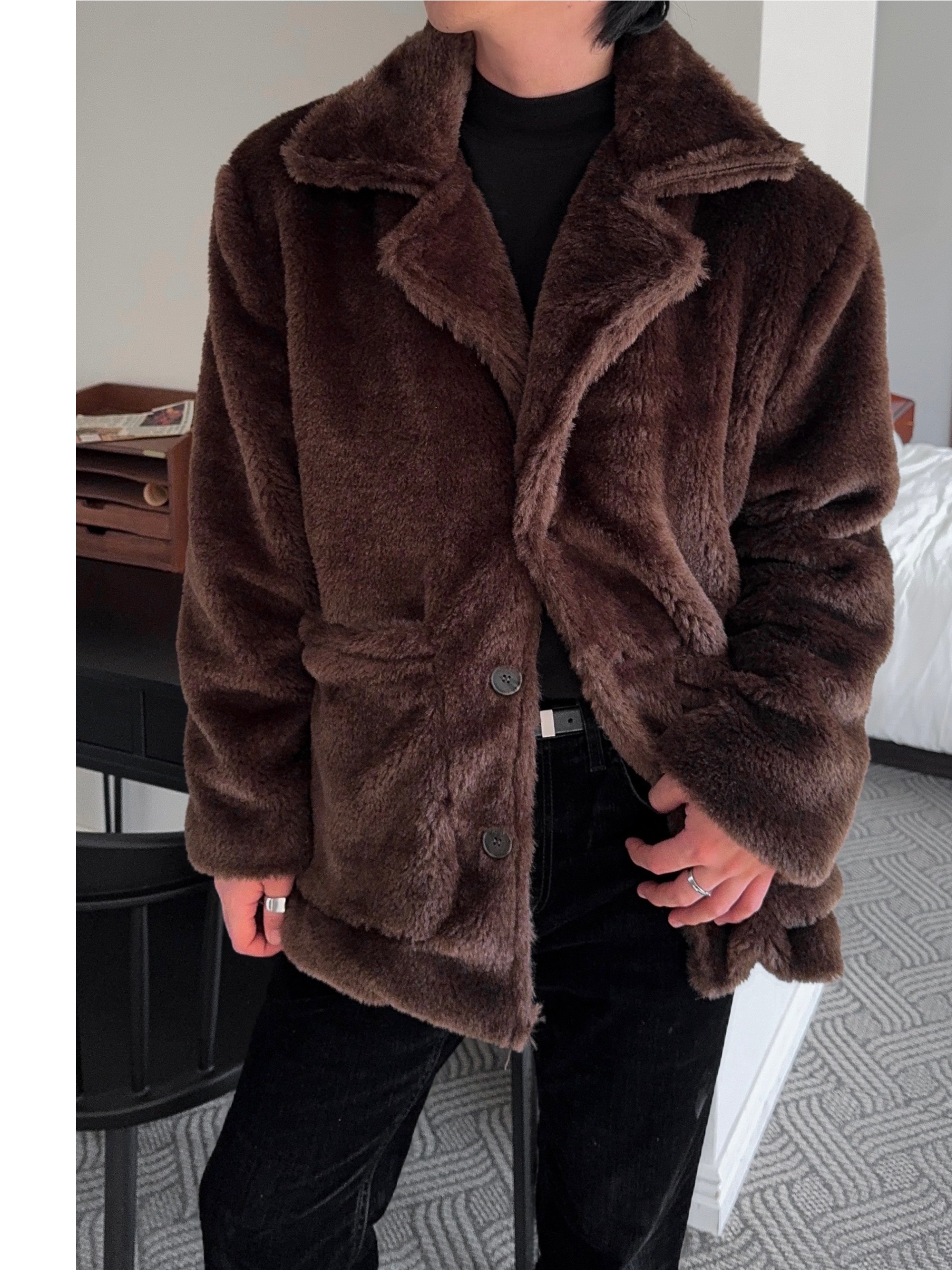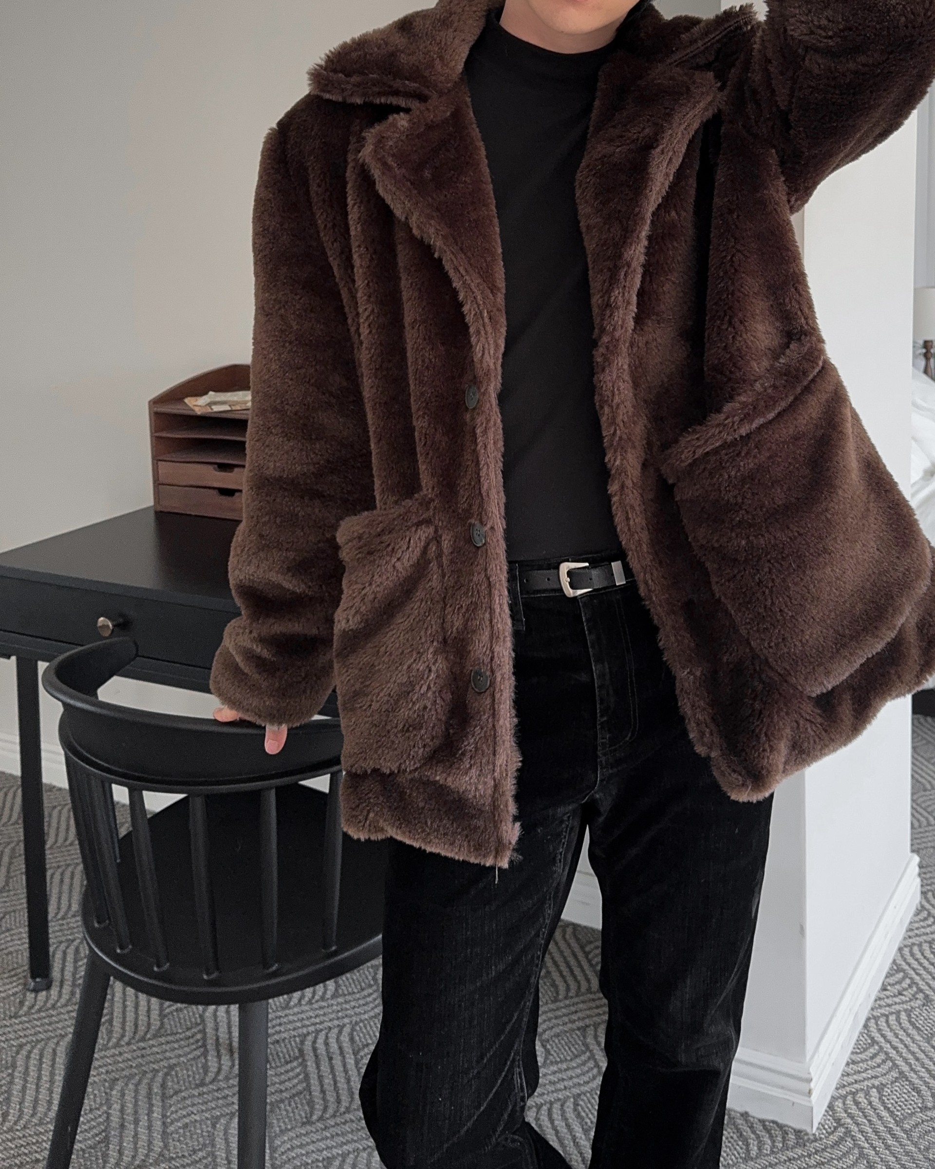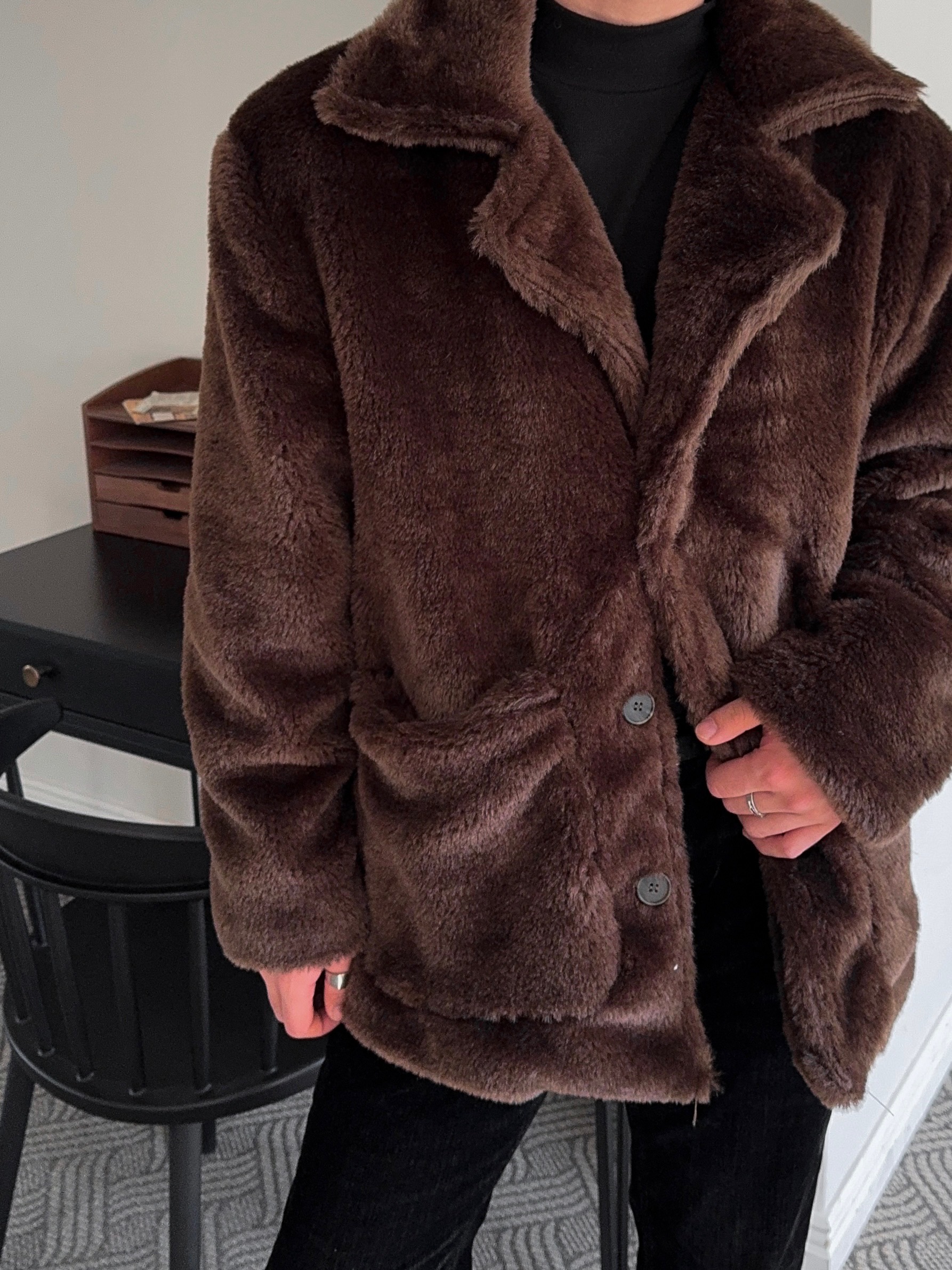 -풍성한 헤어감으로 제작된 퍼 코트