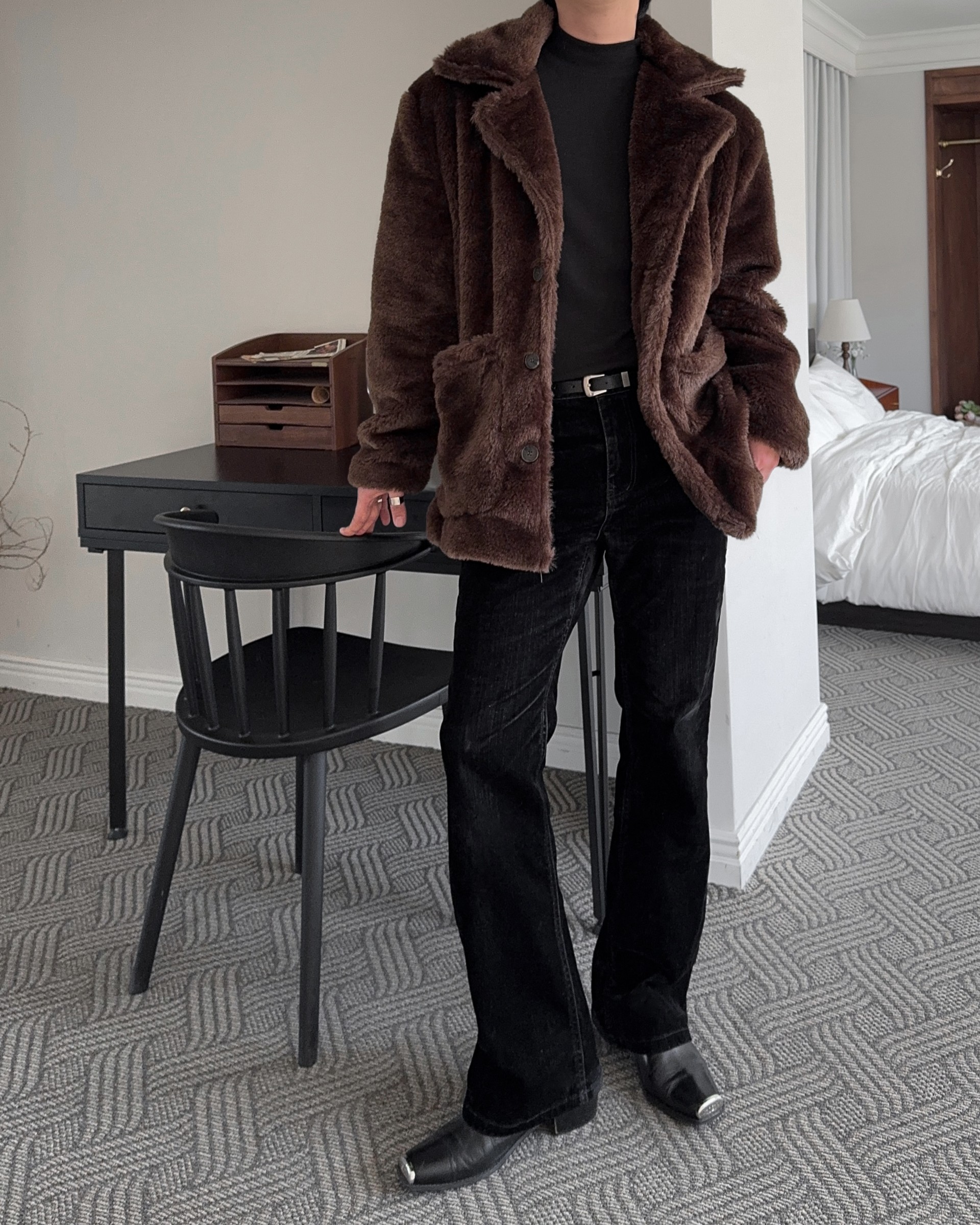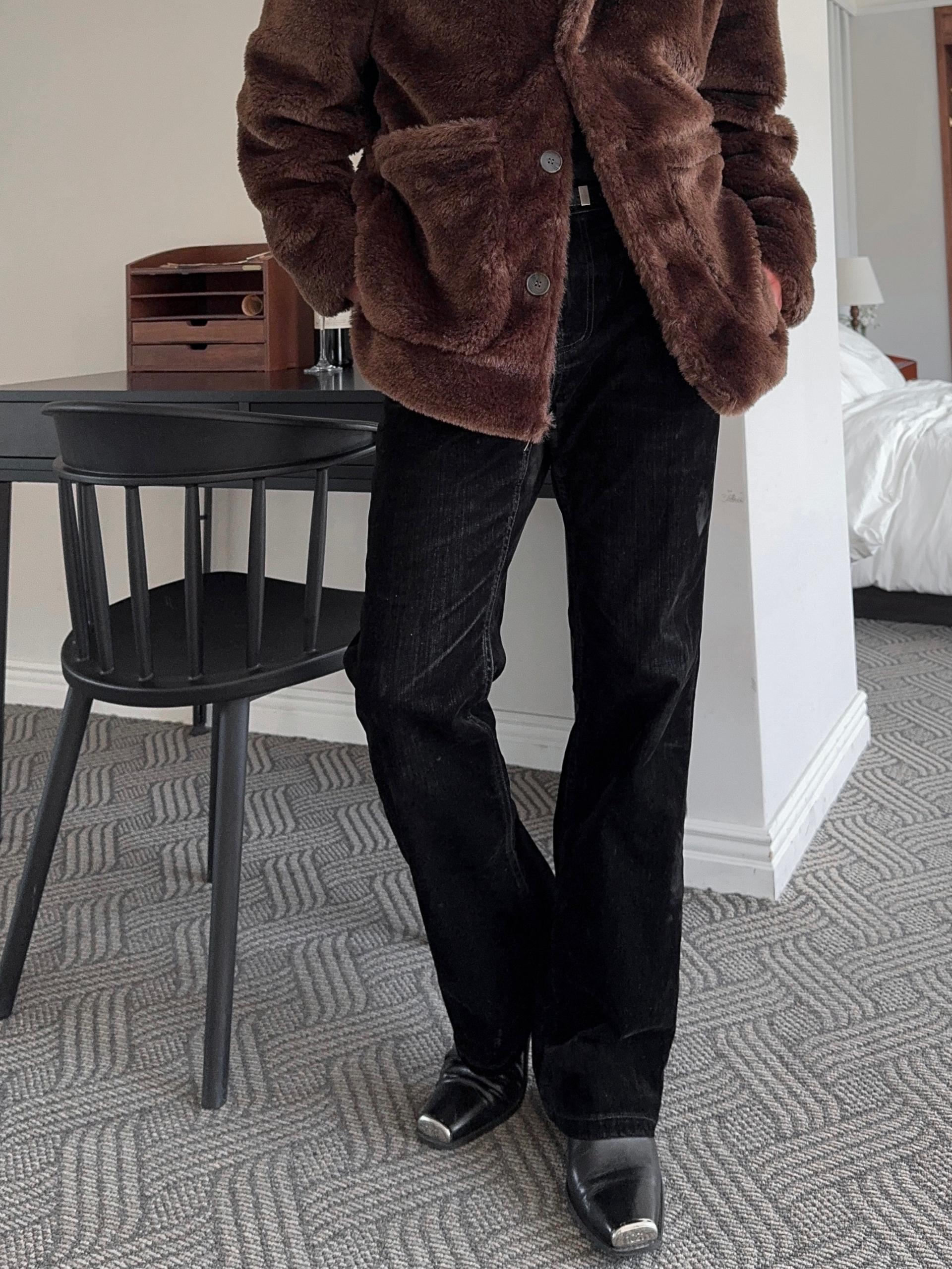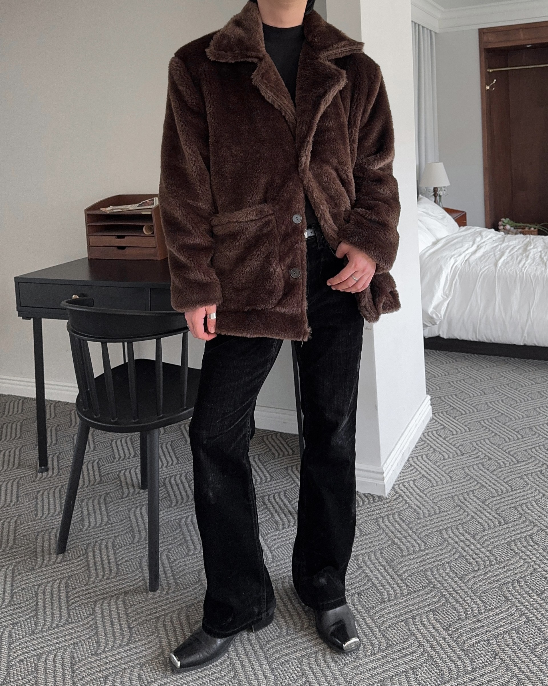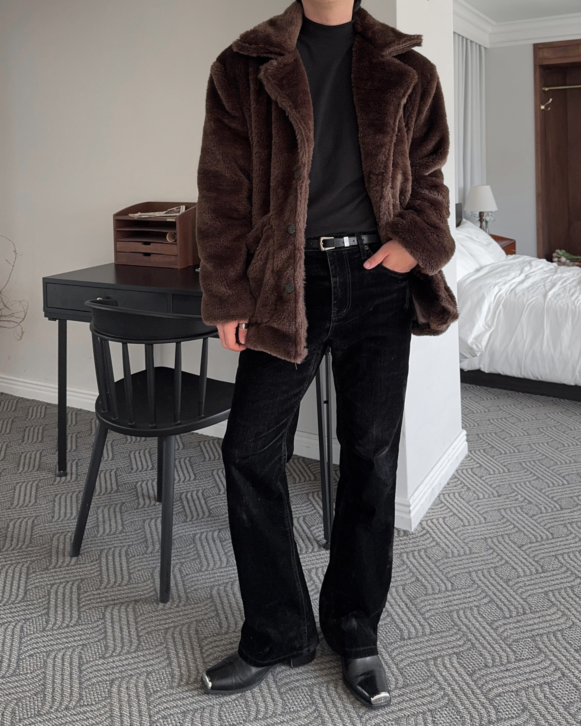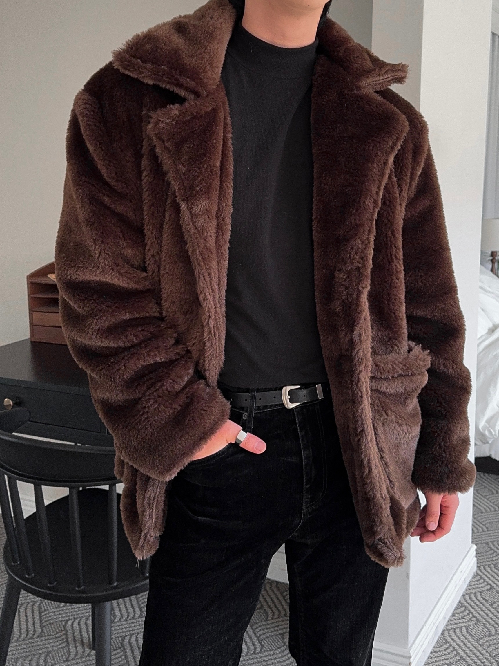 -풍성한 헤어감으로 제작된 퍼 코트
