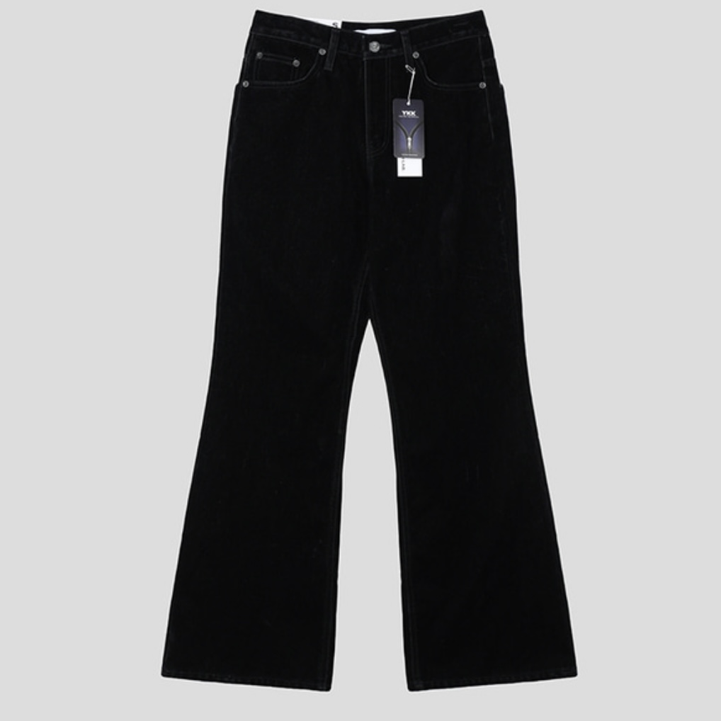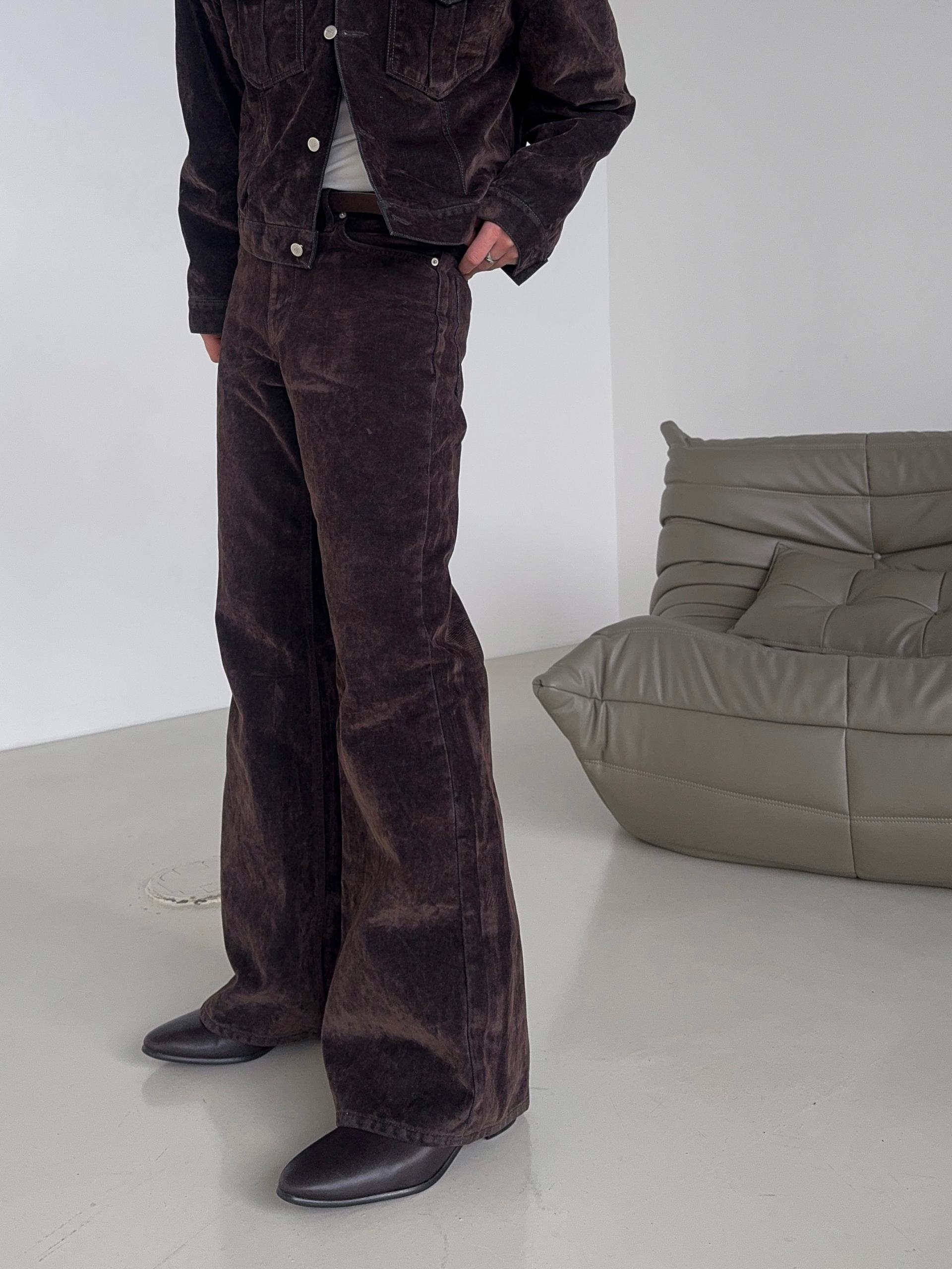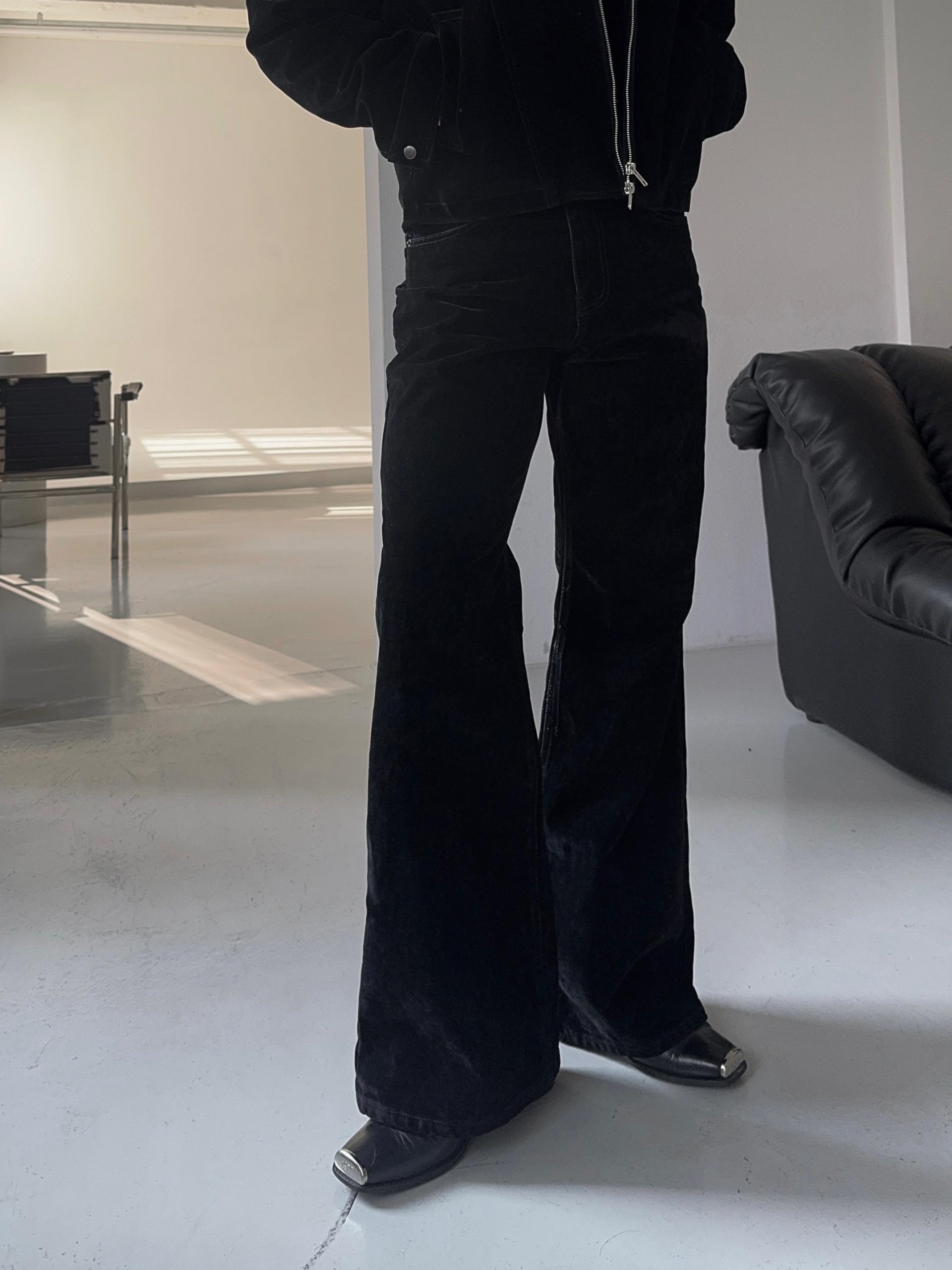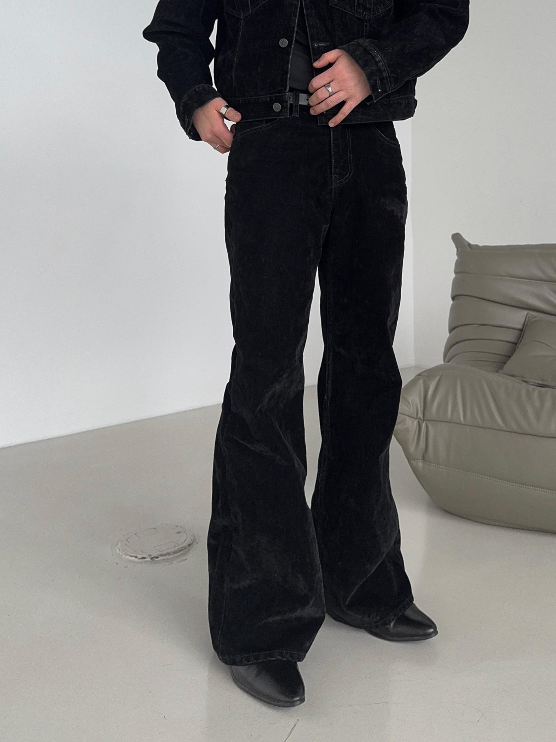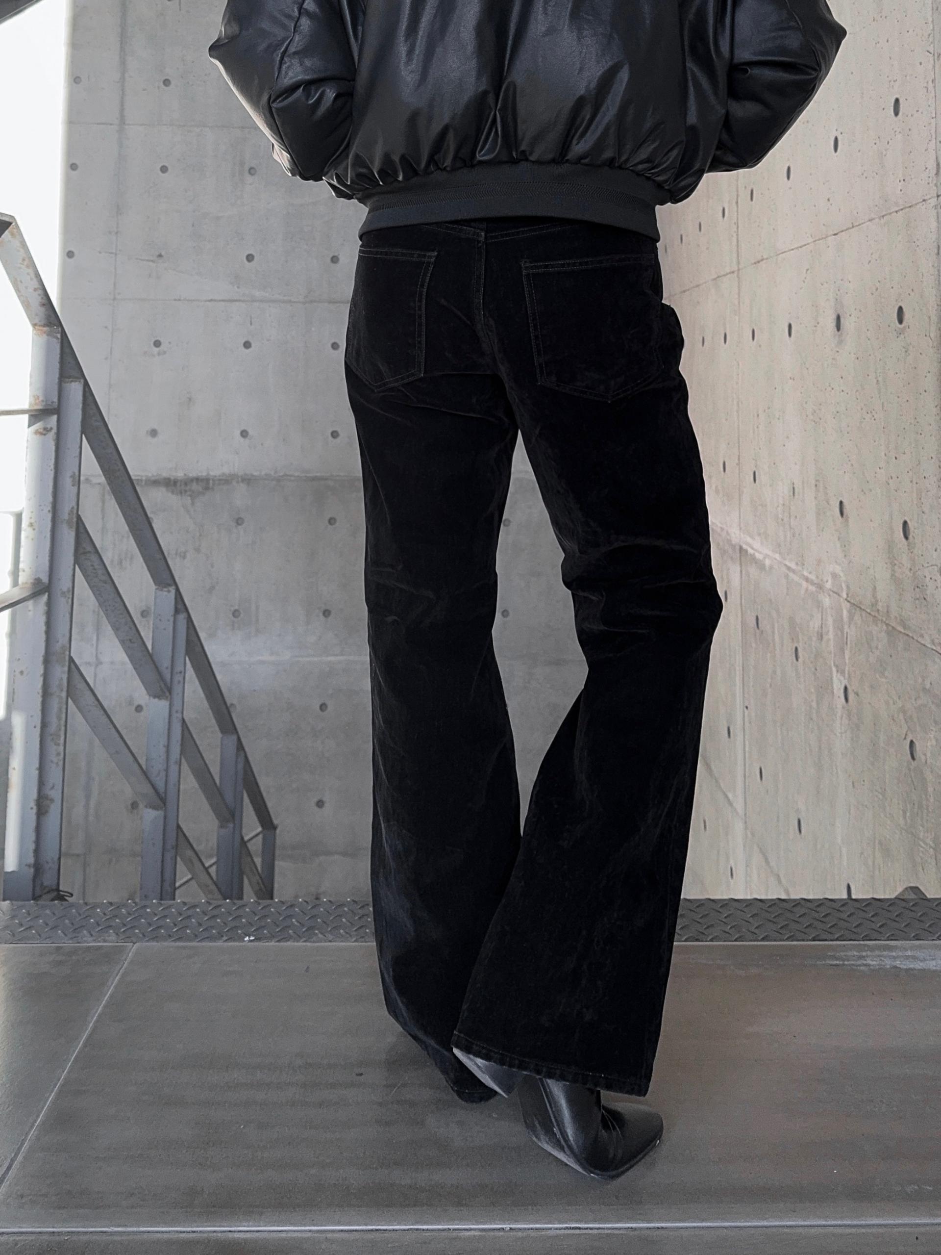 -벨벳 텍스처 데님 소재로 제작된 플레어 팬츠