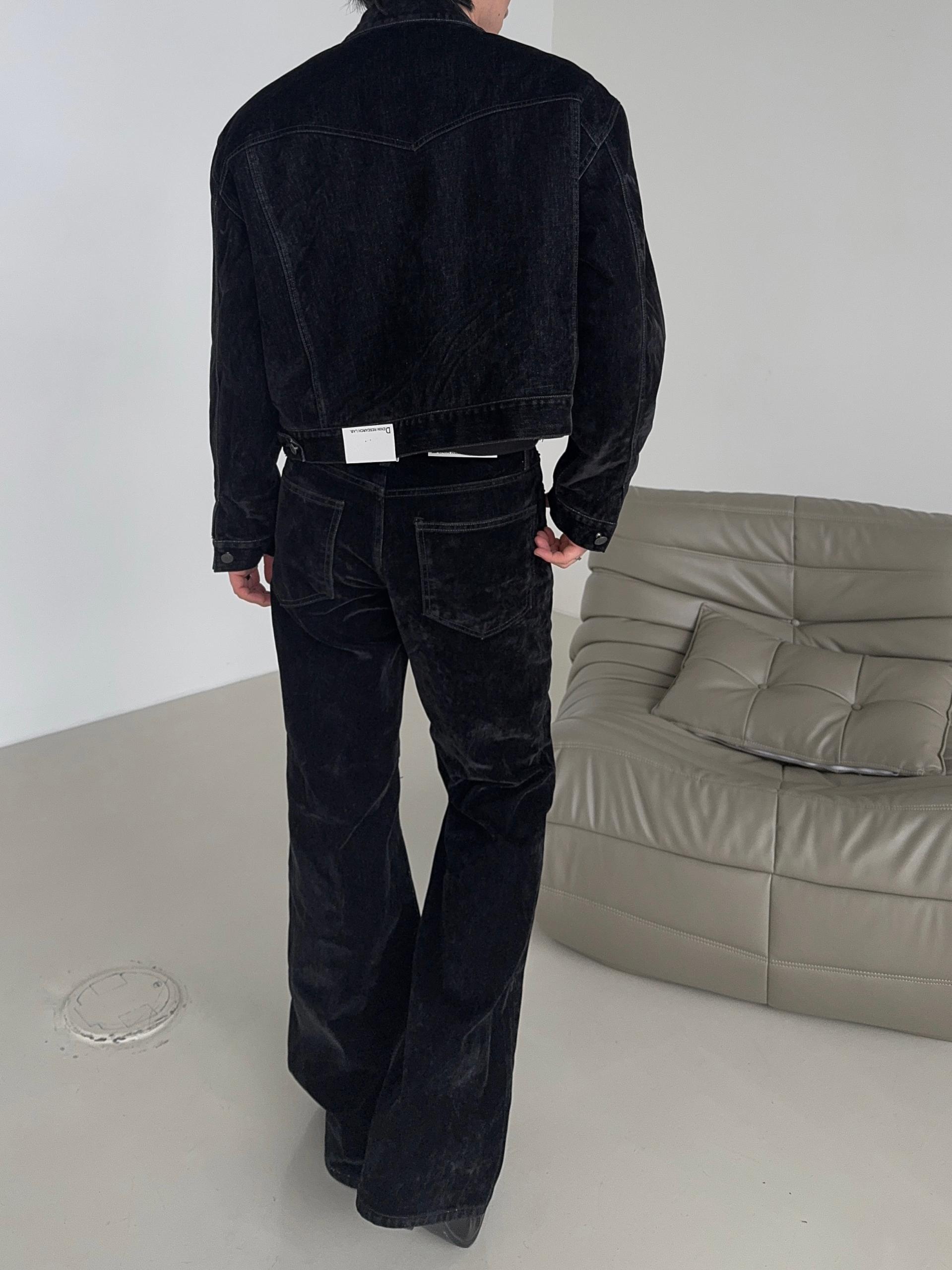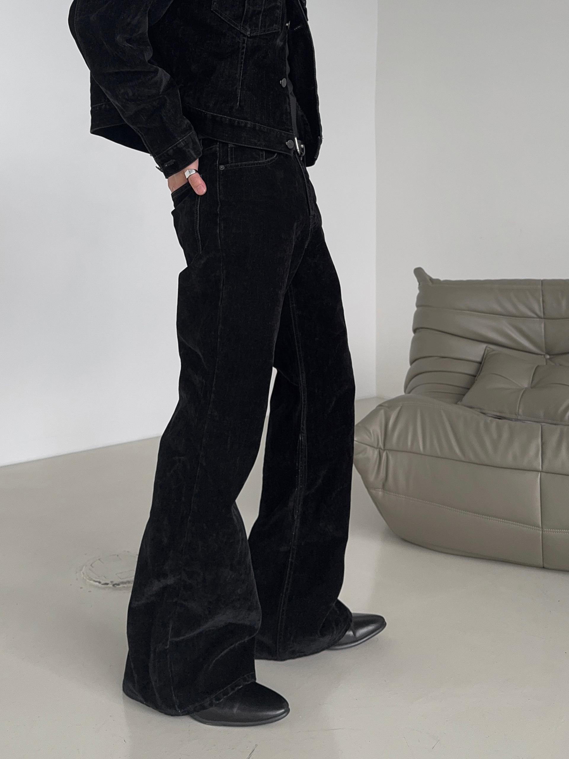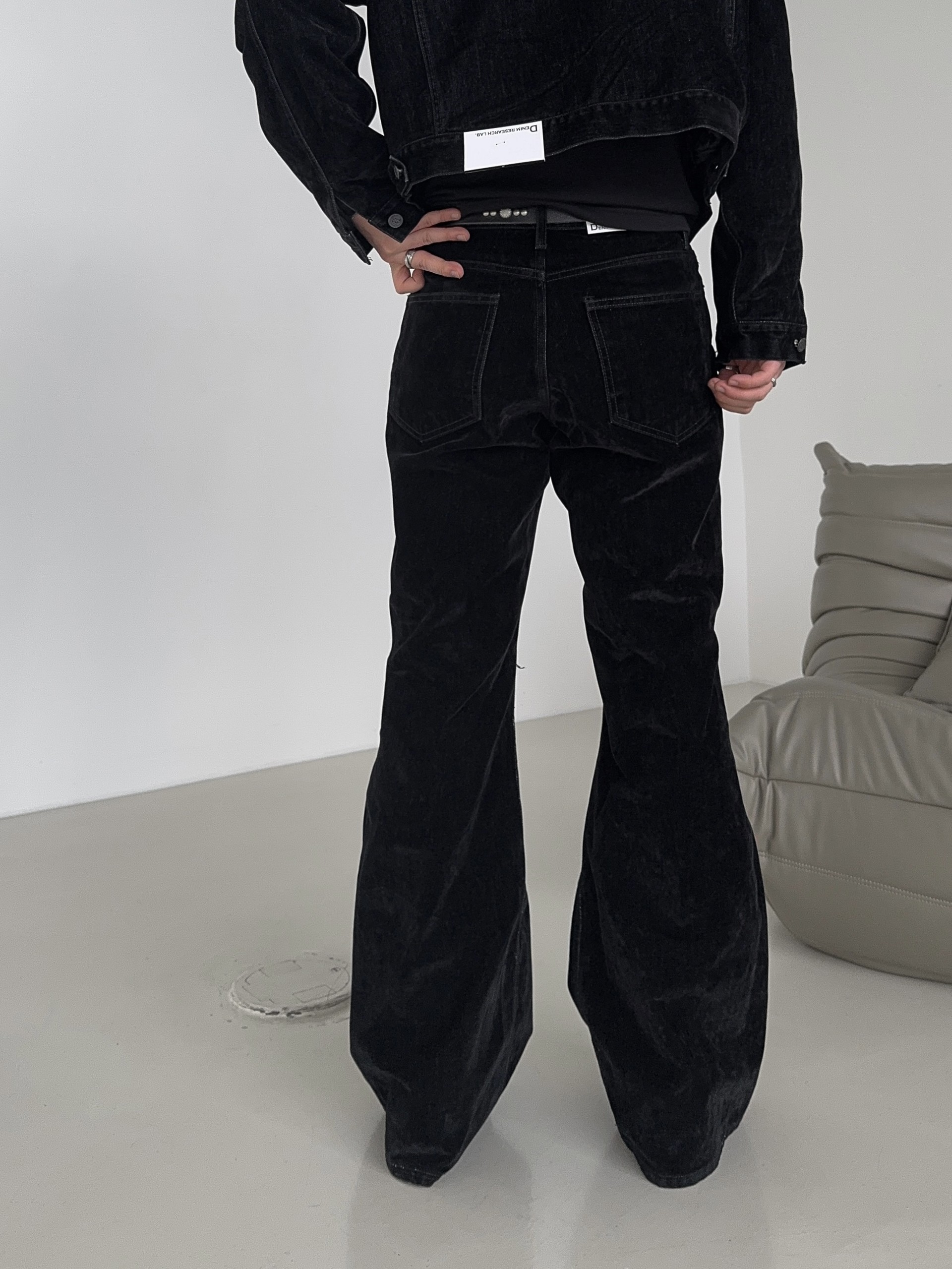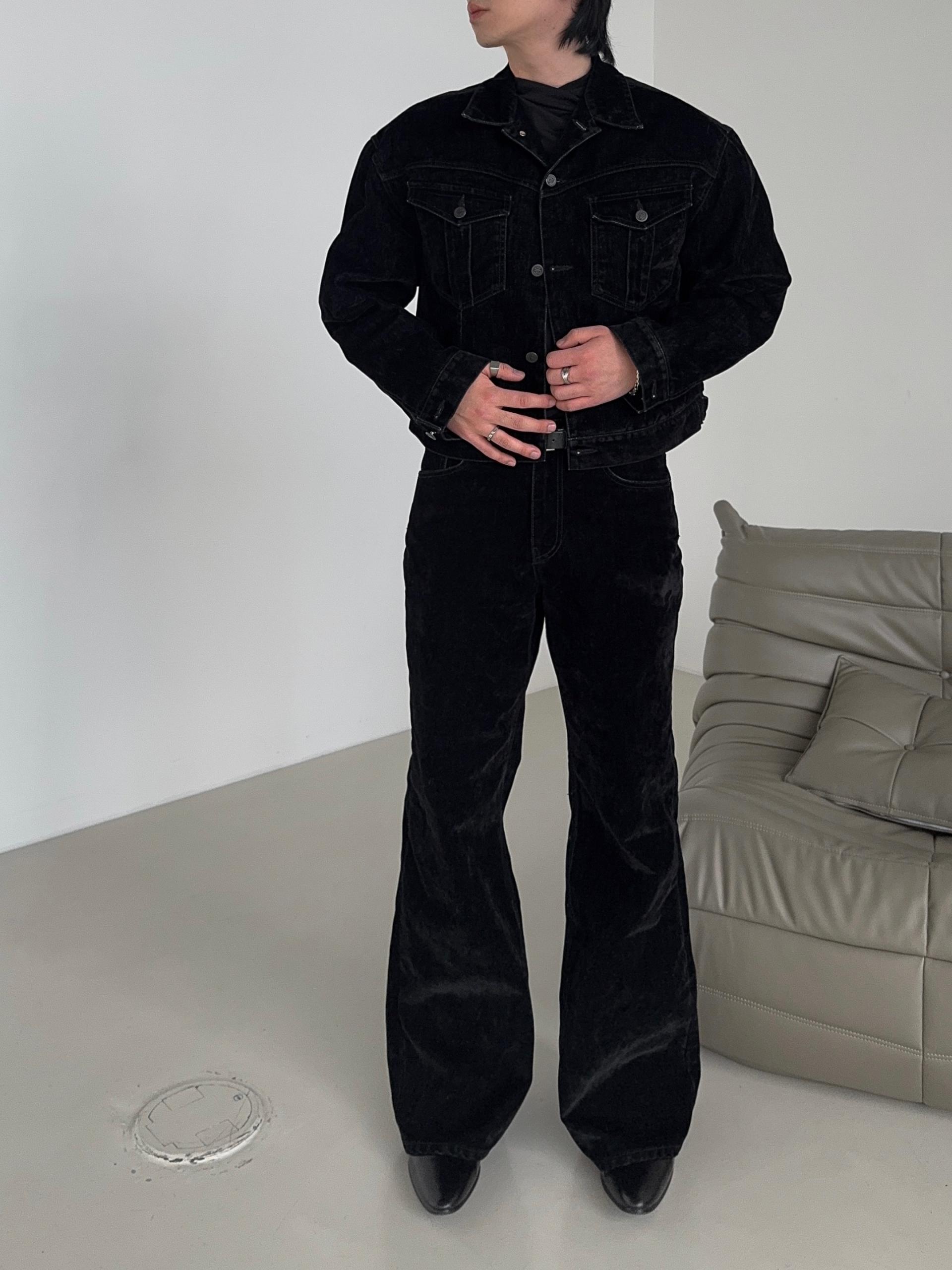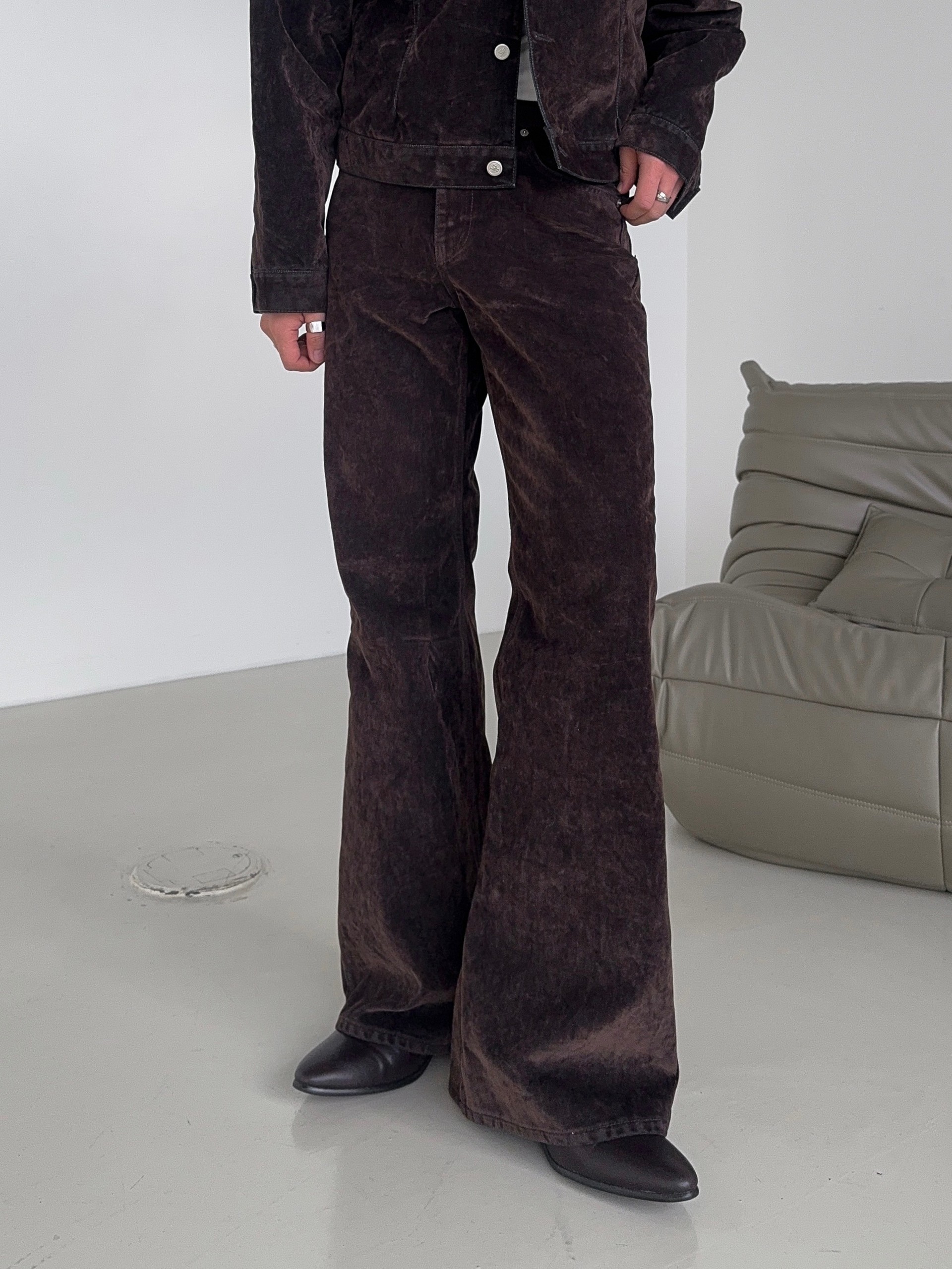 -벨벳 텍스처 데님 소재로 제작된 플레어 팬츠