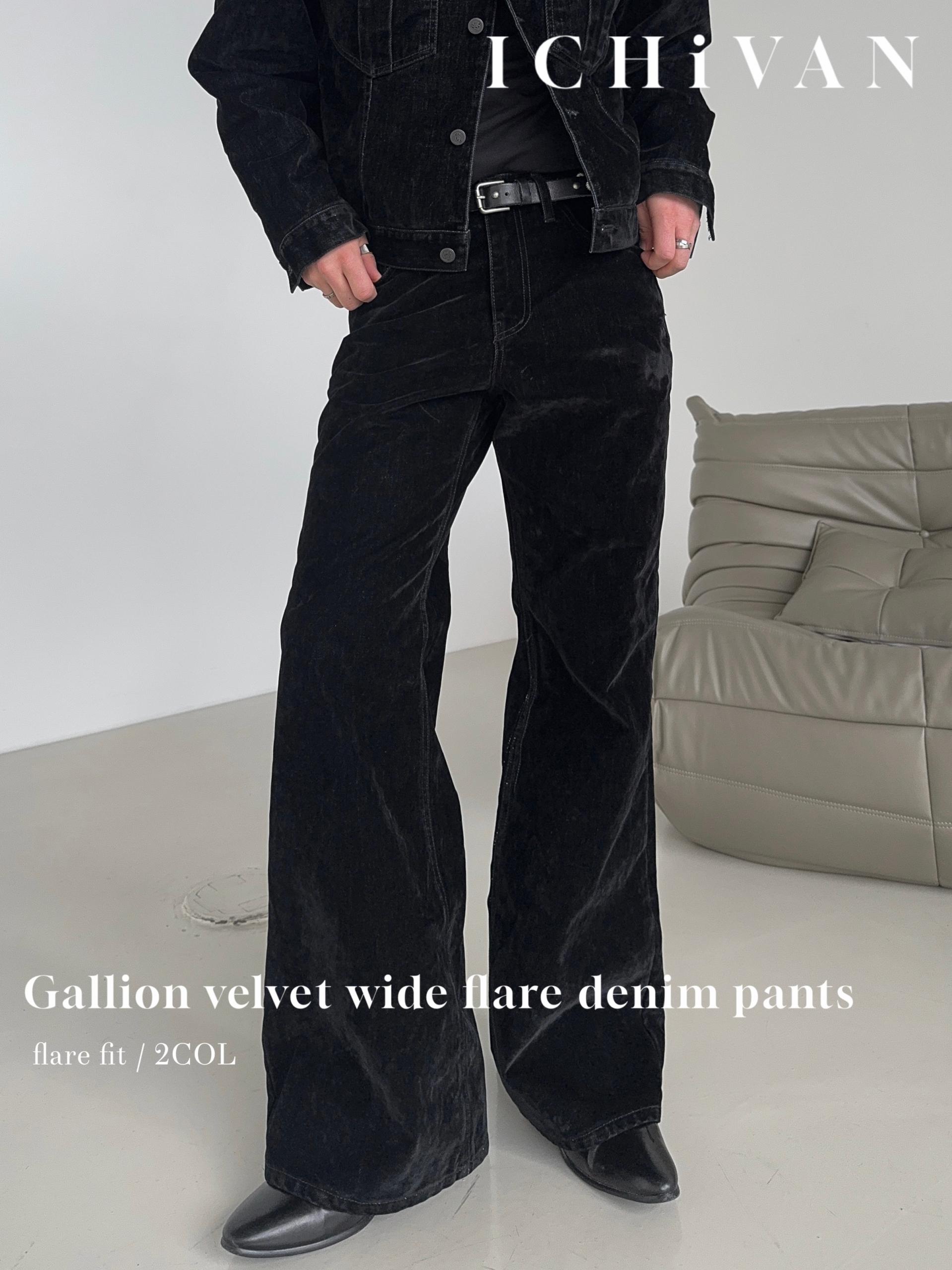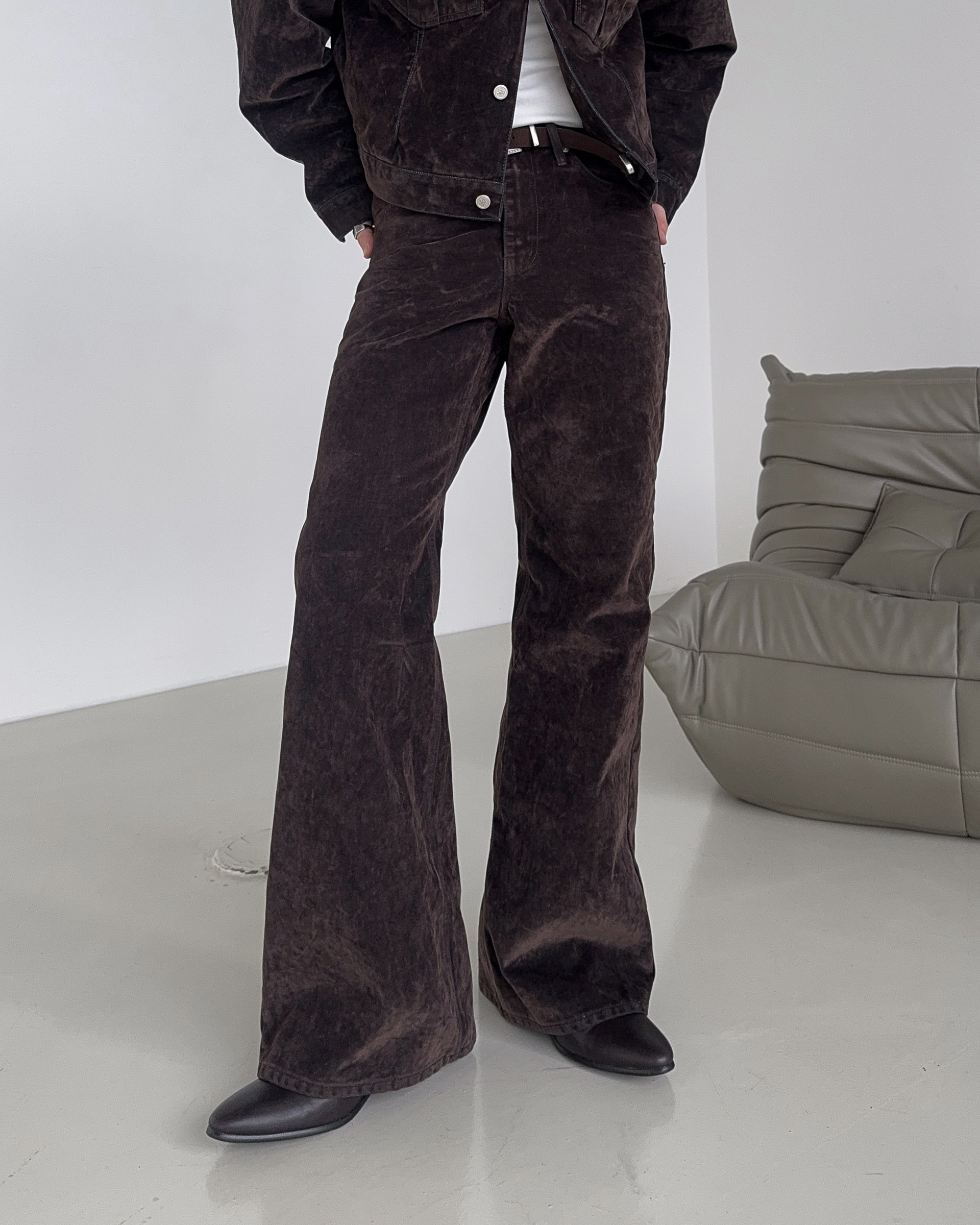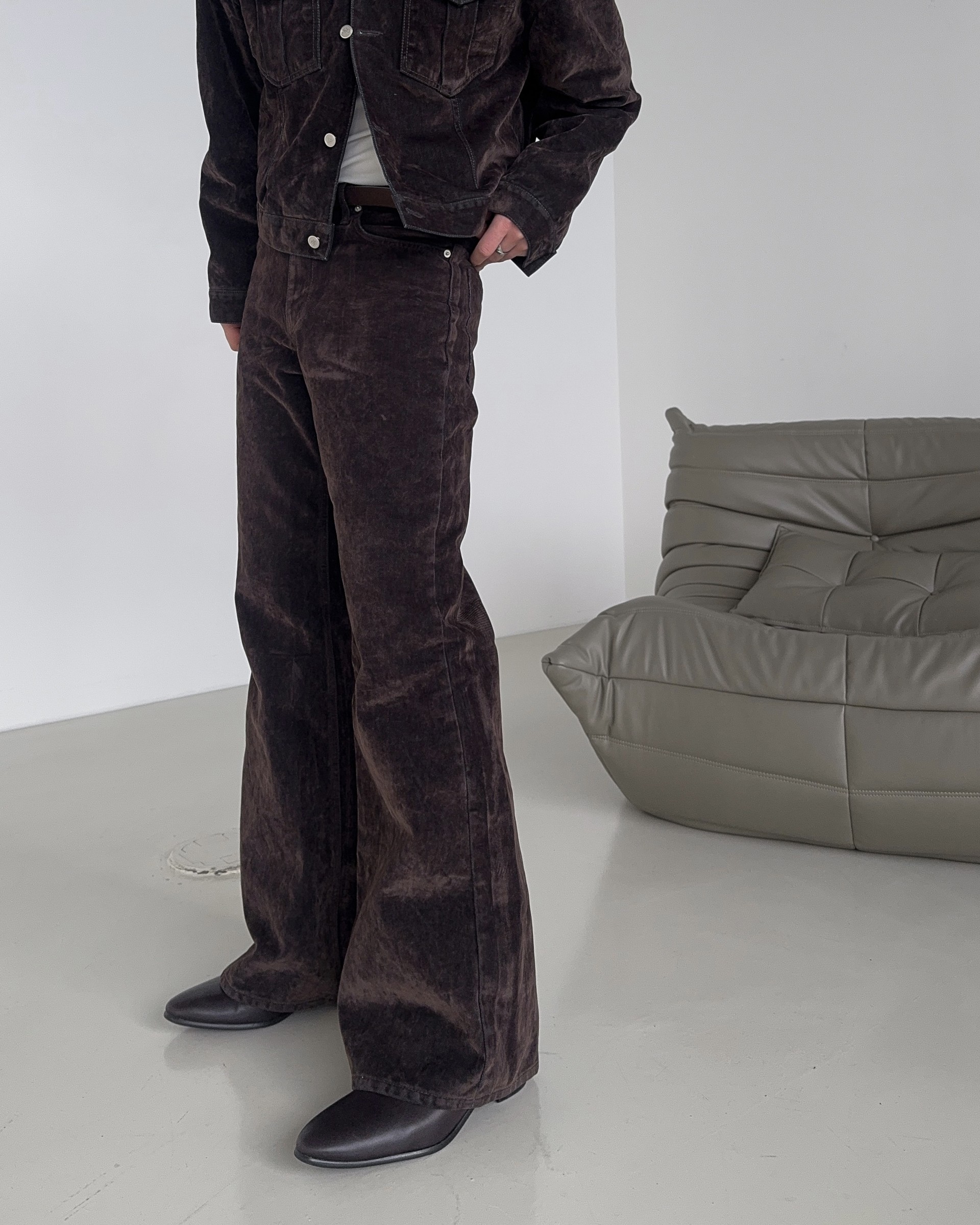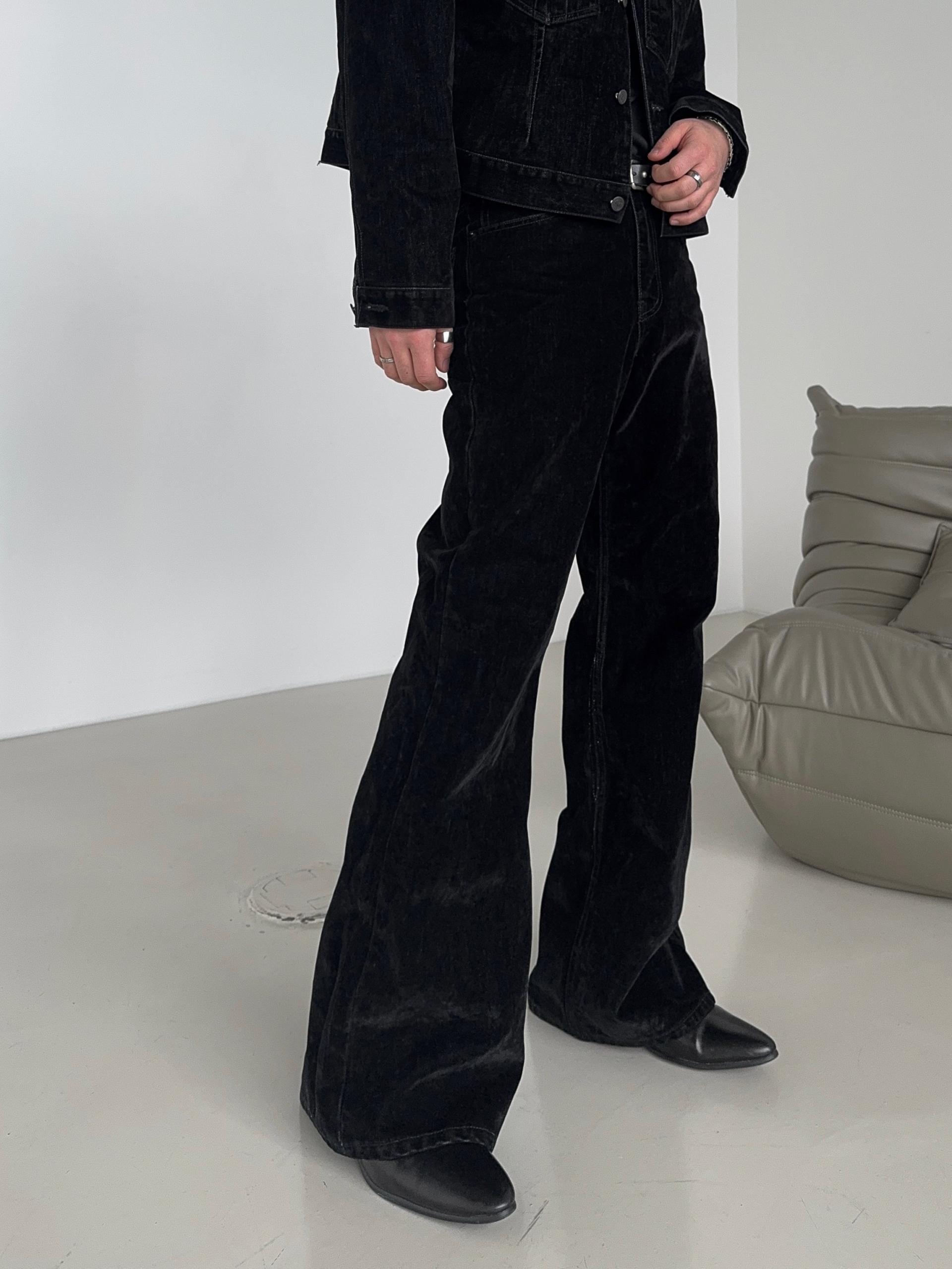 -벨벳 텍스처 데님 소재로 제작된 플레어 팬츠