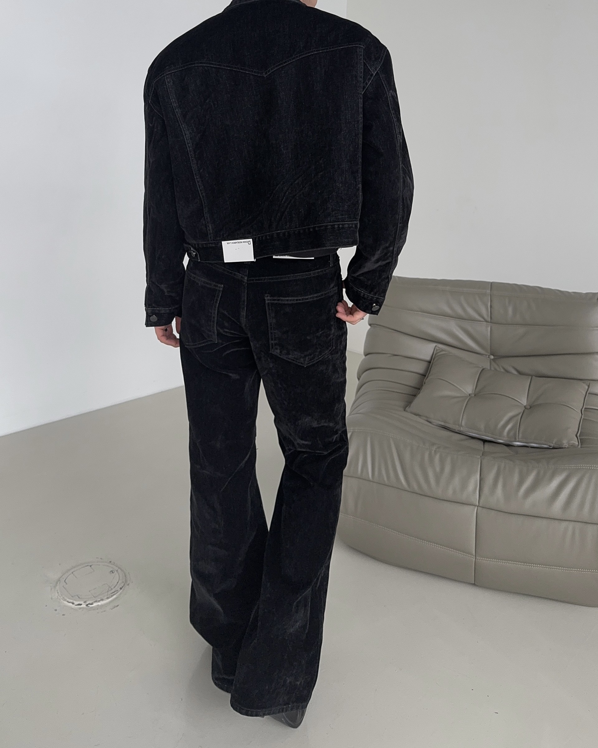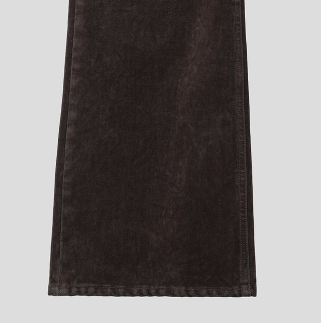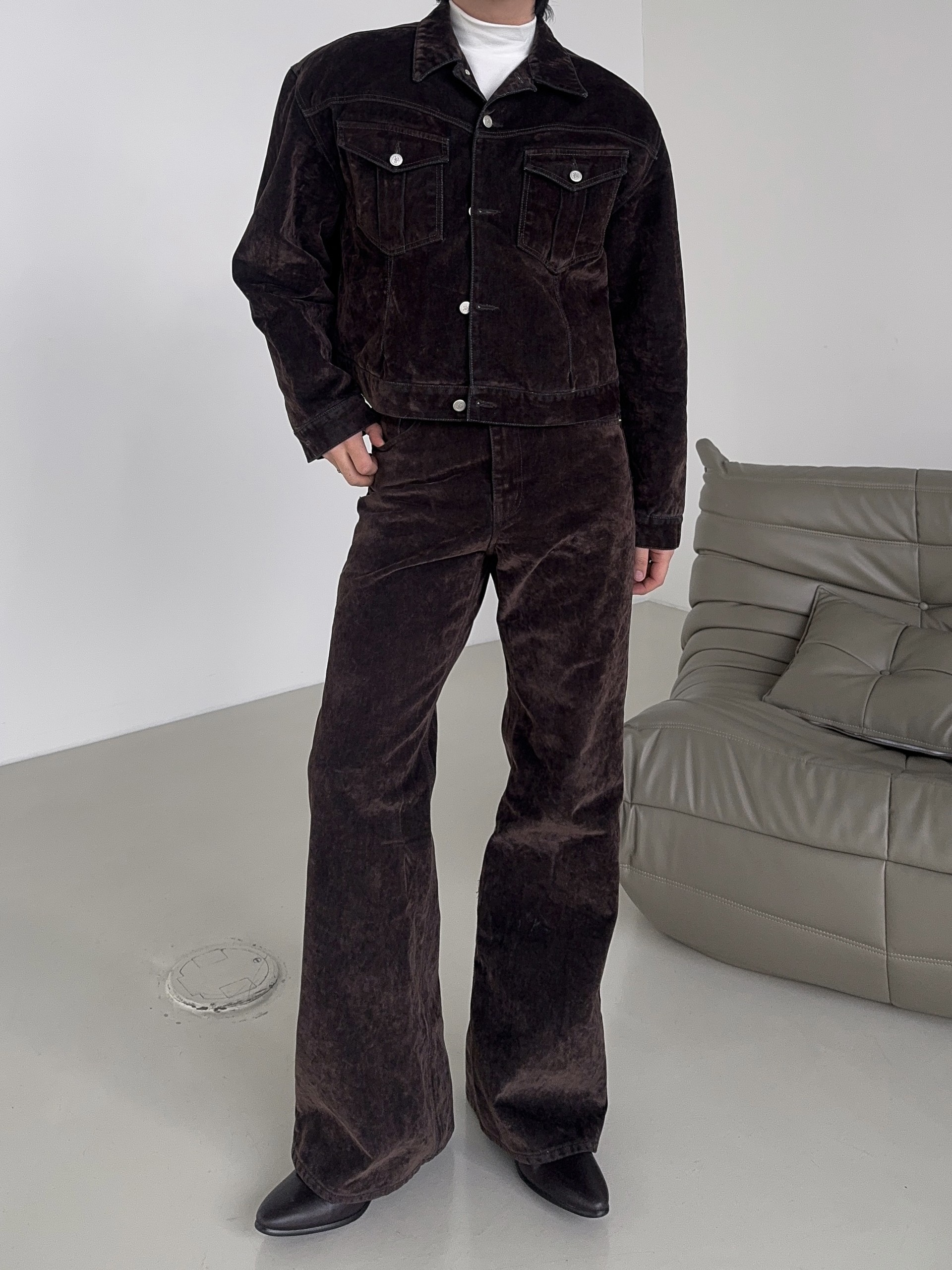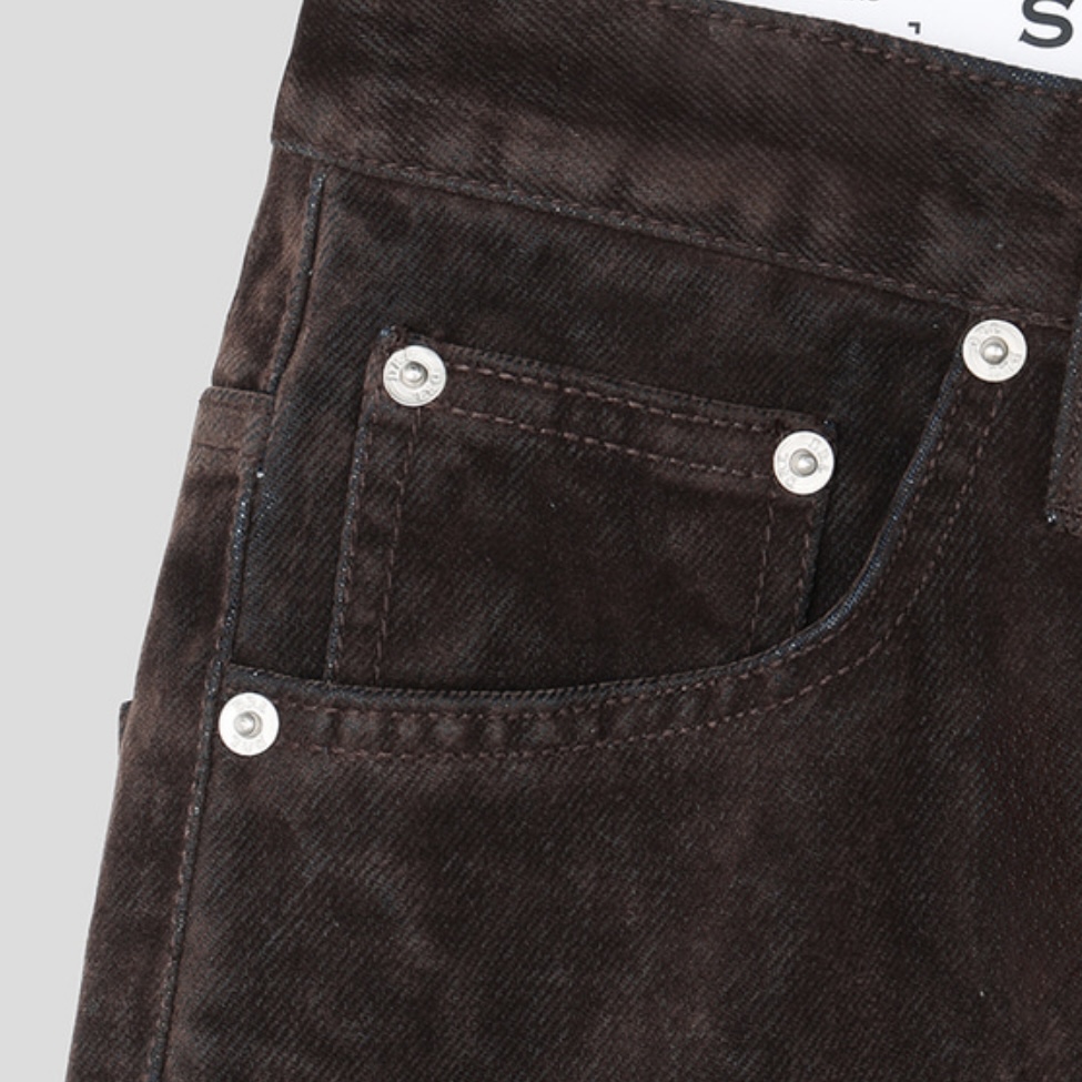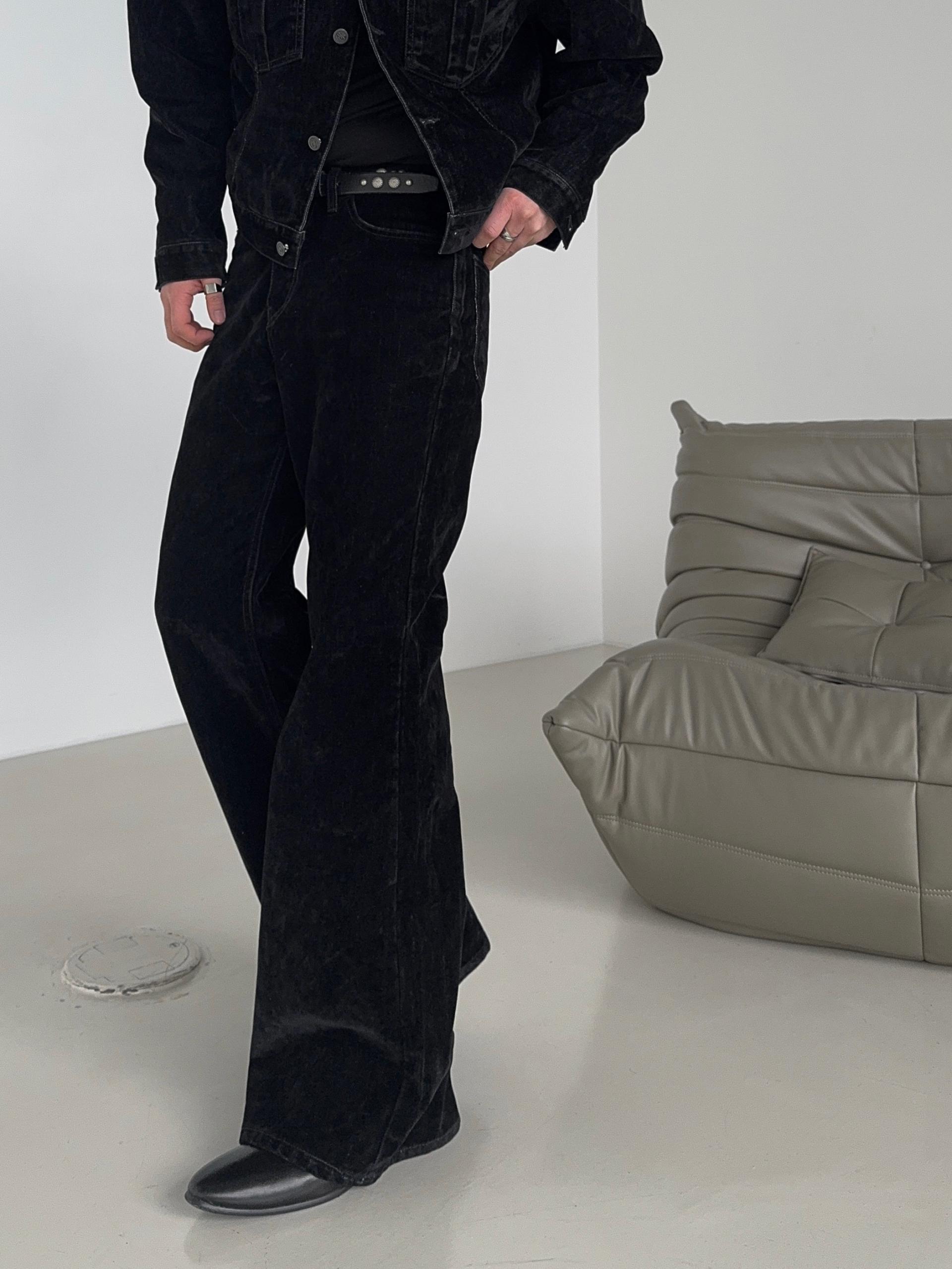 -벨벳 텍스처 데님 소재로 제작된 플레어 팬츠