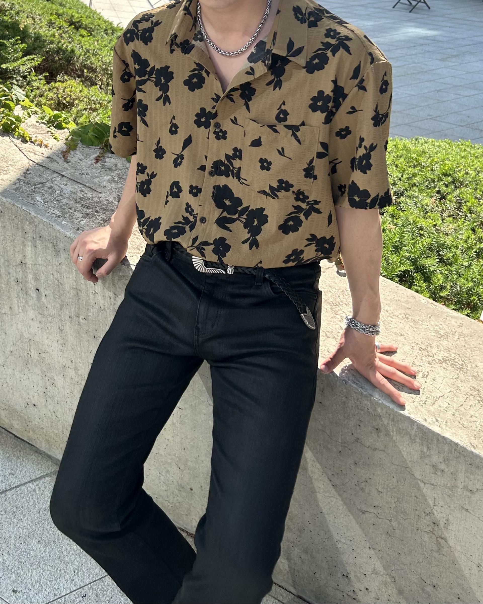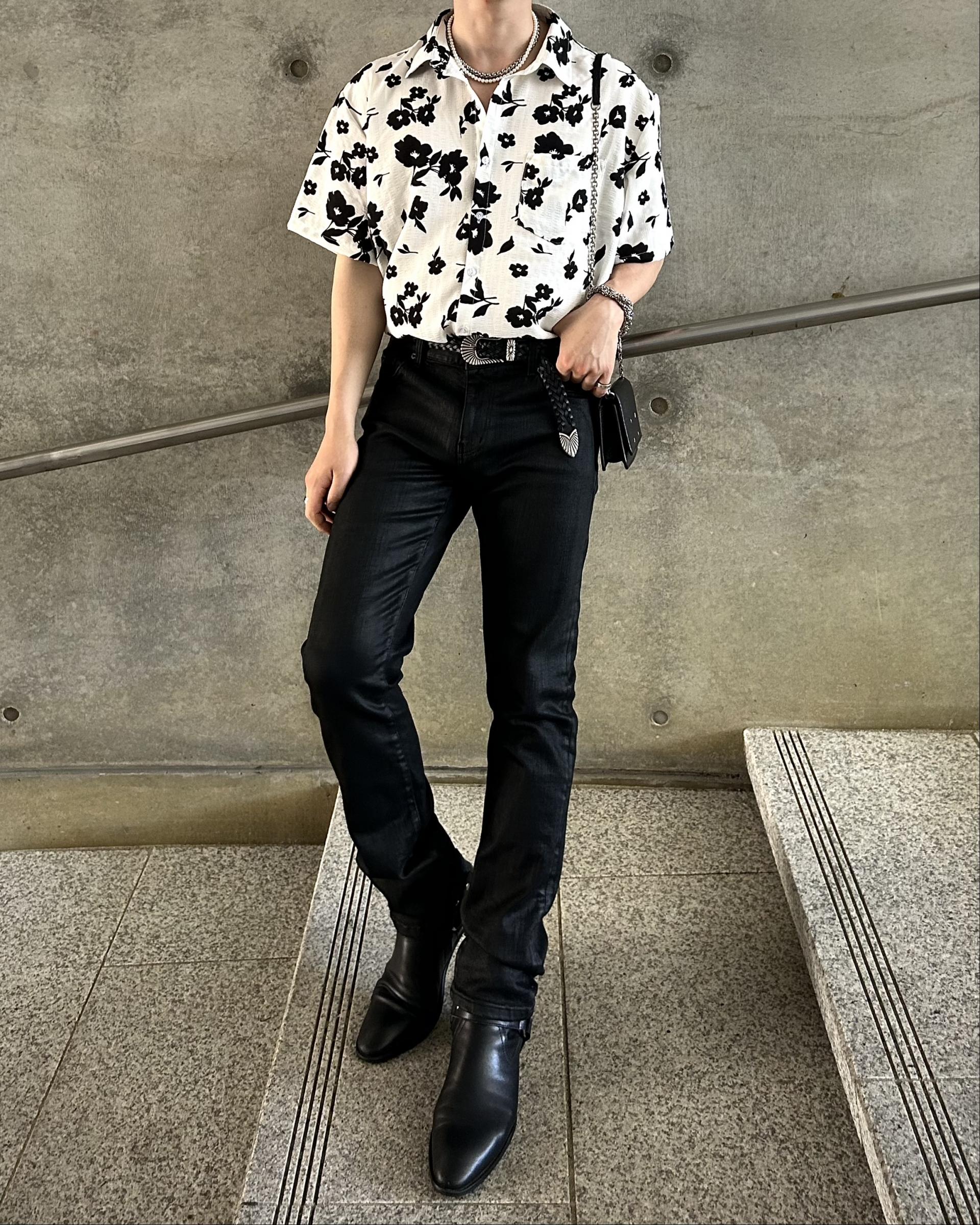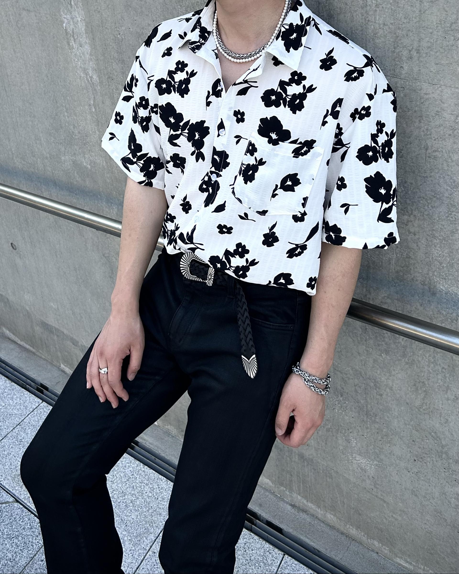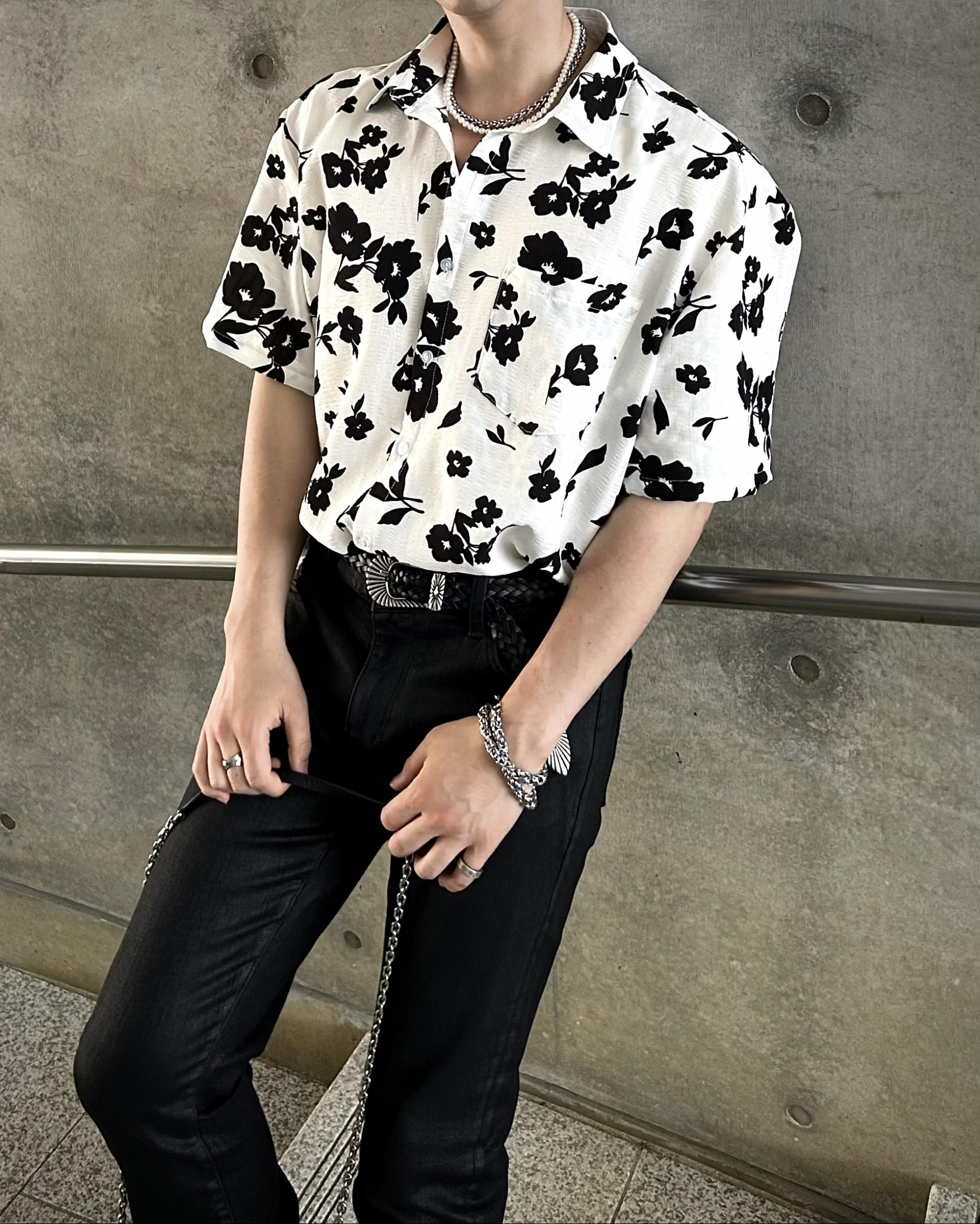 유니크한 블랙 로제 프린팅의 반팔 셔츠 입니다.