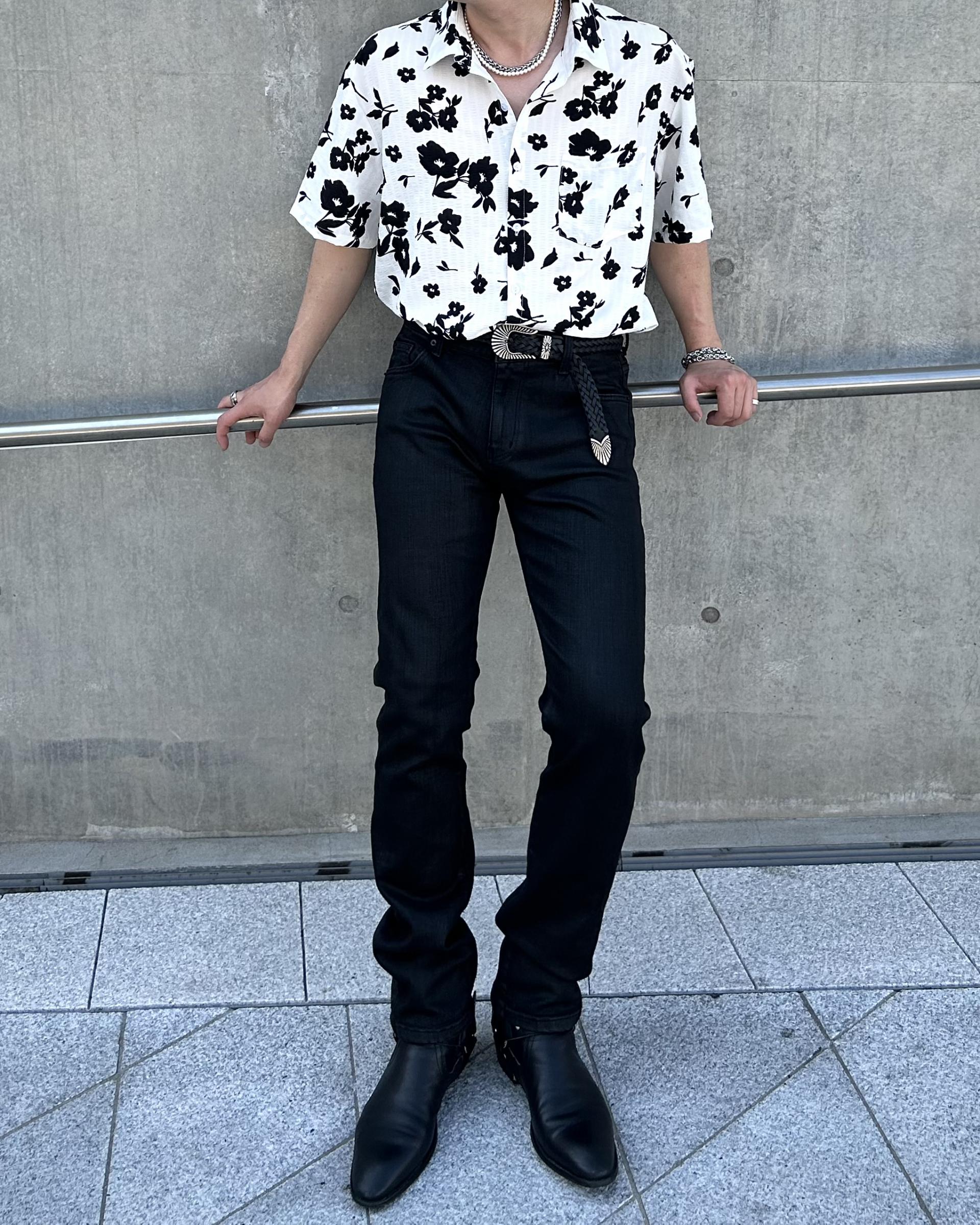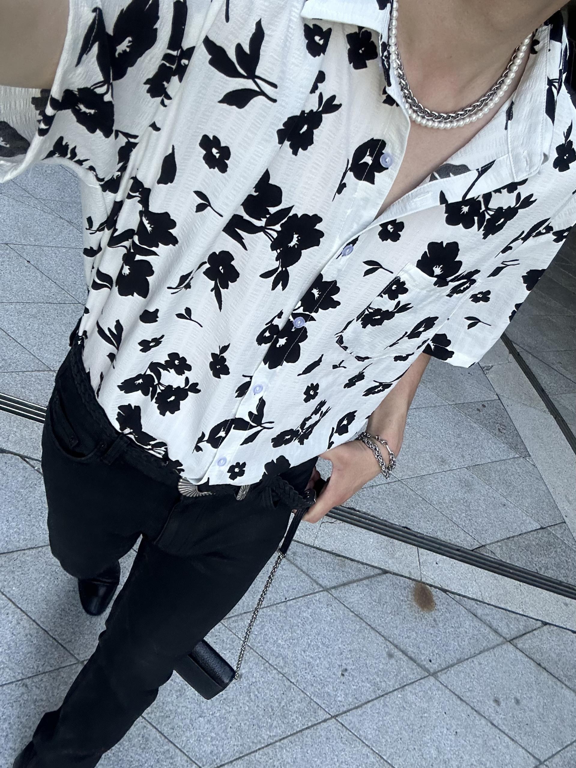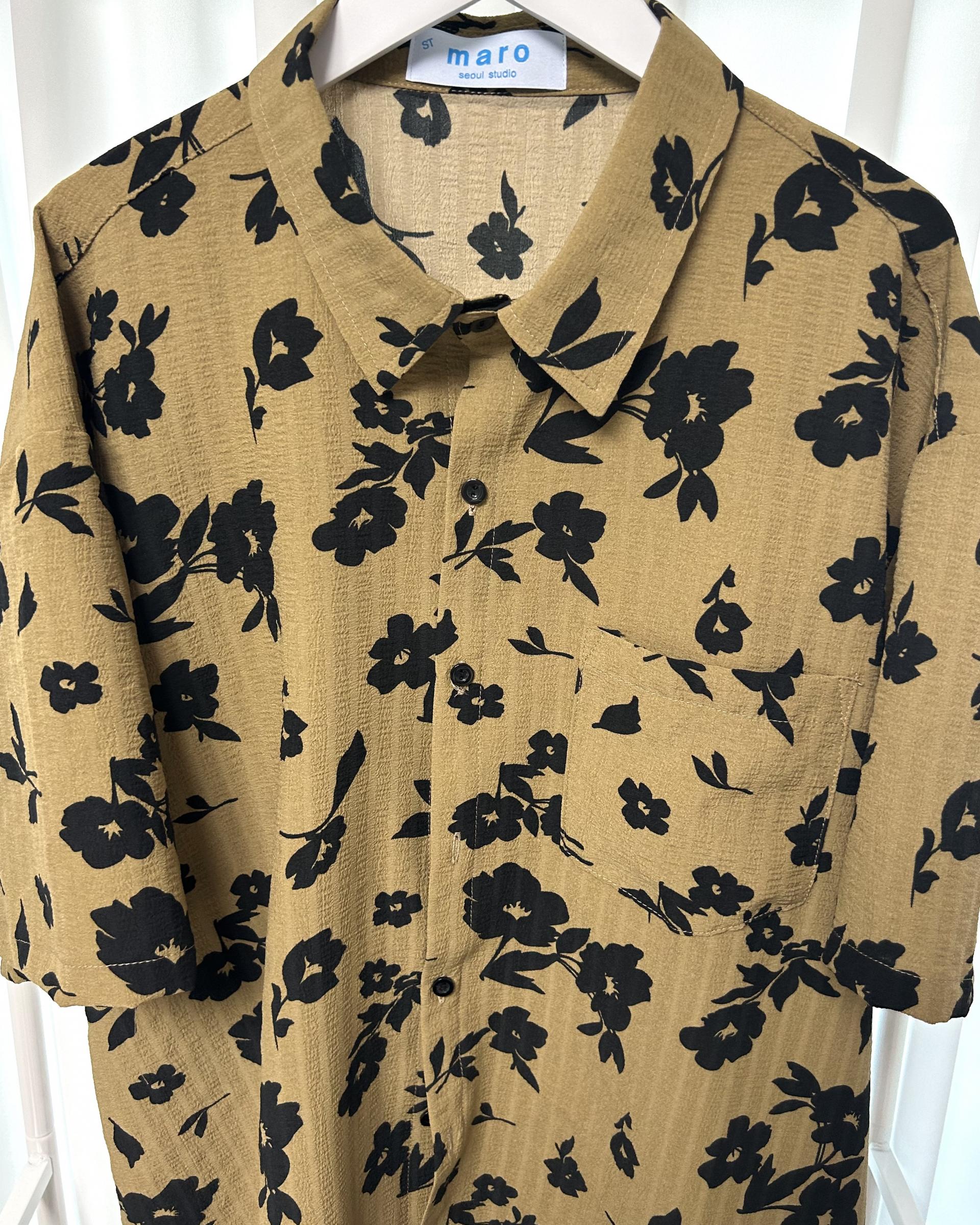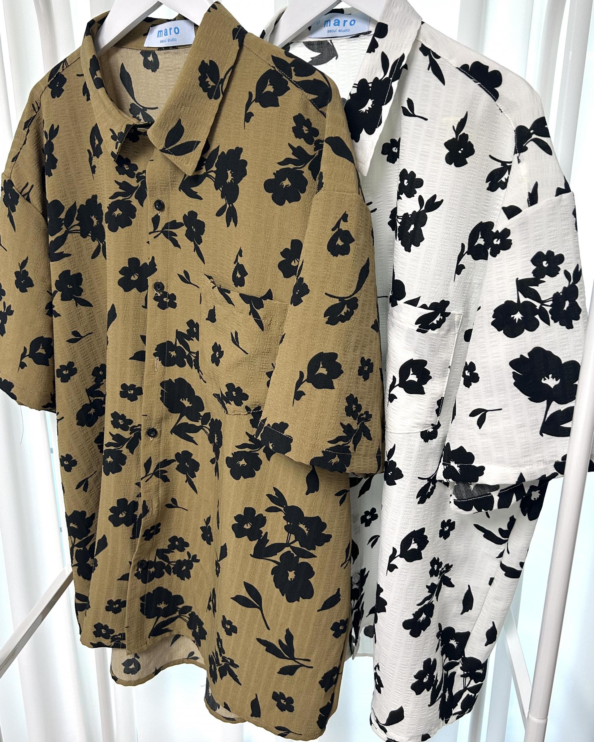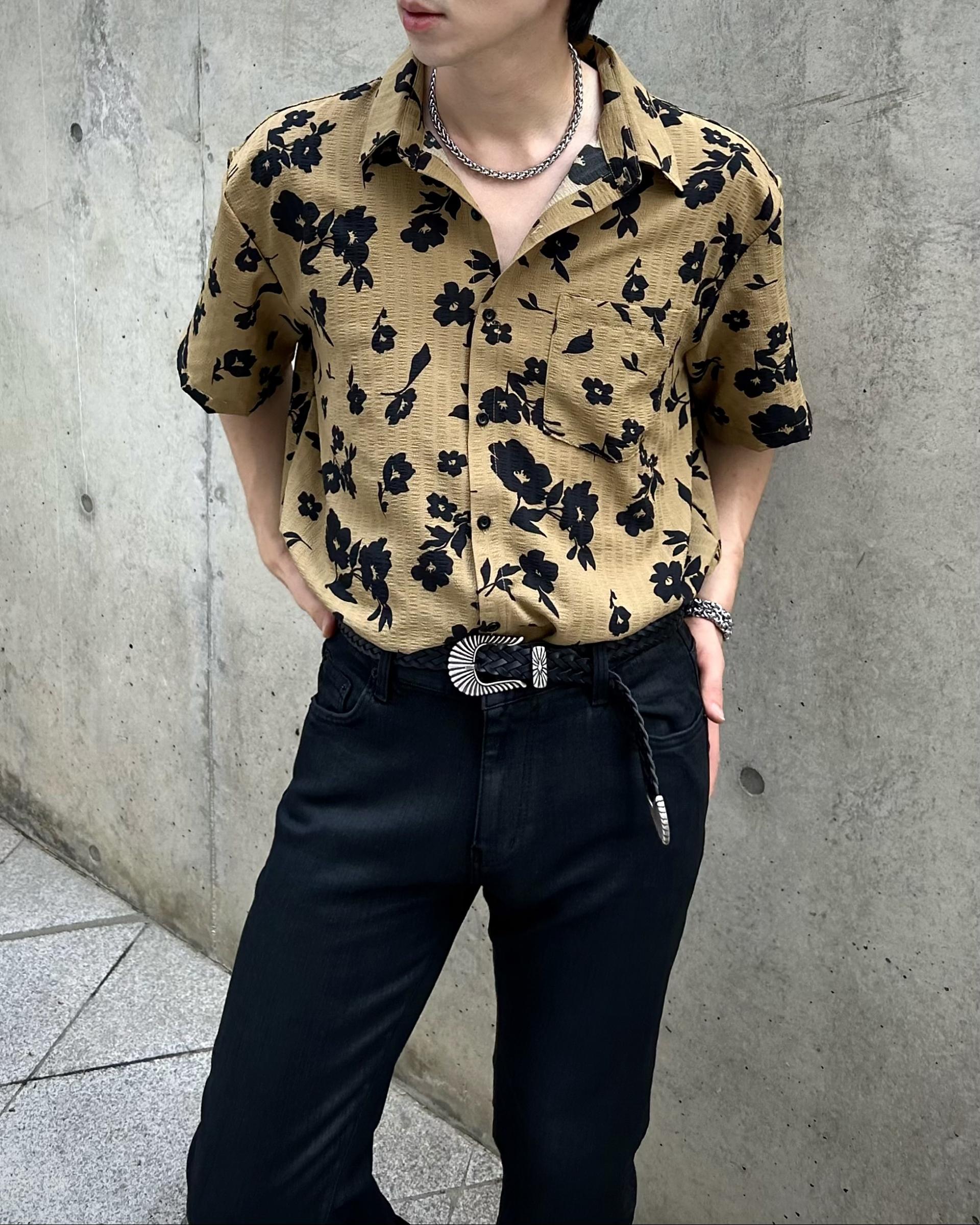 유니크한 블랙 로제 프린팅의 반팔 셔츠 입니다.