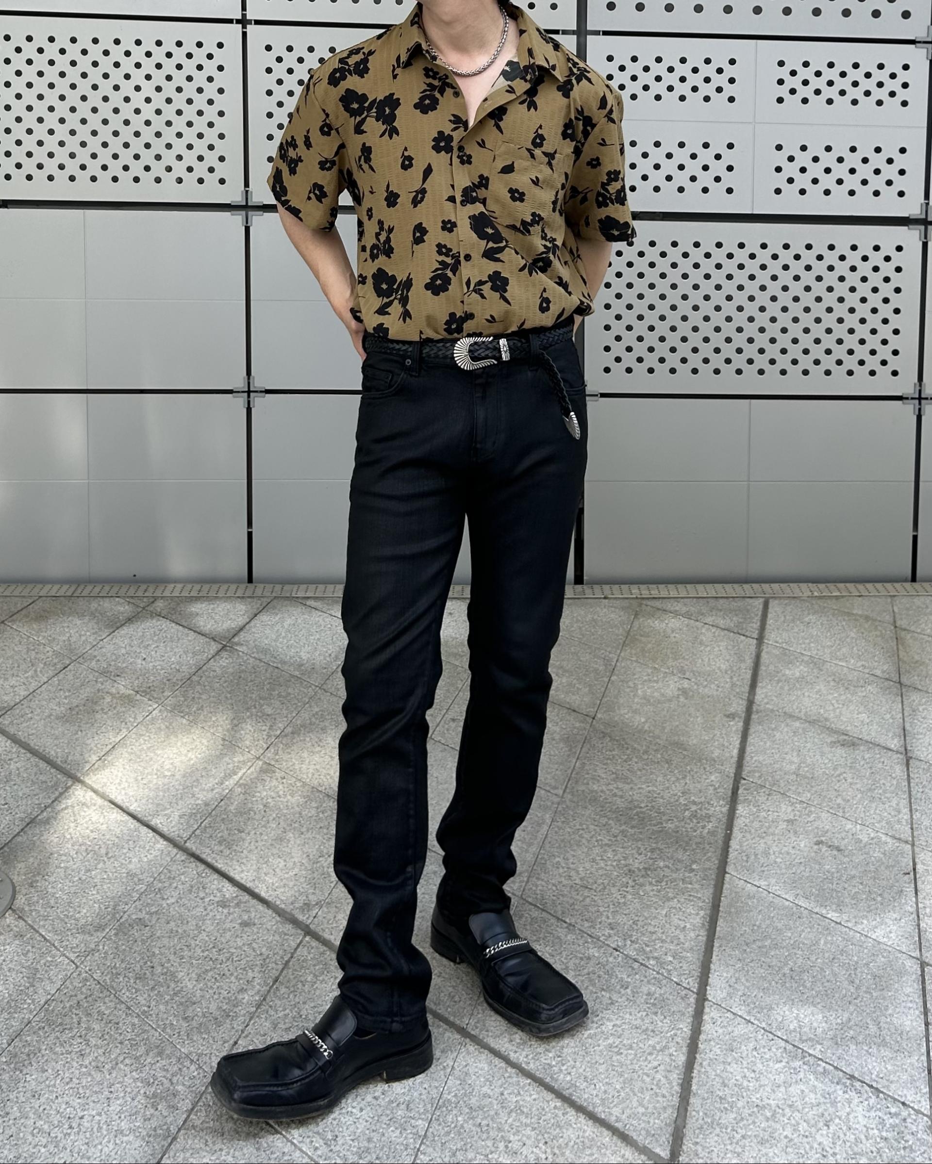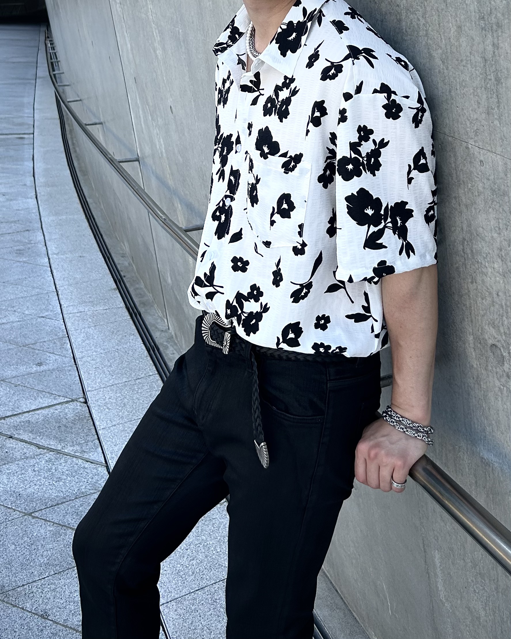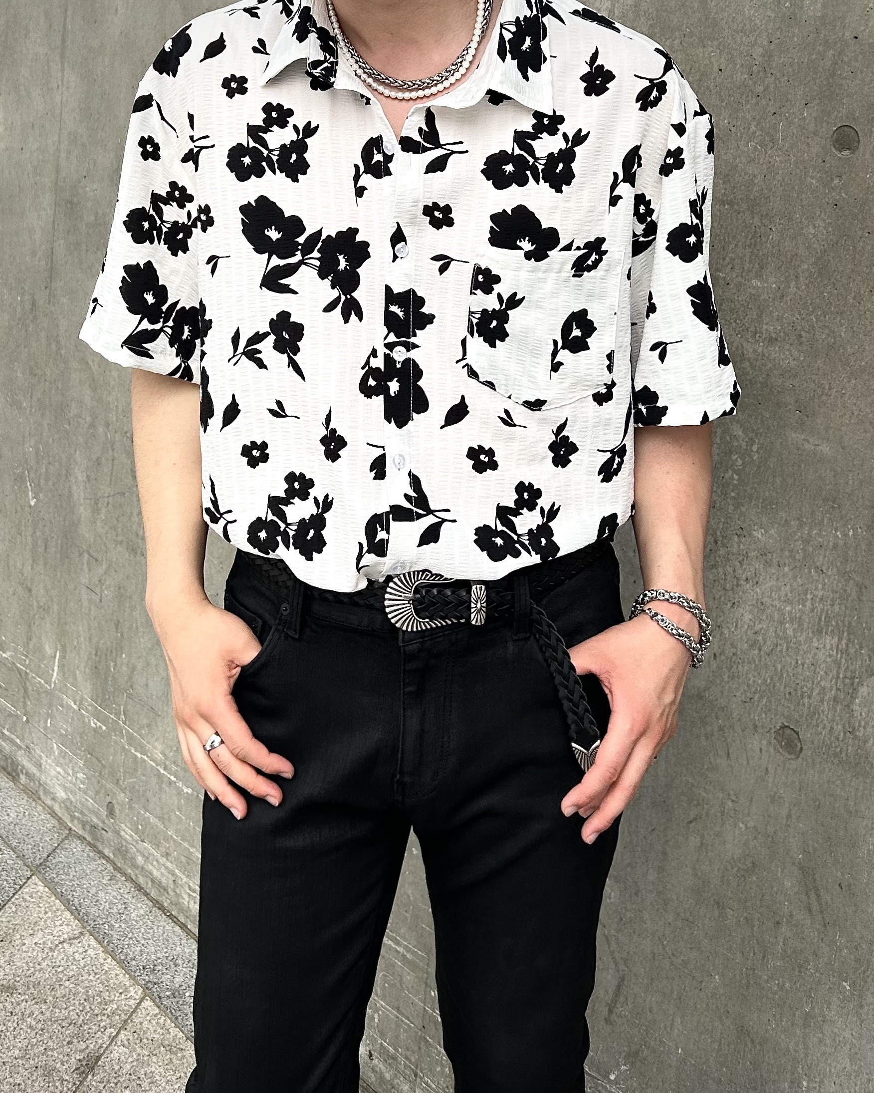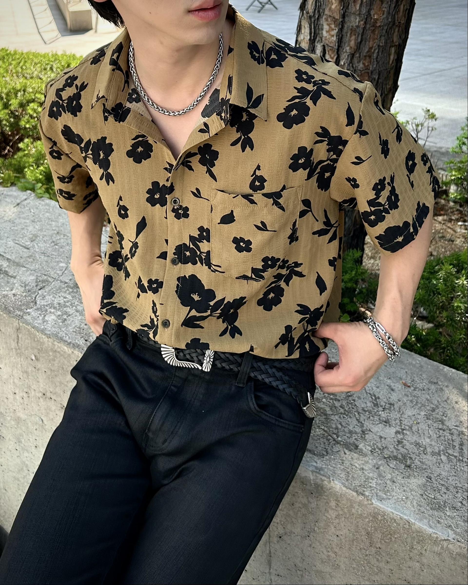 유니크한 블랙 로제 프린팅의 반팔 셔츠 입니다.