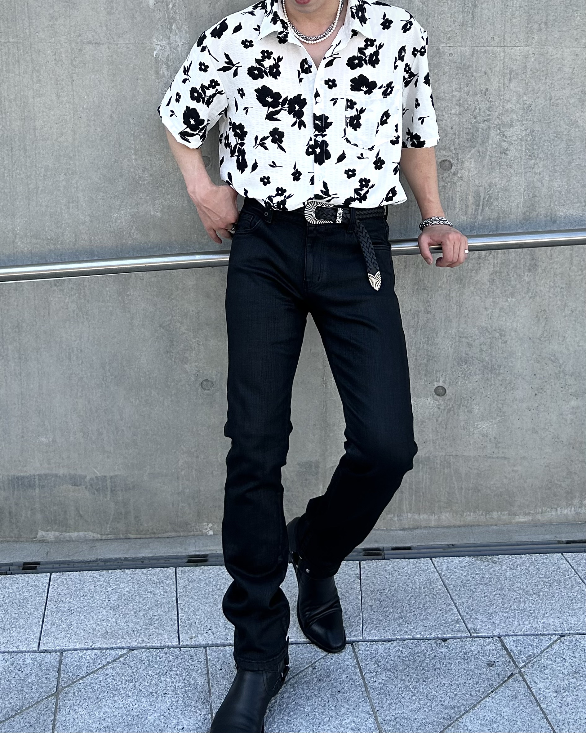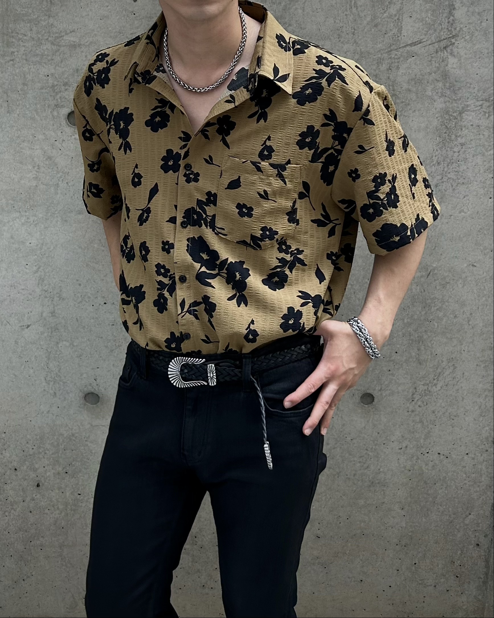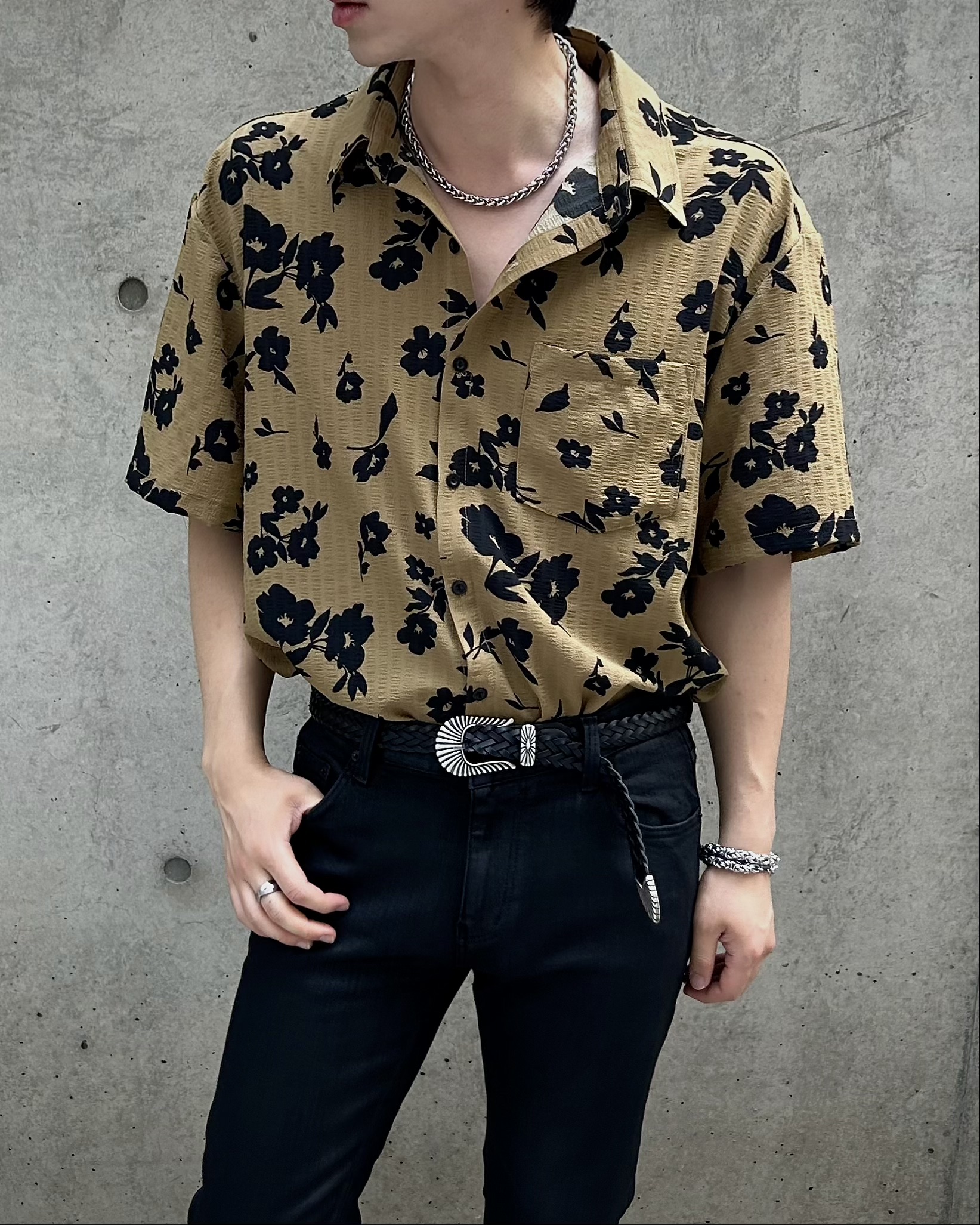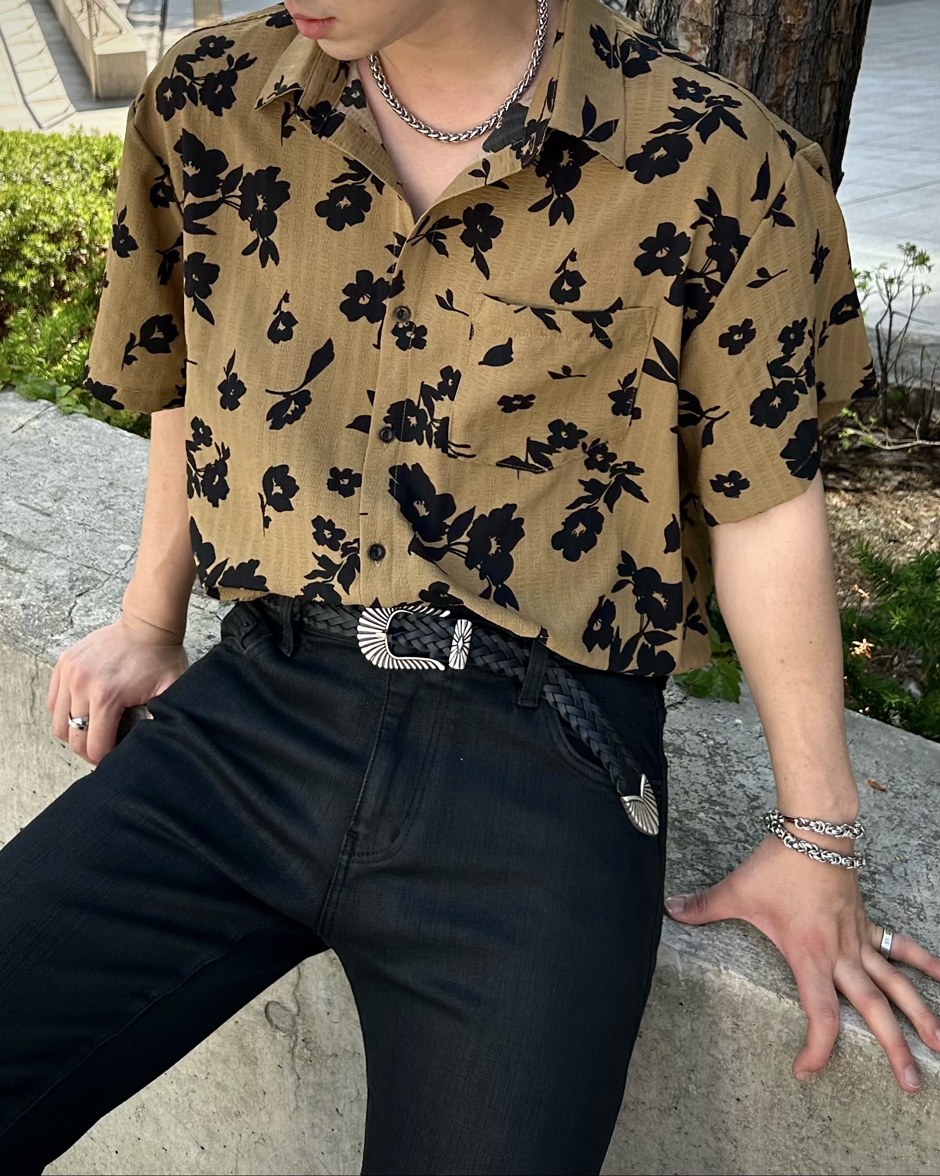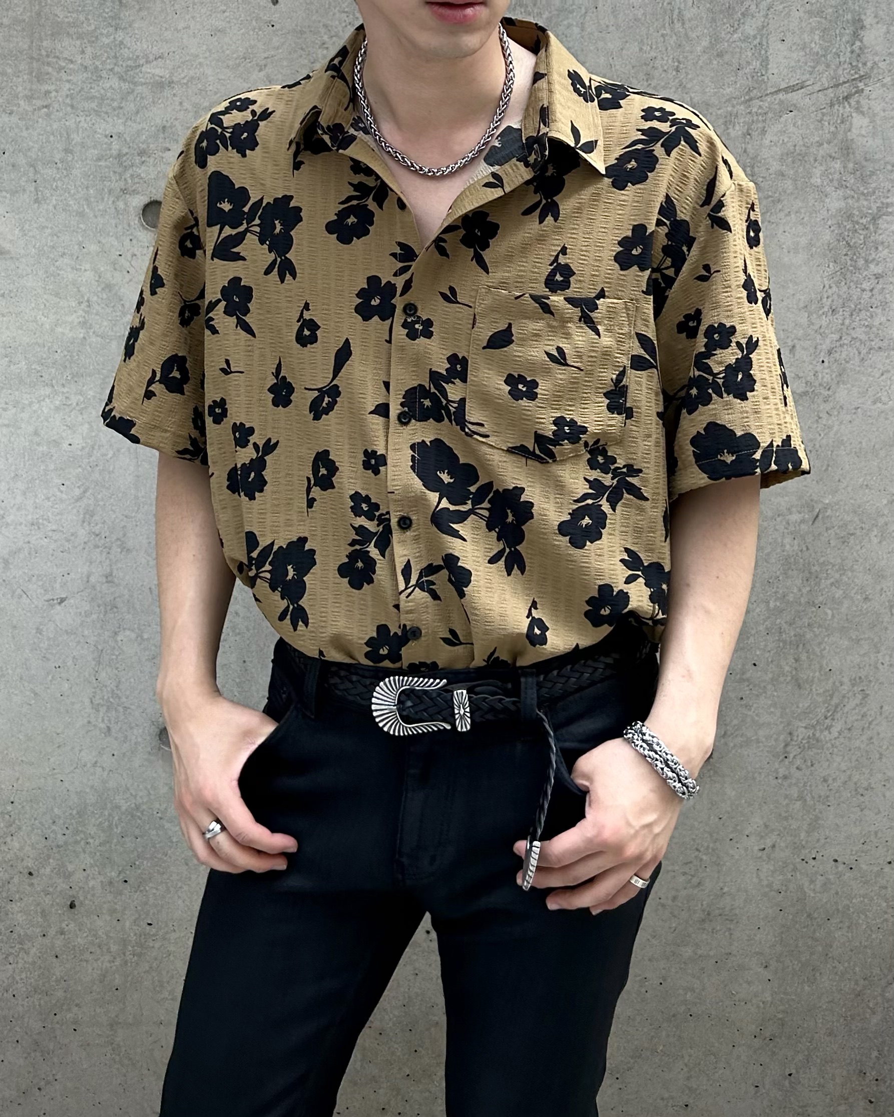 유니크한 블랙 로제 프린팅의 반팔 셔츠 입니다.