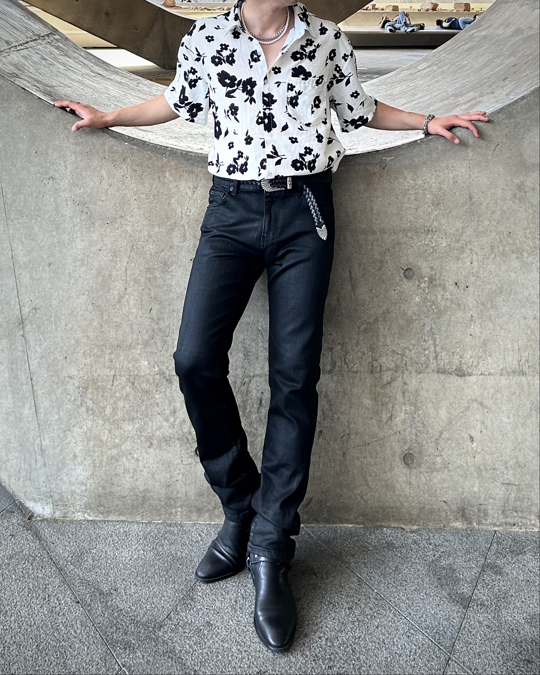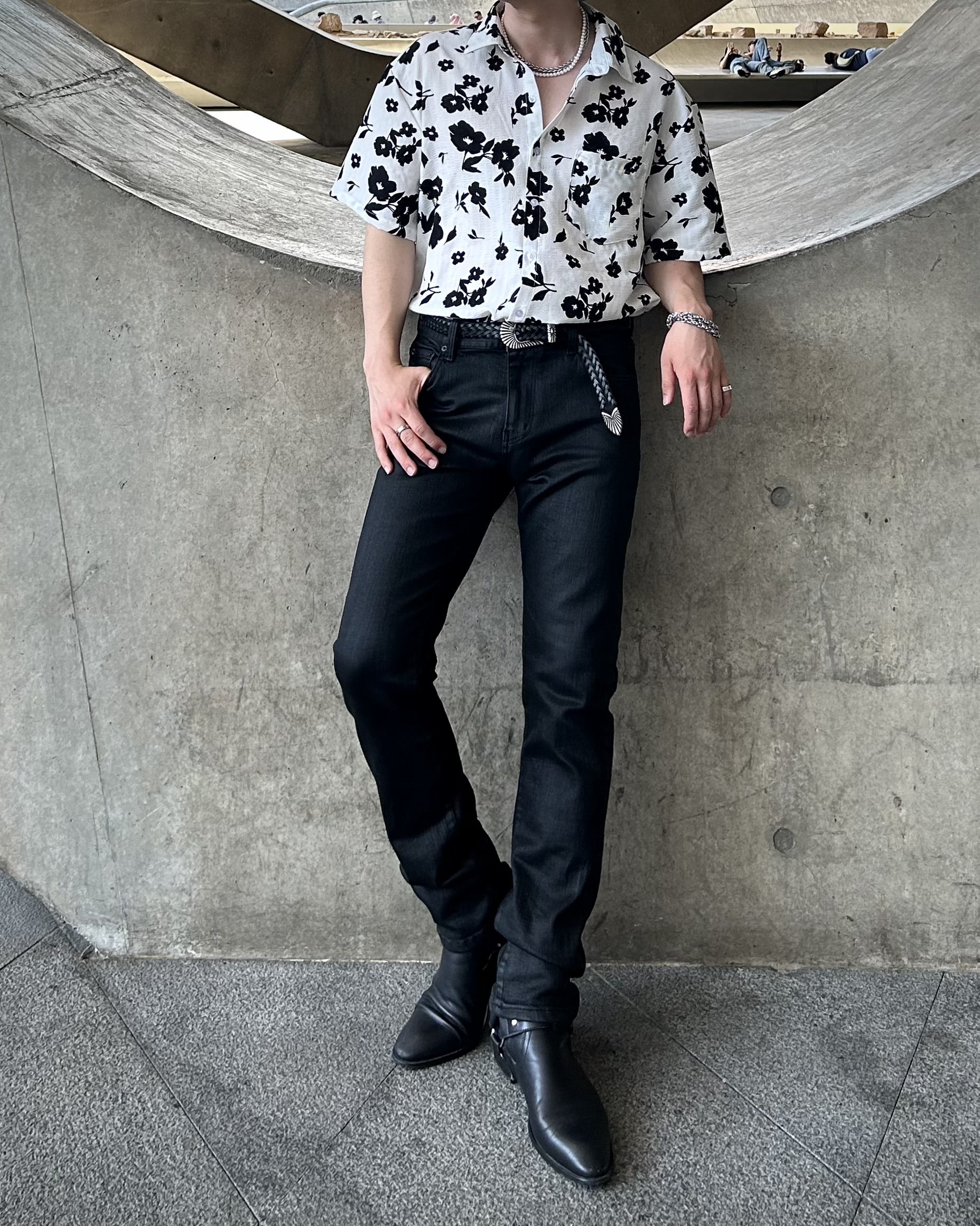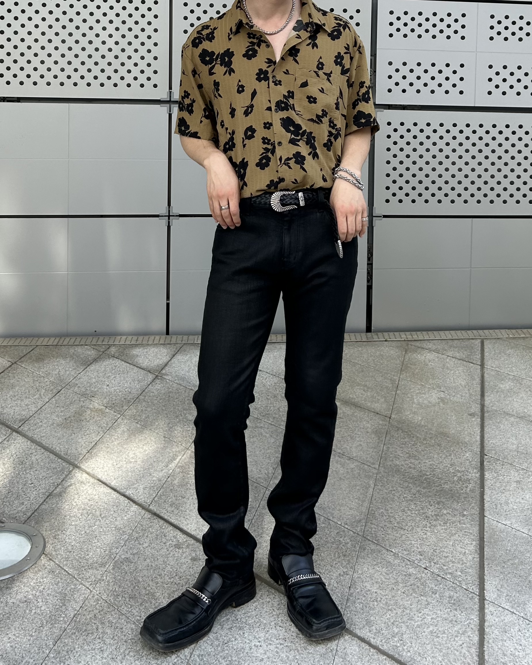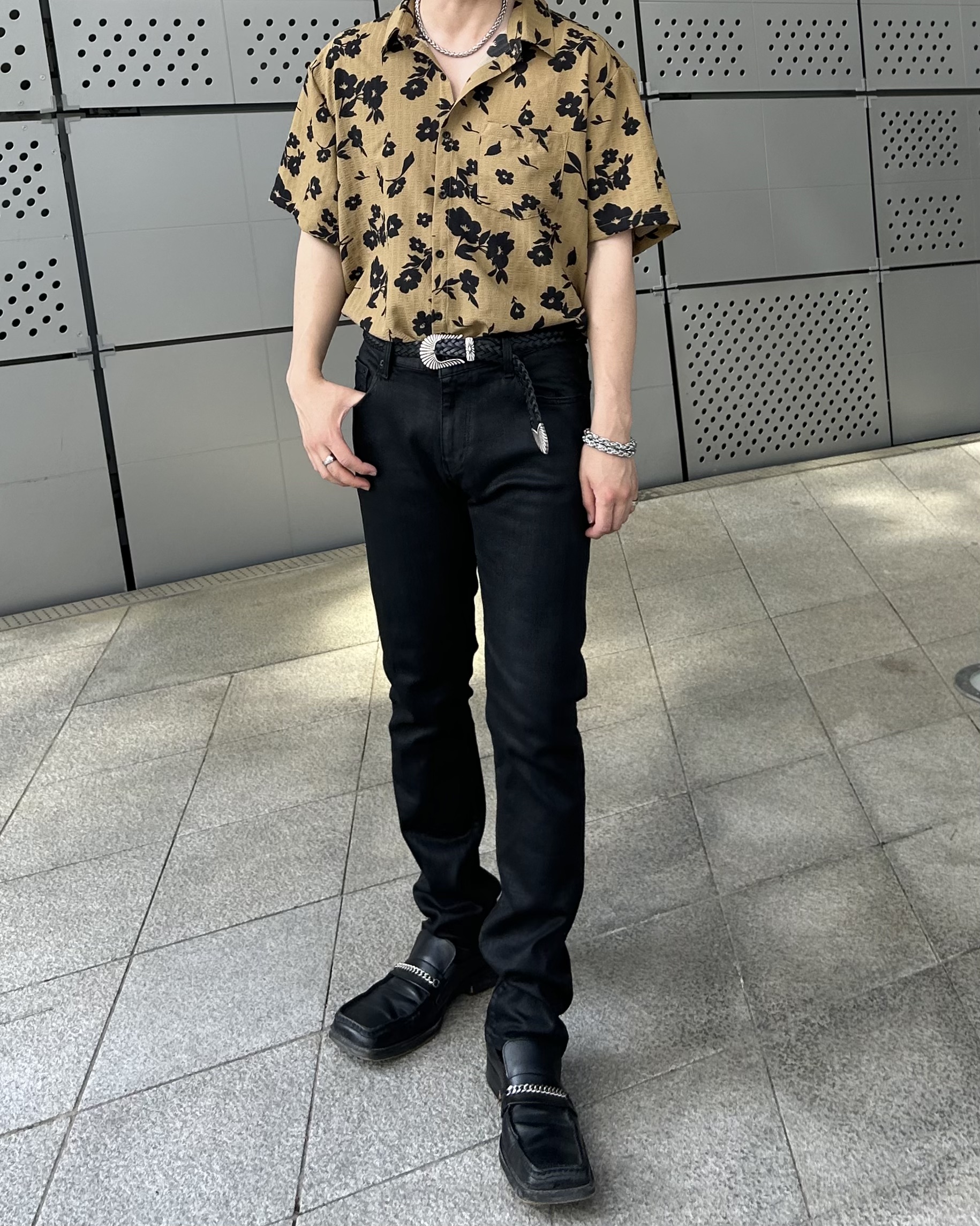 유니크한 블랙 로제 프린팅의 반팔 셔츠 입니다.