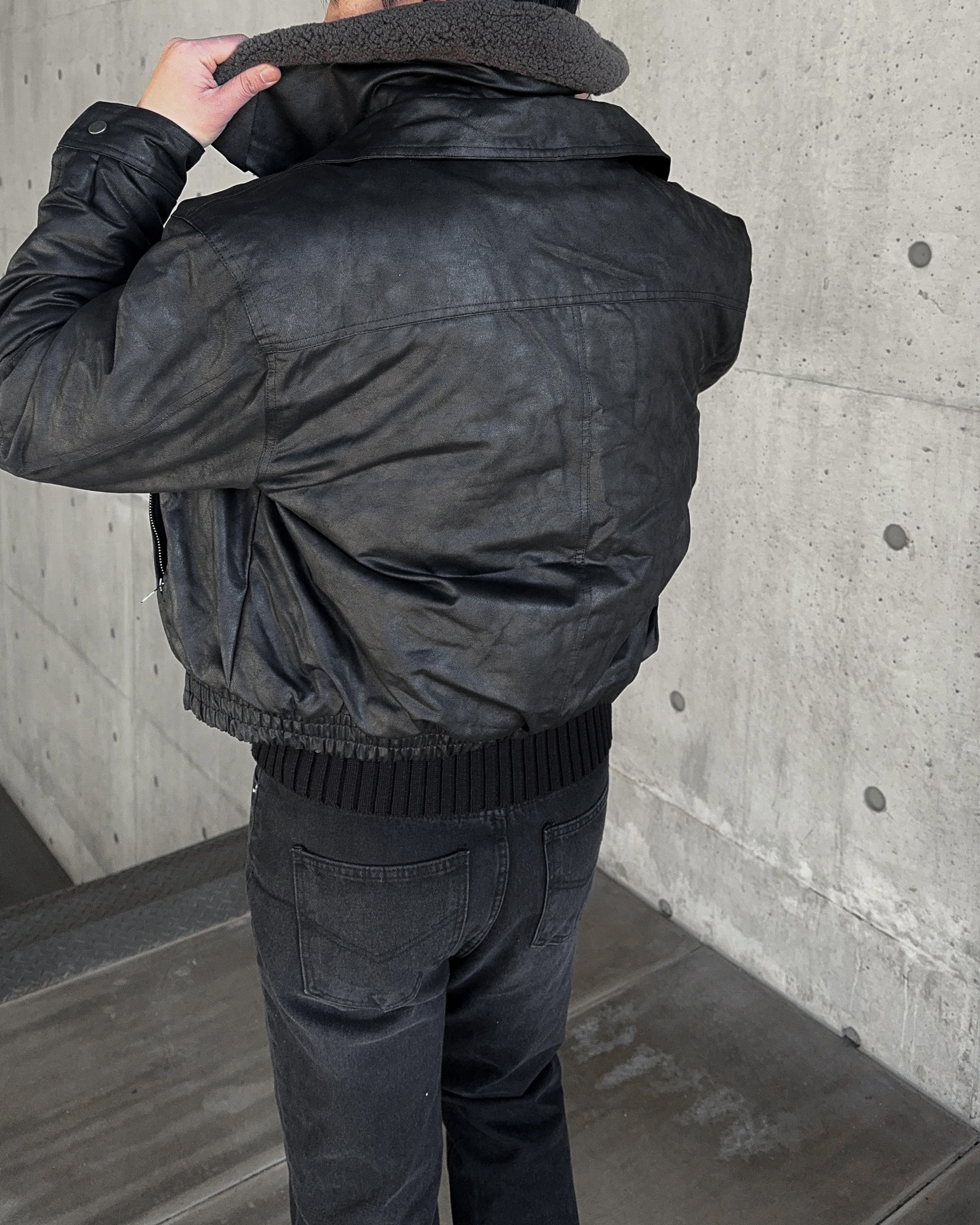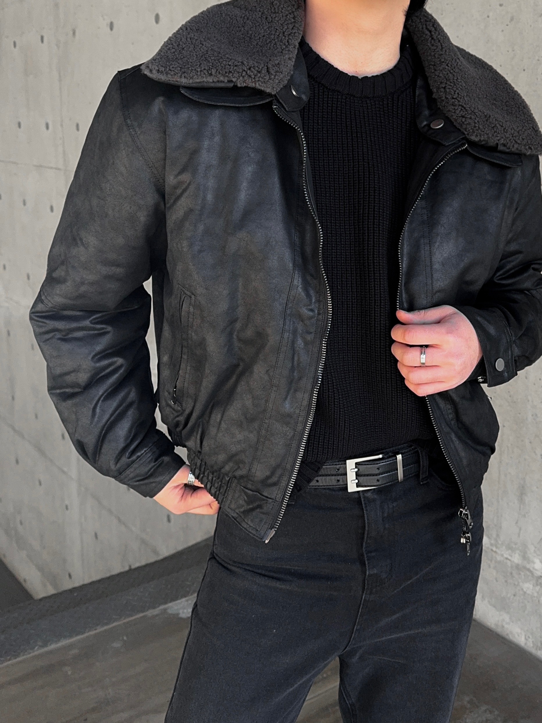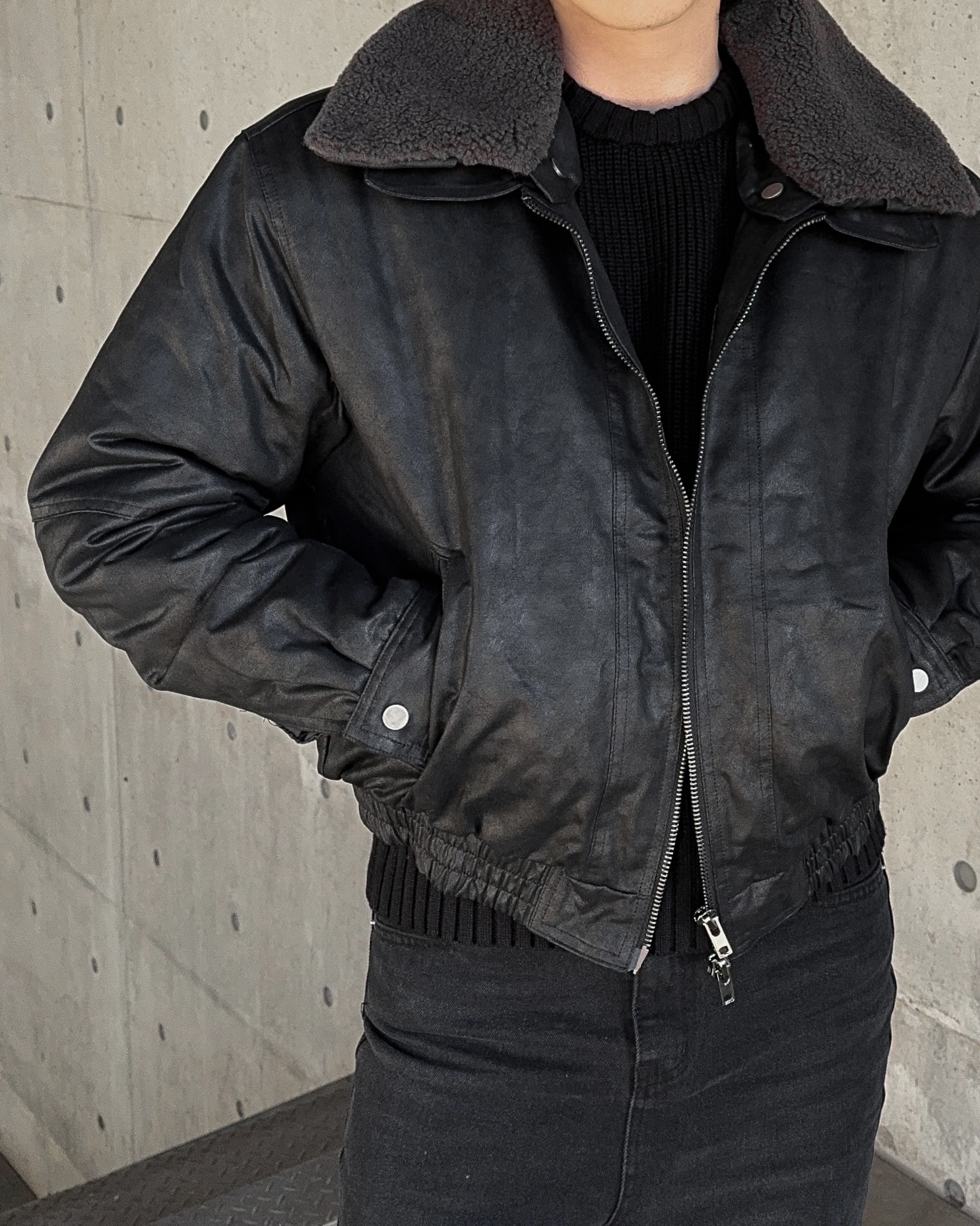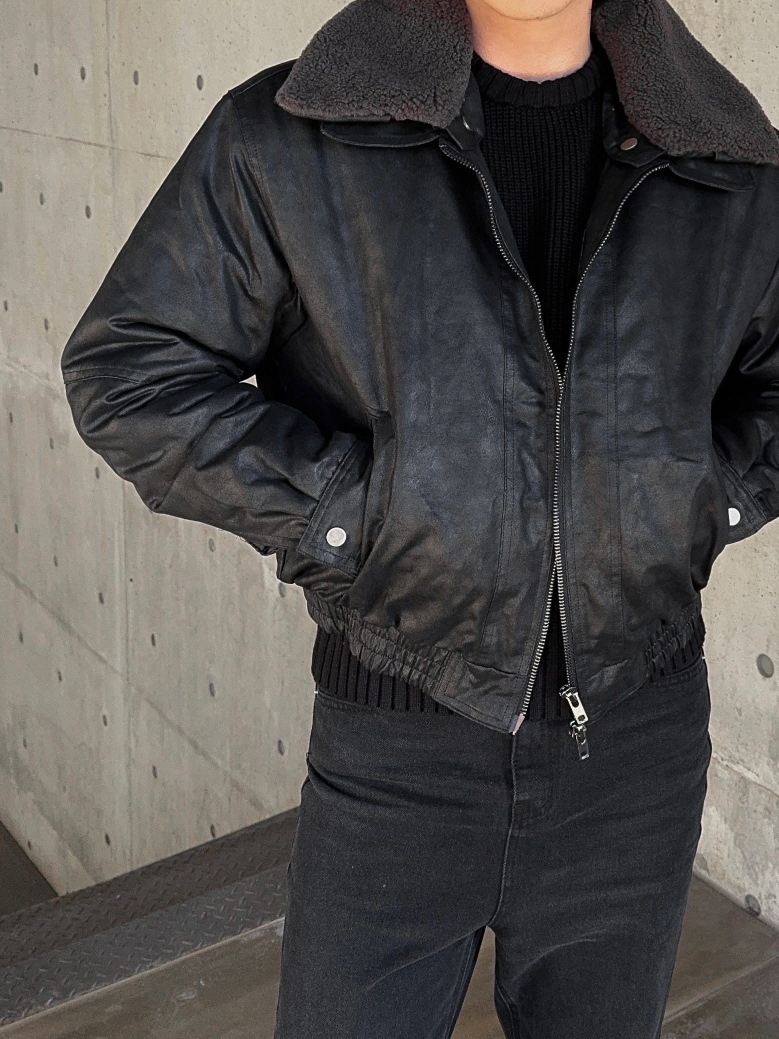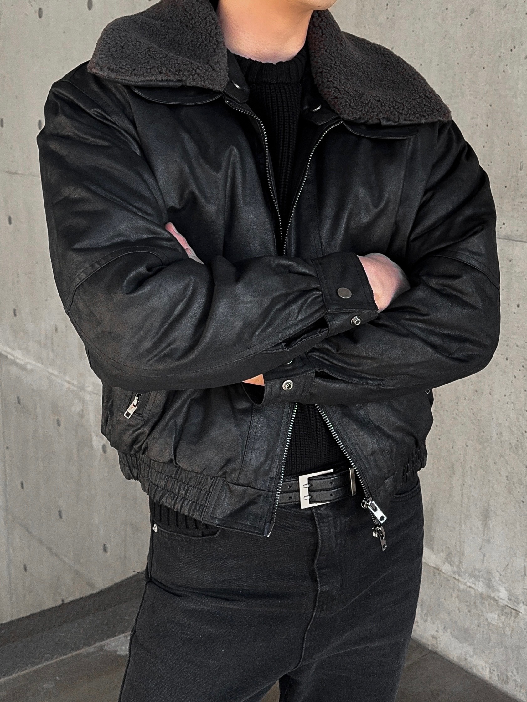 -크랙 워싱감의 레더로 제작된 무스탕