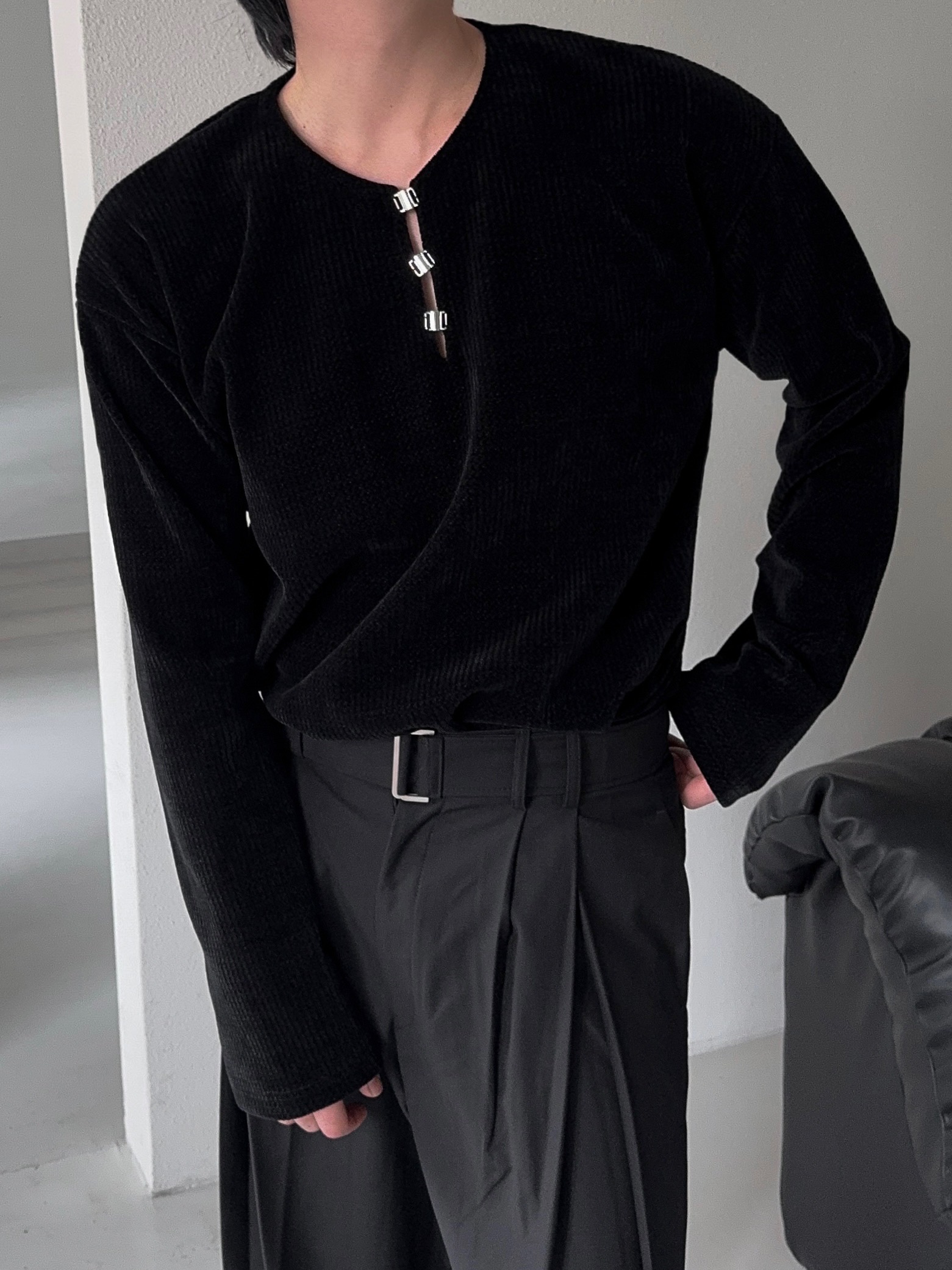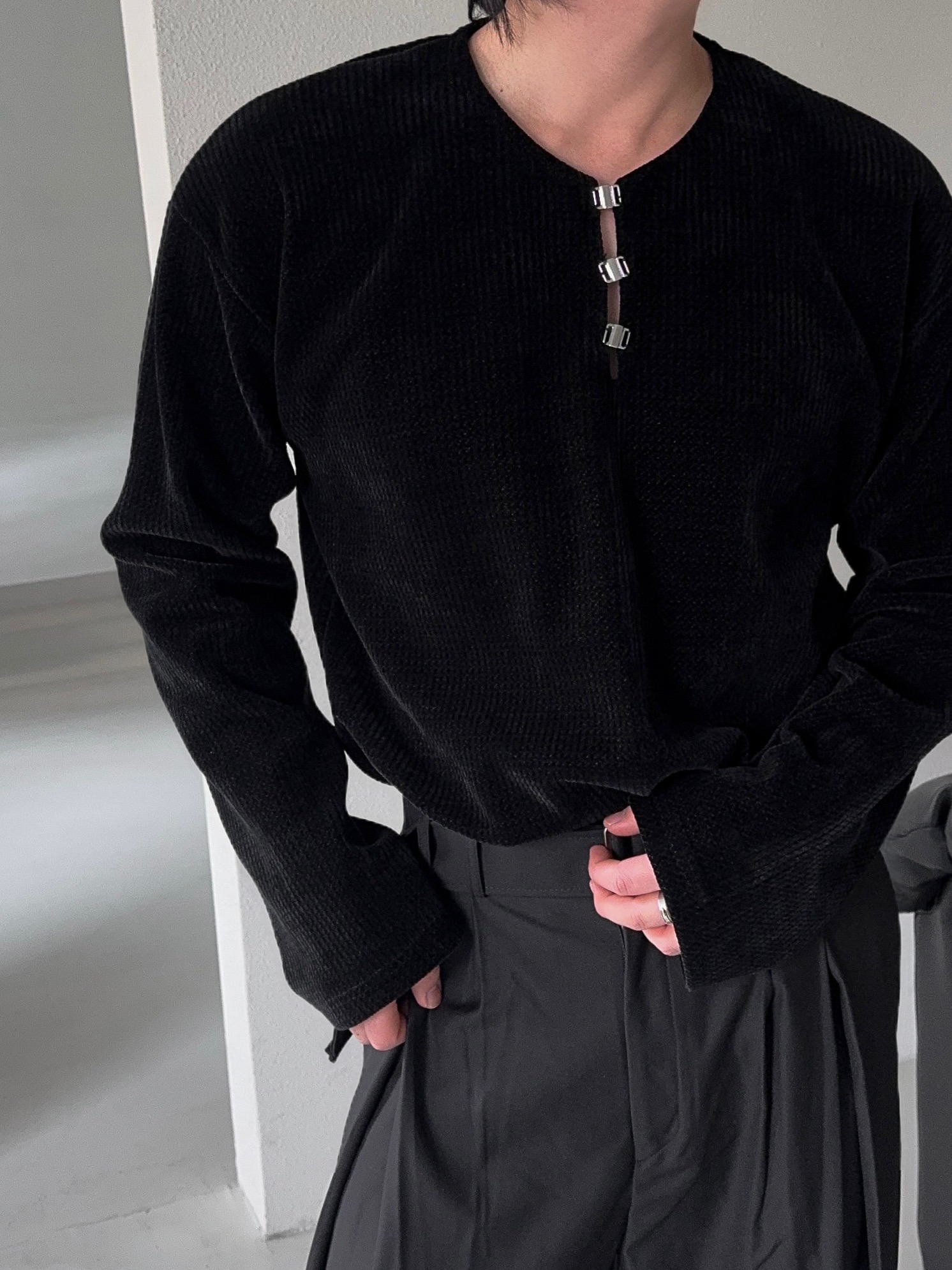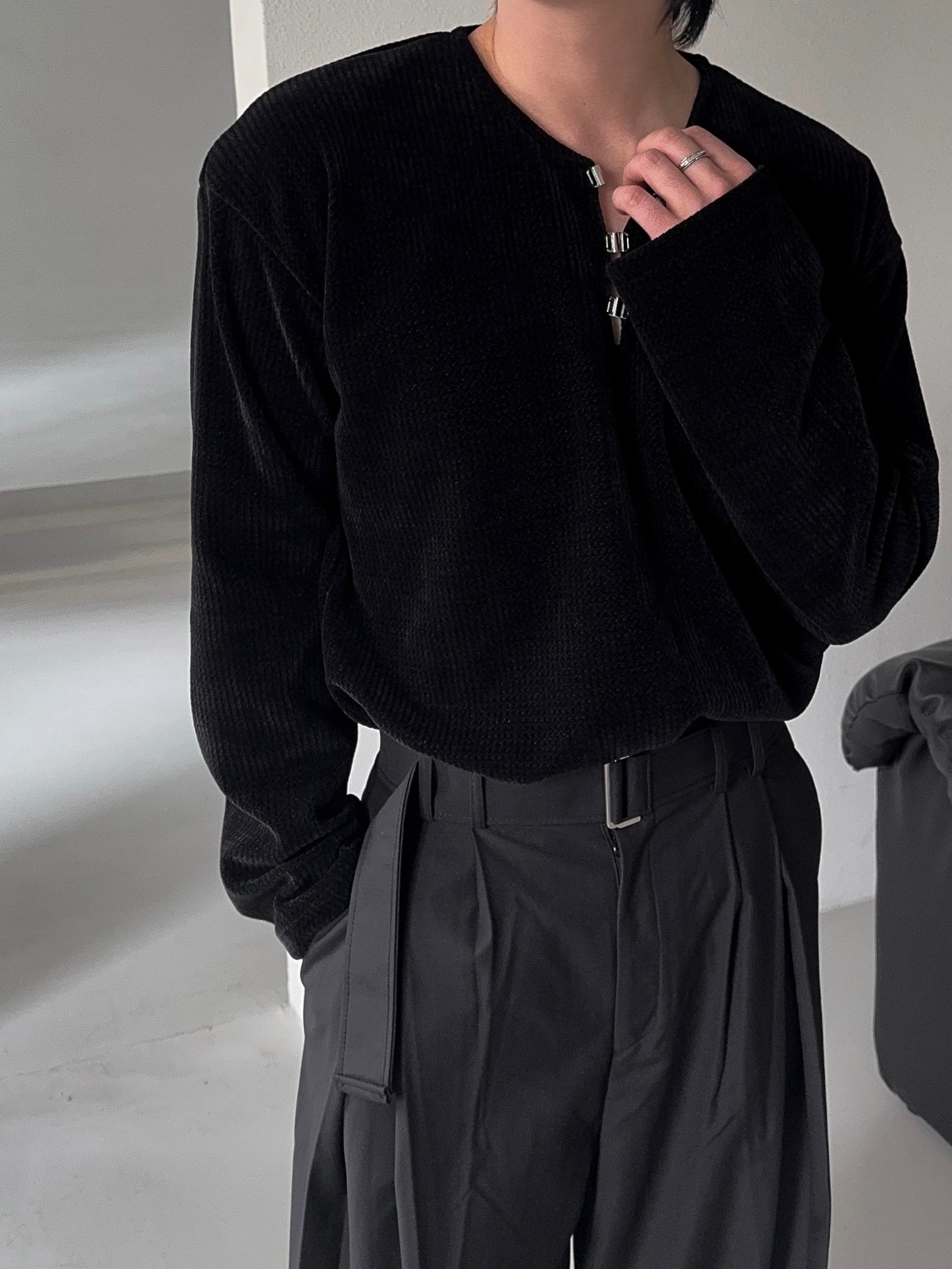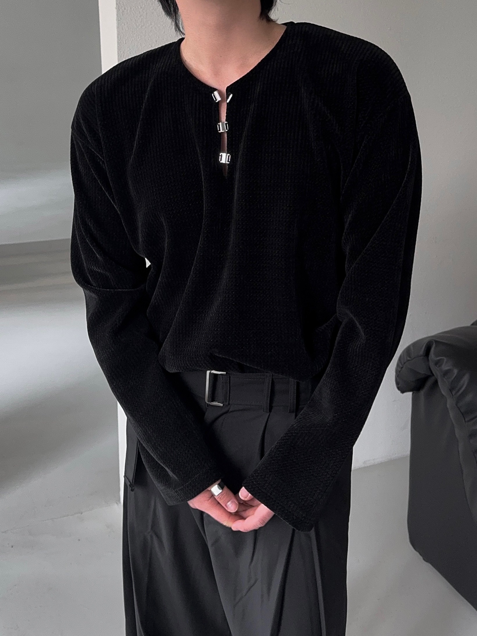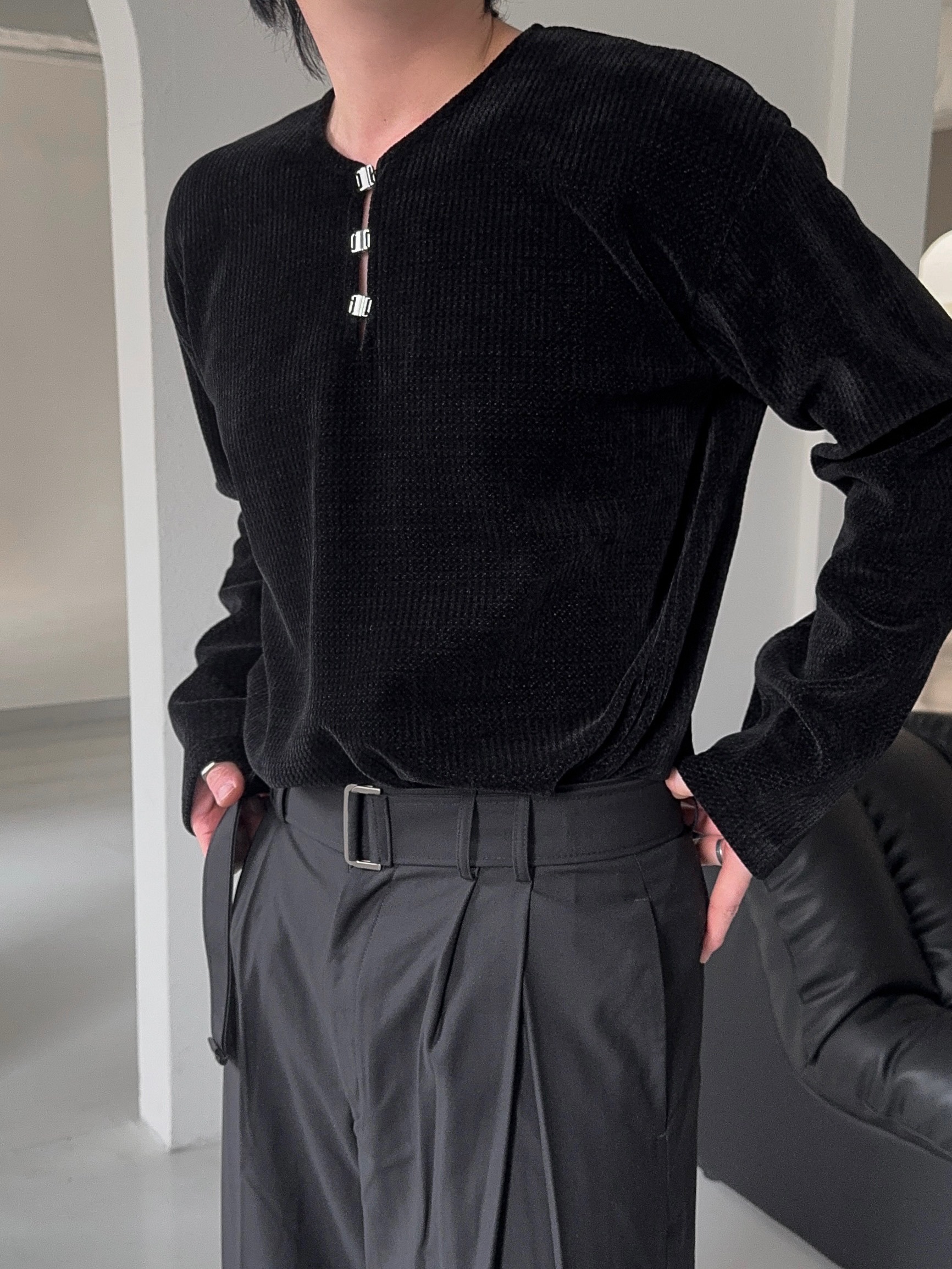 -부드러운 벨로아 소재로 제작된 후크 헨리넥 티셔츠