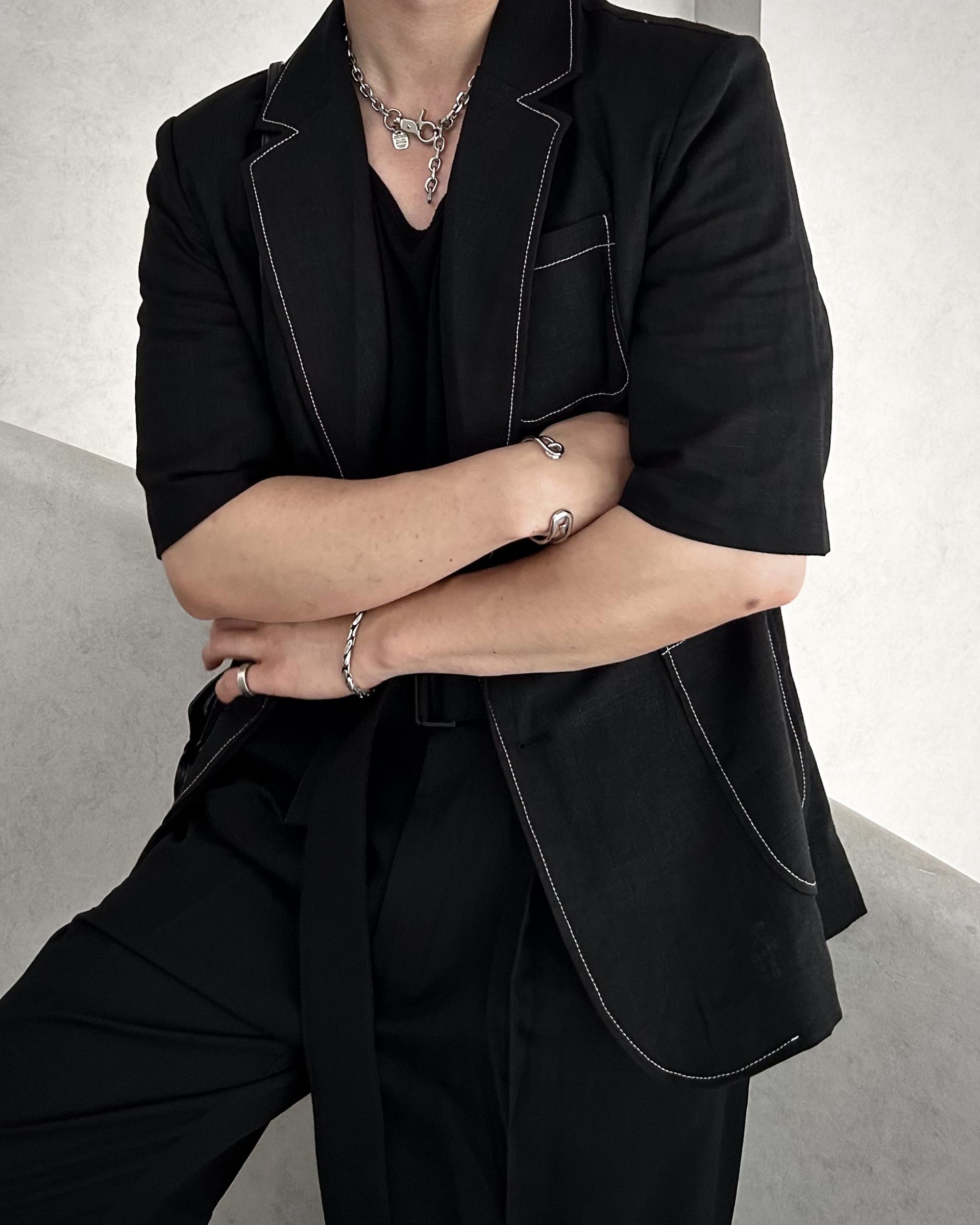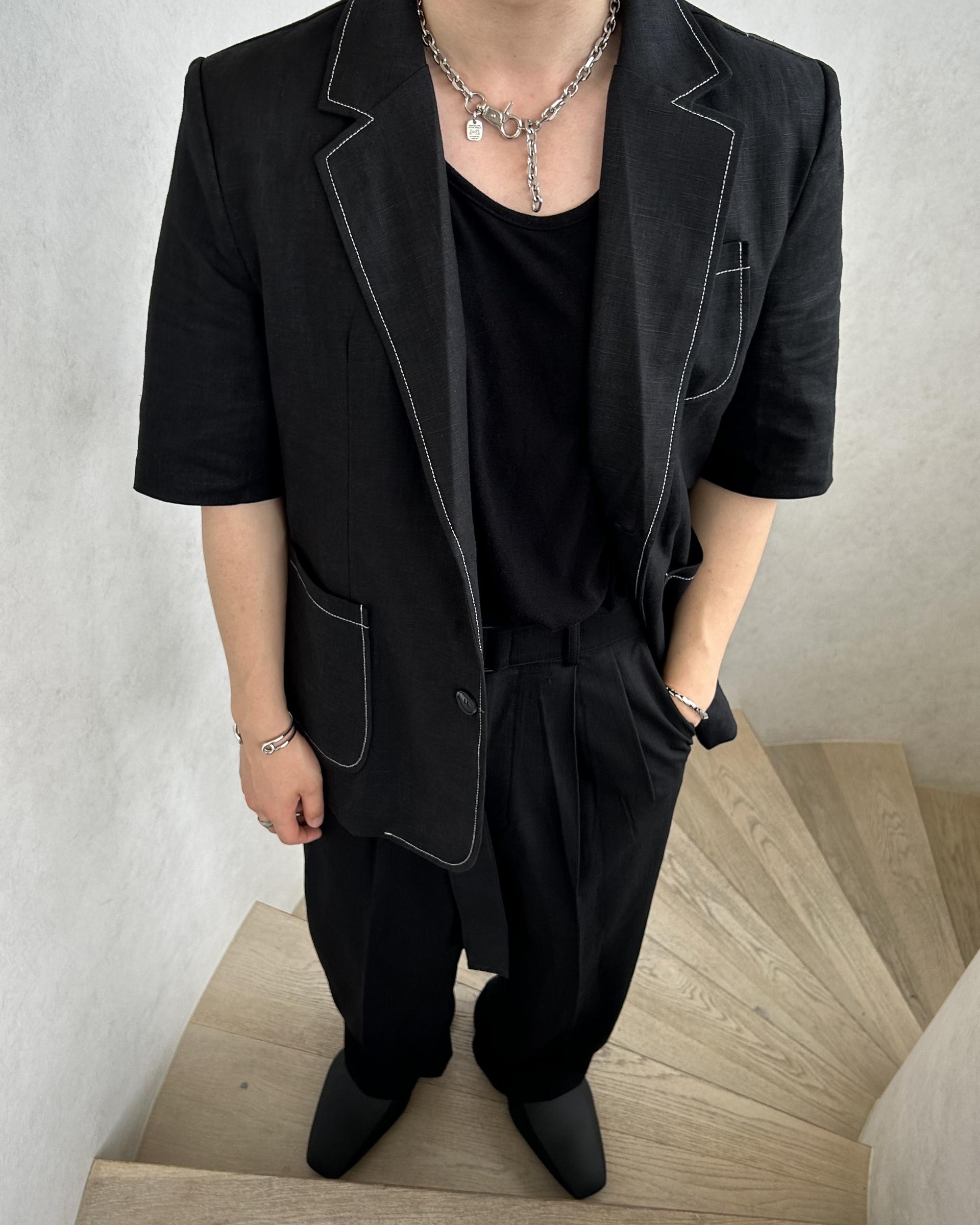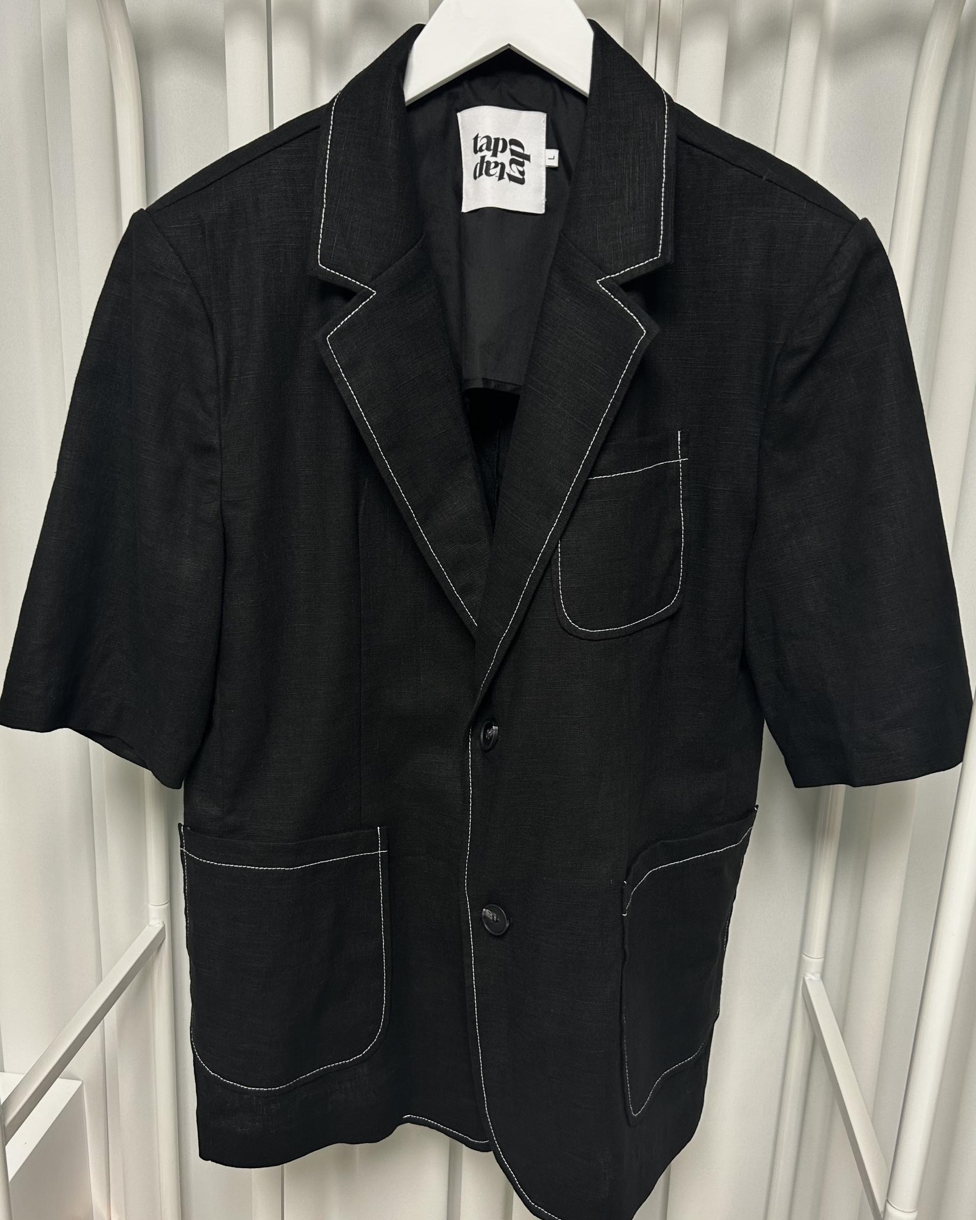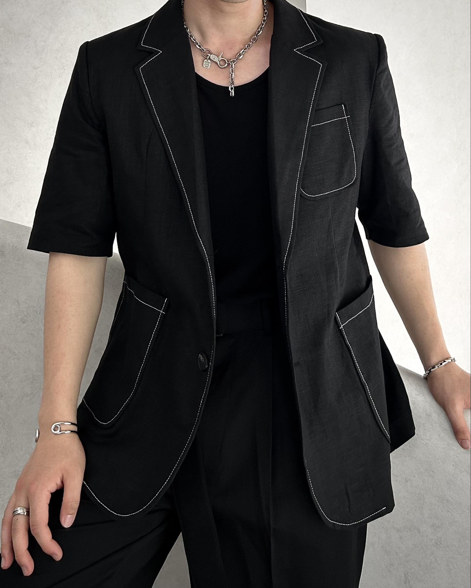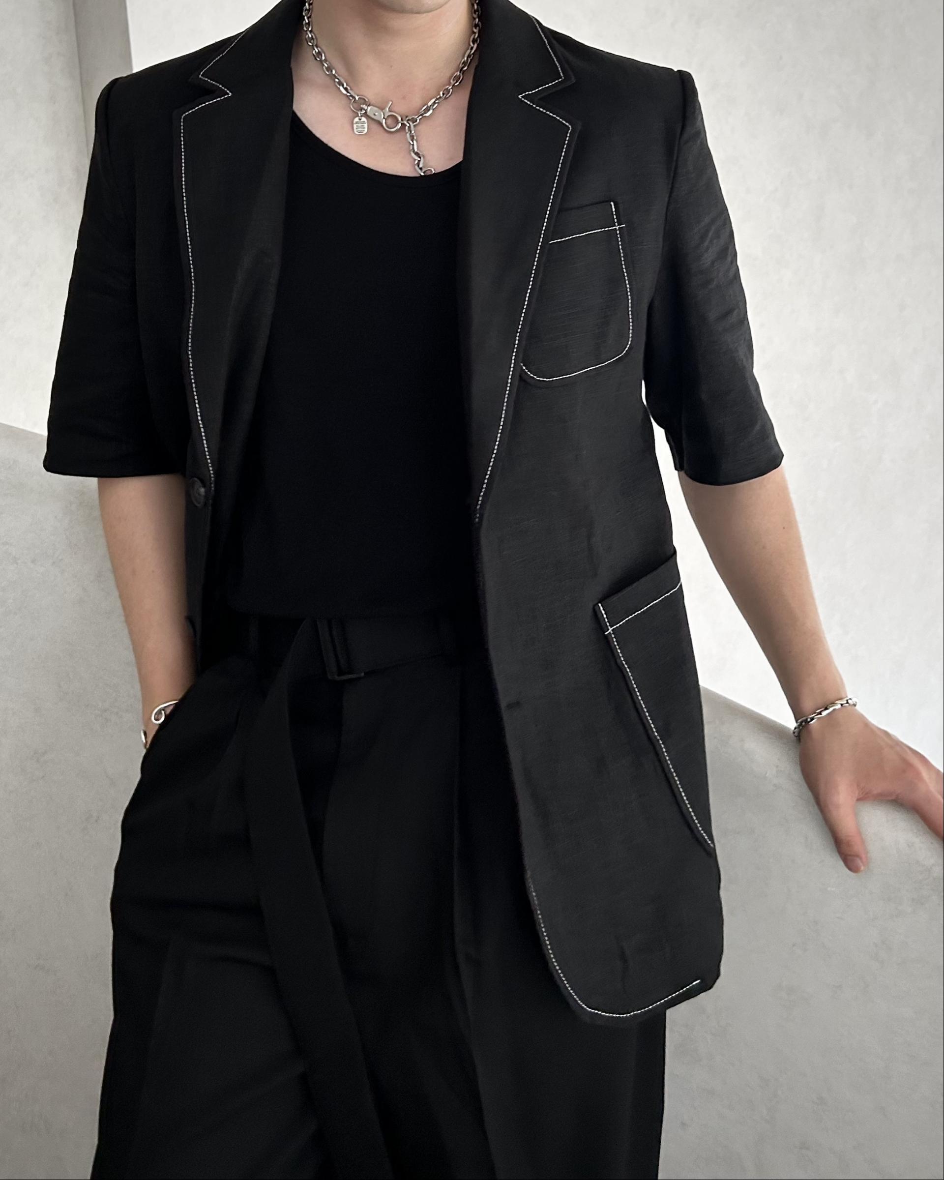 스티치 라인의 디테일이 들어간 린넨 반팔 자켓 입니다.
