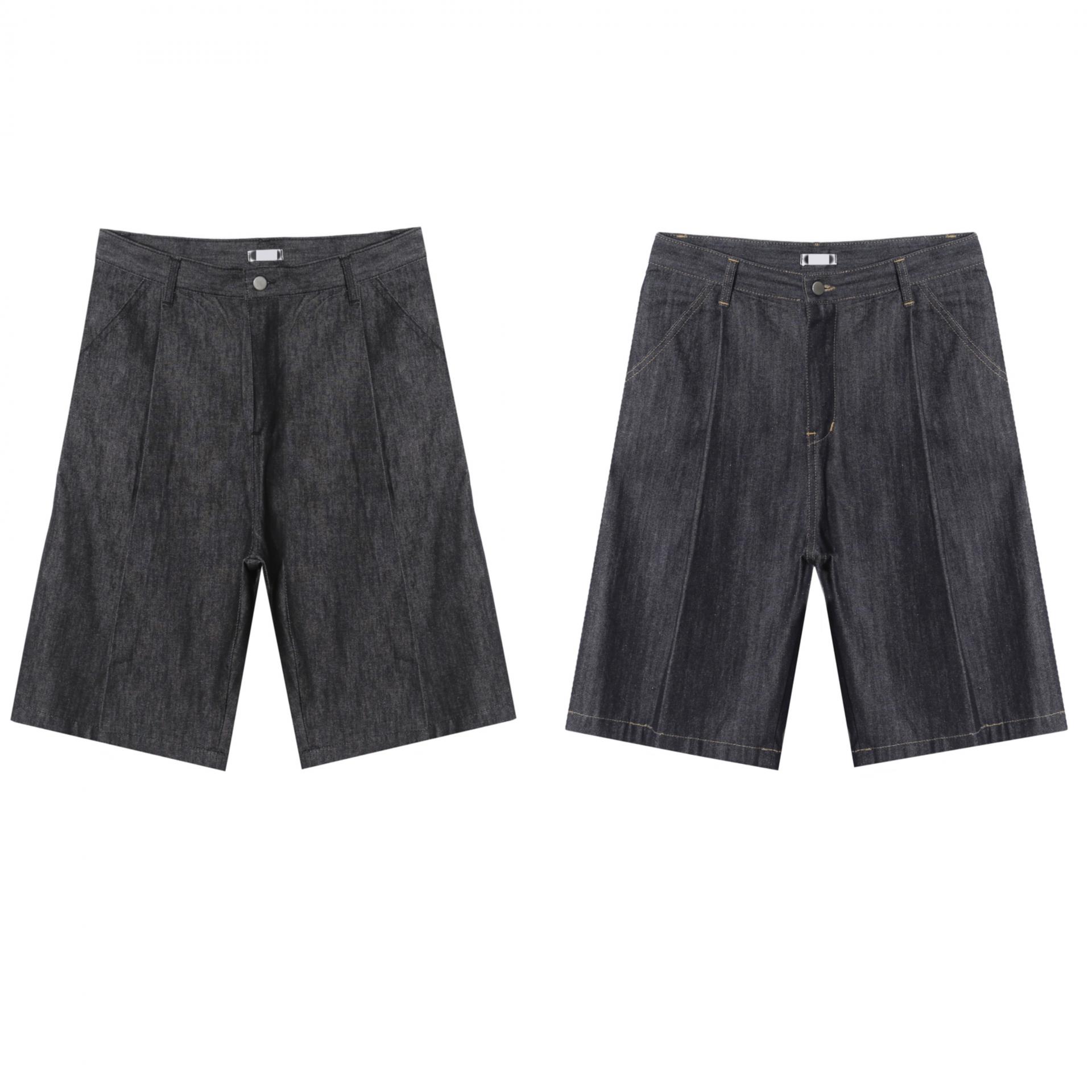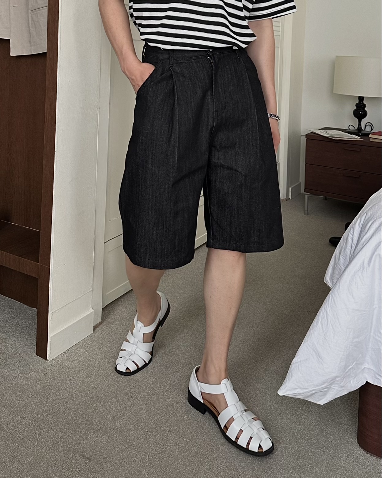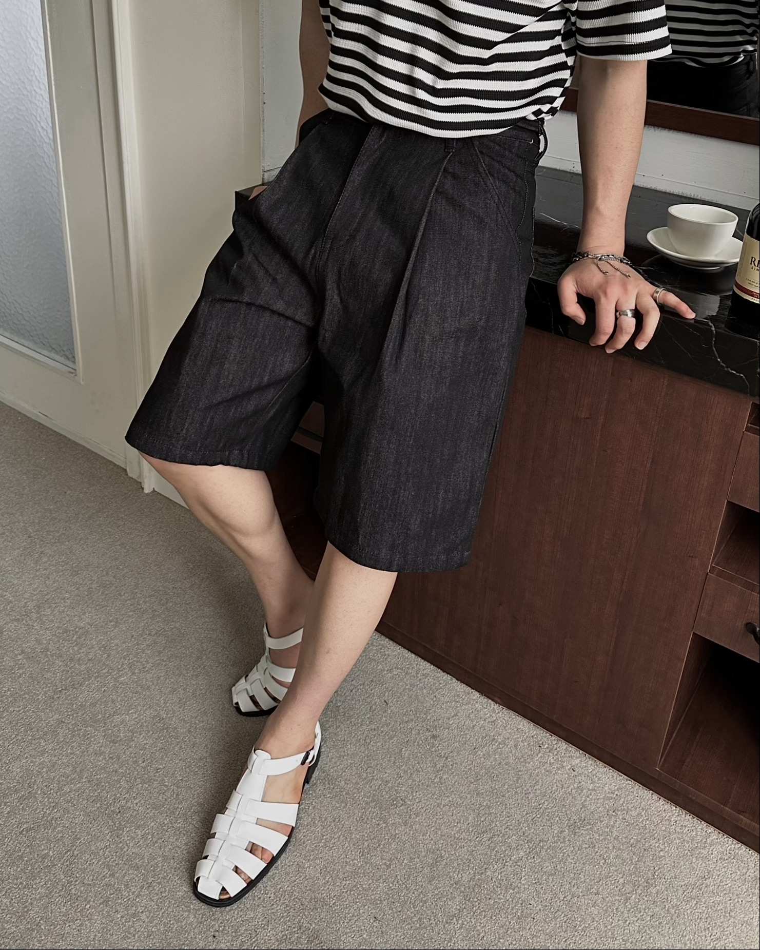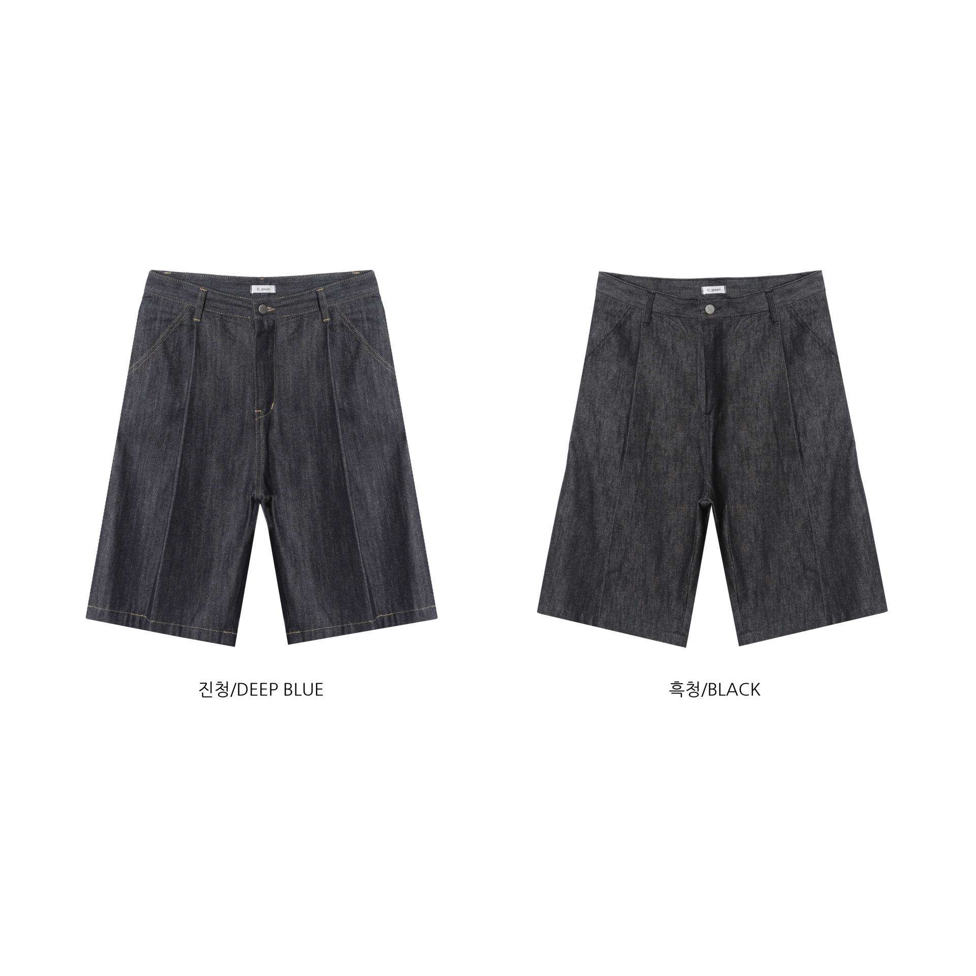 -탄탄한 데님 원단으로 제작된 하프 팬츠
