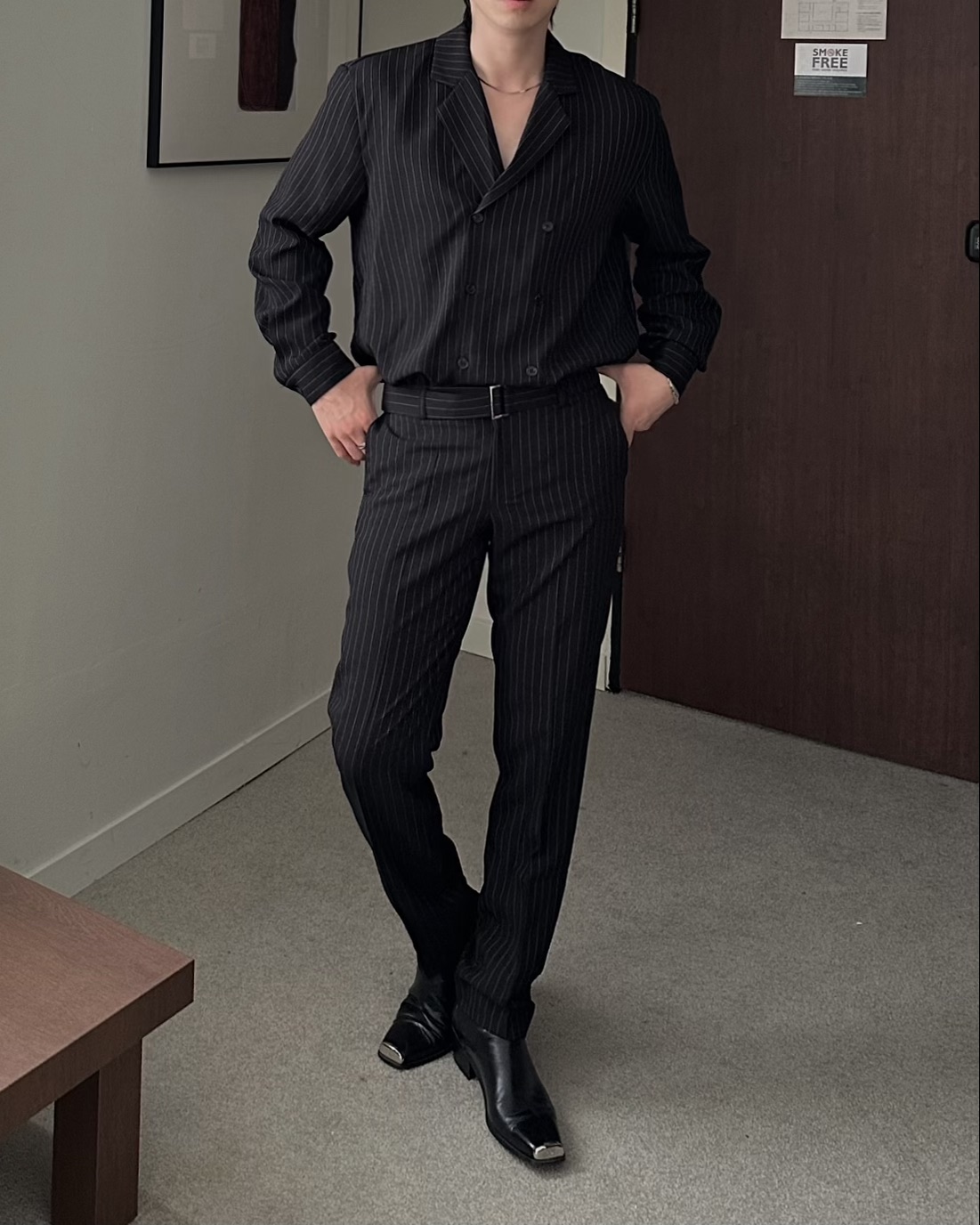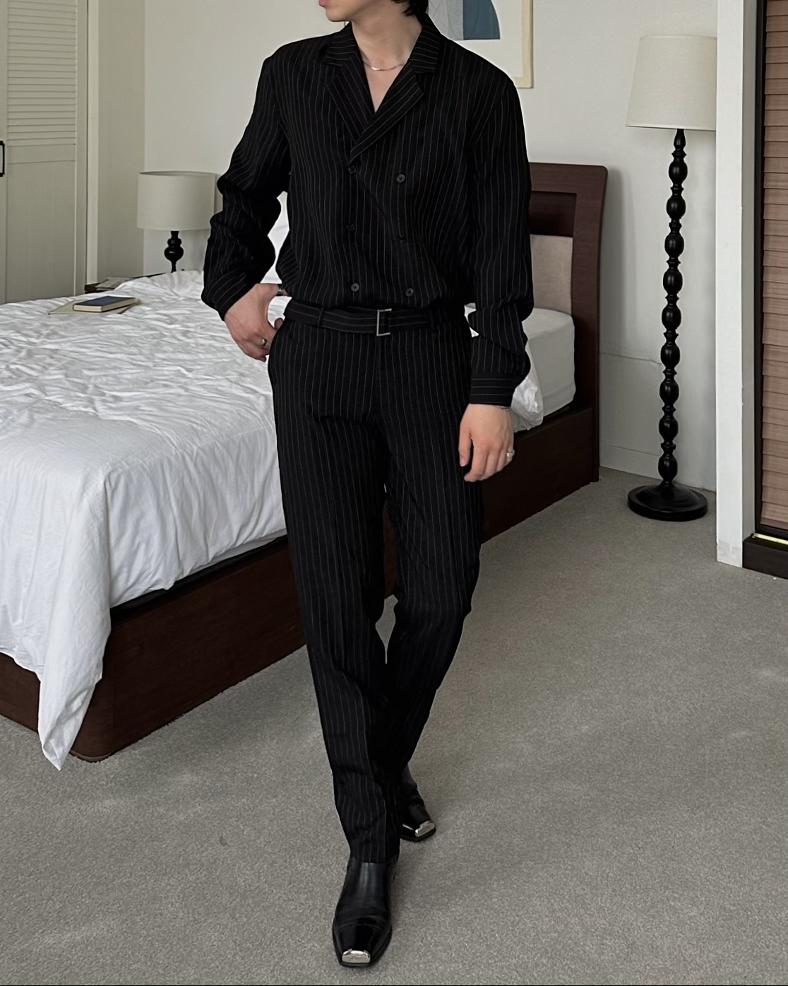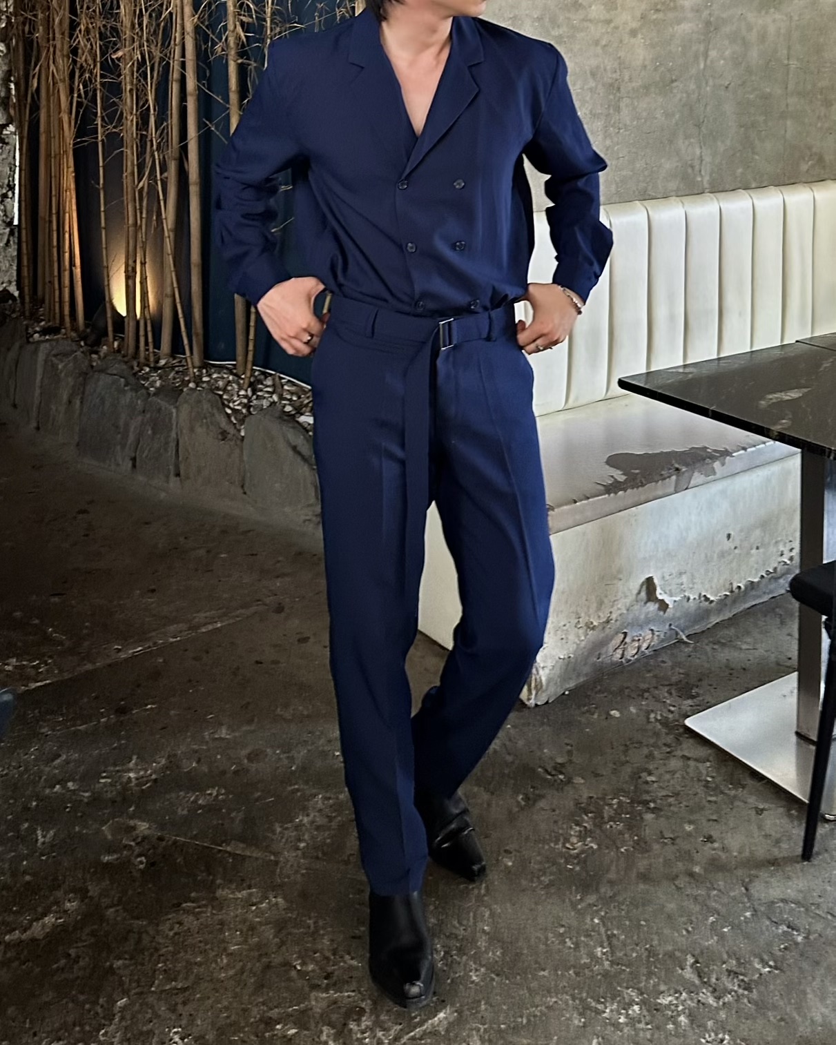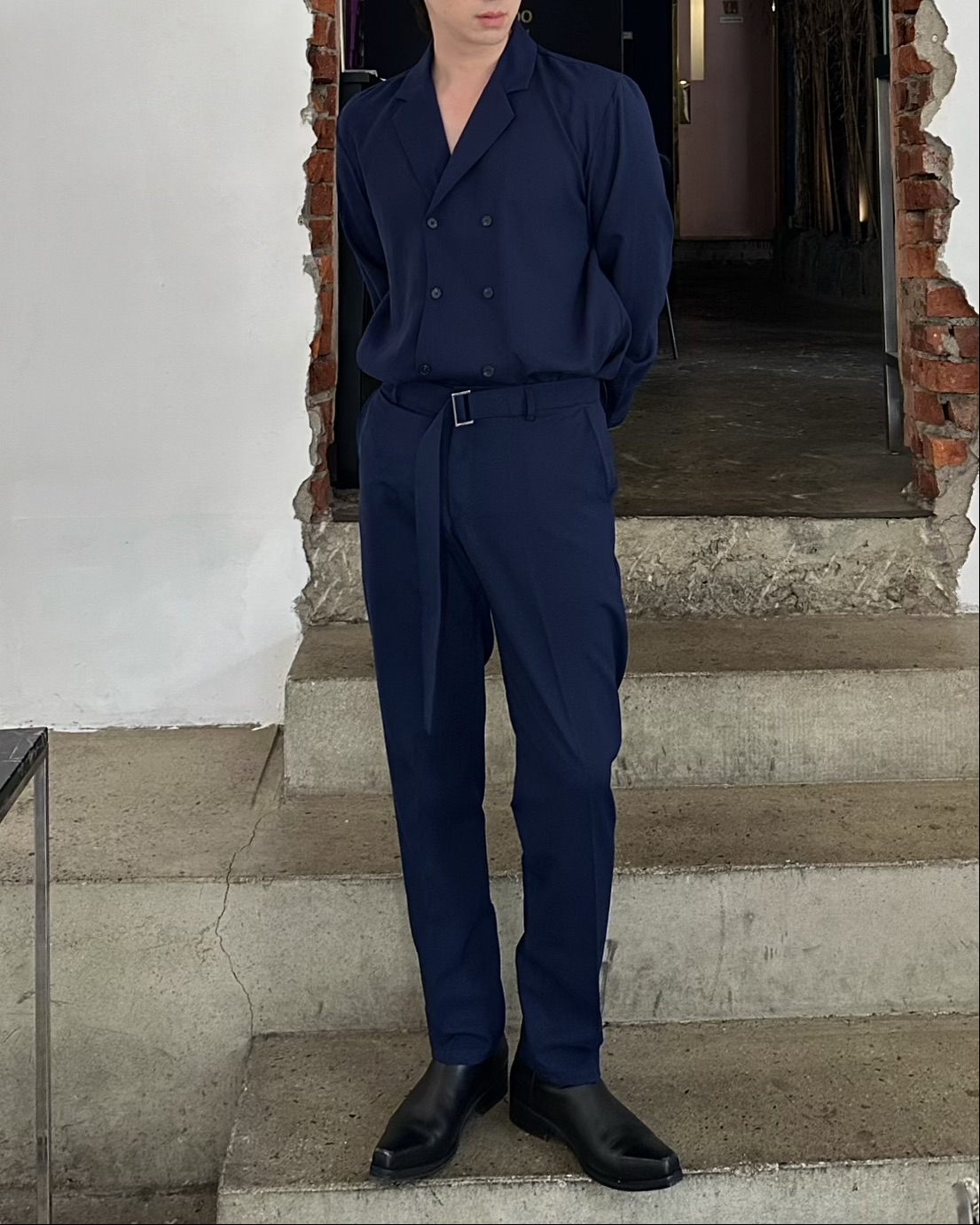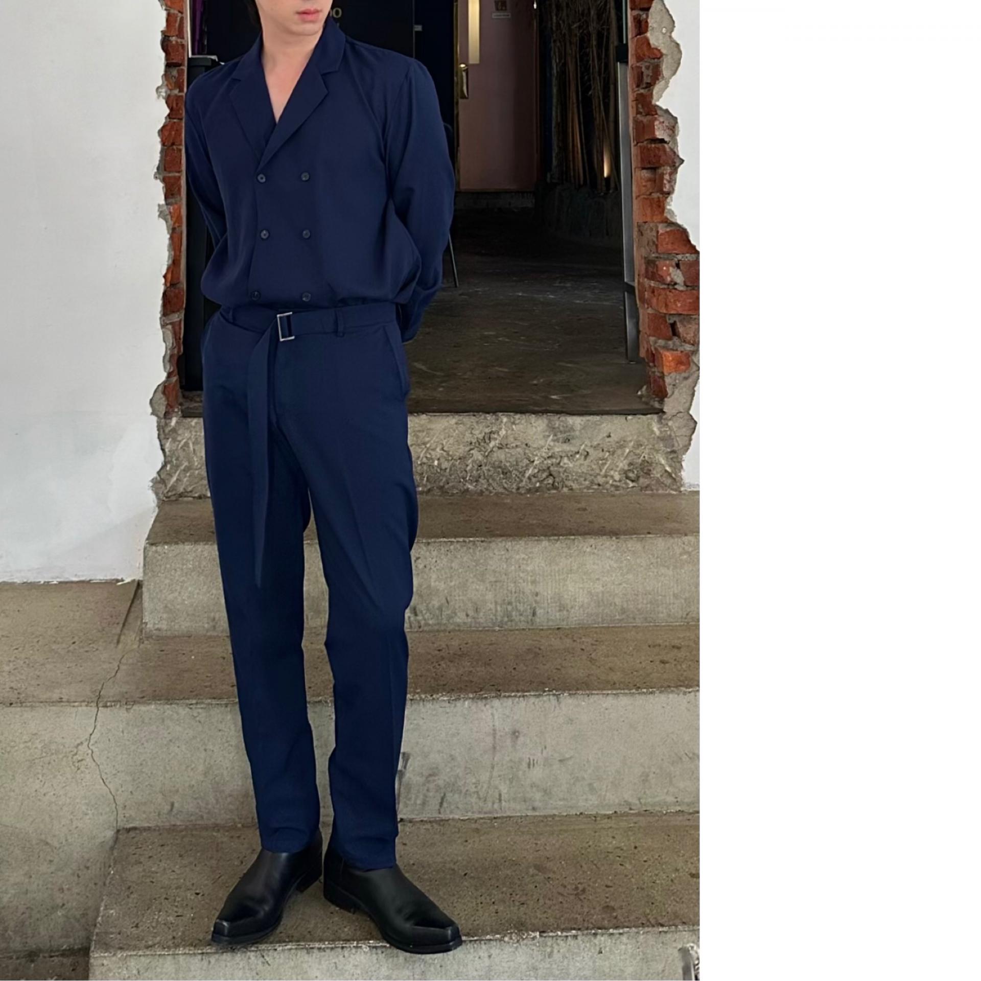 -미니멀한 히든 더블 버튼 셔츠와 , 벨티드 슬랙스로 미니멀한 디자인