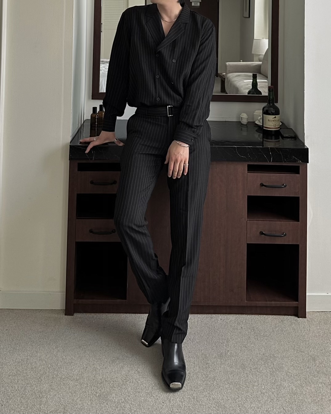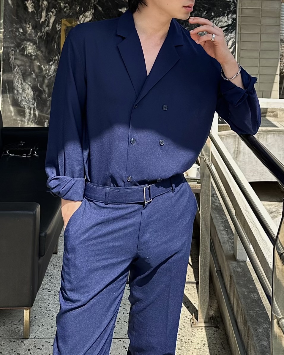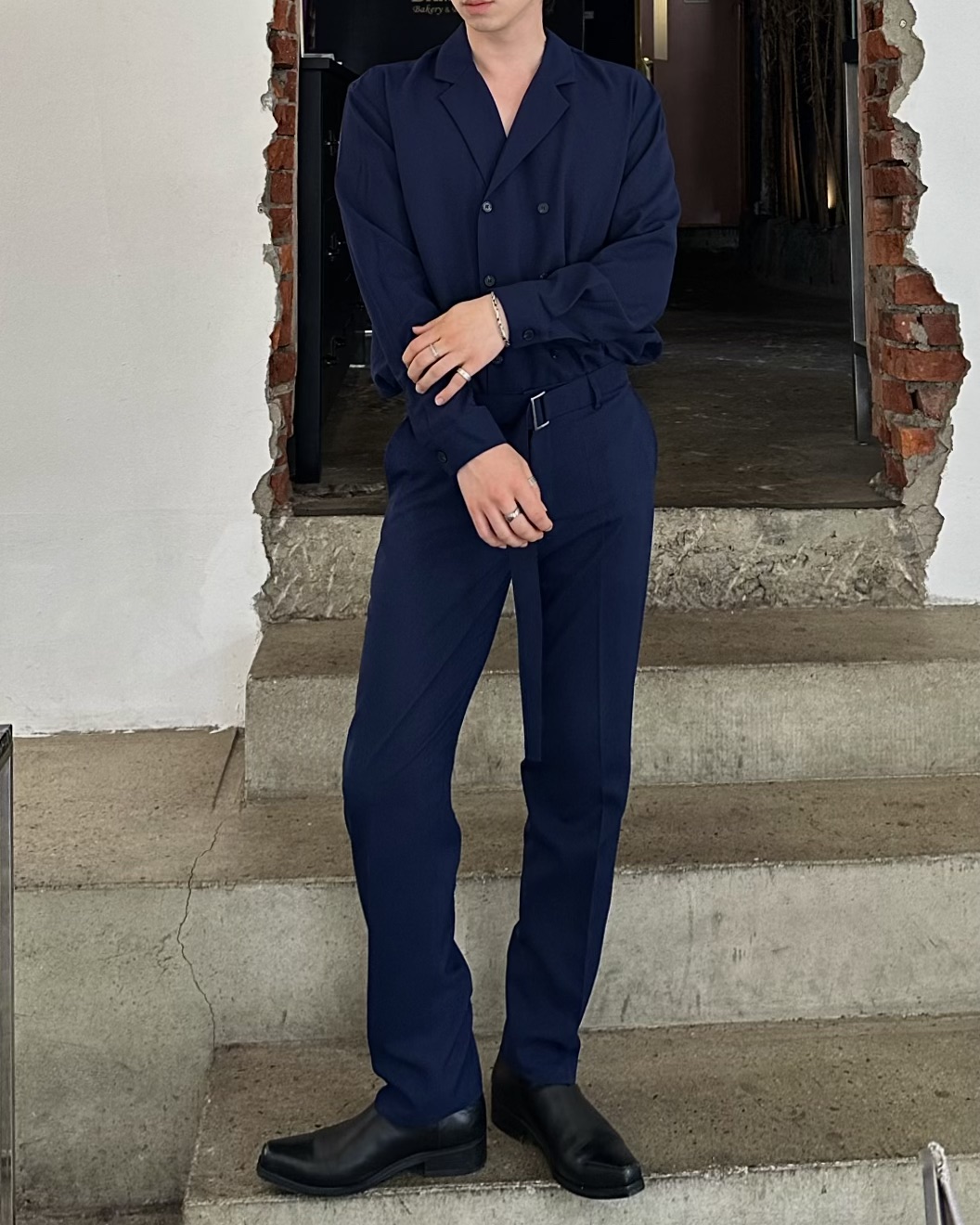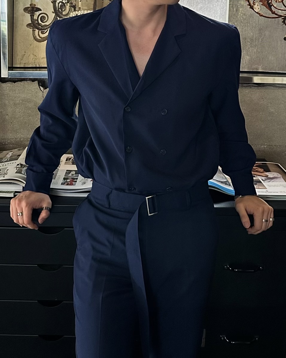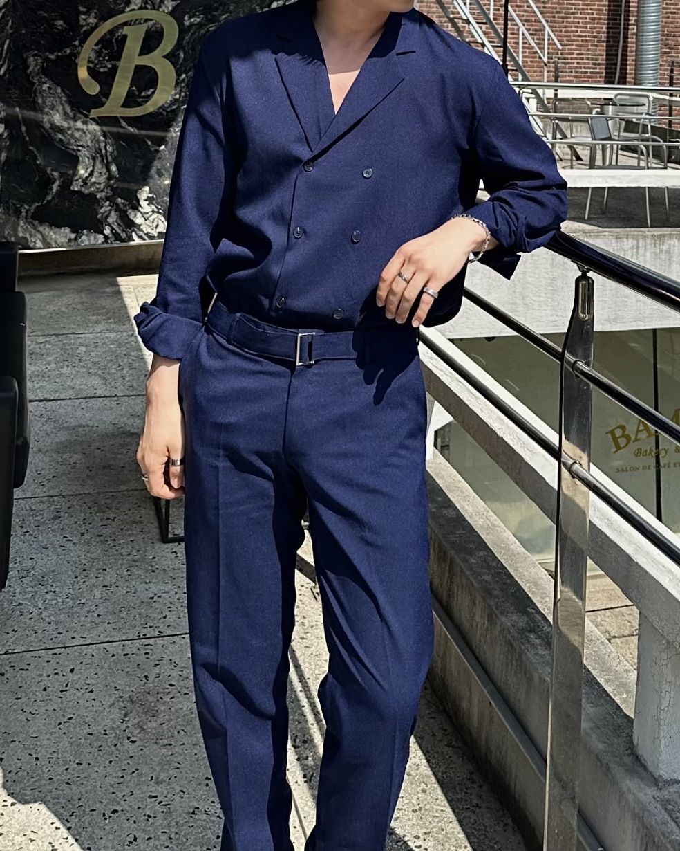-미니멀한 히든 더블 버튼 셔츠와 , 벨티드 슬랙스로 미니멀한 디자인