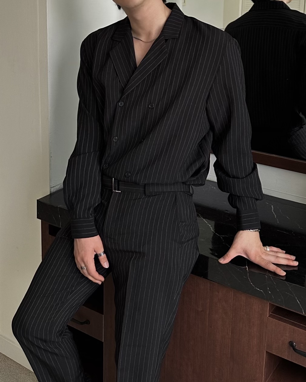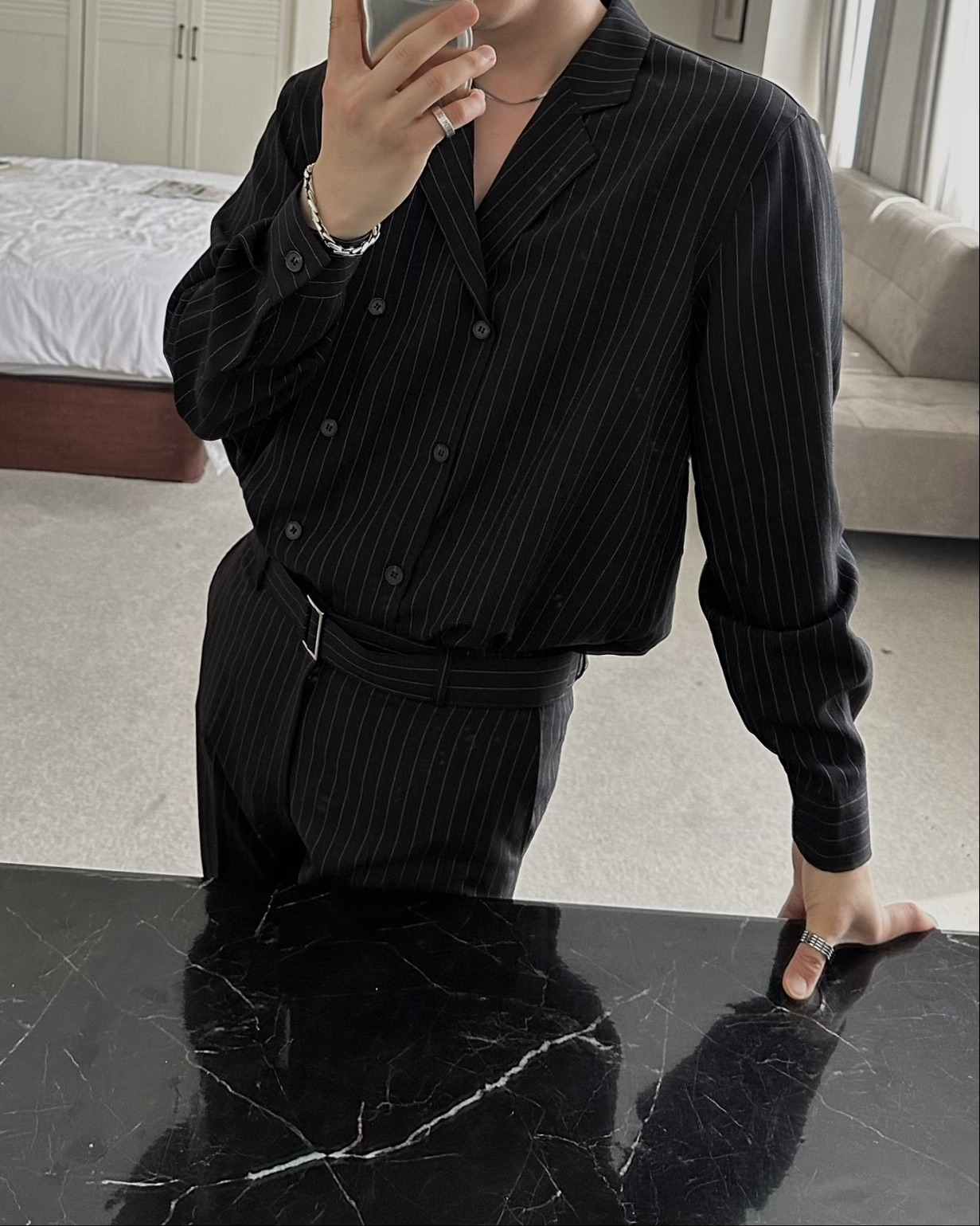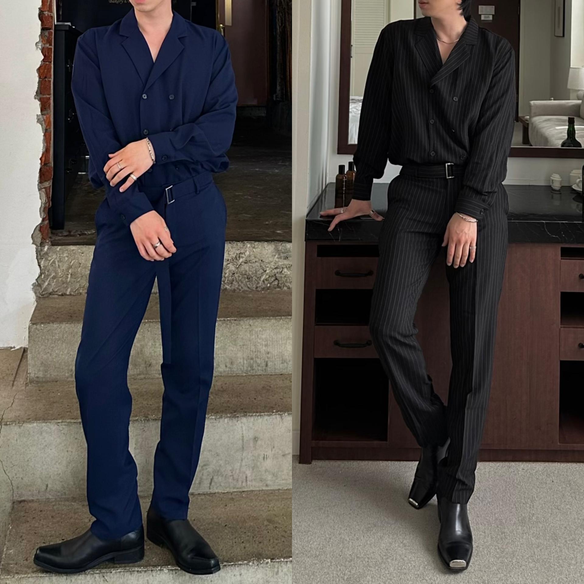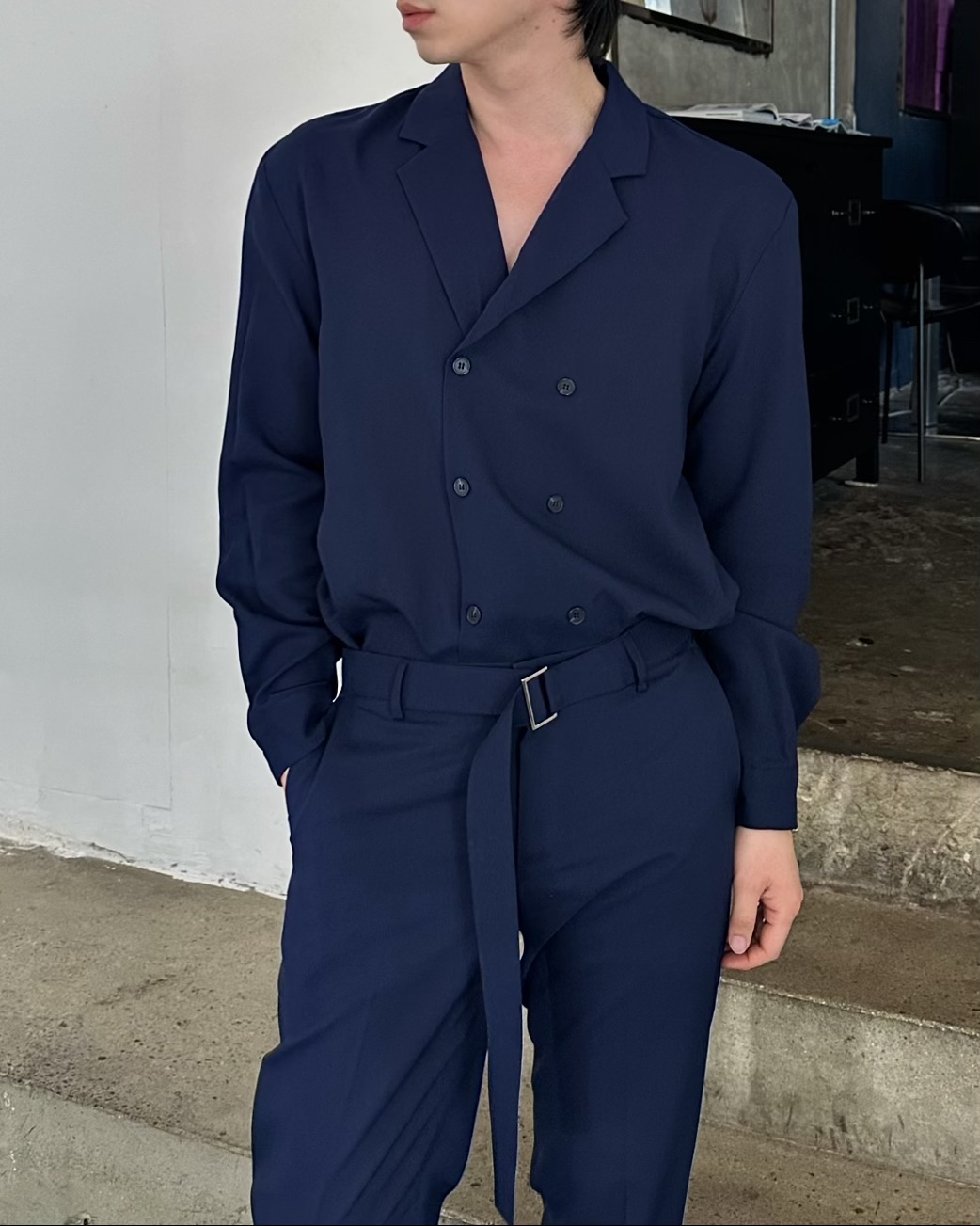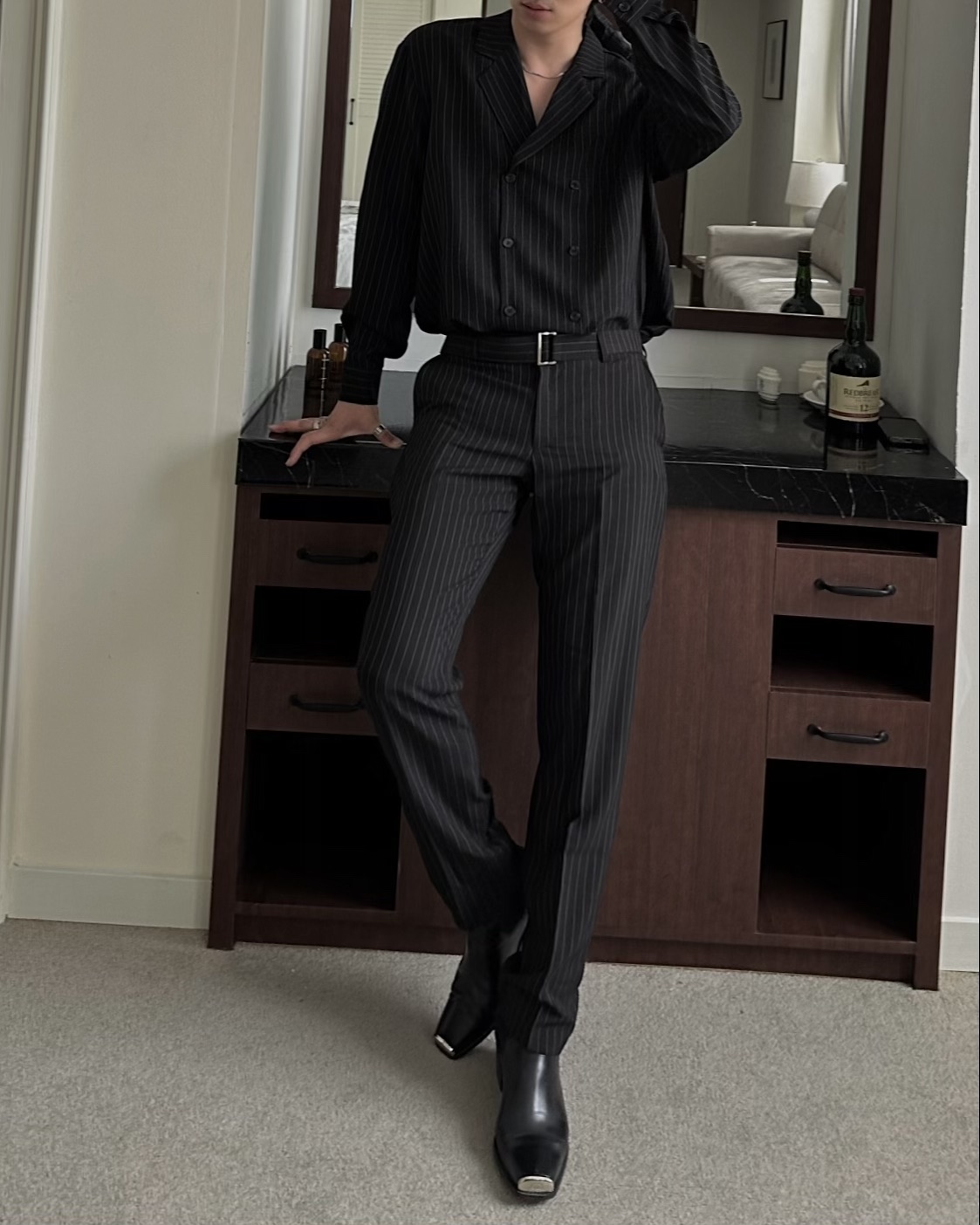 -미니멀한 히든 더블 버튼 셔츠와 , 벨티드 슬랙스로 미니멀한 디자인