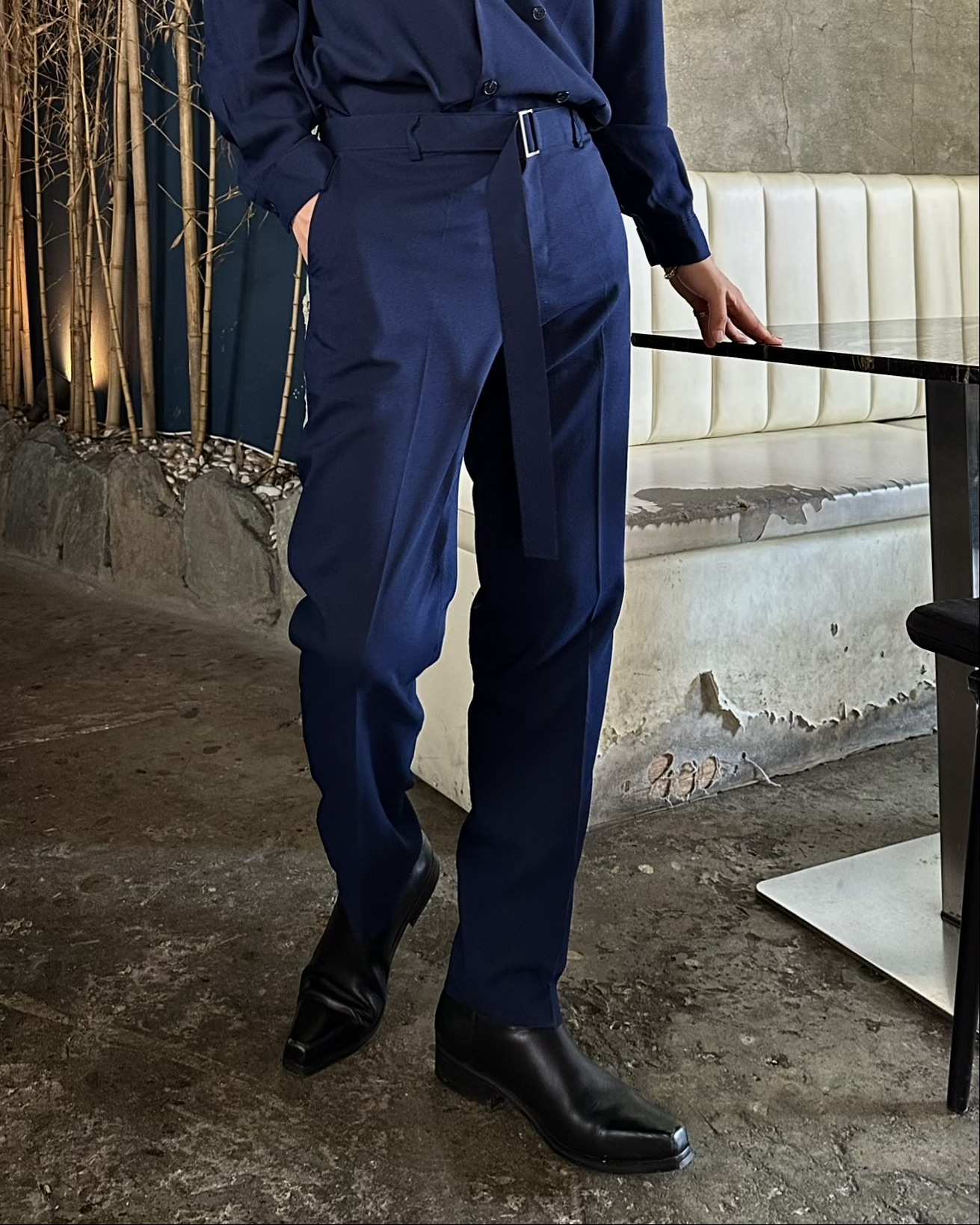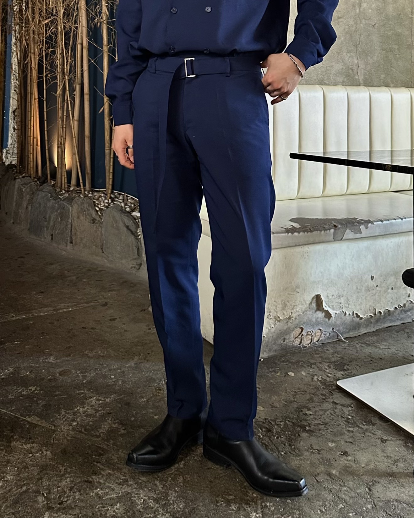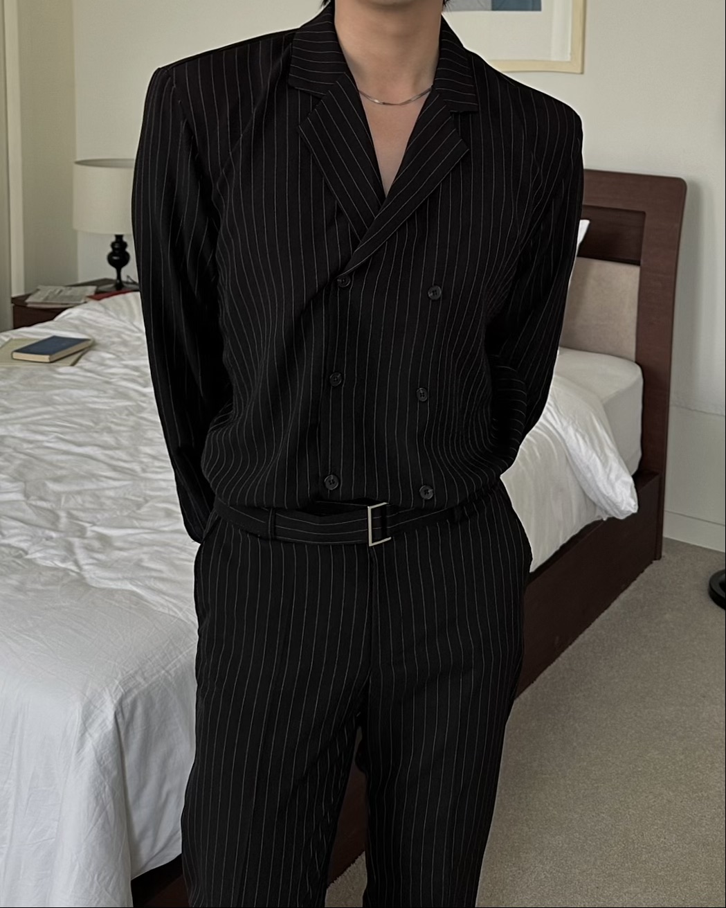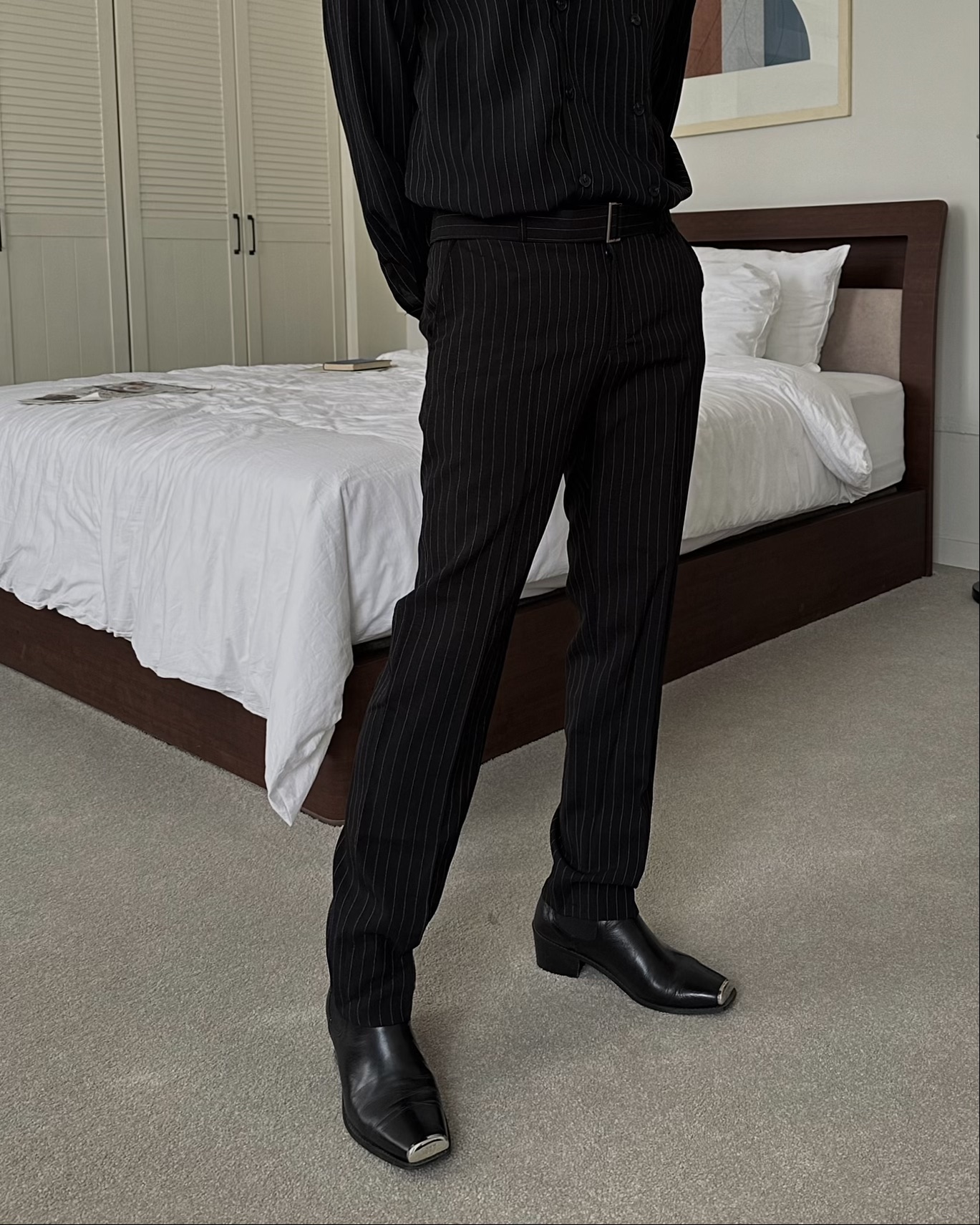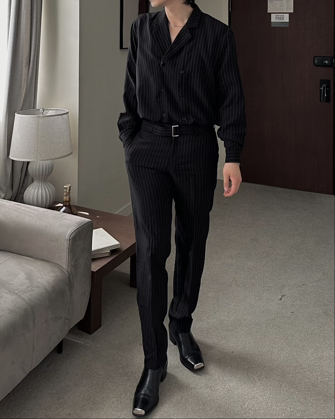 -미니멀한 히든 더블 버튼 셔츠와 , 벨티드 슬랙스로 미니멀한 디자인