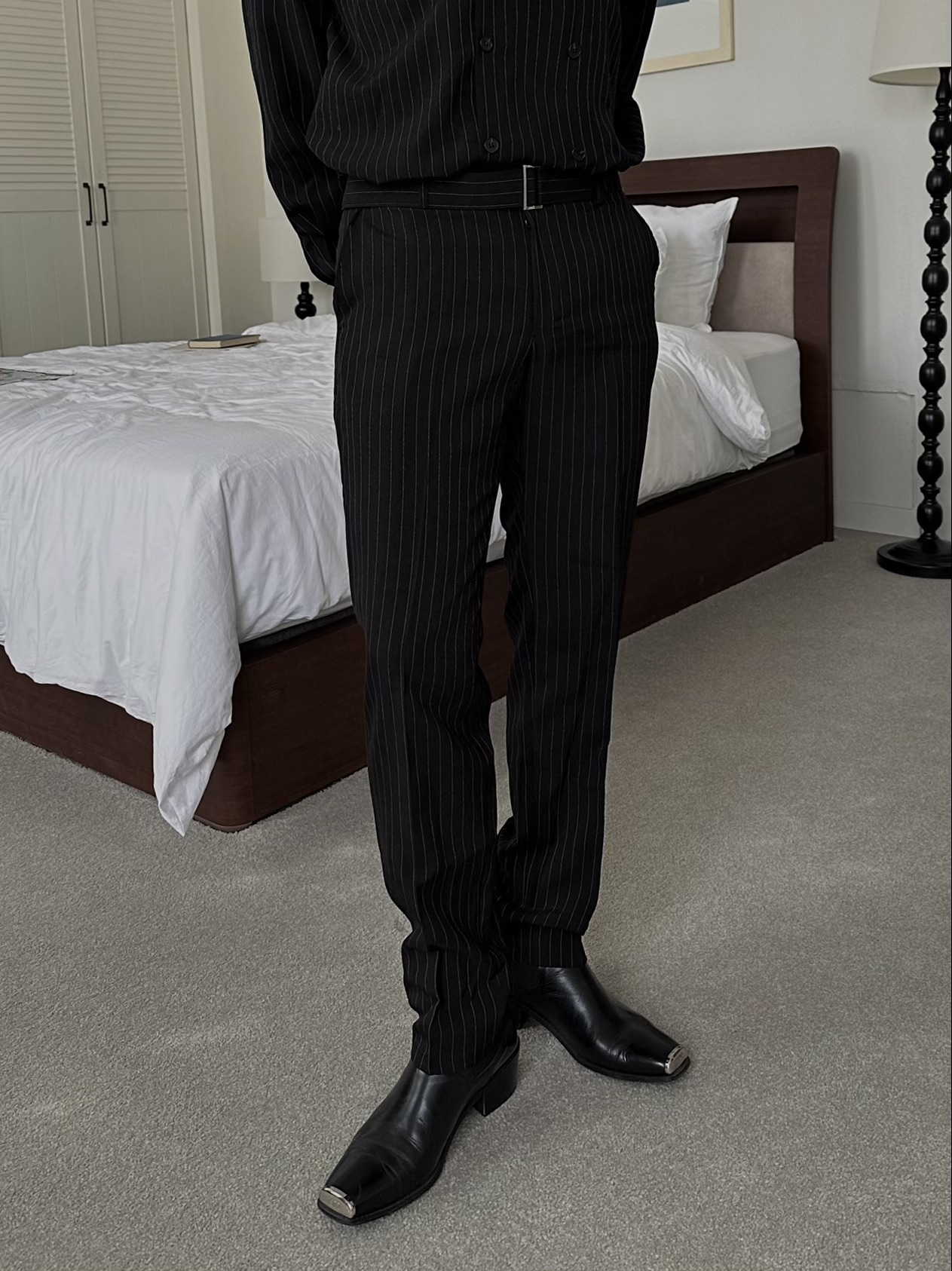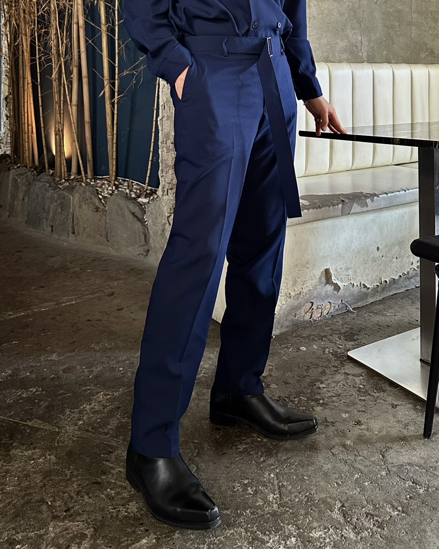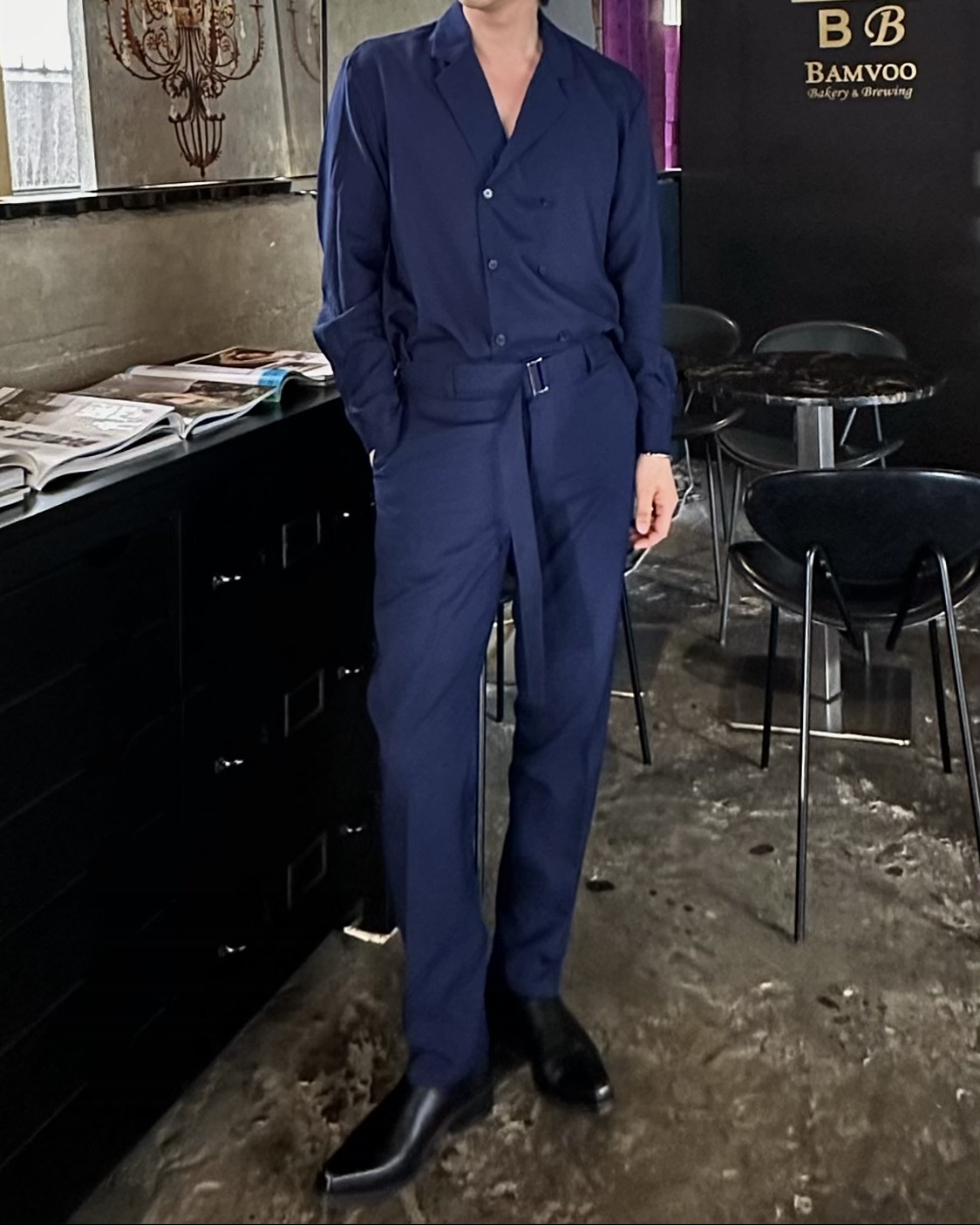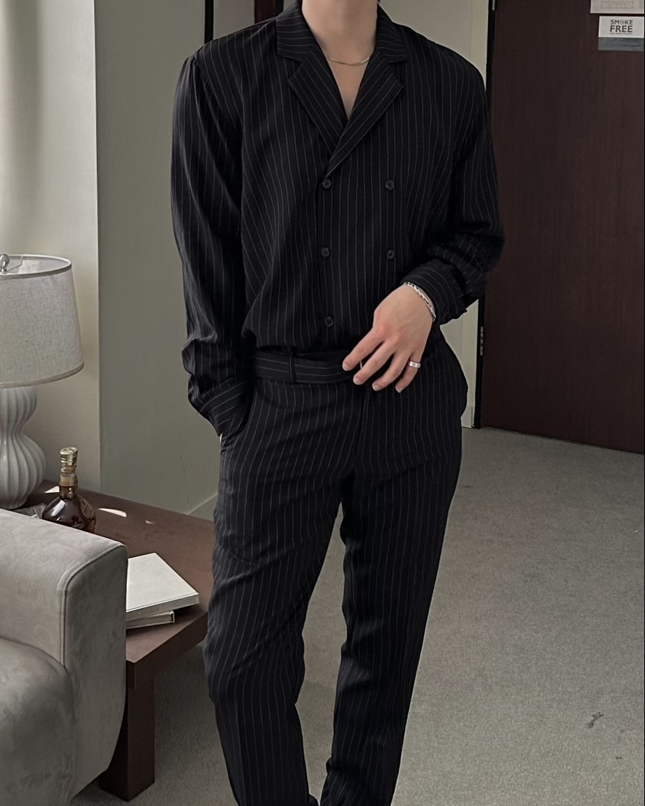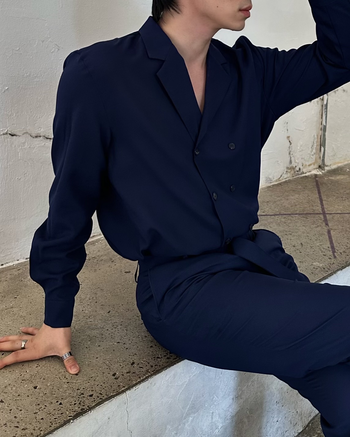 -미니멀한 히든 더블 버튼 셔츠와 , 벨티드 슬랙스로 미니멀한 디자인