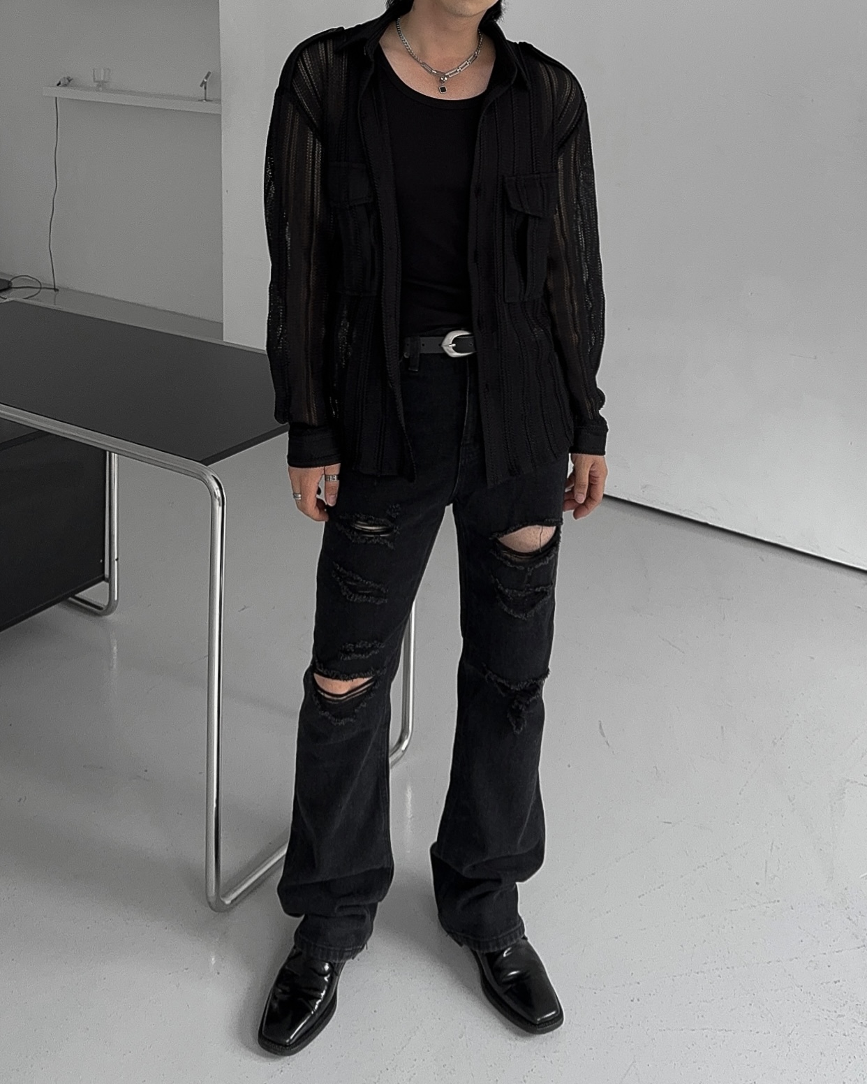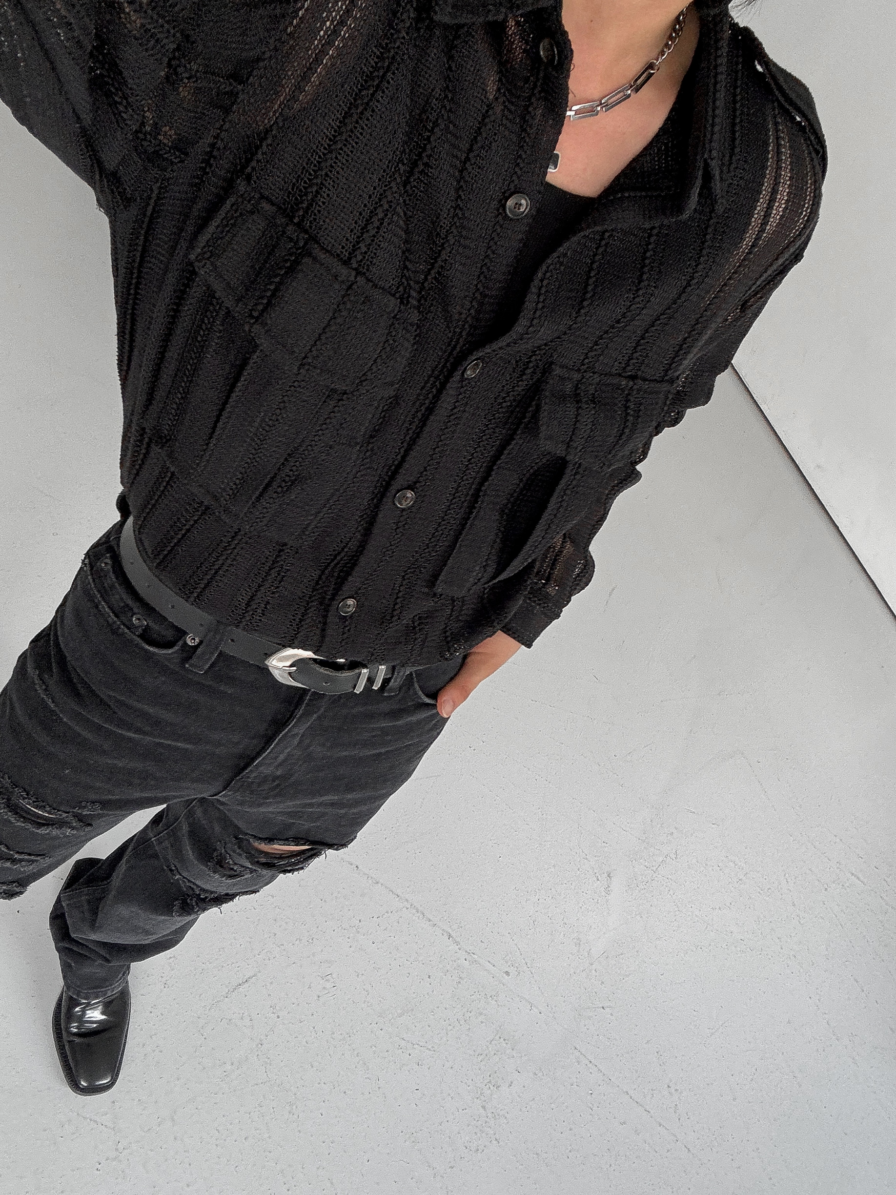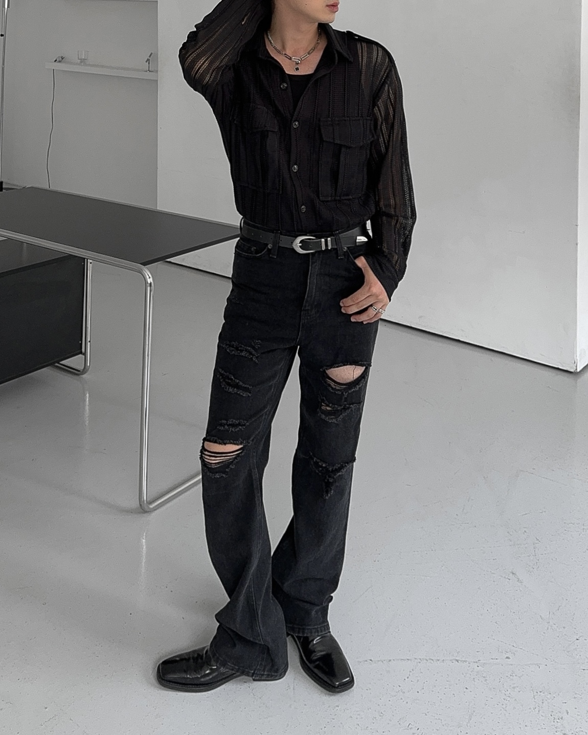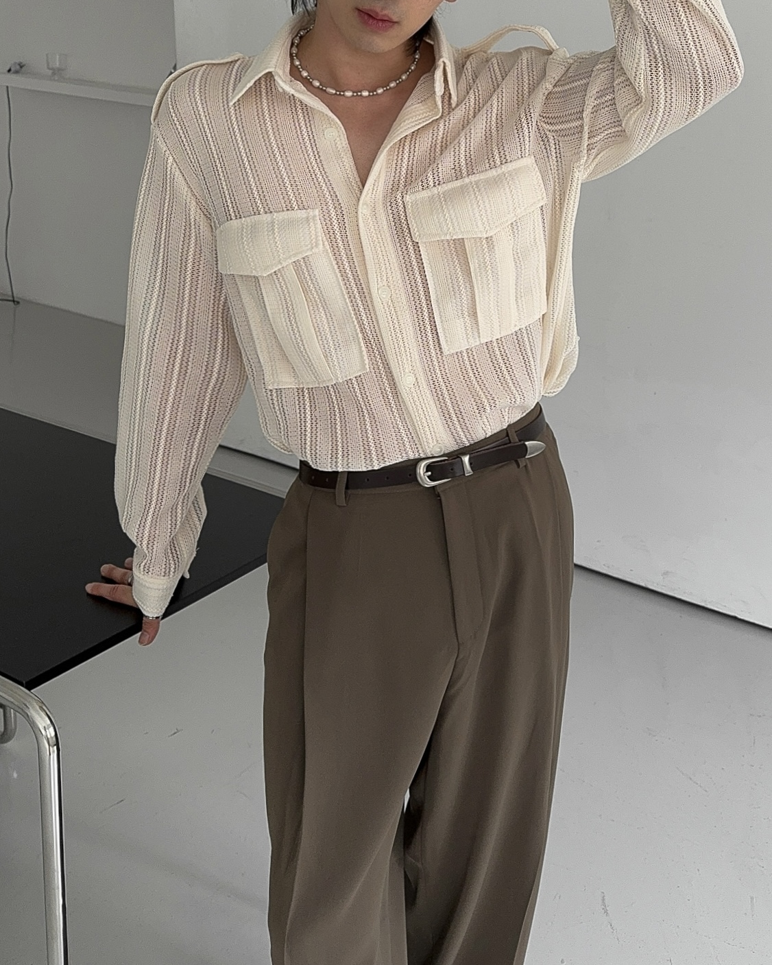 -니트 짜임 형식으로 제작된 셔츠