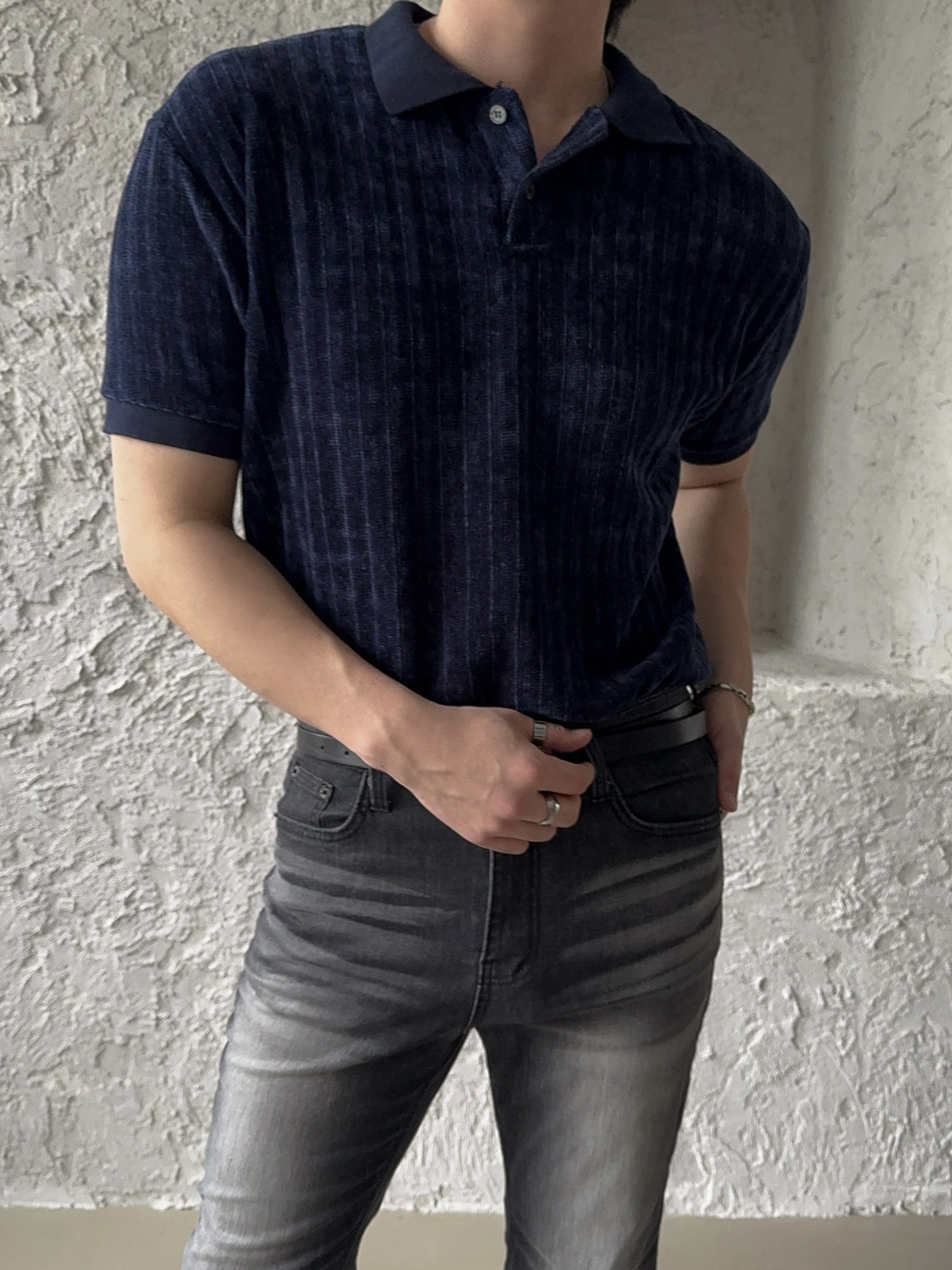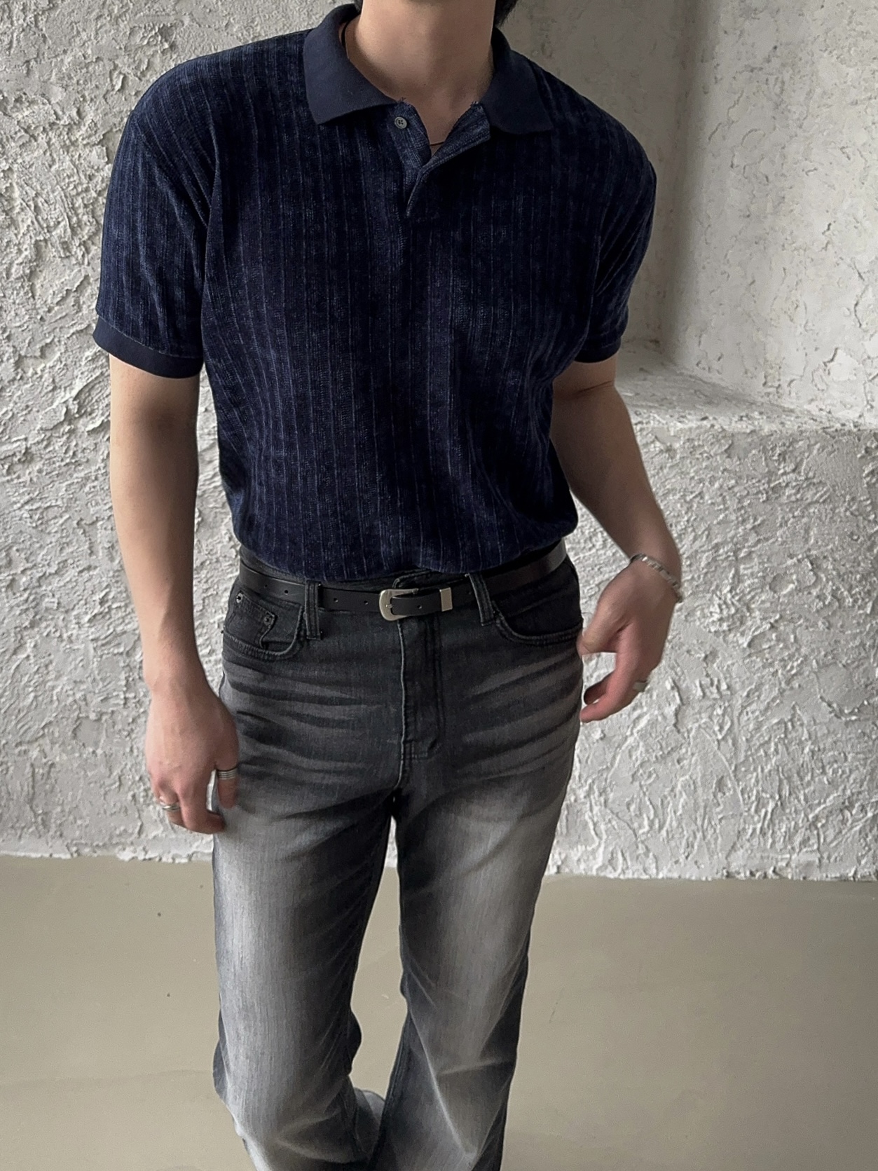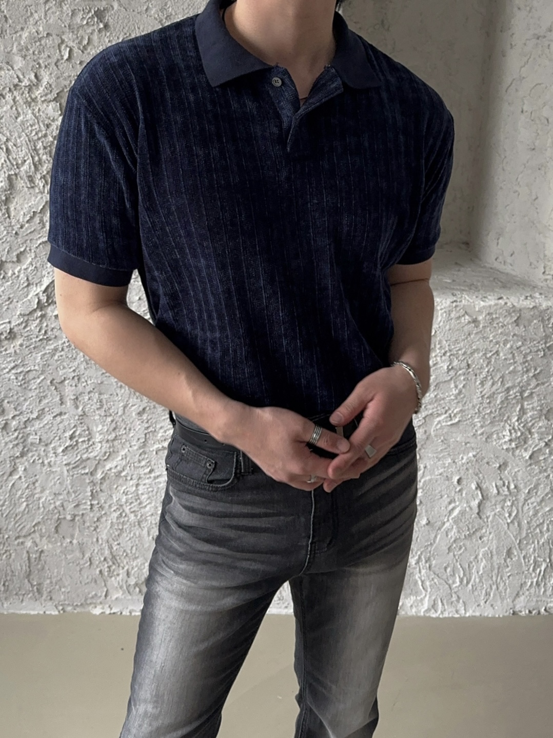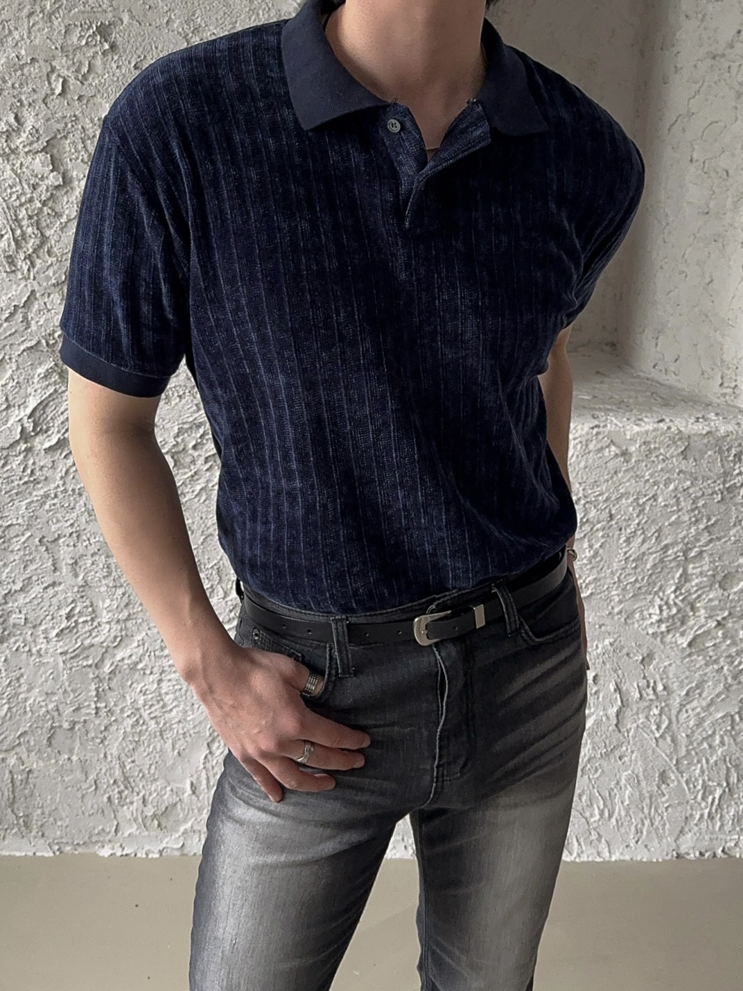 -소재감이 돋보이는 벨로아 소재의 카라 니트 티셔츠