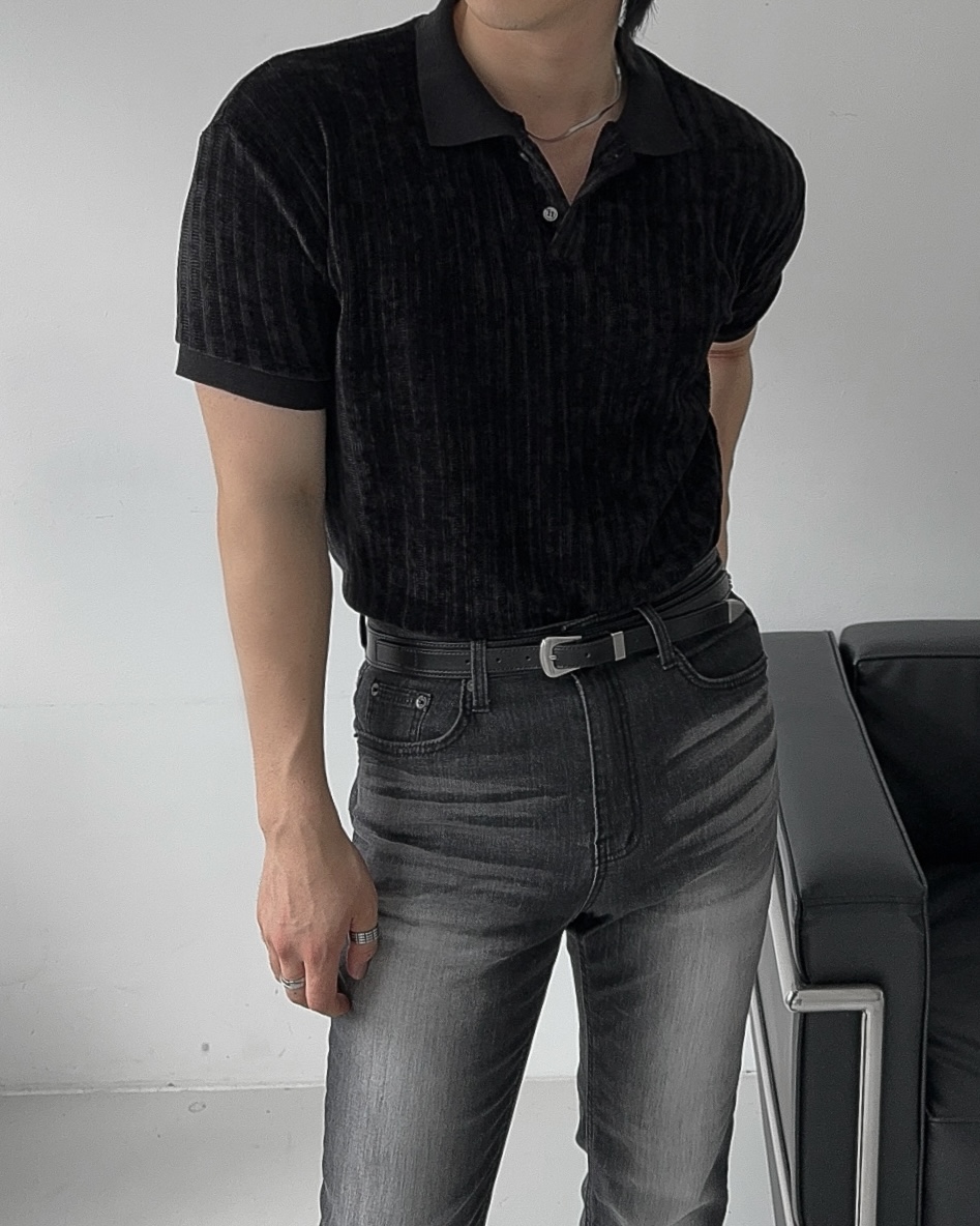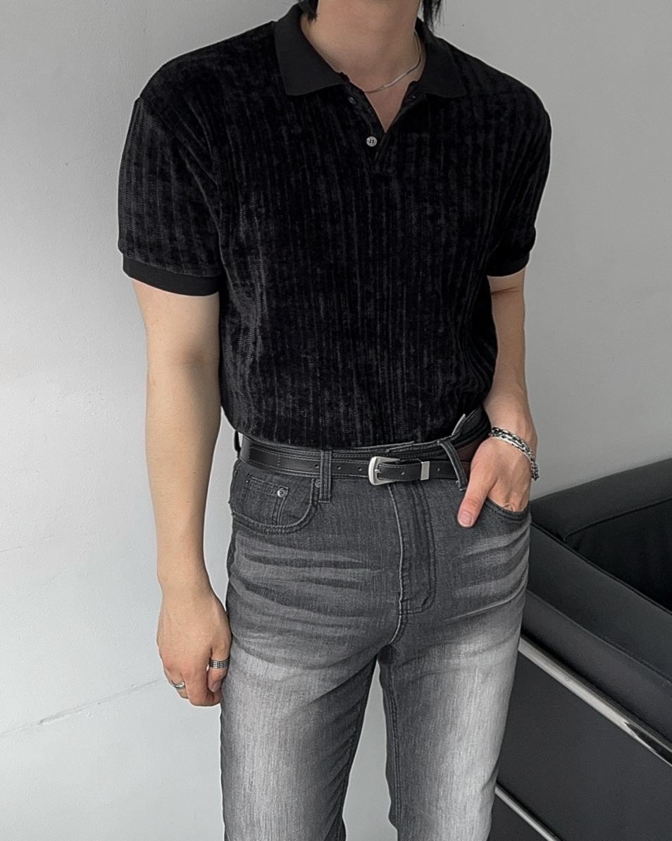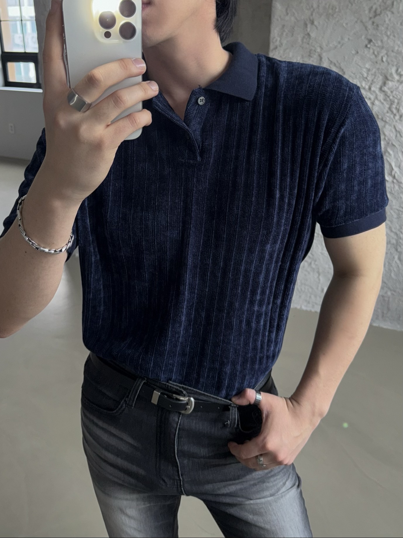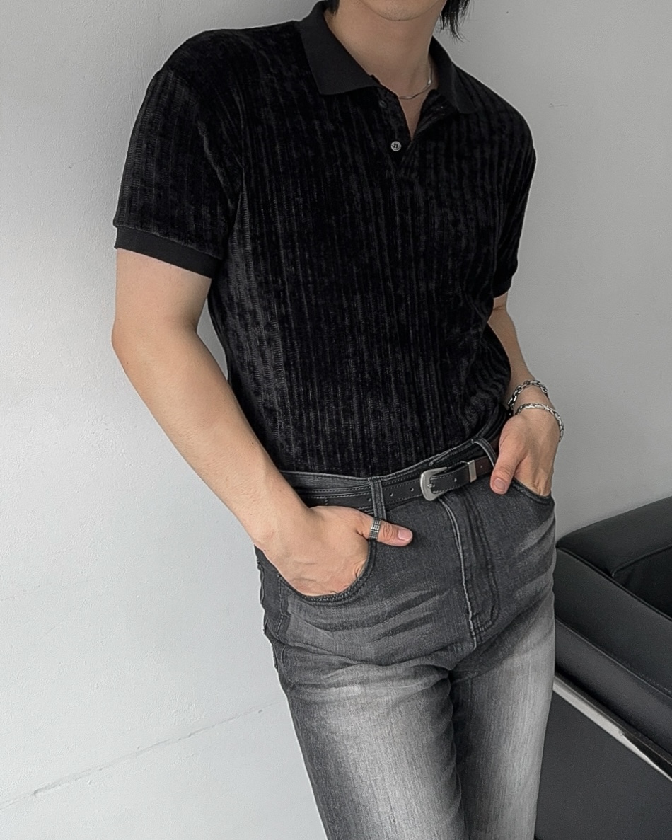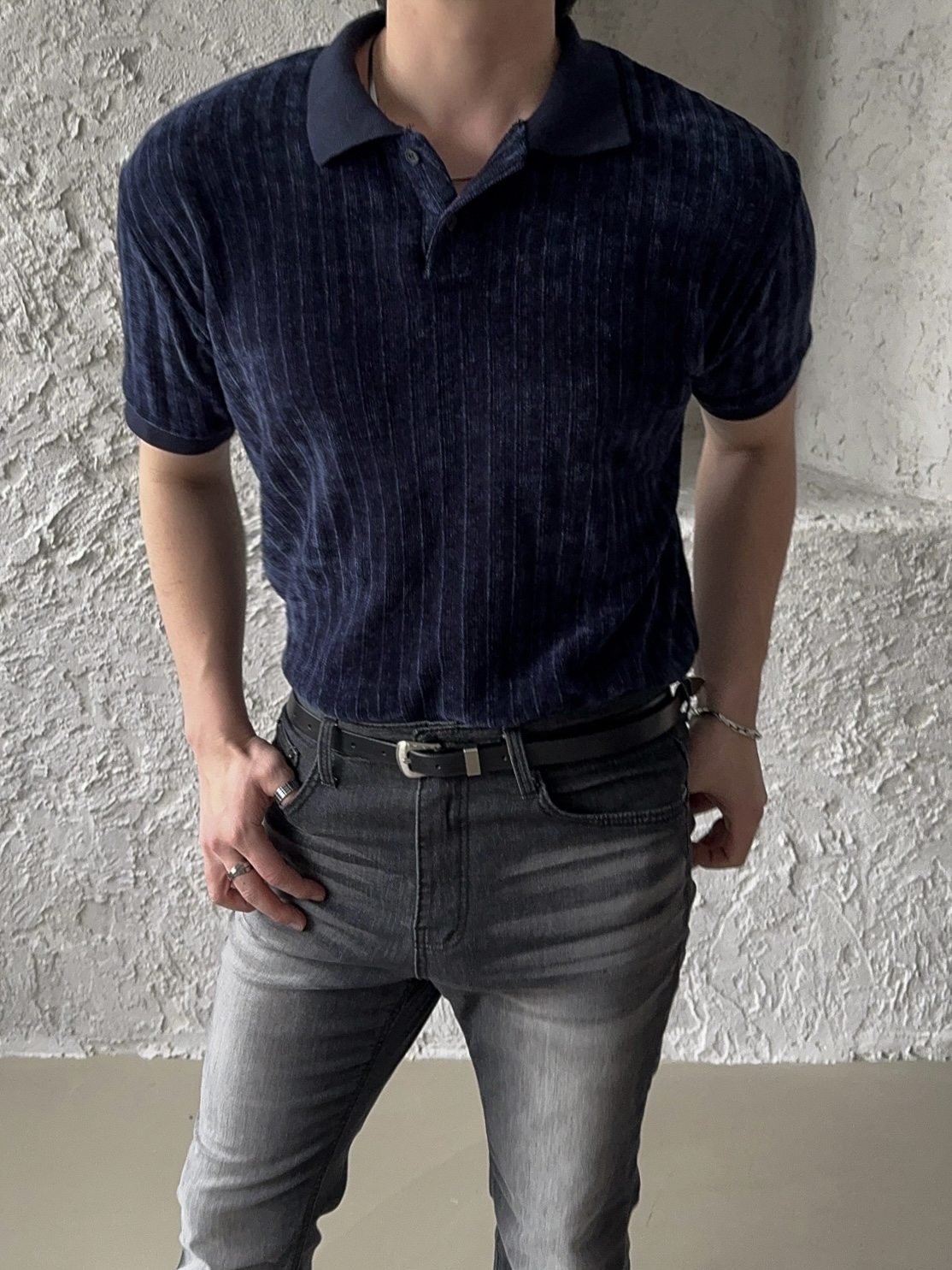 -소재감이 돋보이는 벨로아 소재의 카라 니트 티셔츠