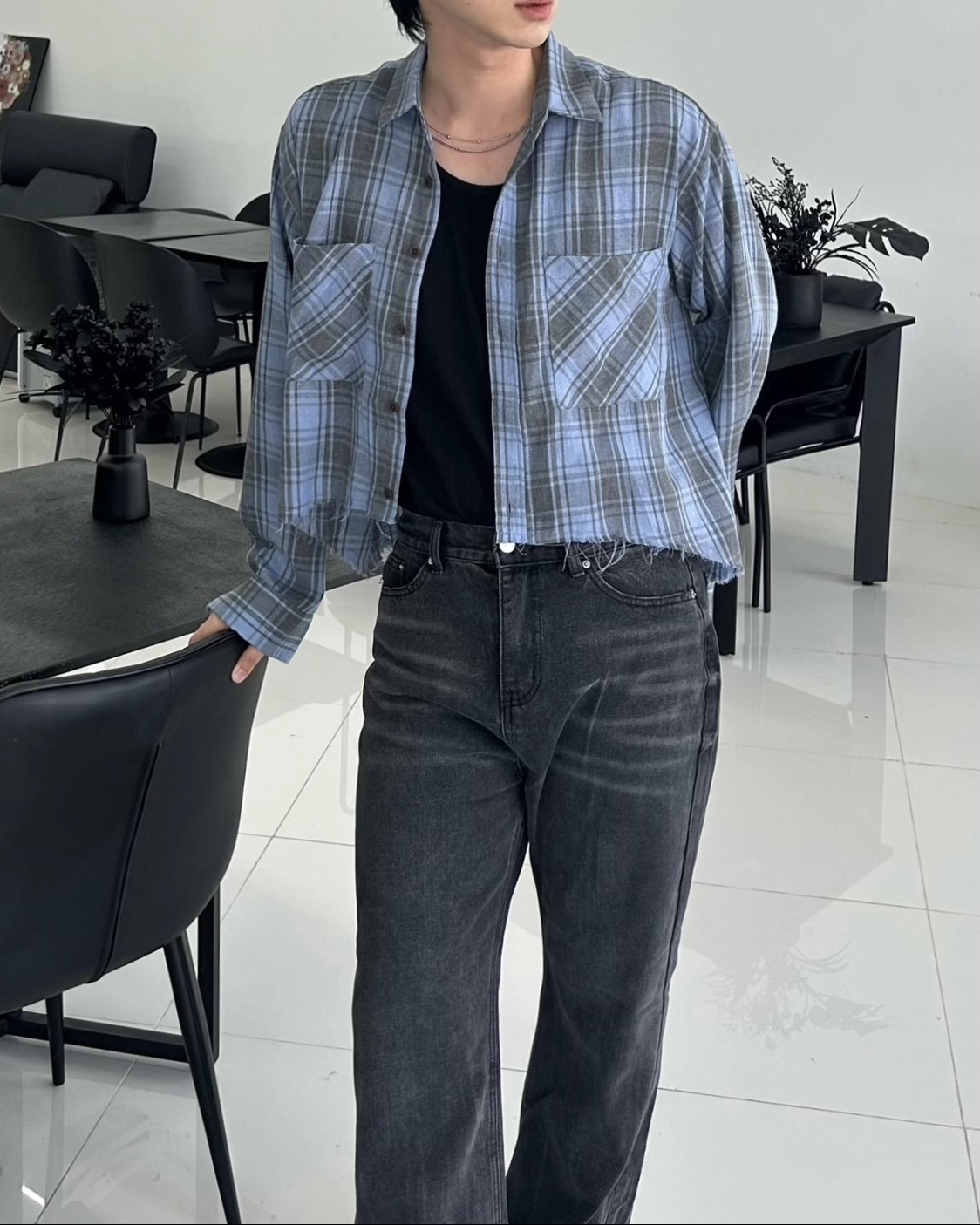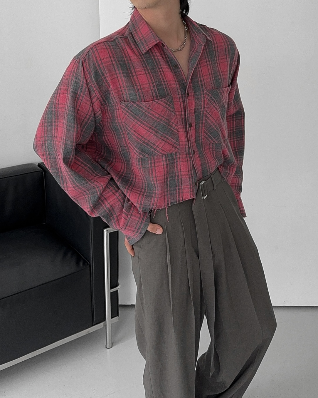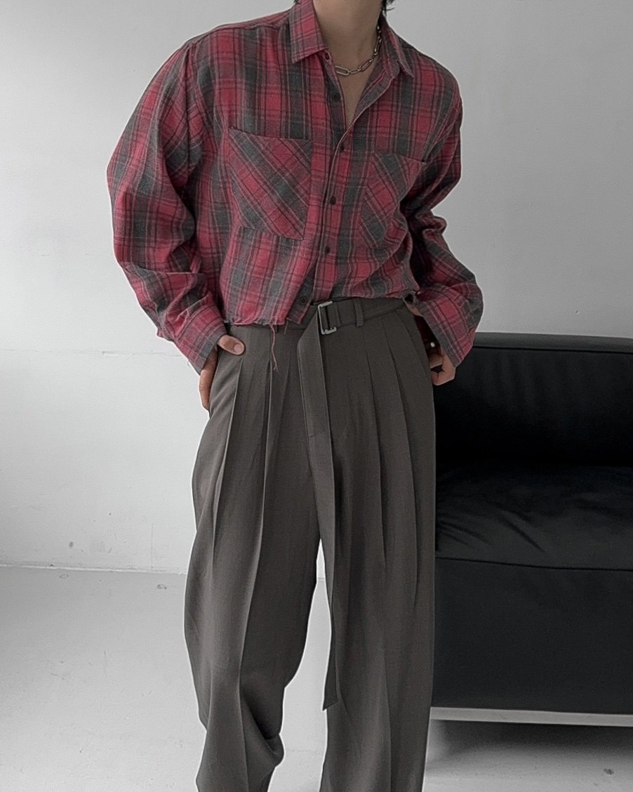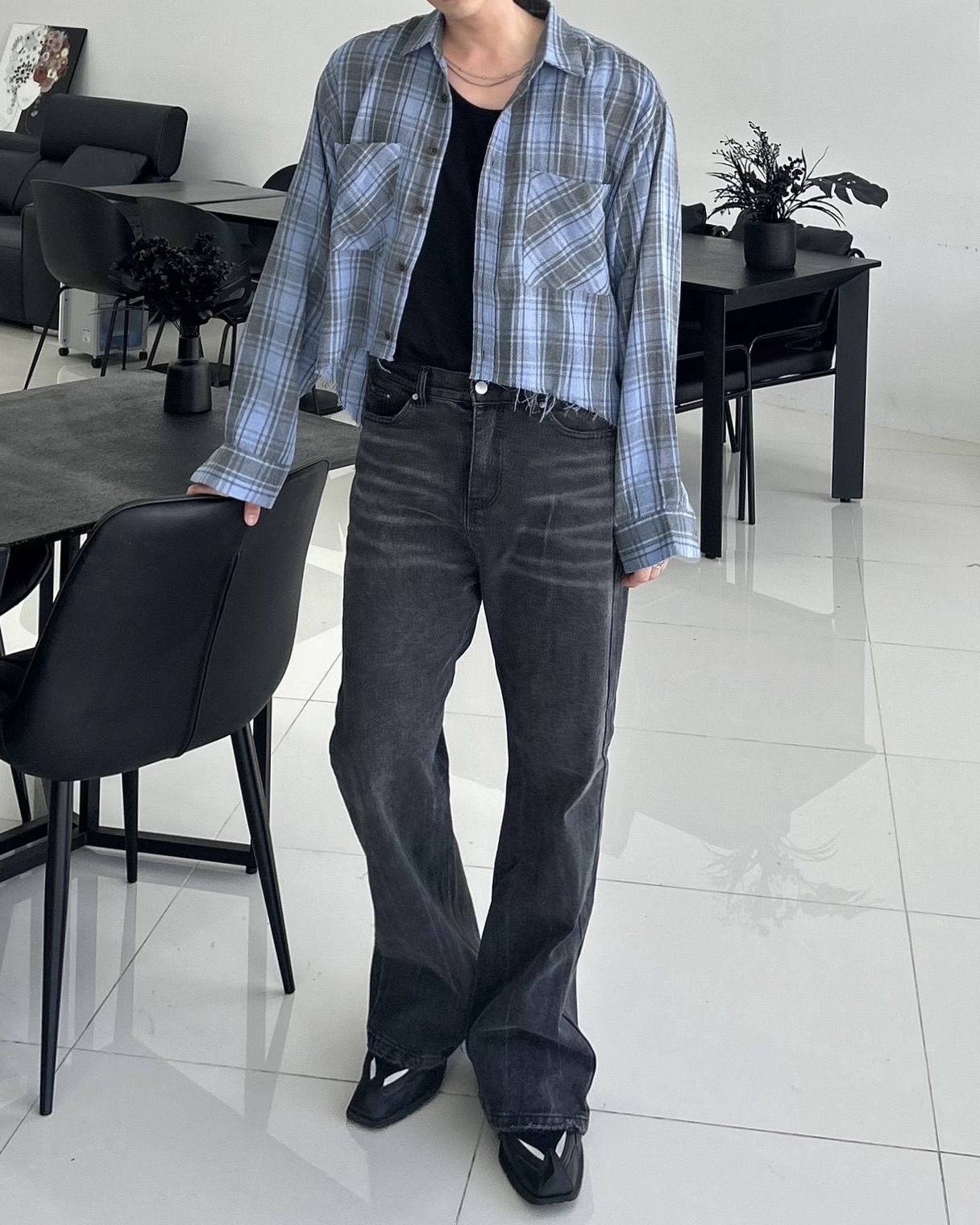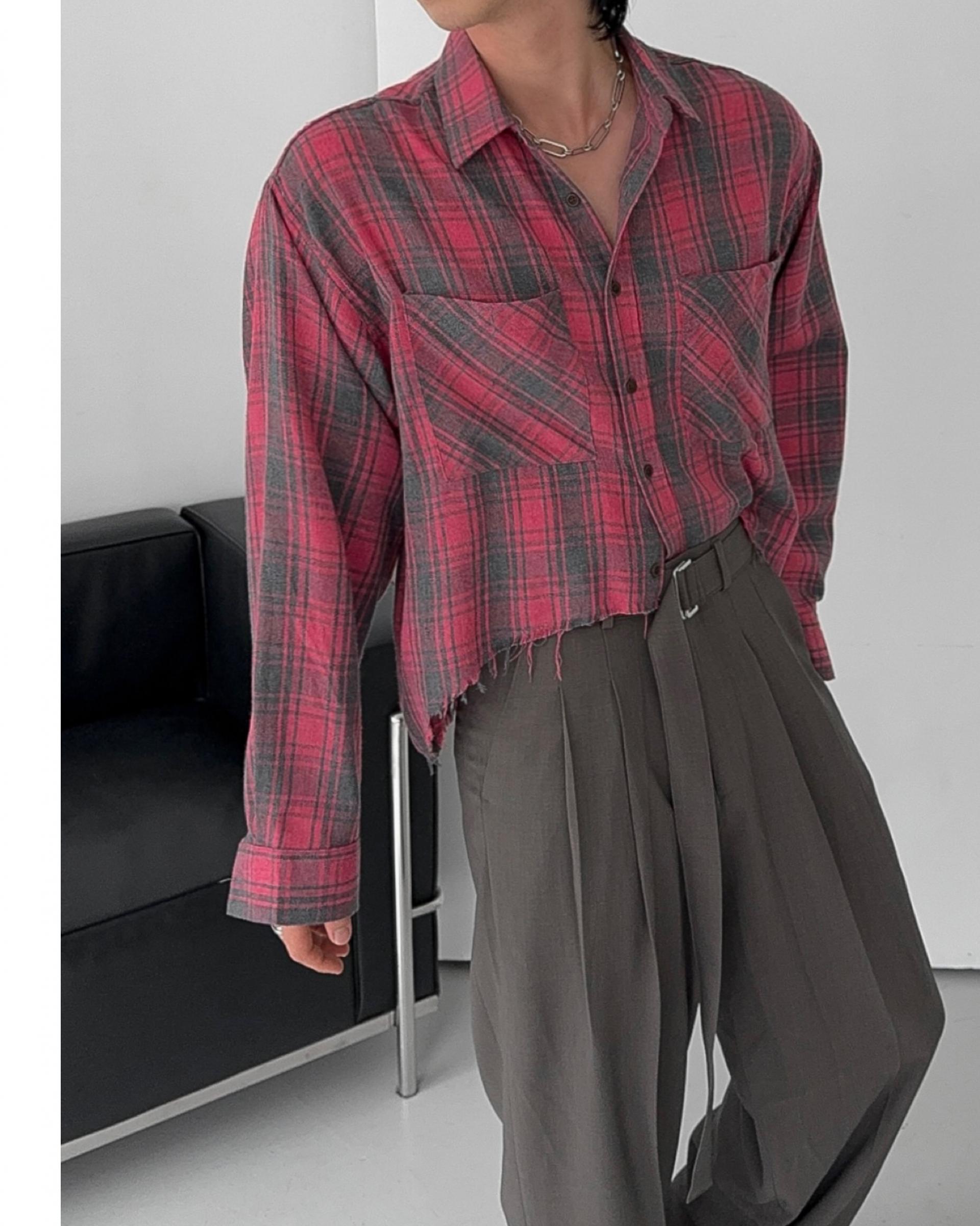 -크롭한 기장감의 체크 셔츠