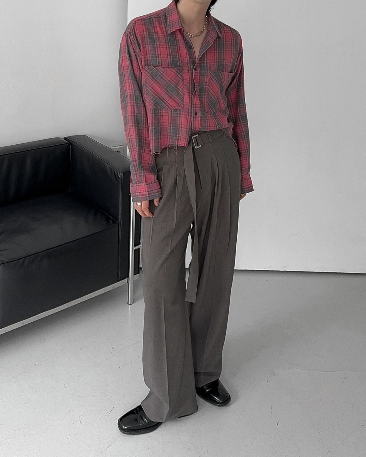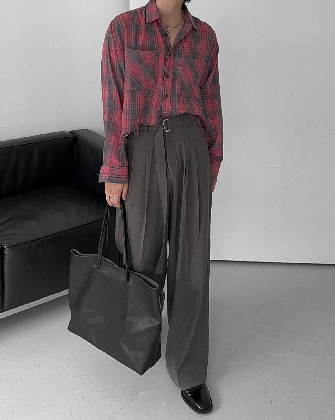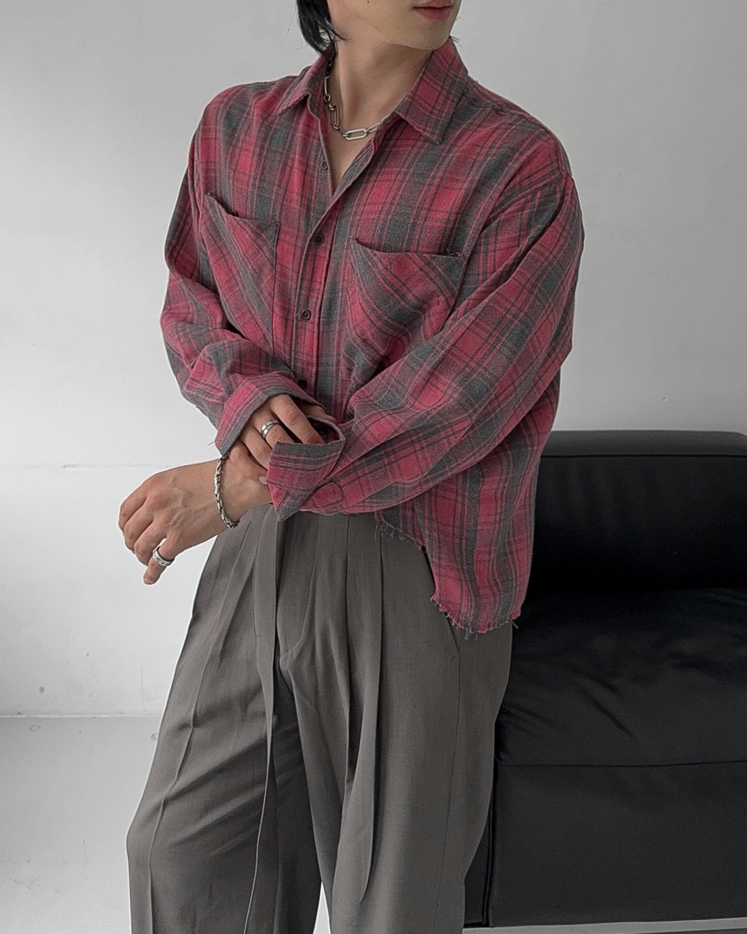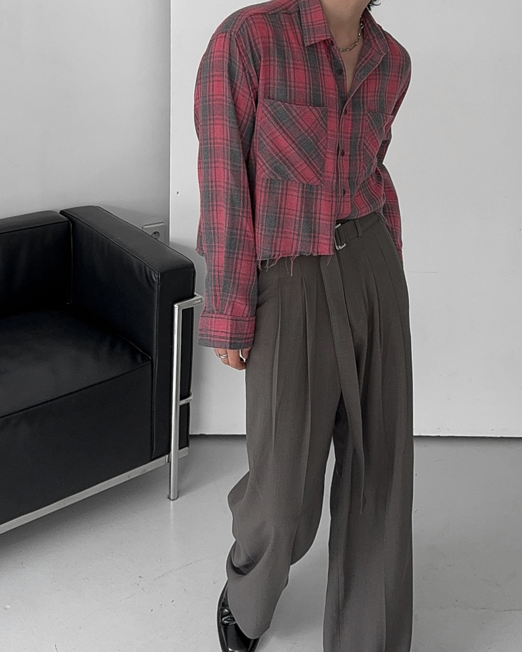 -크롭한 기장감의 체크 셔츠