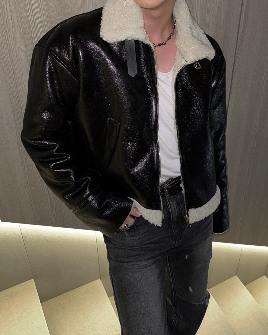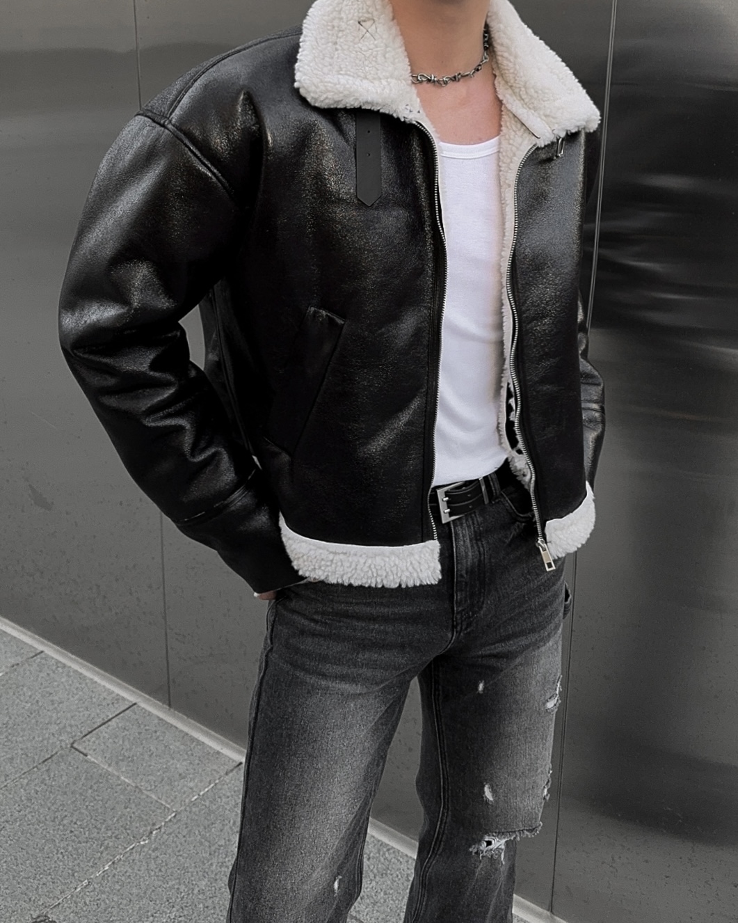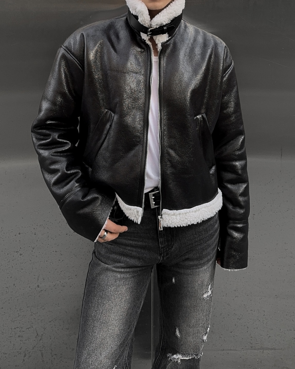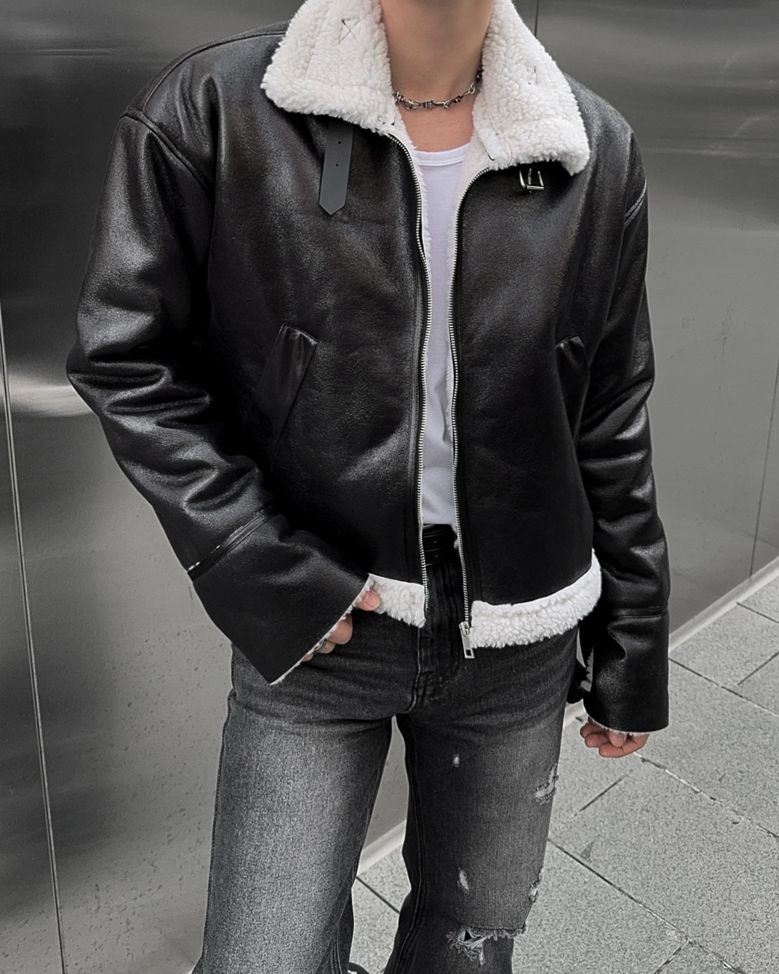 -씨어링 레더 소재로 제작된 무스탕