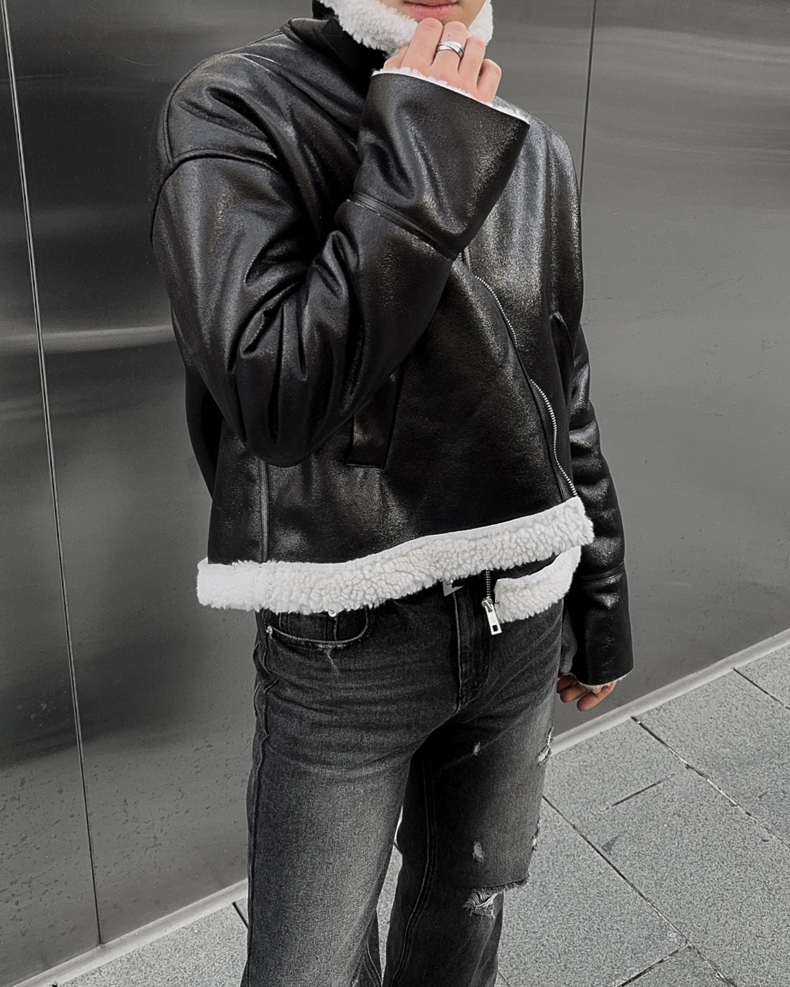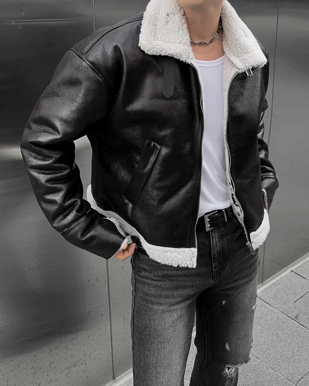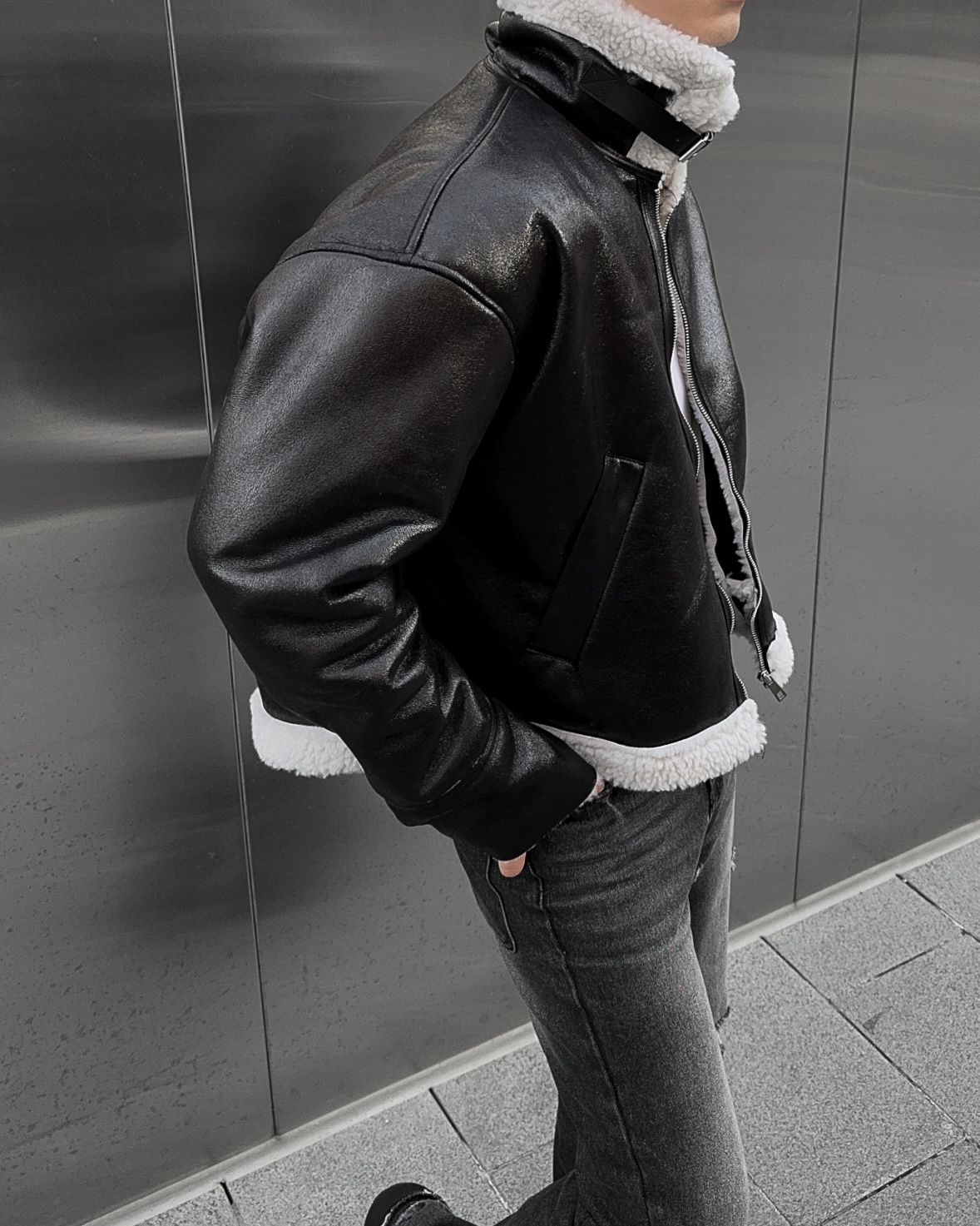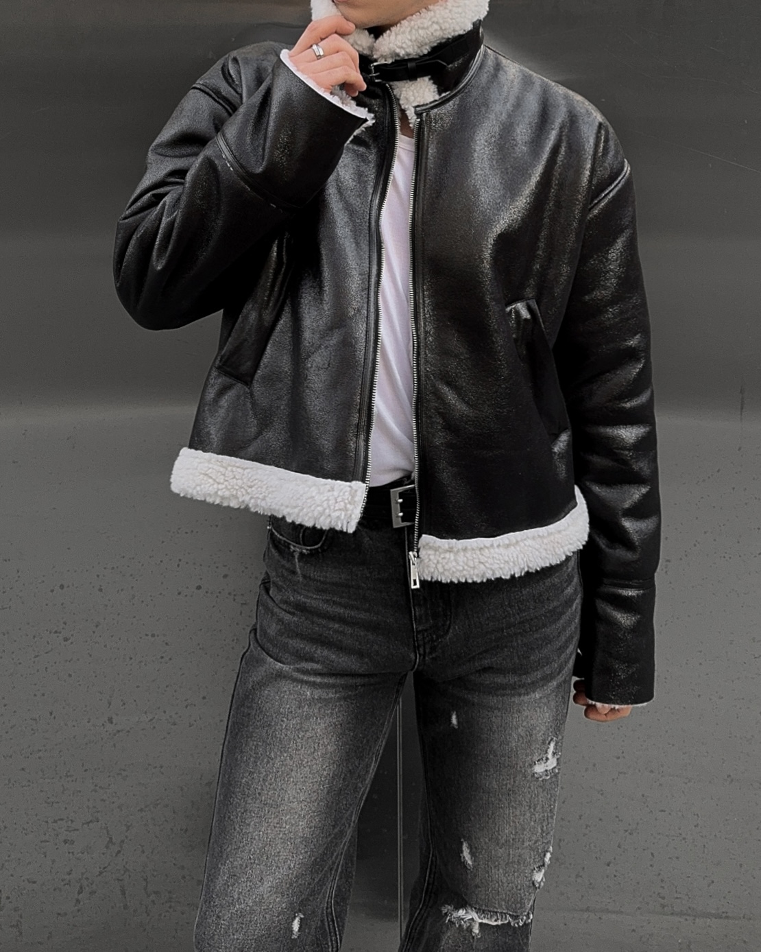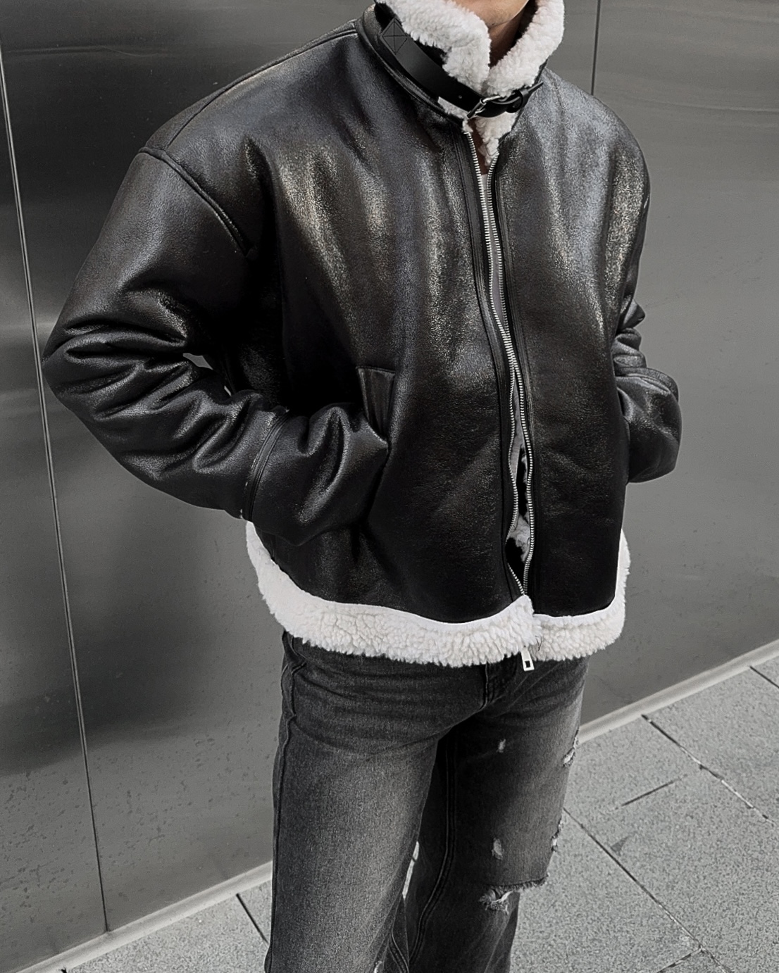 -씨어링 레더 소재로 제작된 무스탕