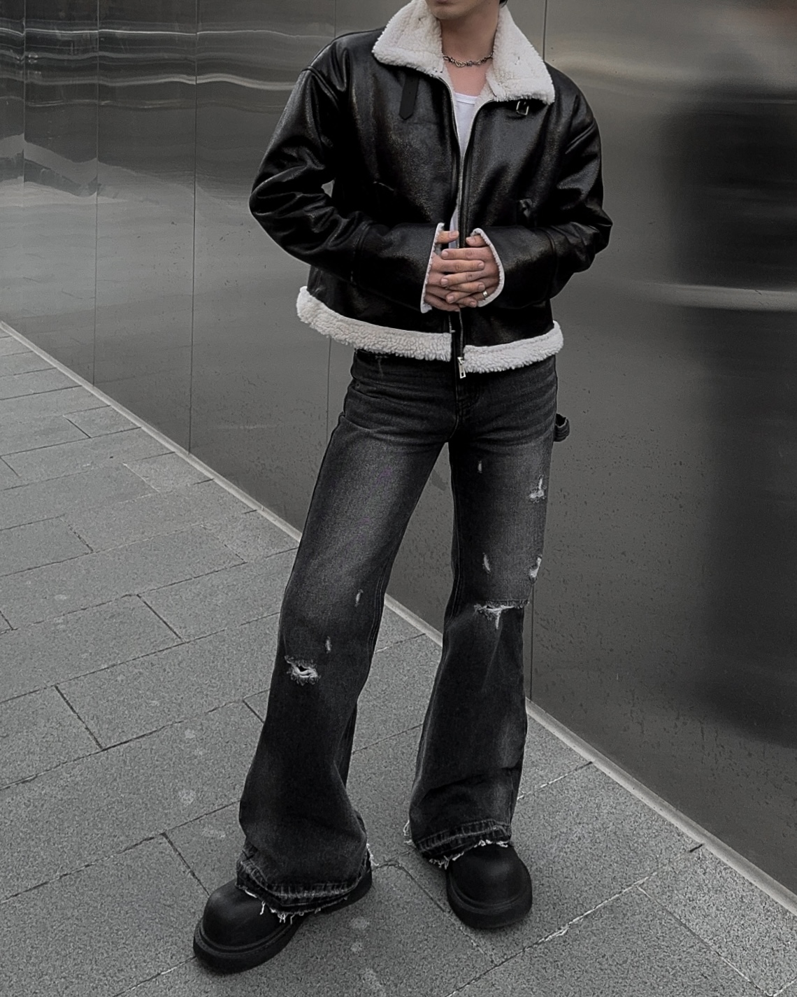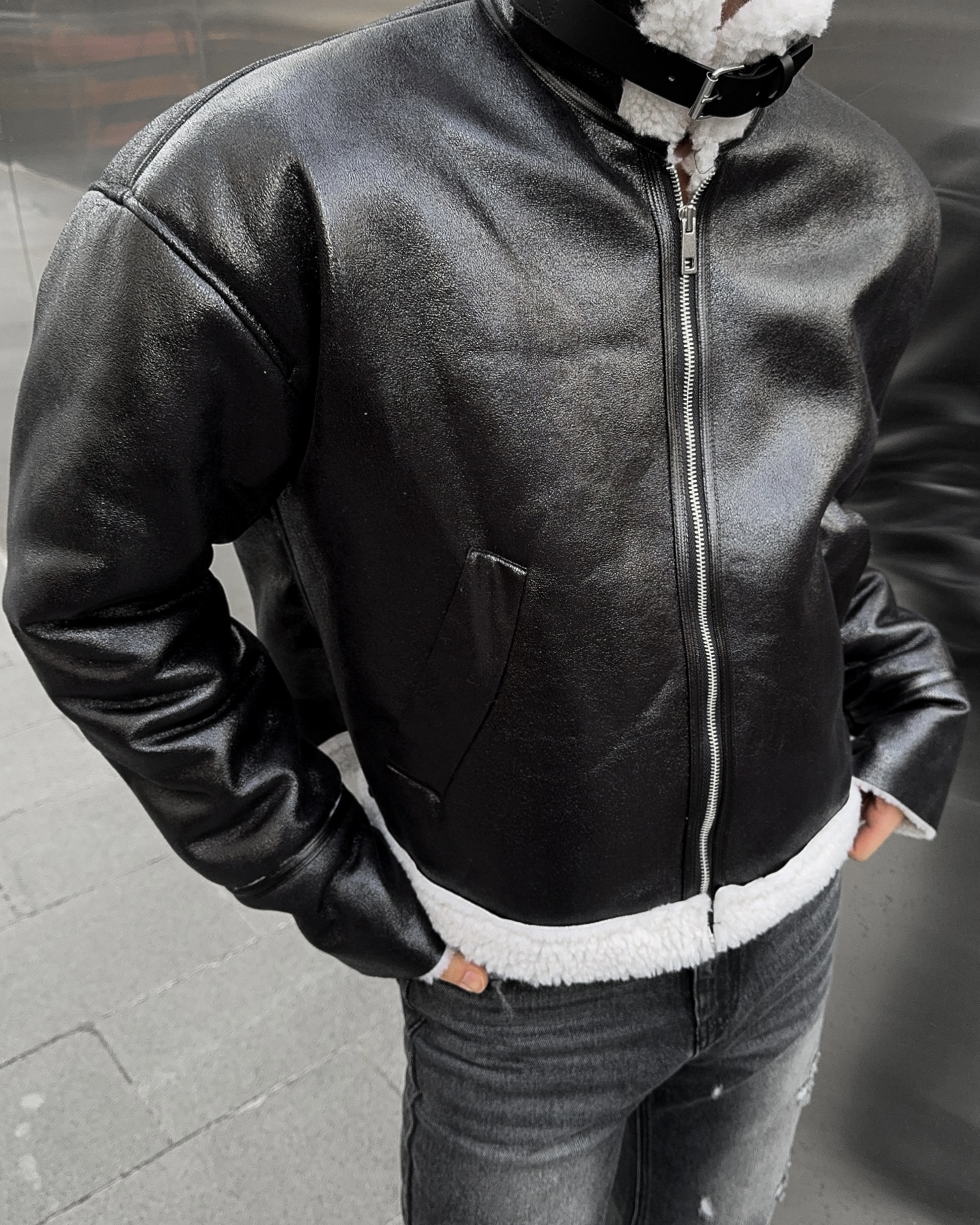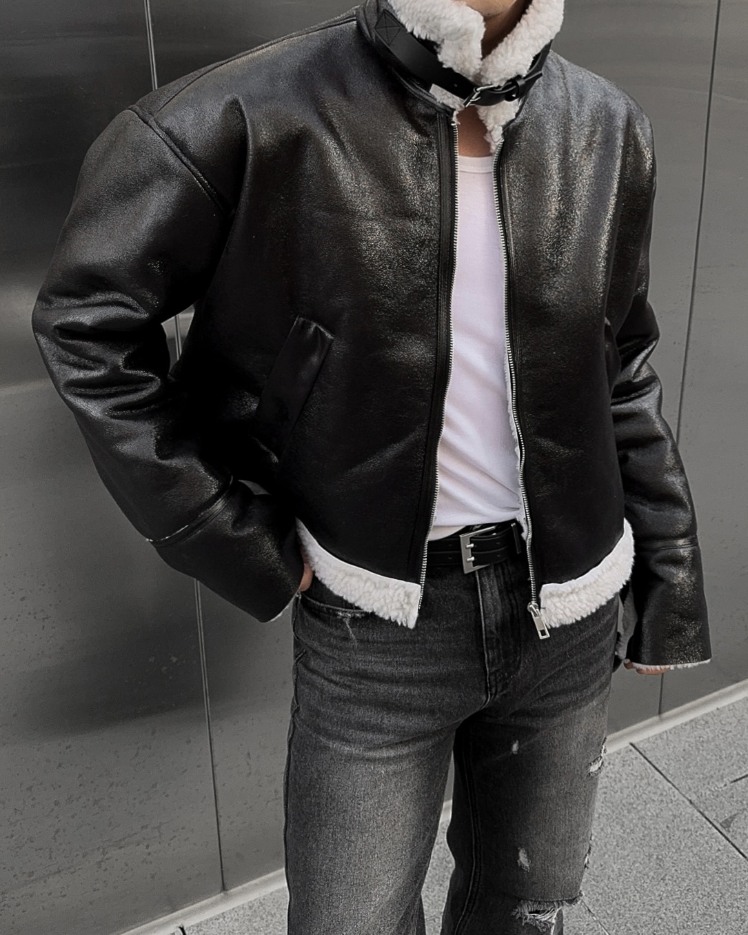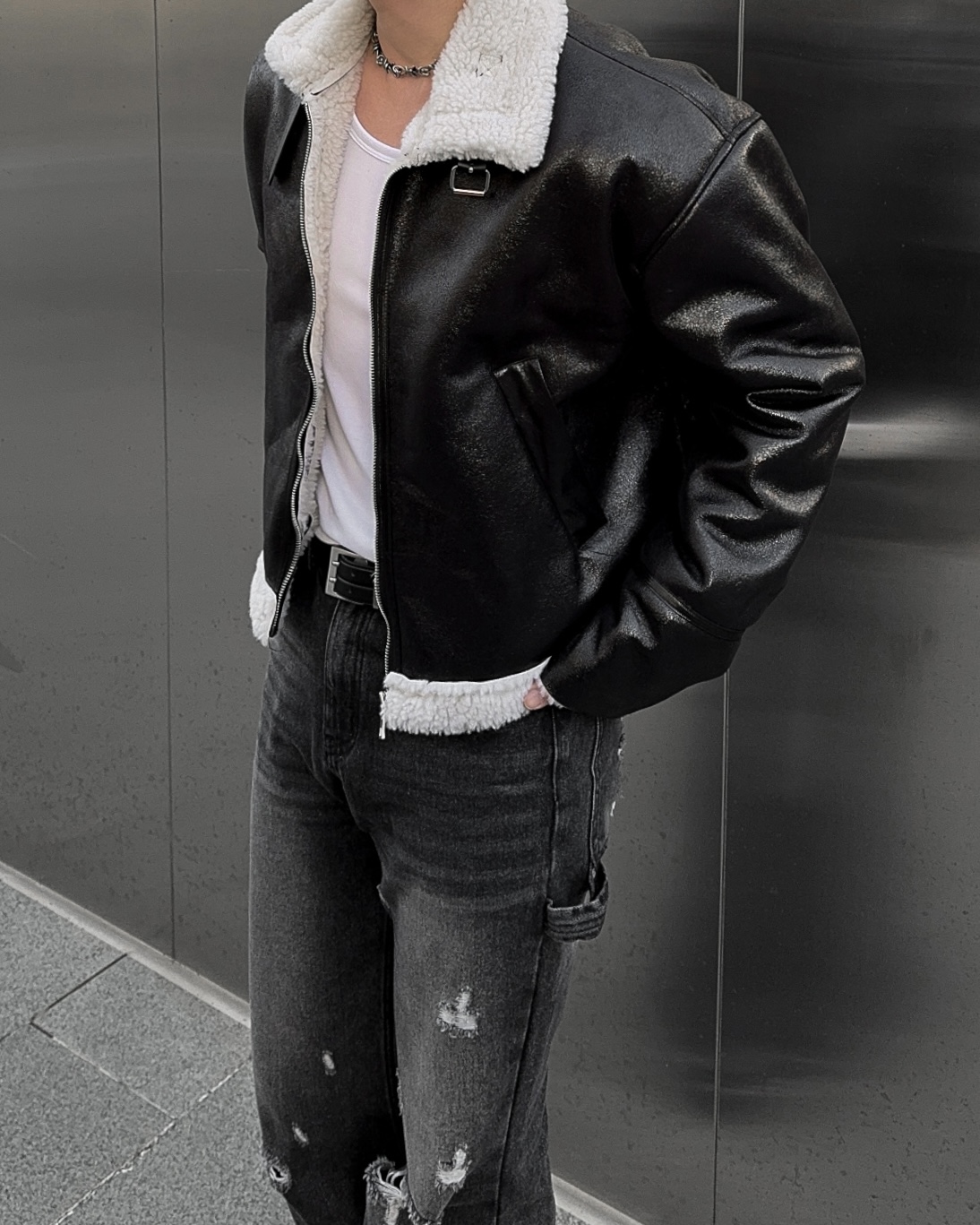 -씨어링 레더 소재로 제작된 무스탕