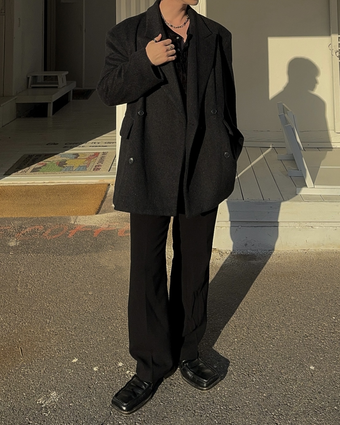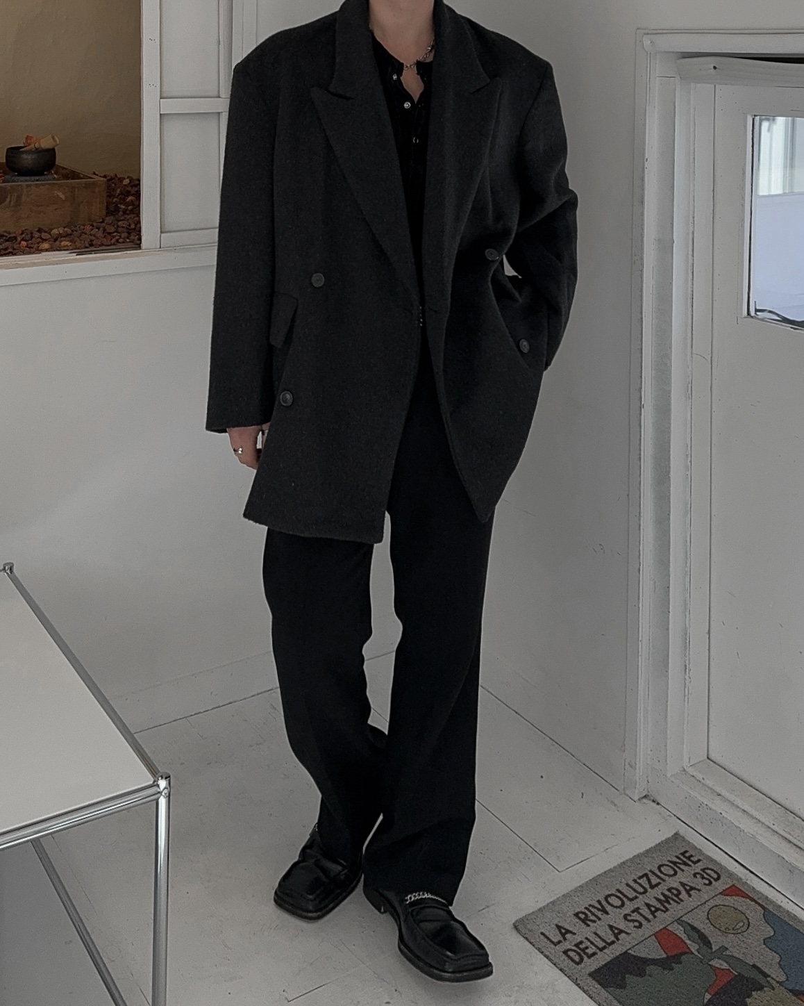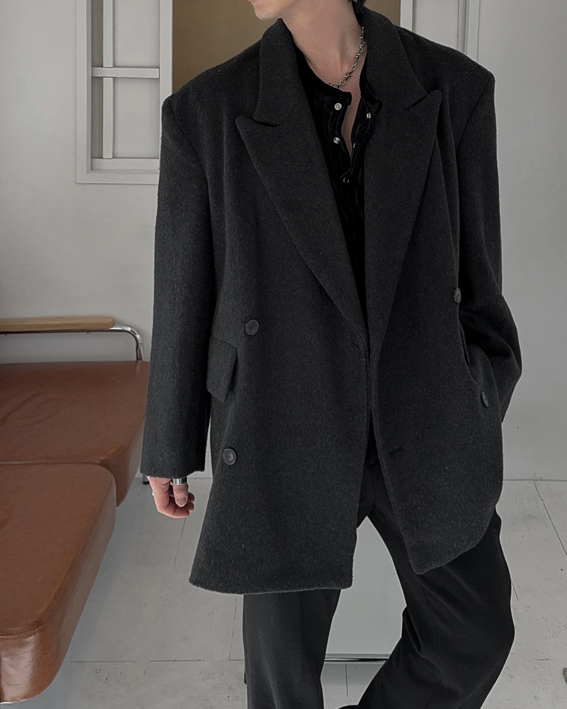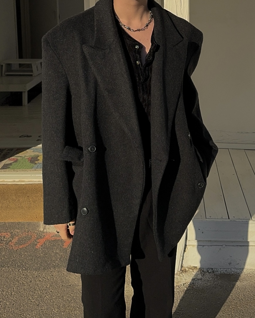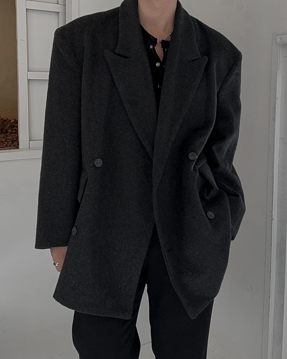 -피크드 라펠과 더블 버튼 여밈 디자인