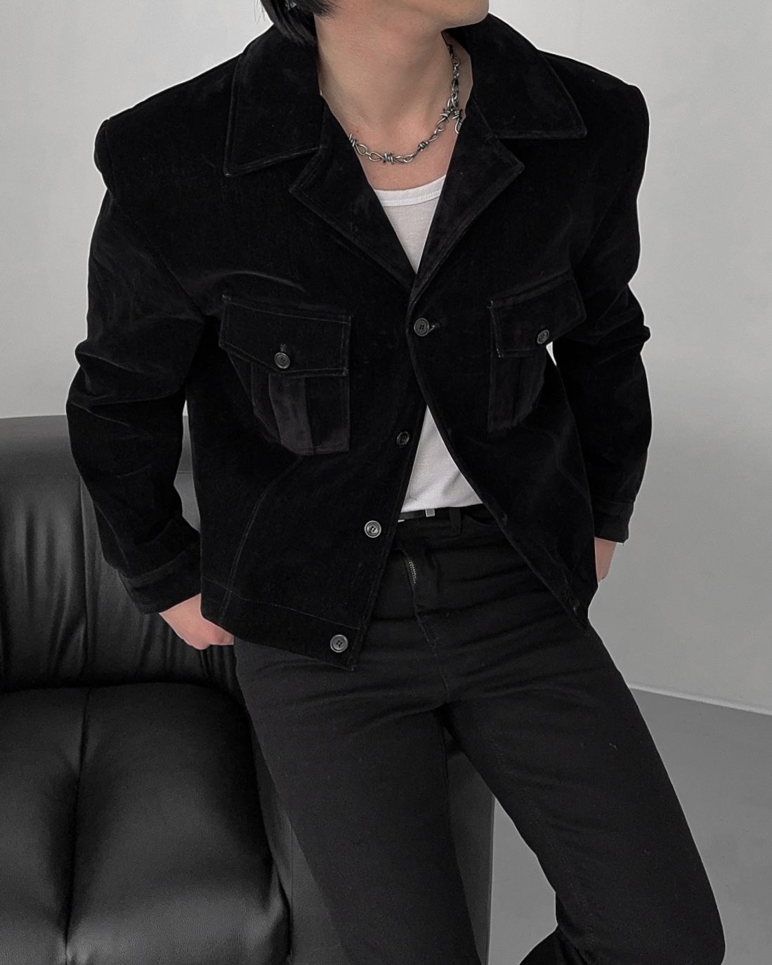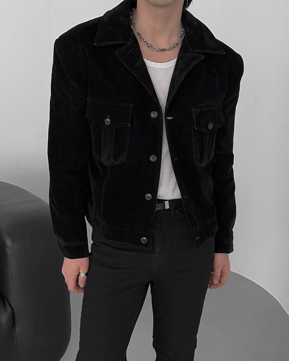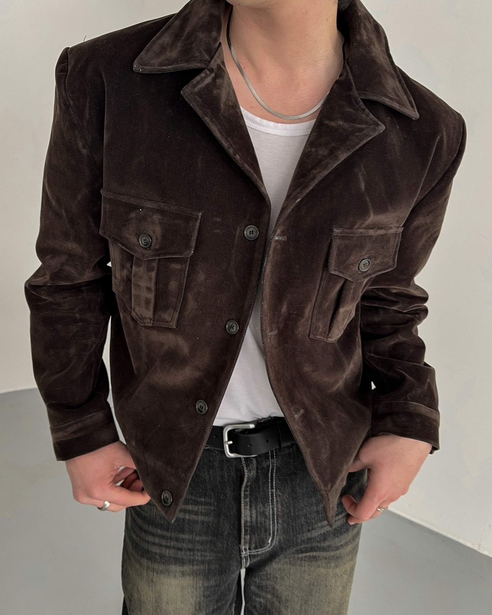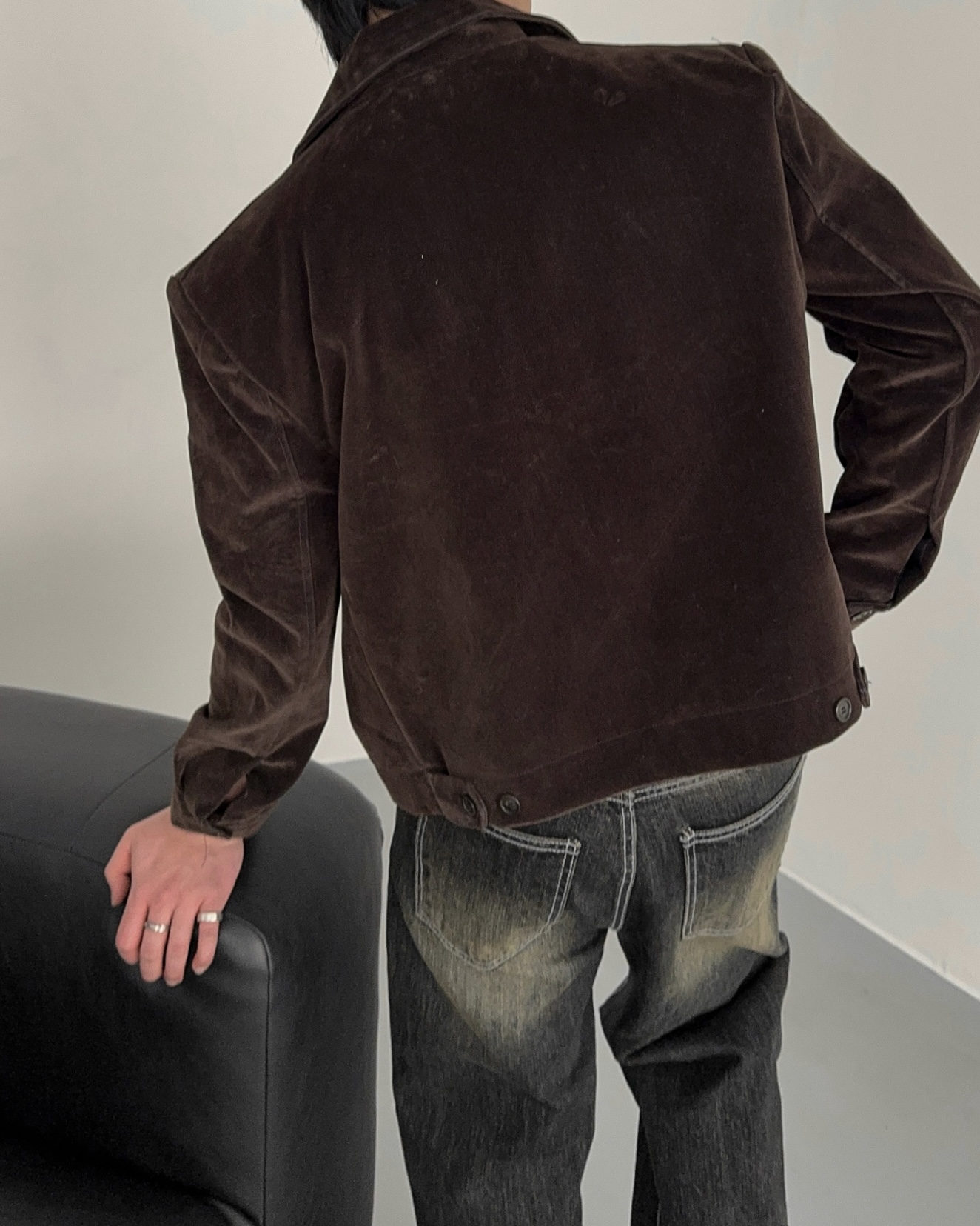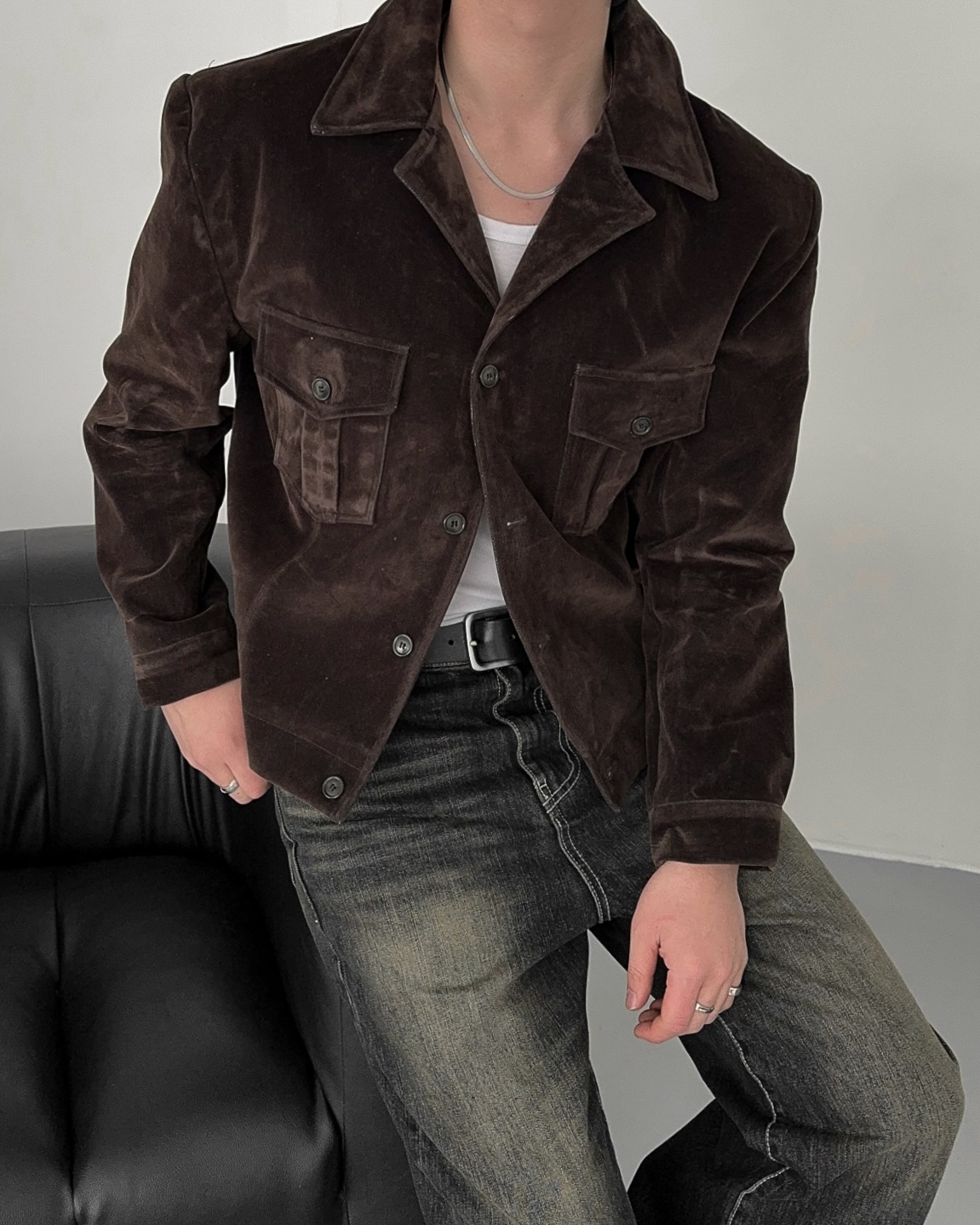 -탄탄한 데님 소재로 제작된 벨벳 질감의 자켓