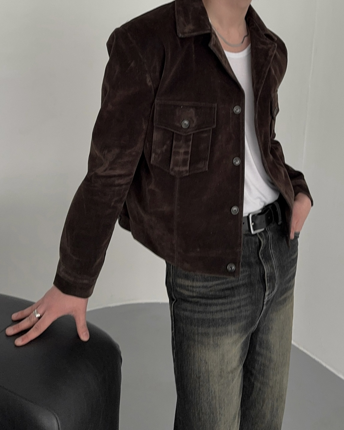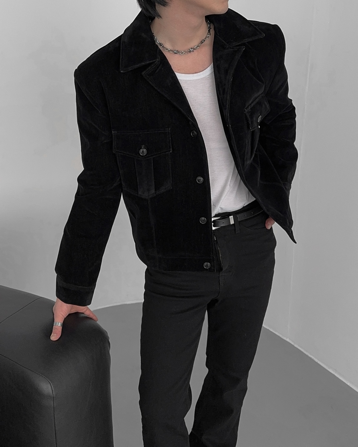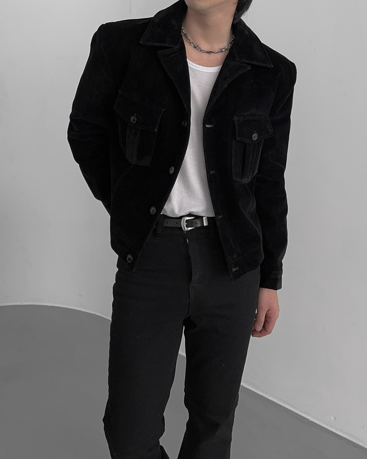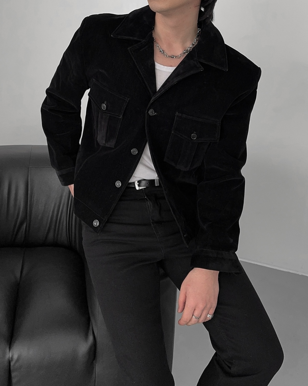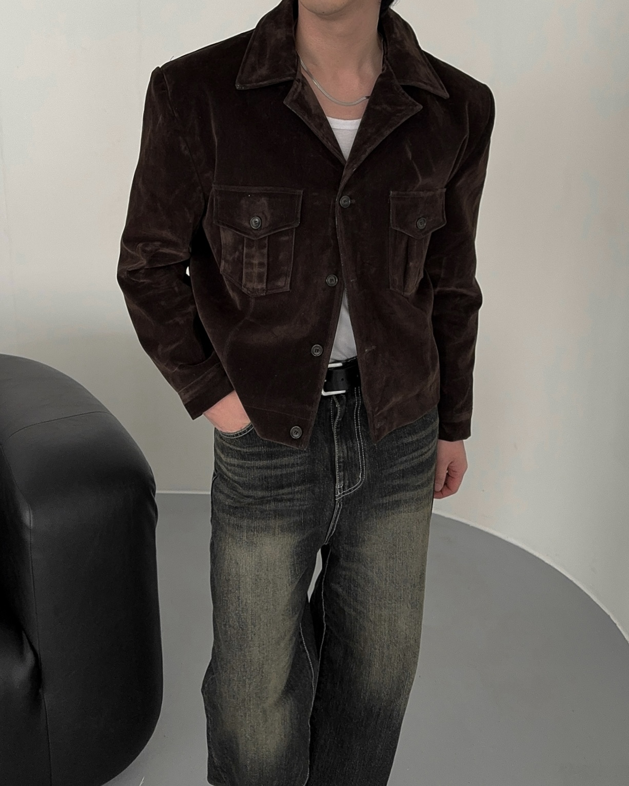 -탄탄한 데님 소재로 제작된 벨벳 질감의 자켓